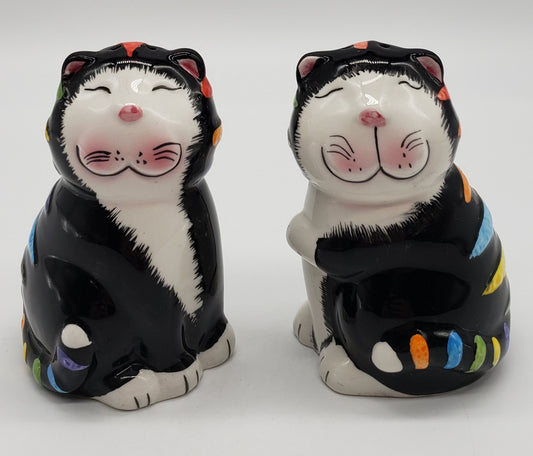 Happy Tuxedo Cats Ceramic Salt and Pepper Shakers Rainbow Stripes GKAO