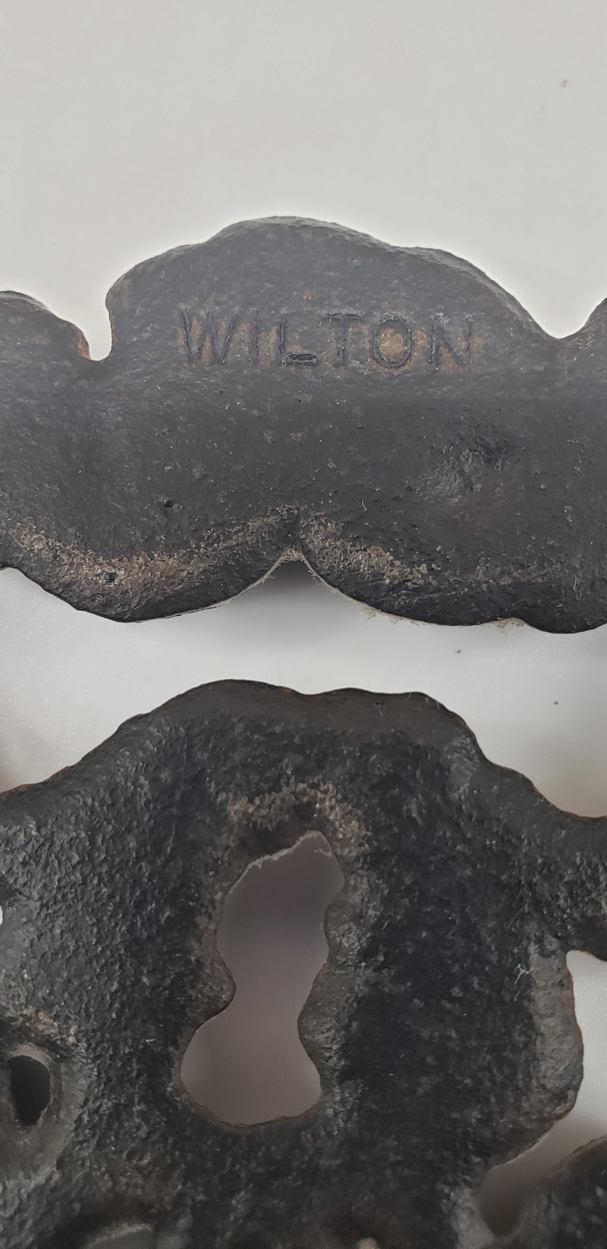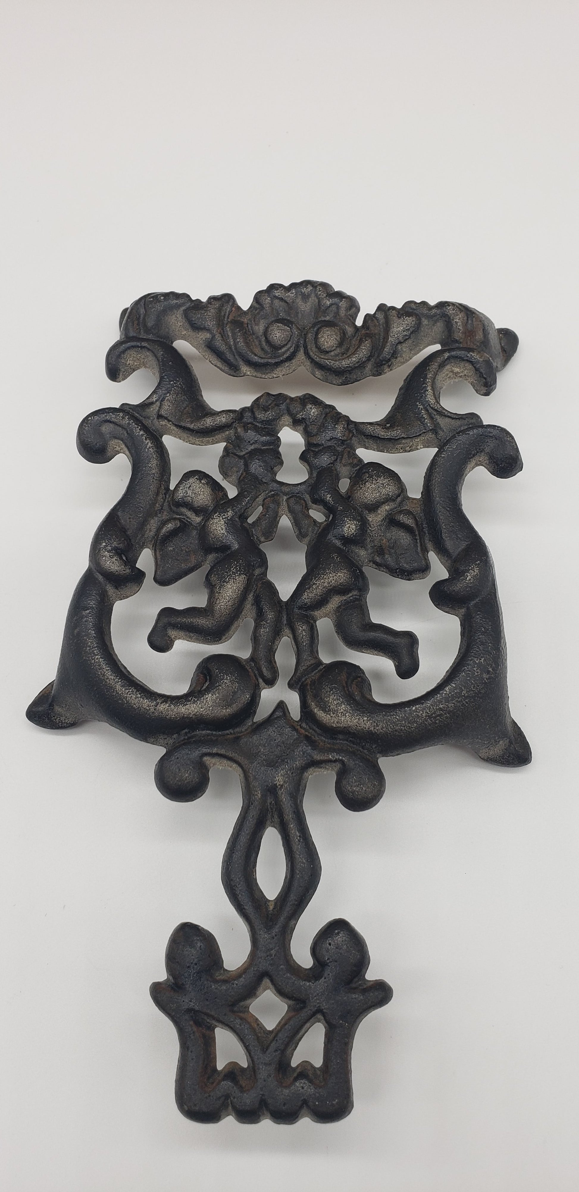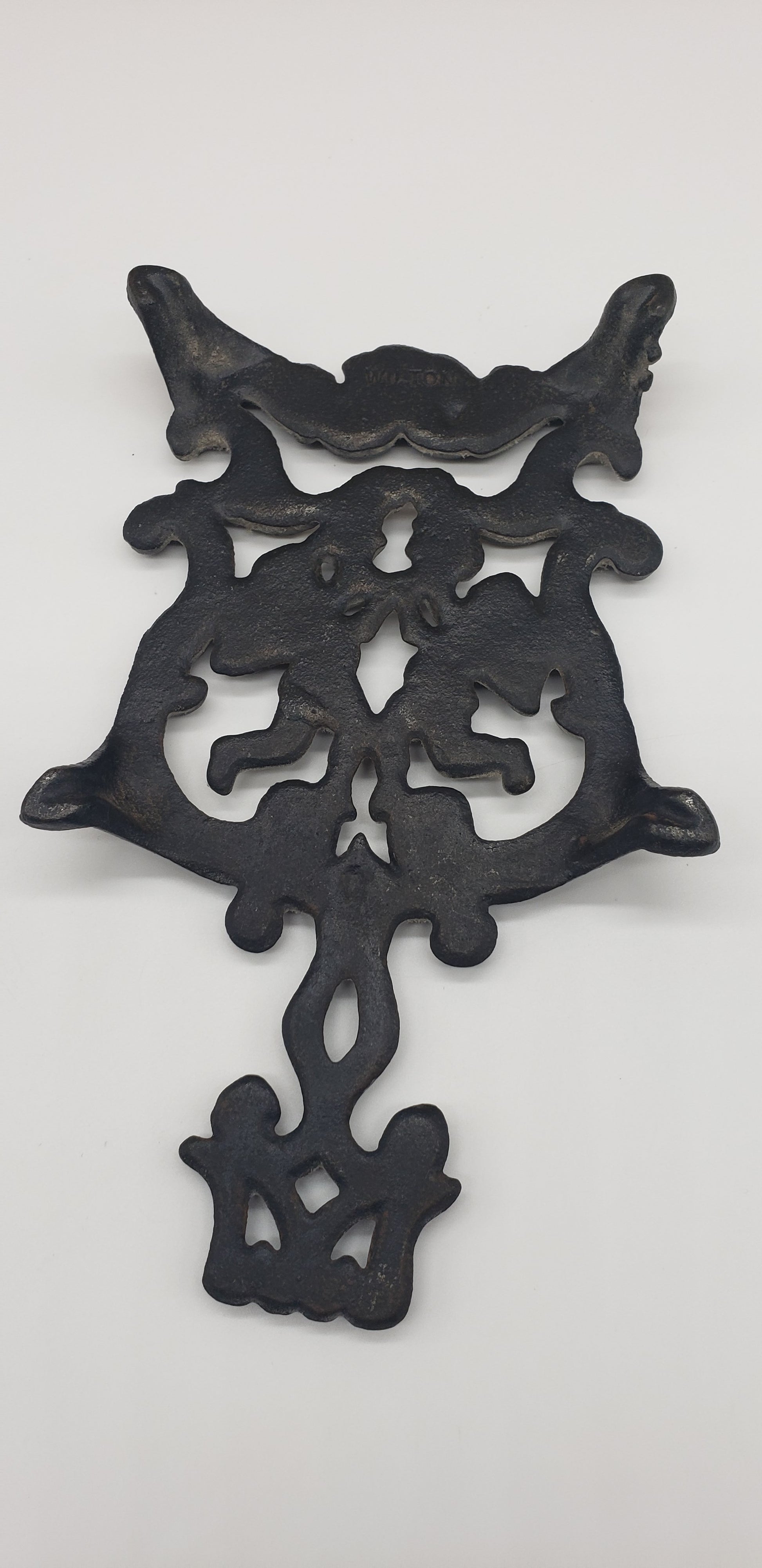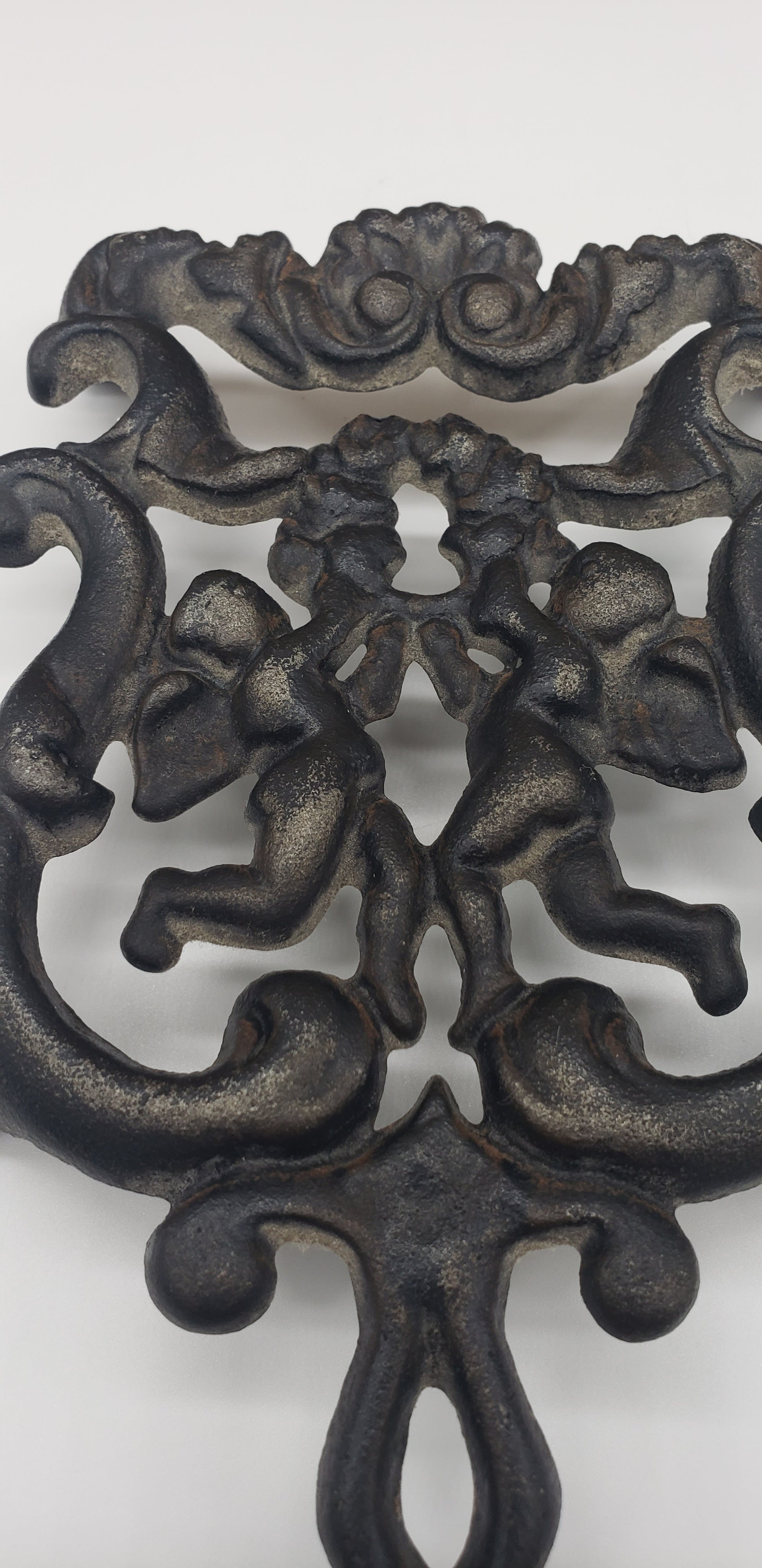 Cast Iron Wilton Trivet. Design is Double Cupids Holding Wreath.