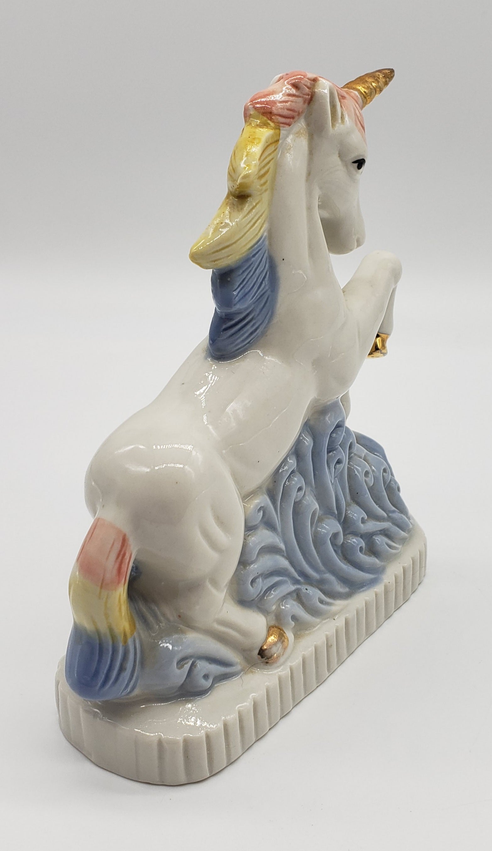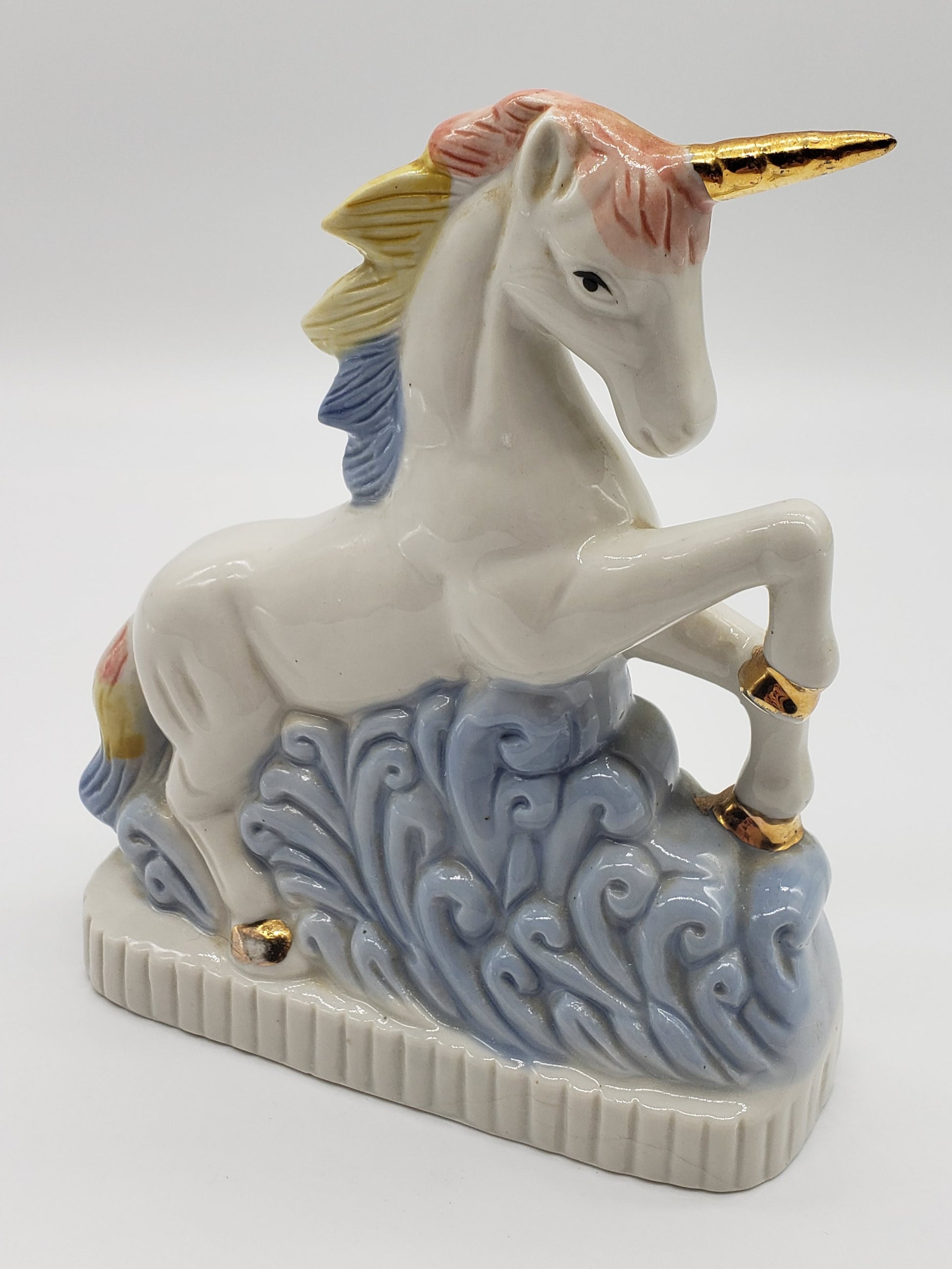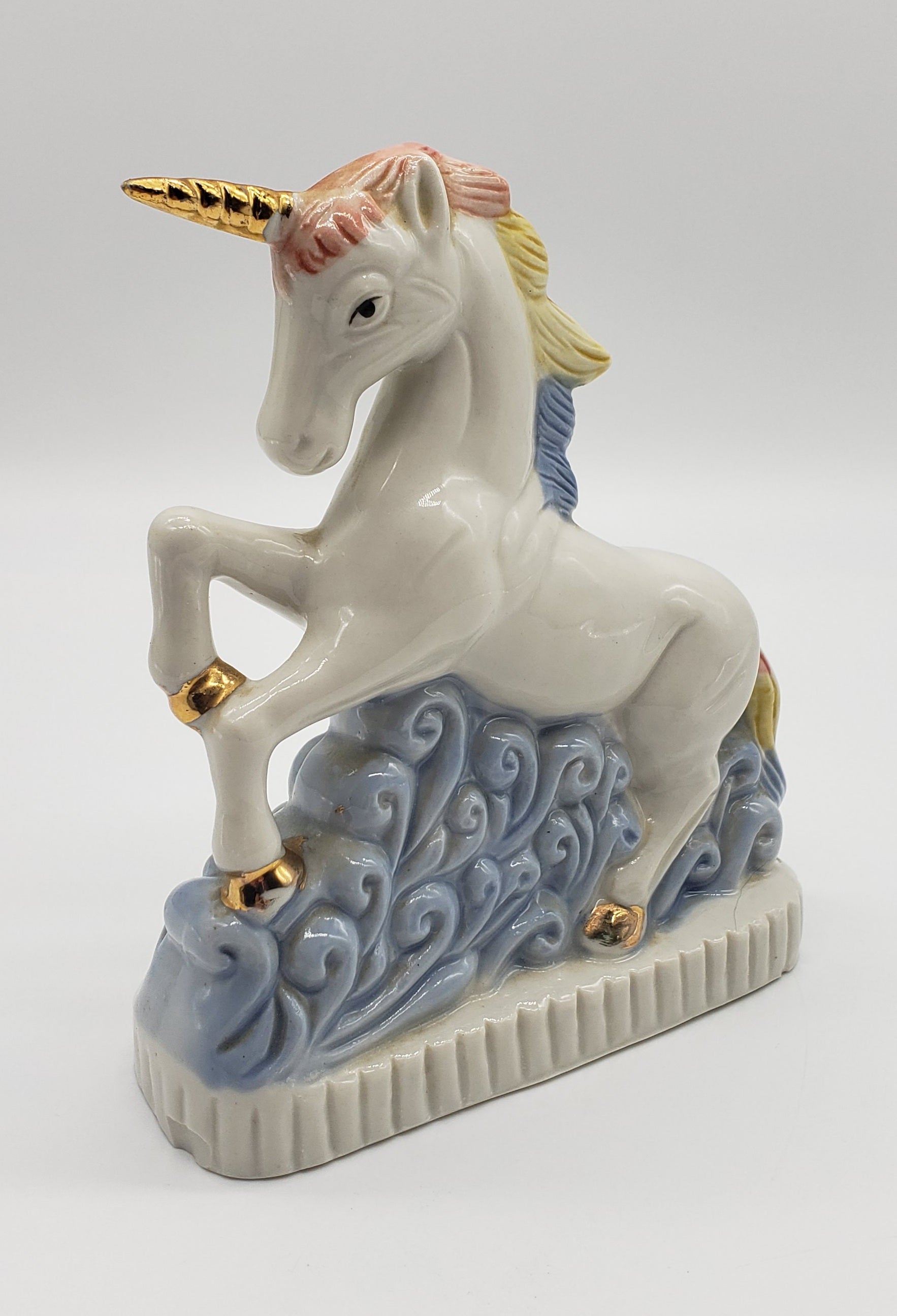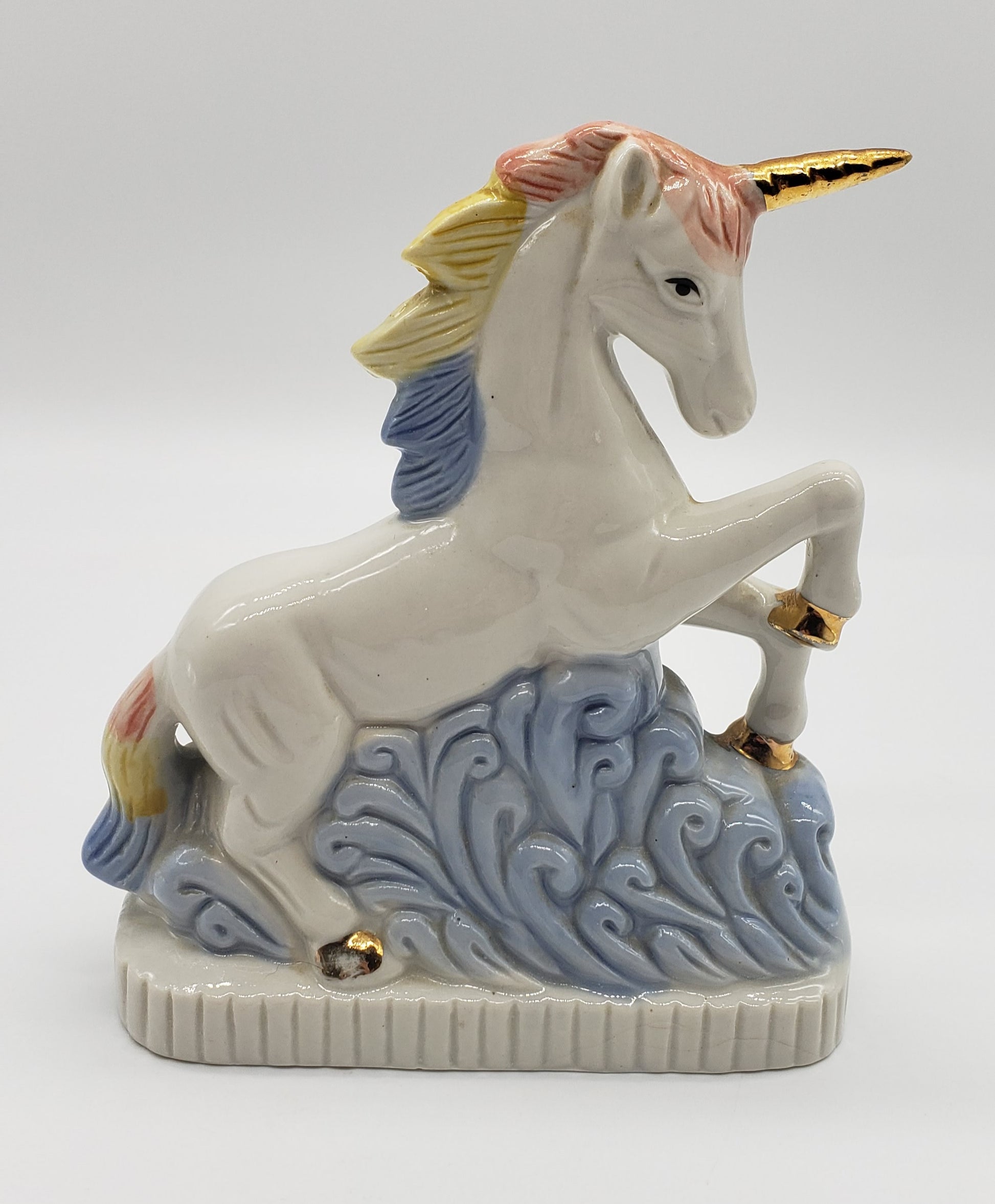 Ceramic unicorn with rainbow hair and gold horn. One chip in front as shown is not noticeable when displayed from the side