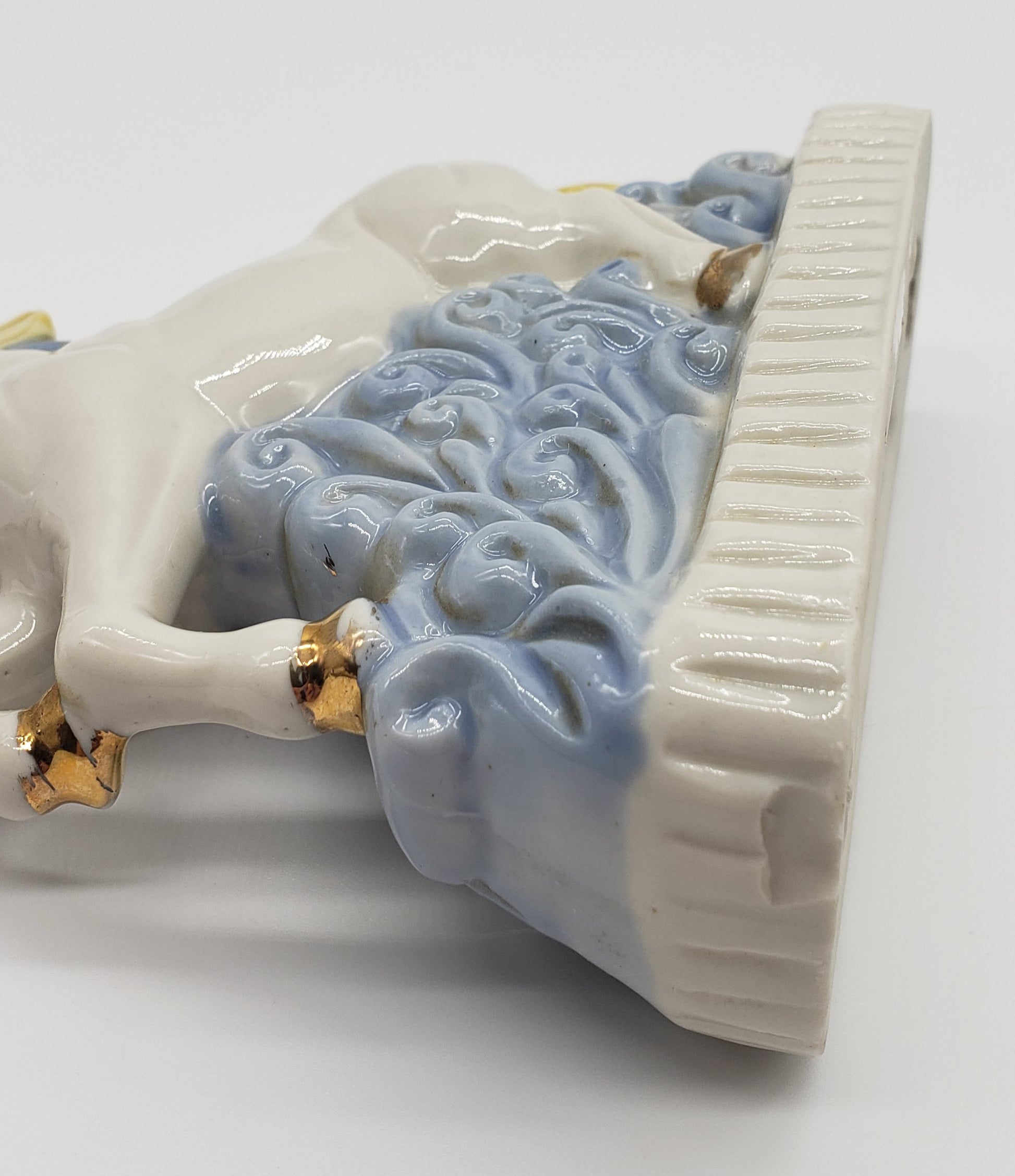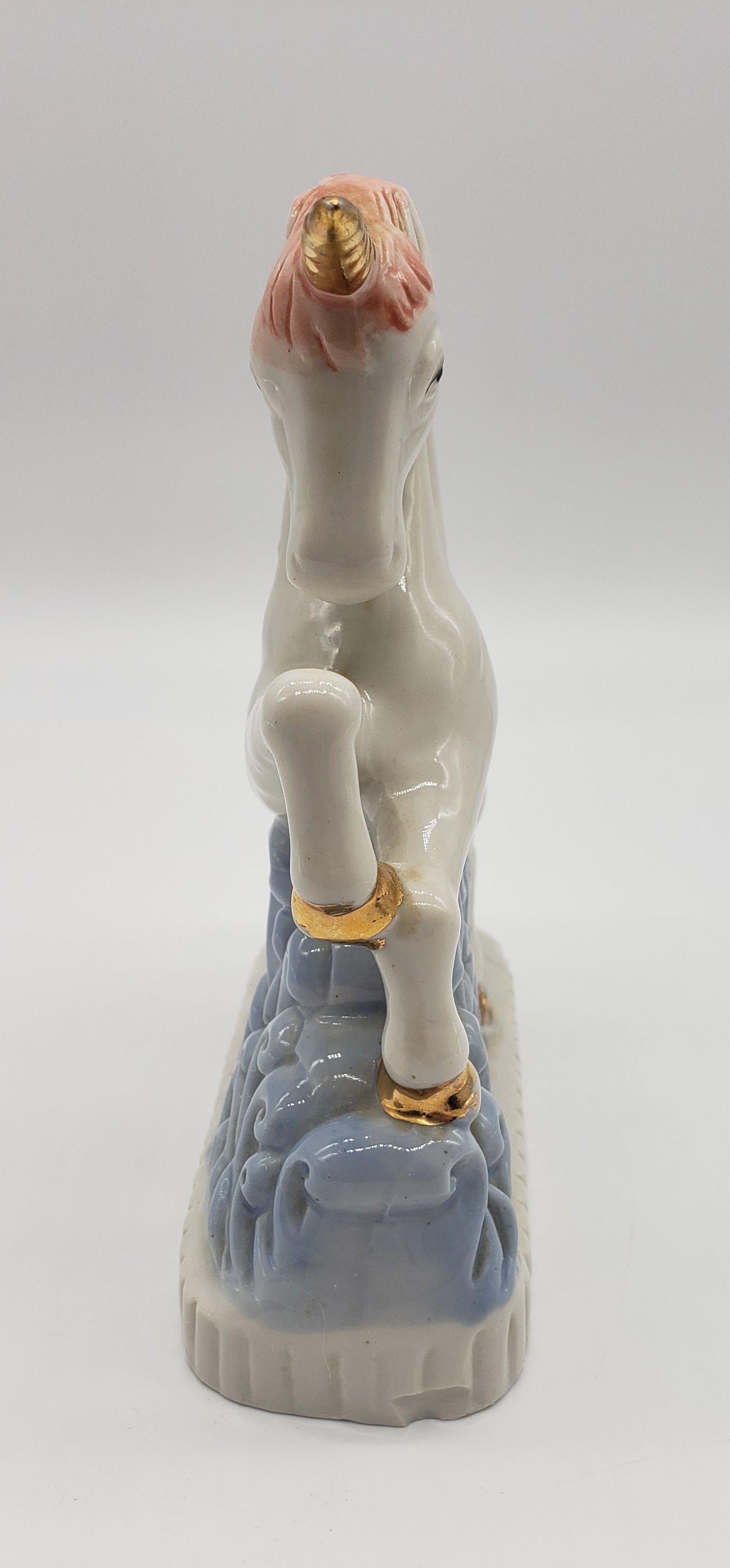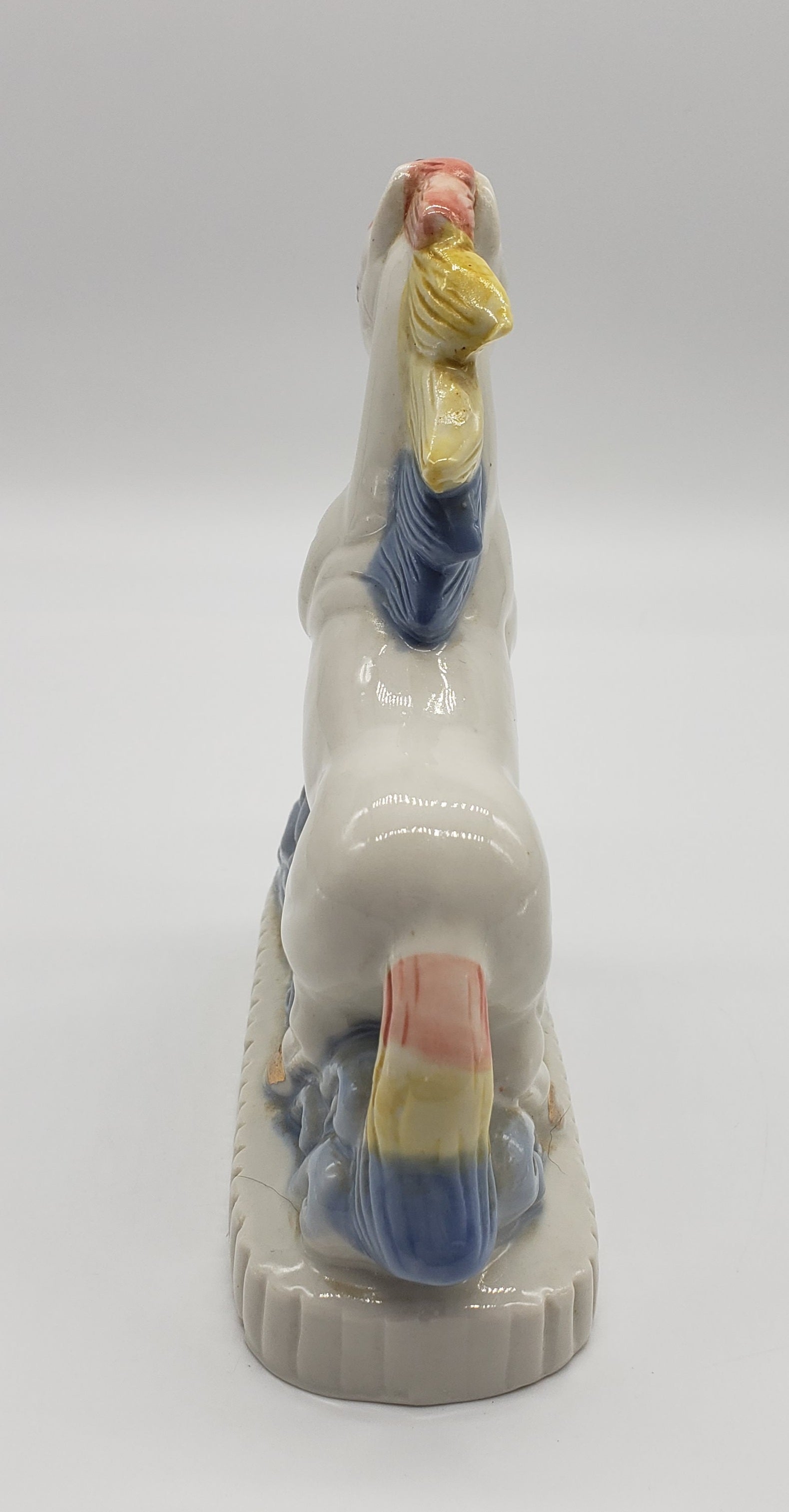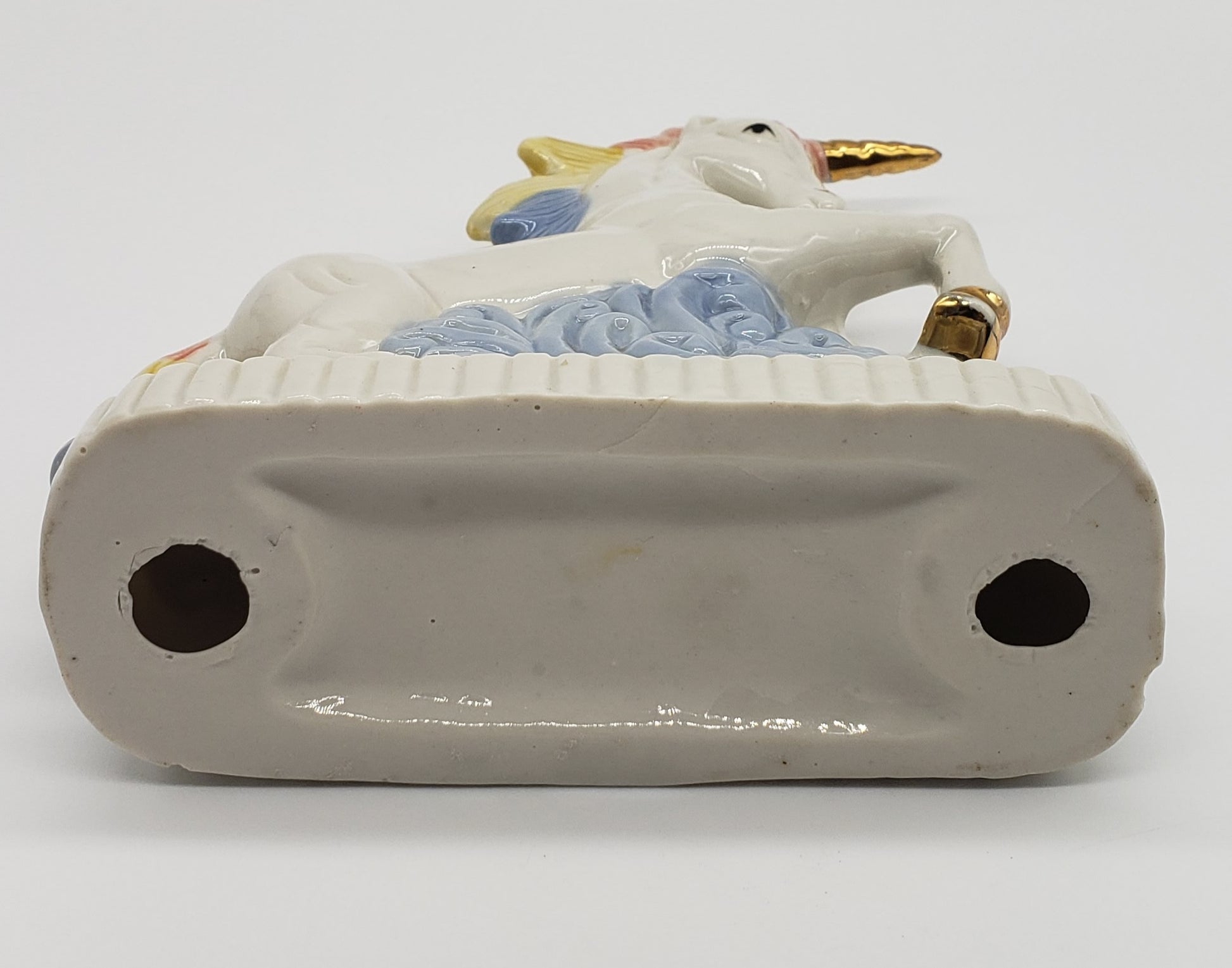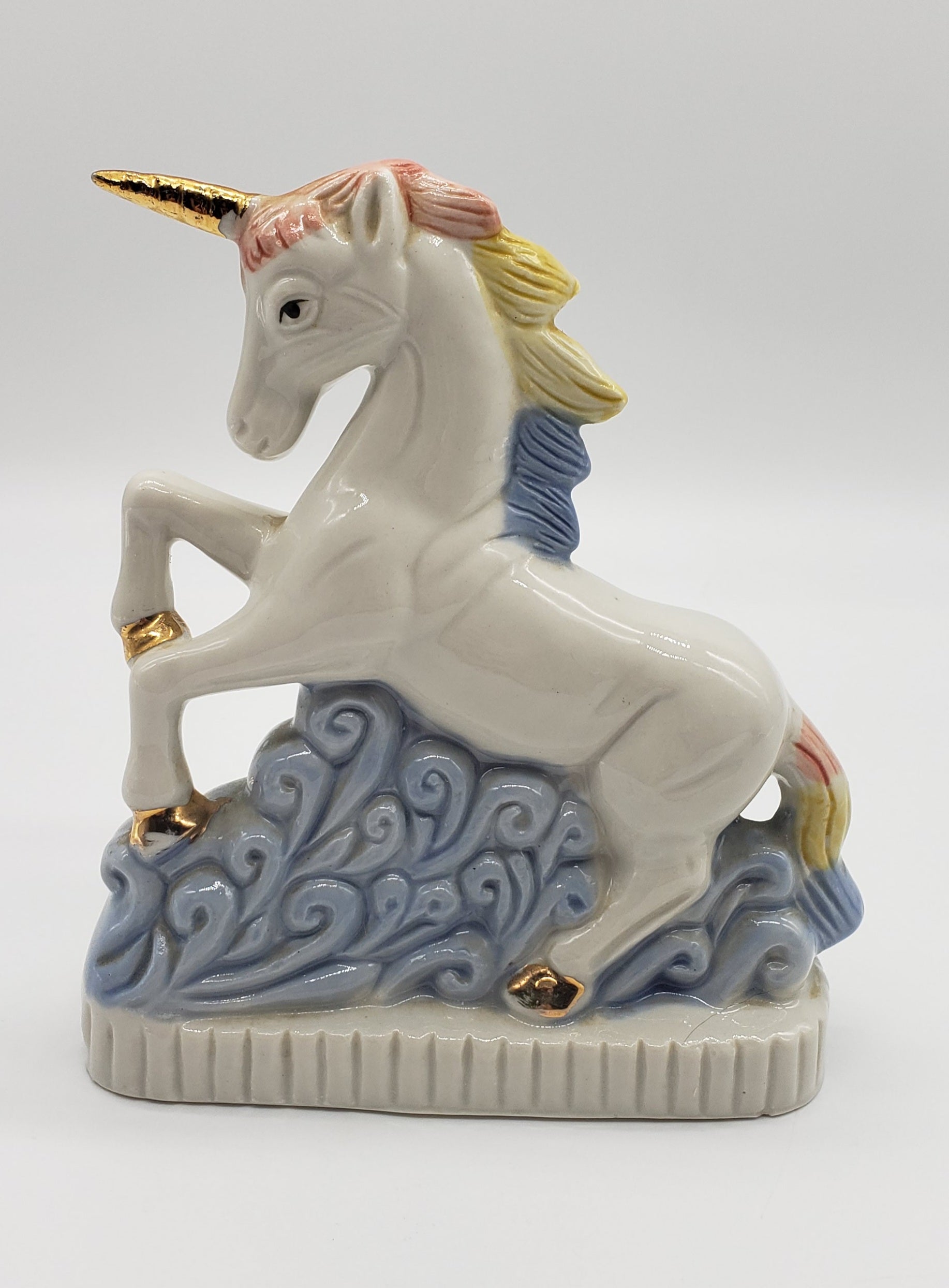 Ceramic unicorn with rainbow hair and gold horn. One chip in front as shown is not noticeable when displayed from the side
