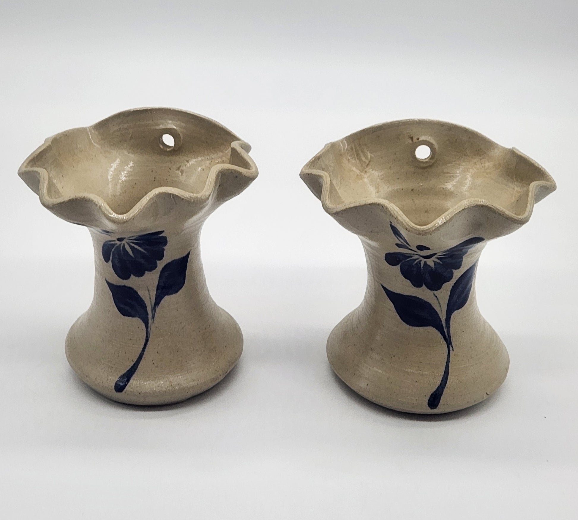 Williamsburg Pottery Pair of Wall Pocket Vases Blue Floral Design. Measures approximately 3.25" tall x 3.25" wide.