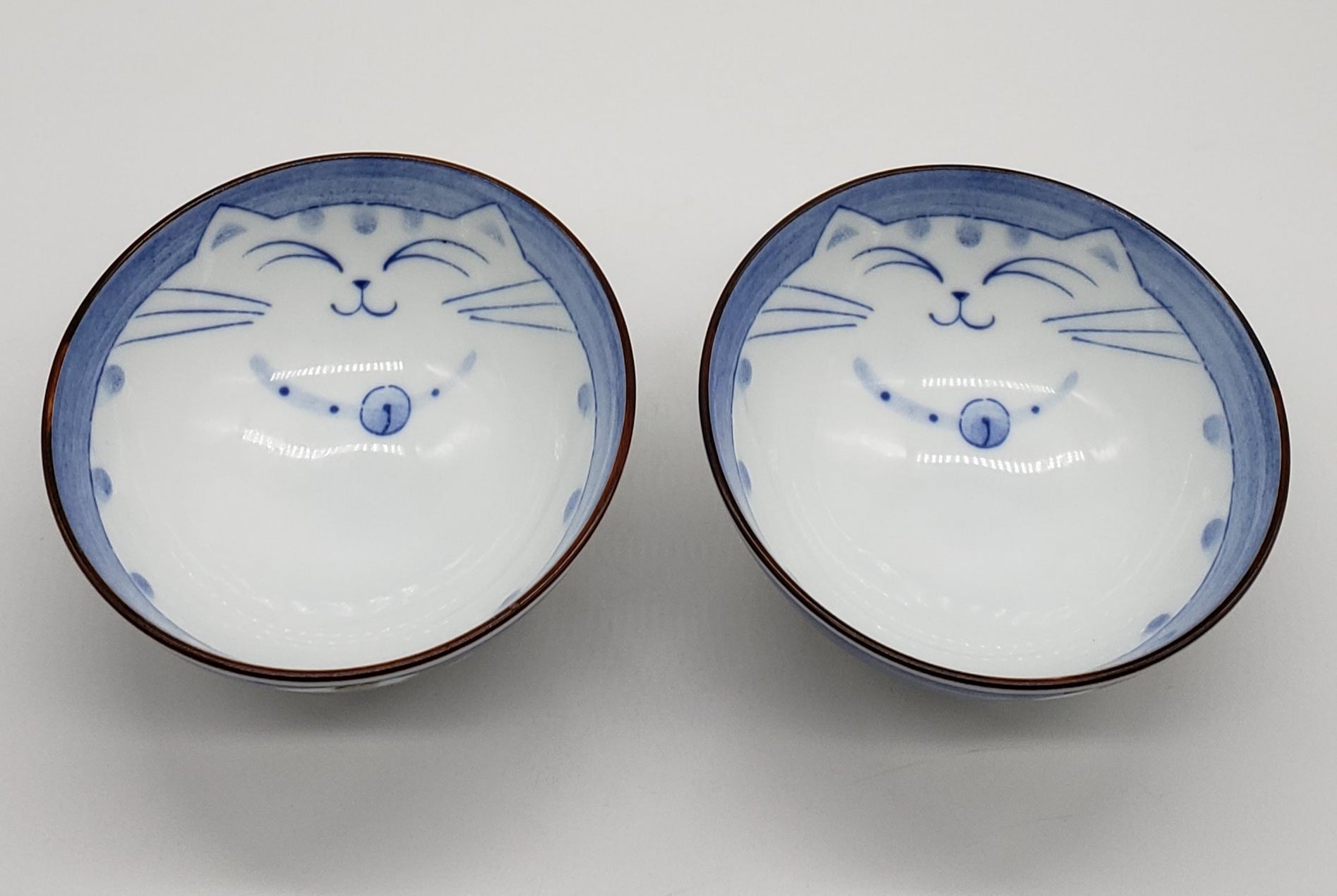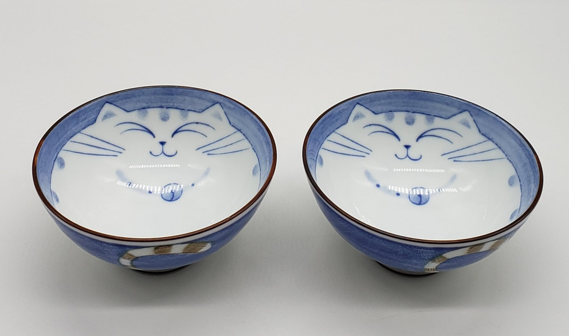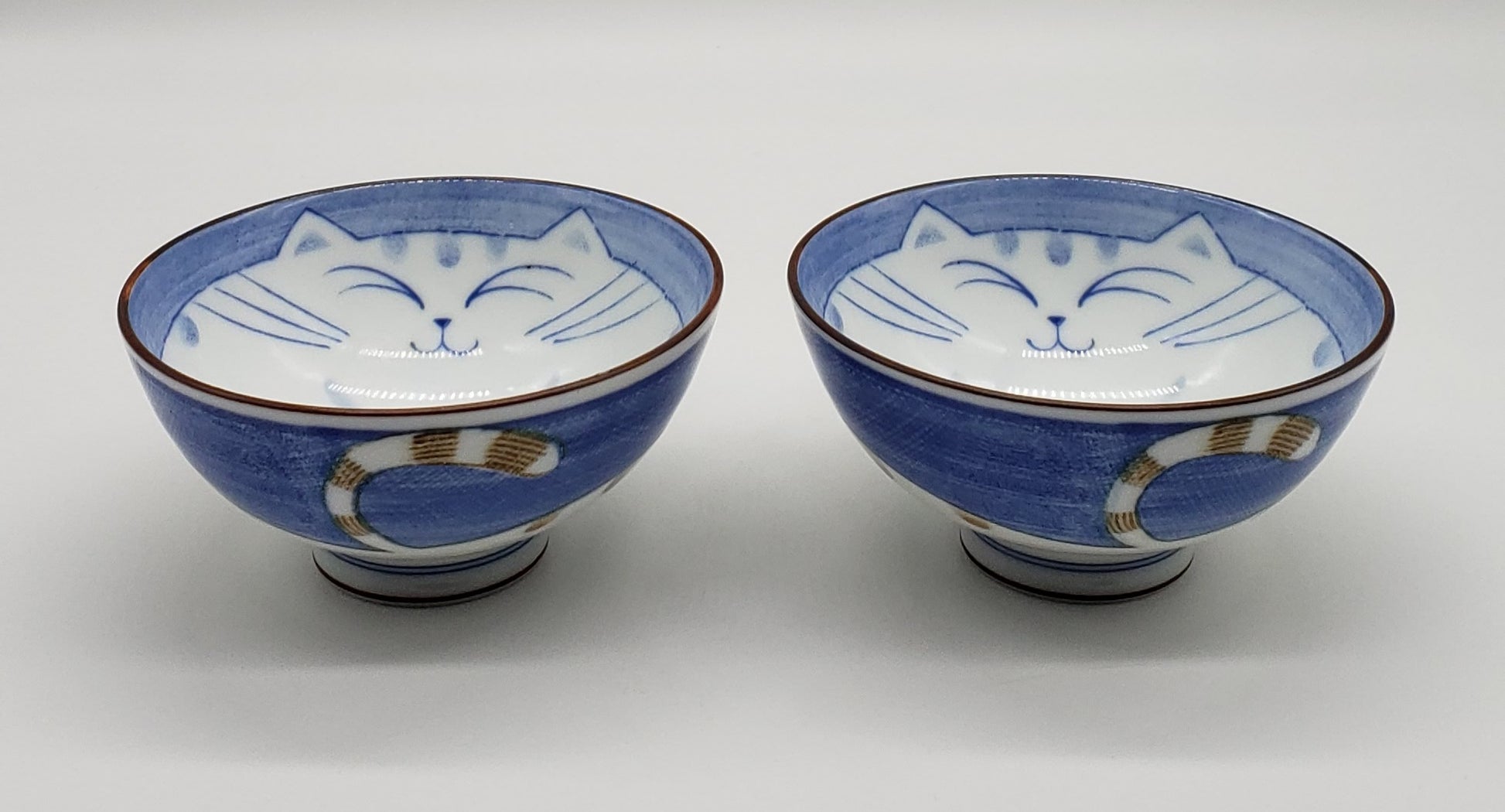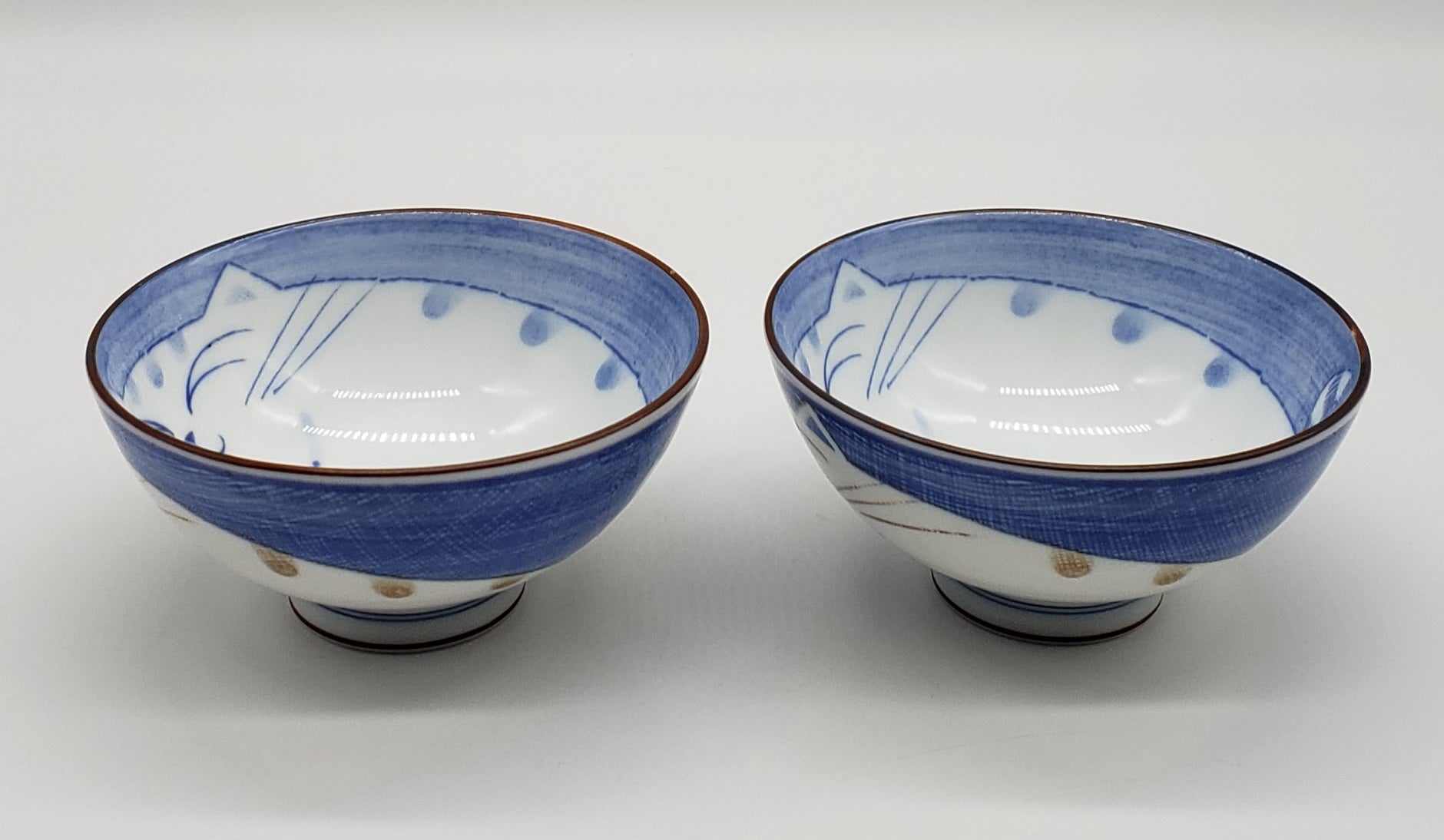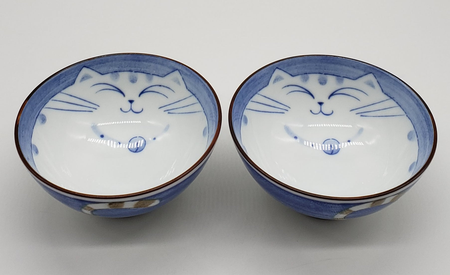 Happy Cat Noodle Rice Soup Bowl Blue Japan Porcelain (set of 2)