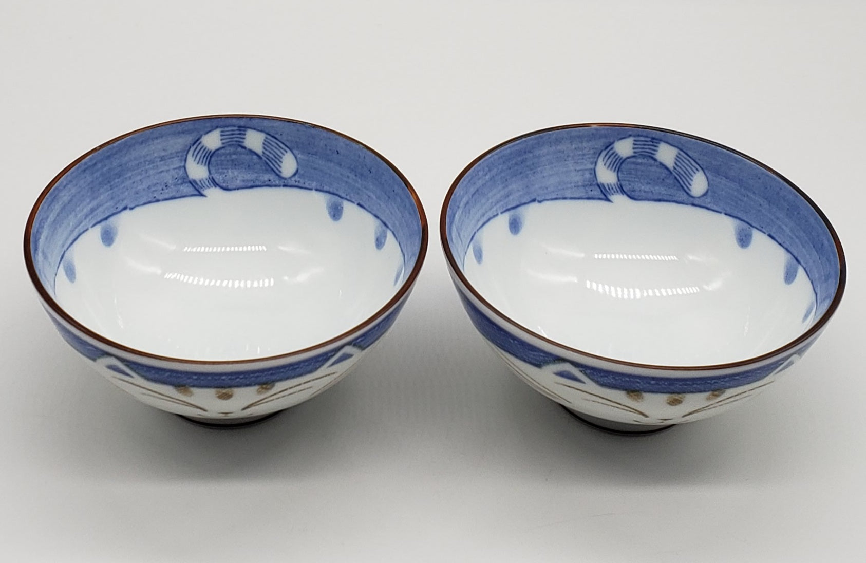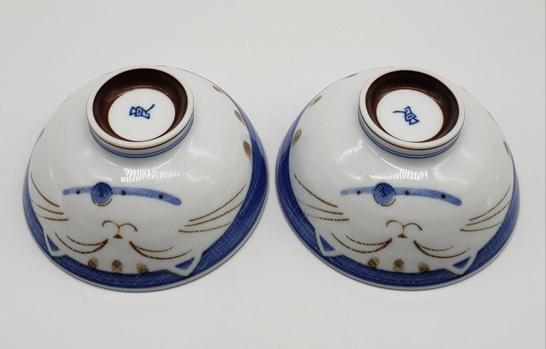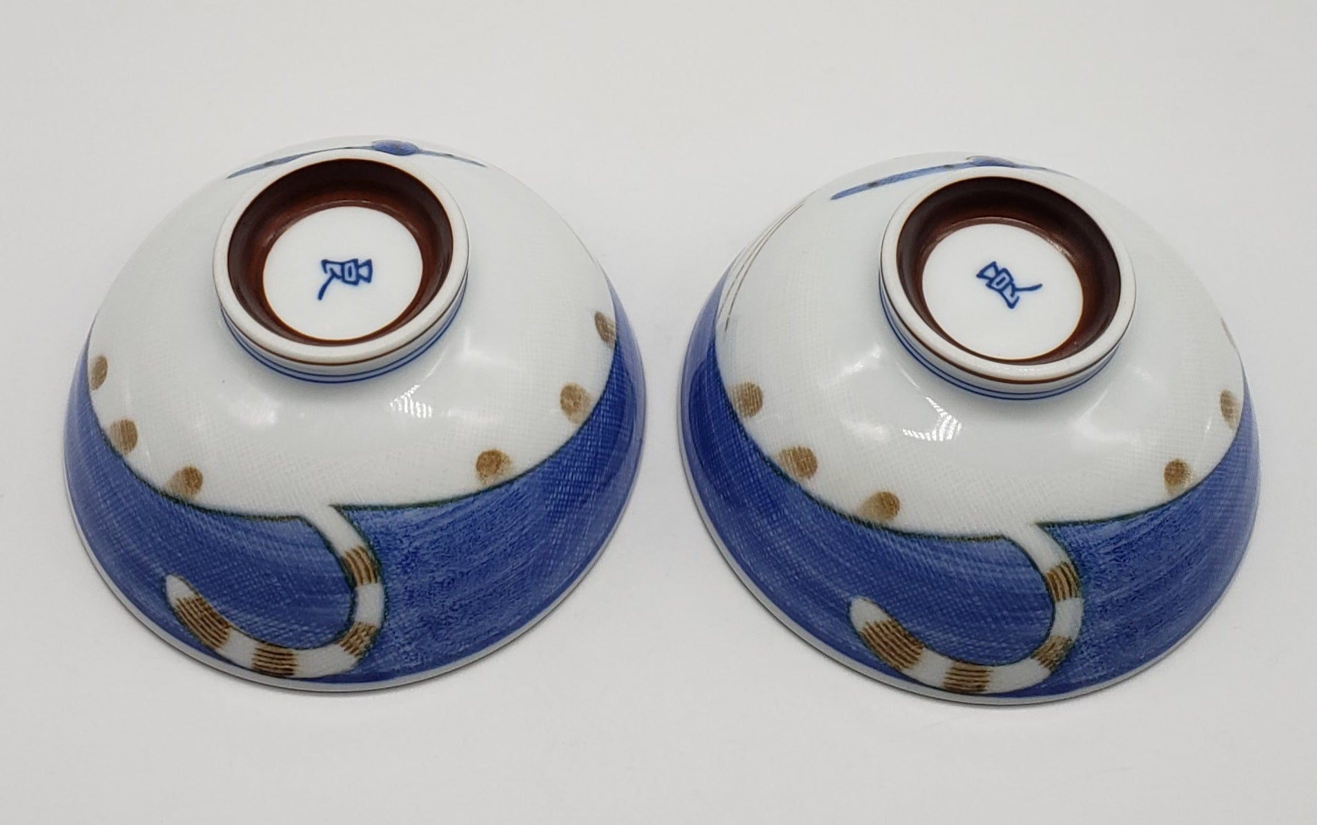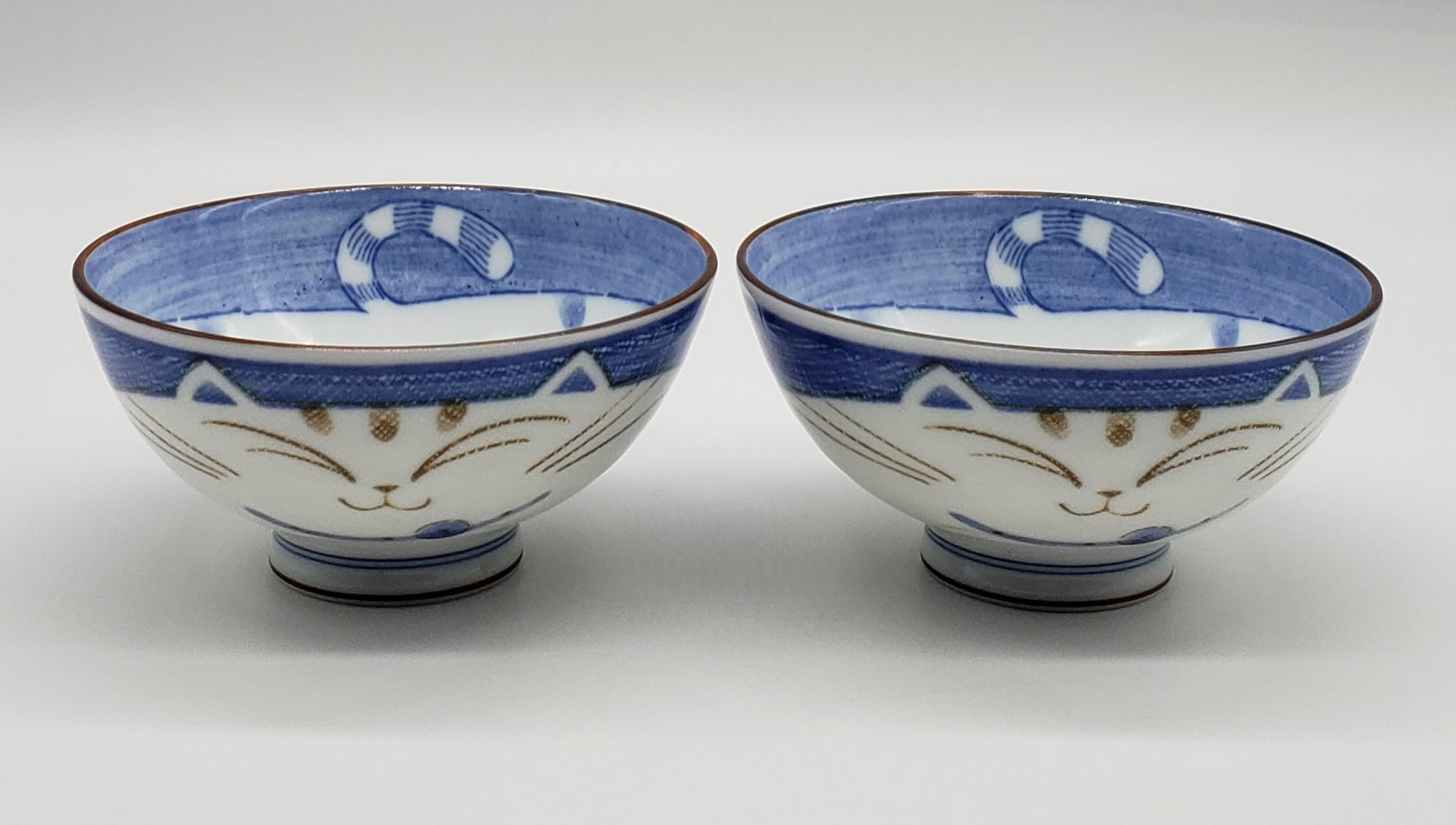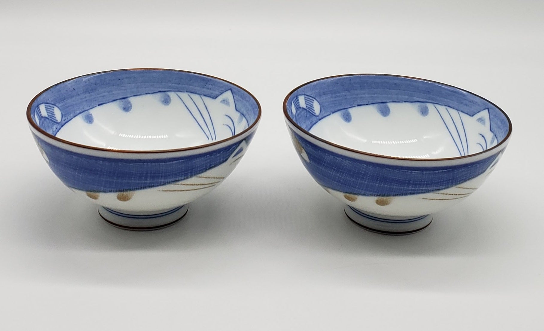 Happy Cat Noodle Rice Soup Bowl Blue Japan Porcelain (set of 2)