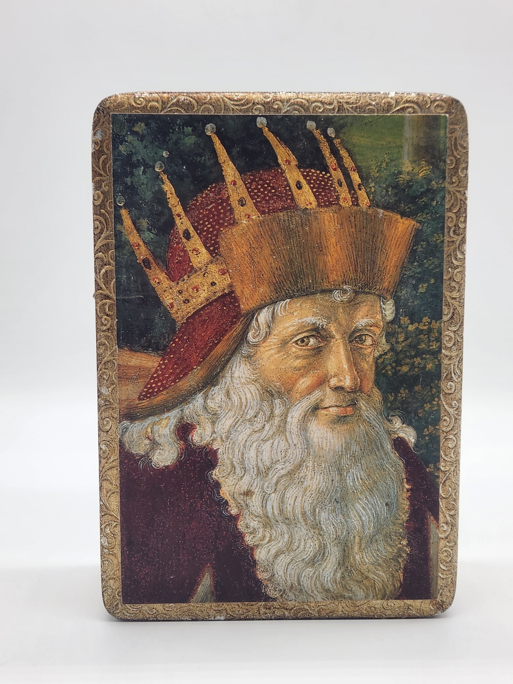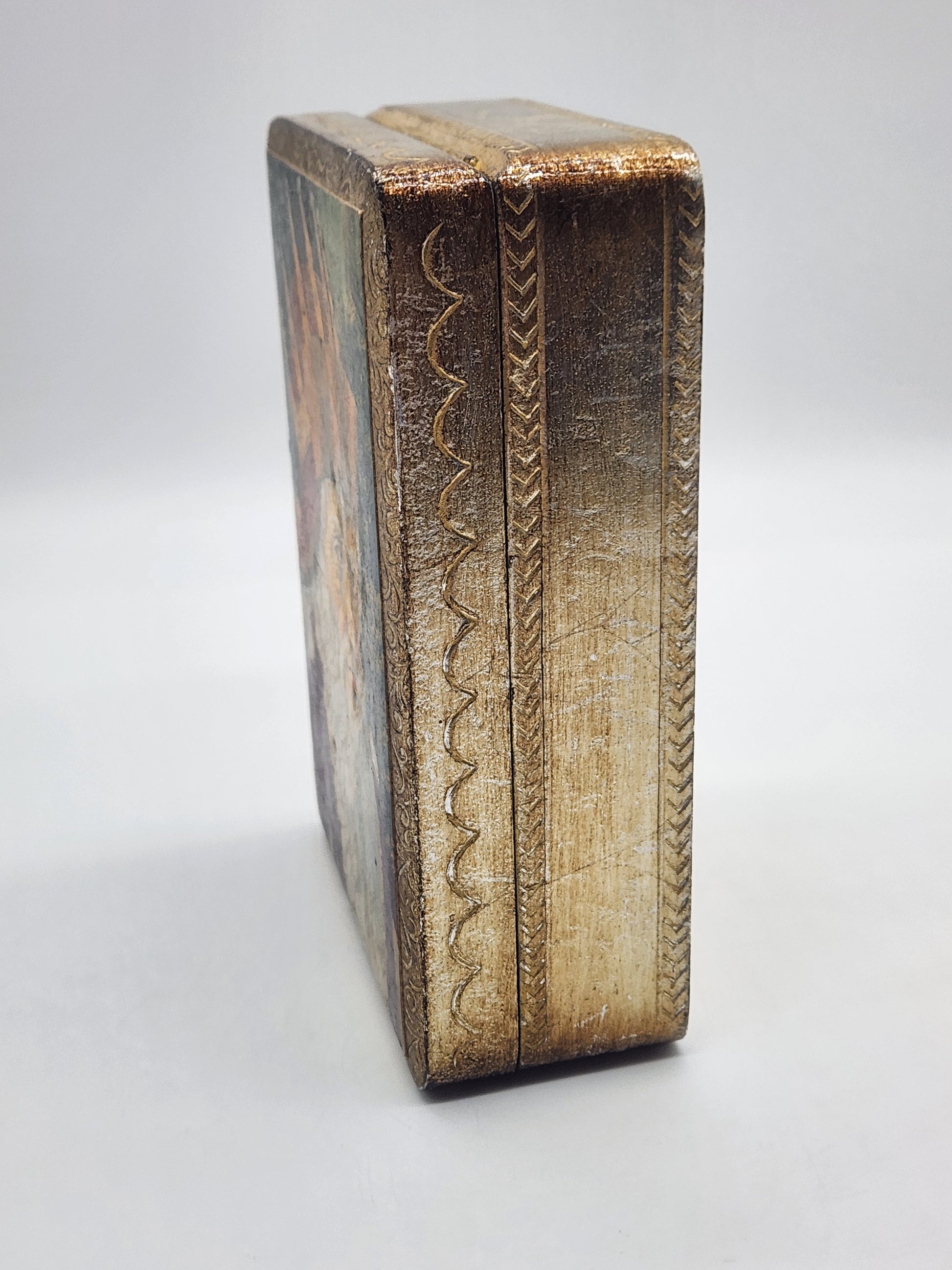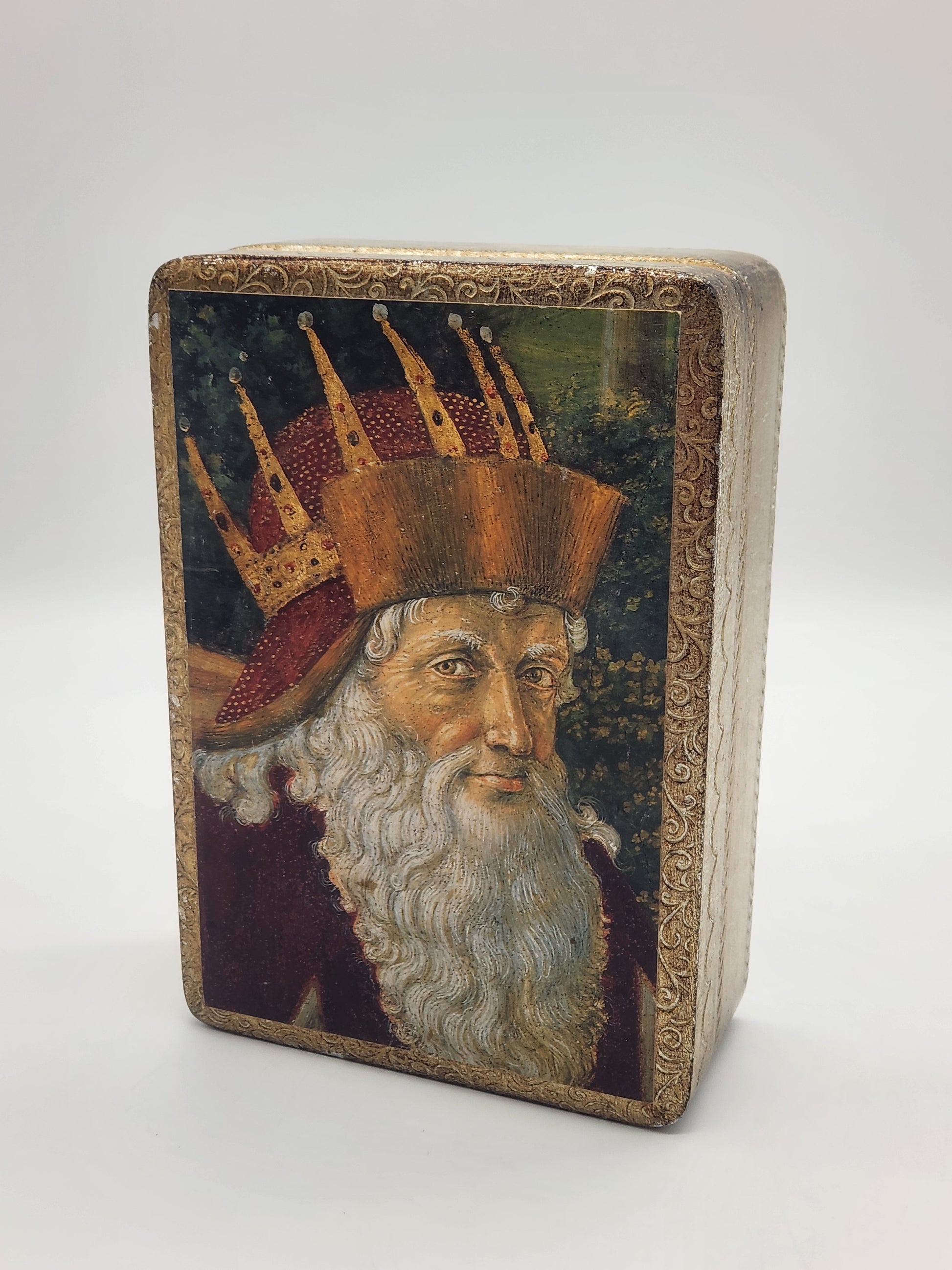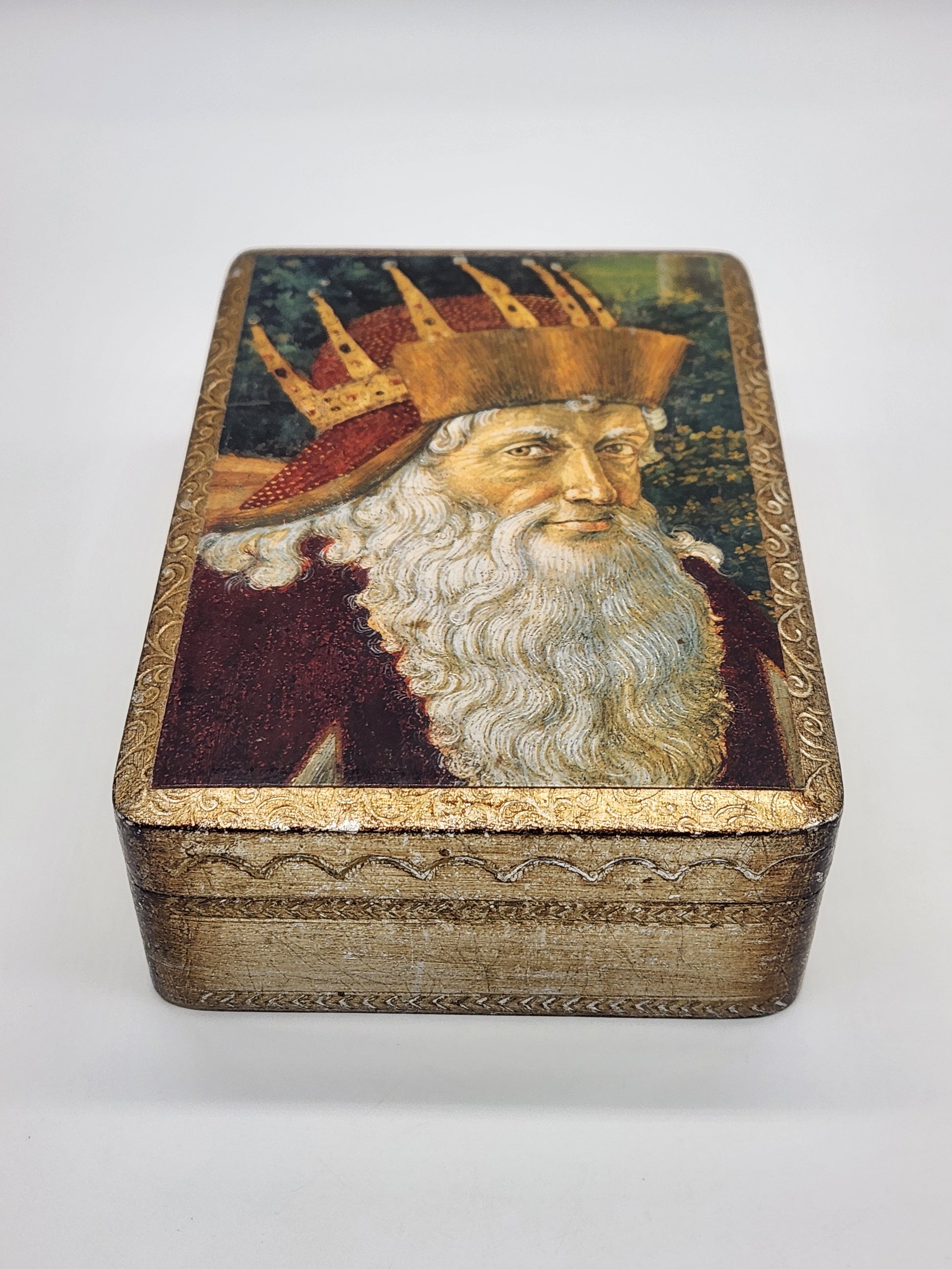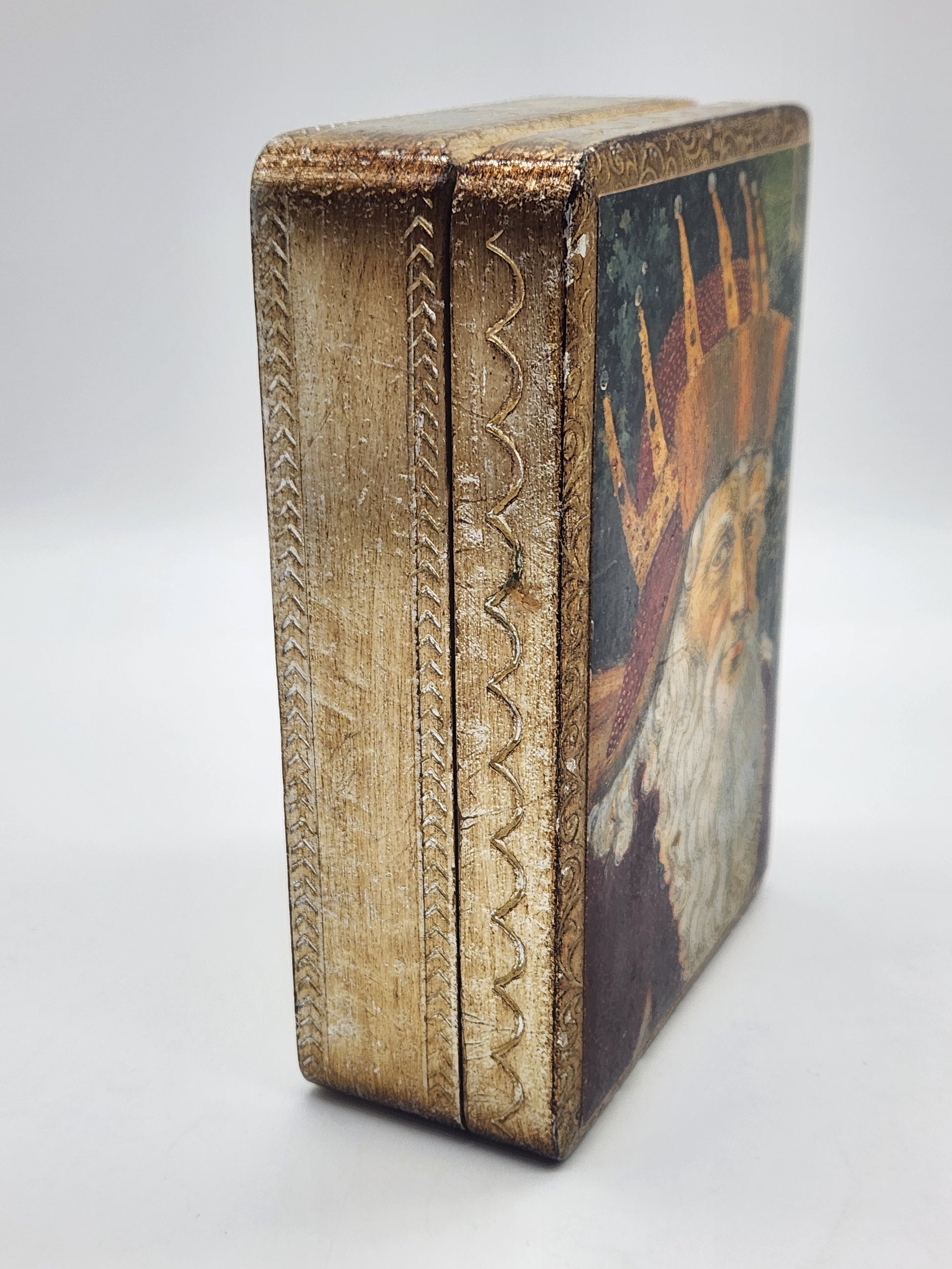 Caspar from Benozzo Gozzoli’s Journey of the Magi in the Cappella Medici Florentine box.  Wood is cracked on inside nail hinge