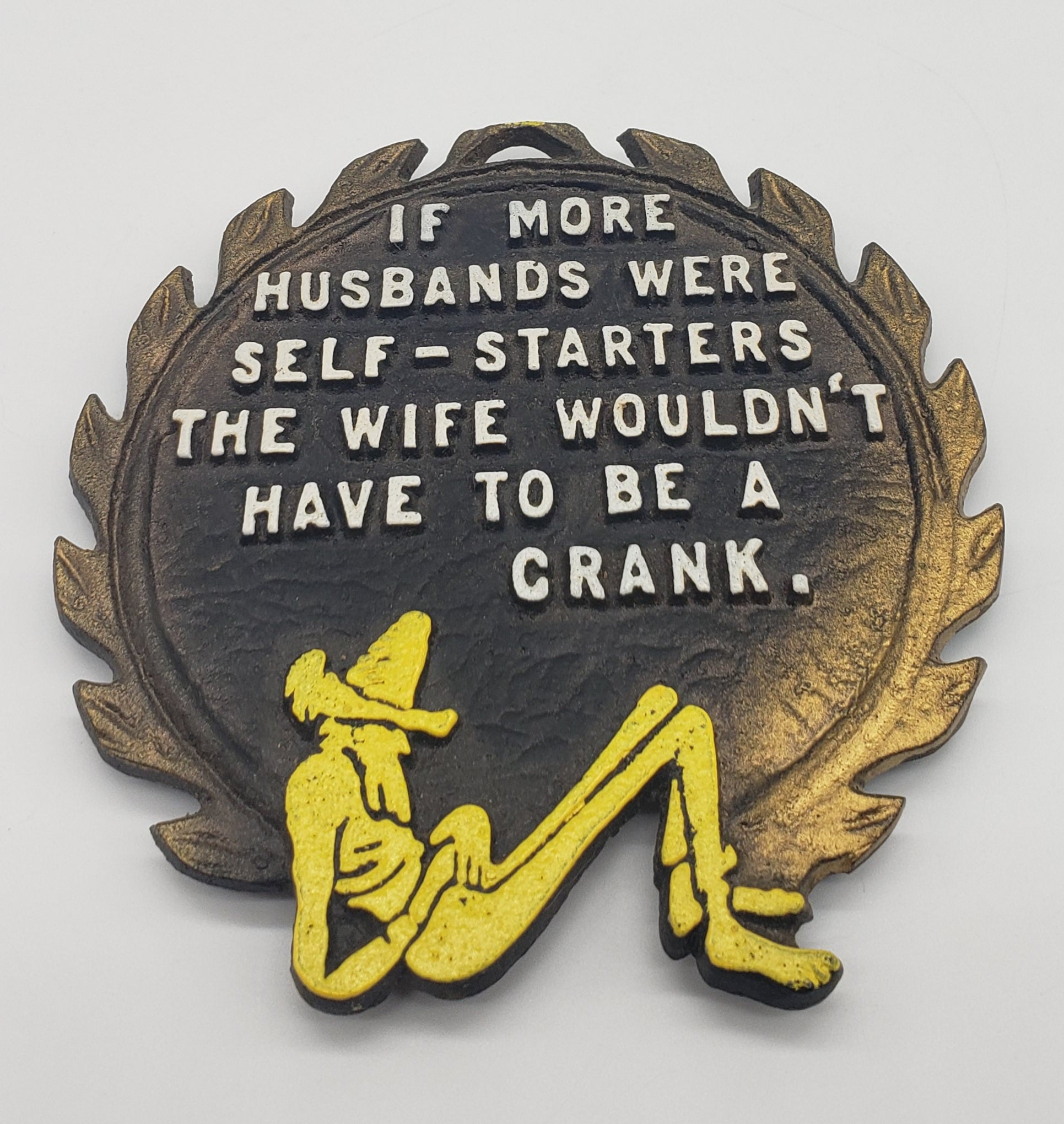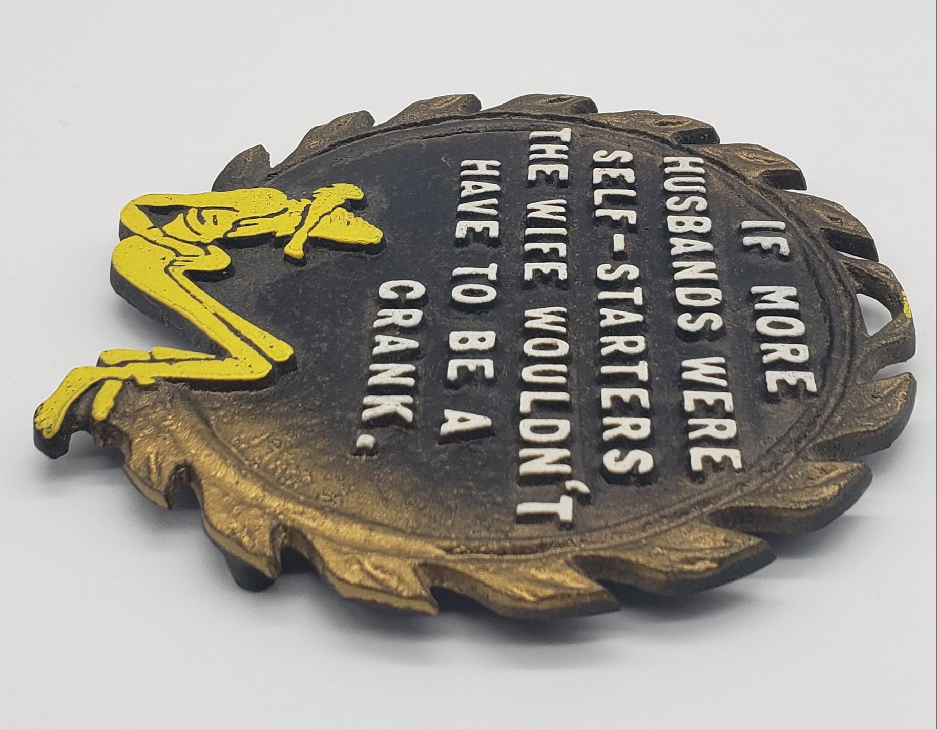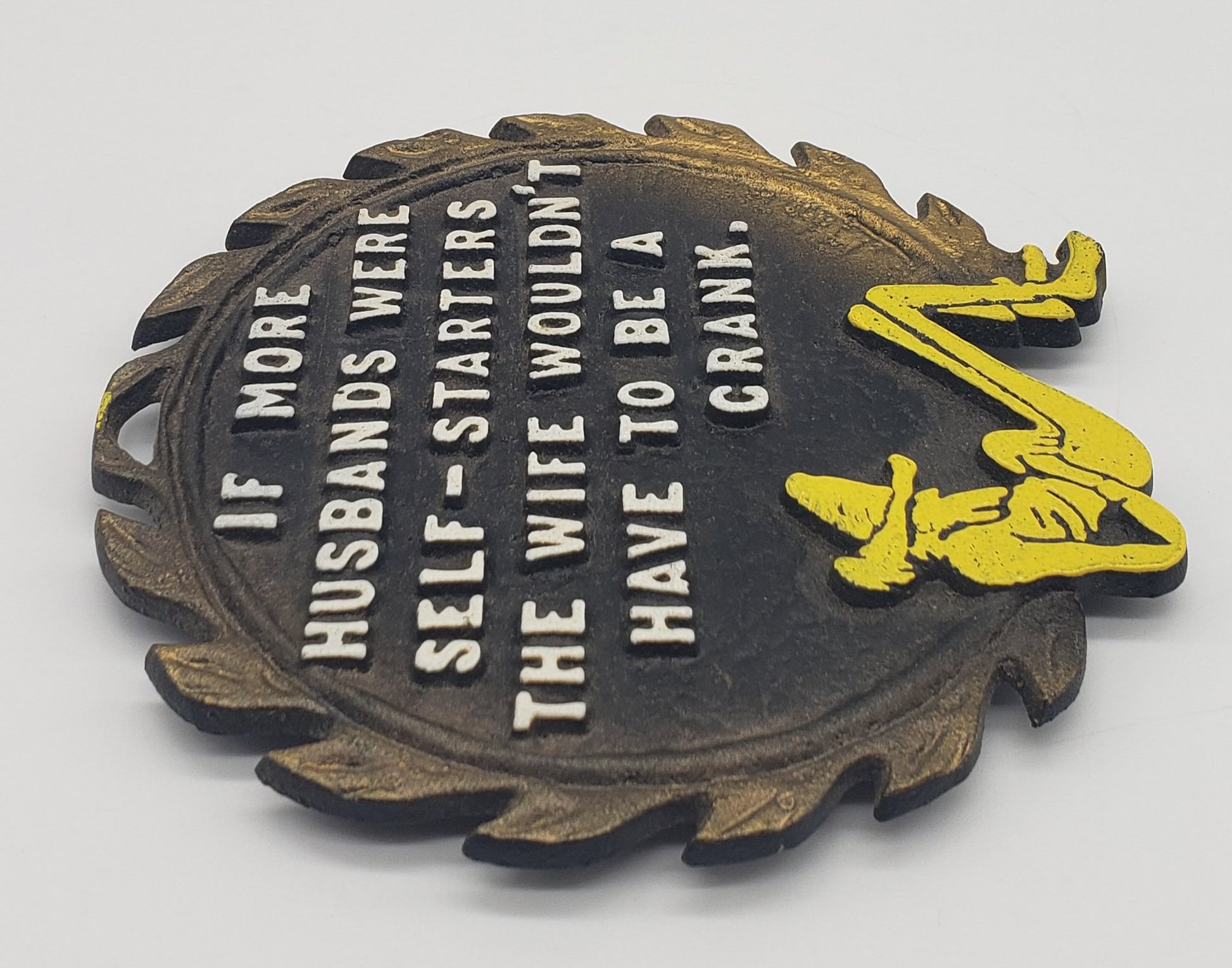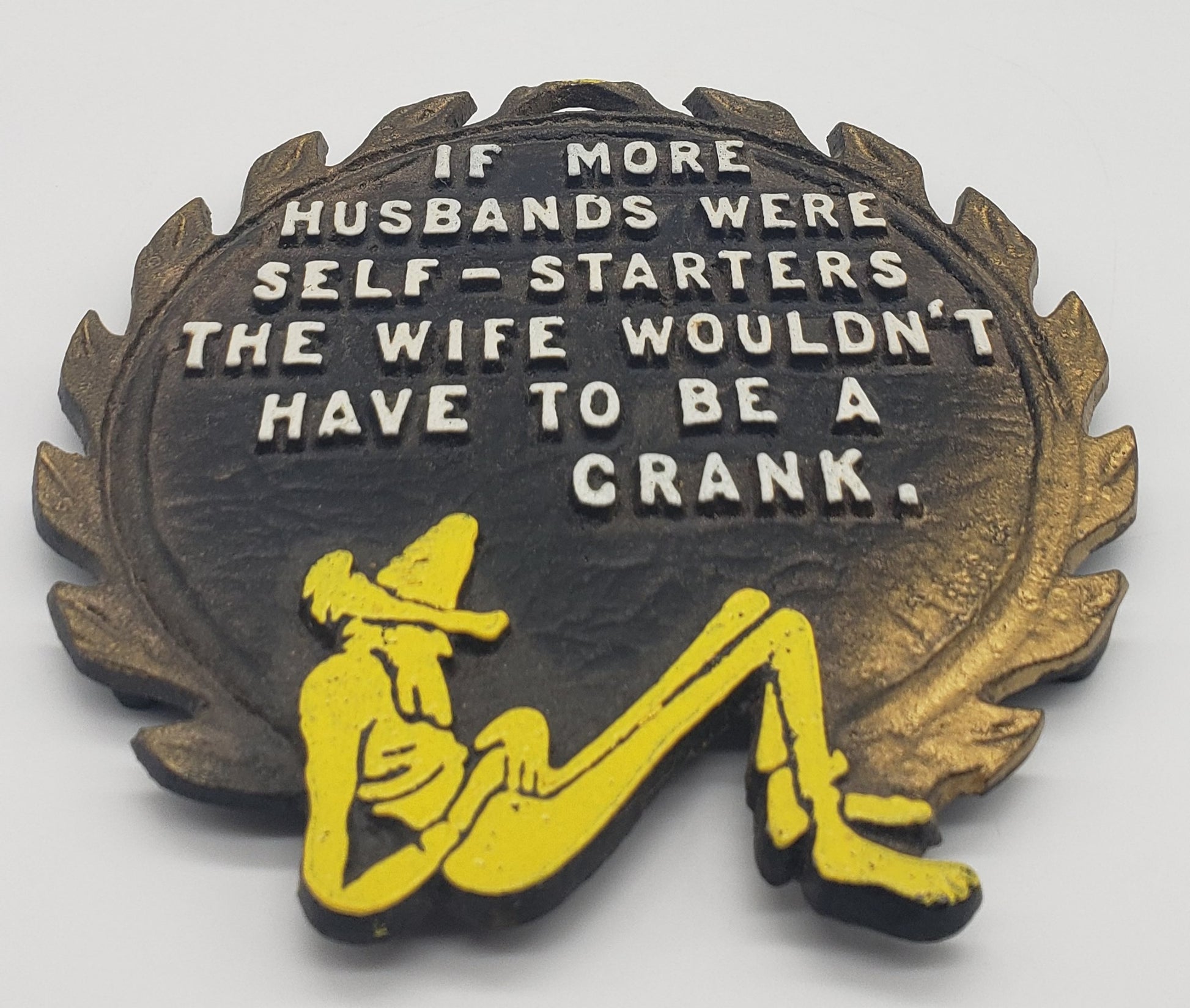 Mid Century 1960's Funny Saying Hillbilly Cast Metal Trivet. It measures 4-5/8" x 5" and has has 3 feet on the bottom and has a little surface wear on the surface but is in overall good condition. Great for use or wall hanging.