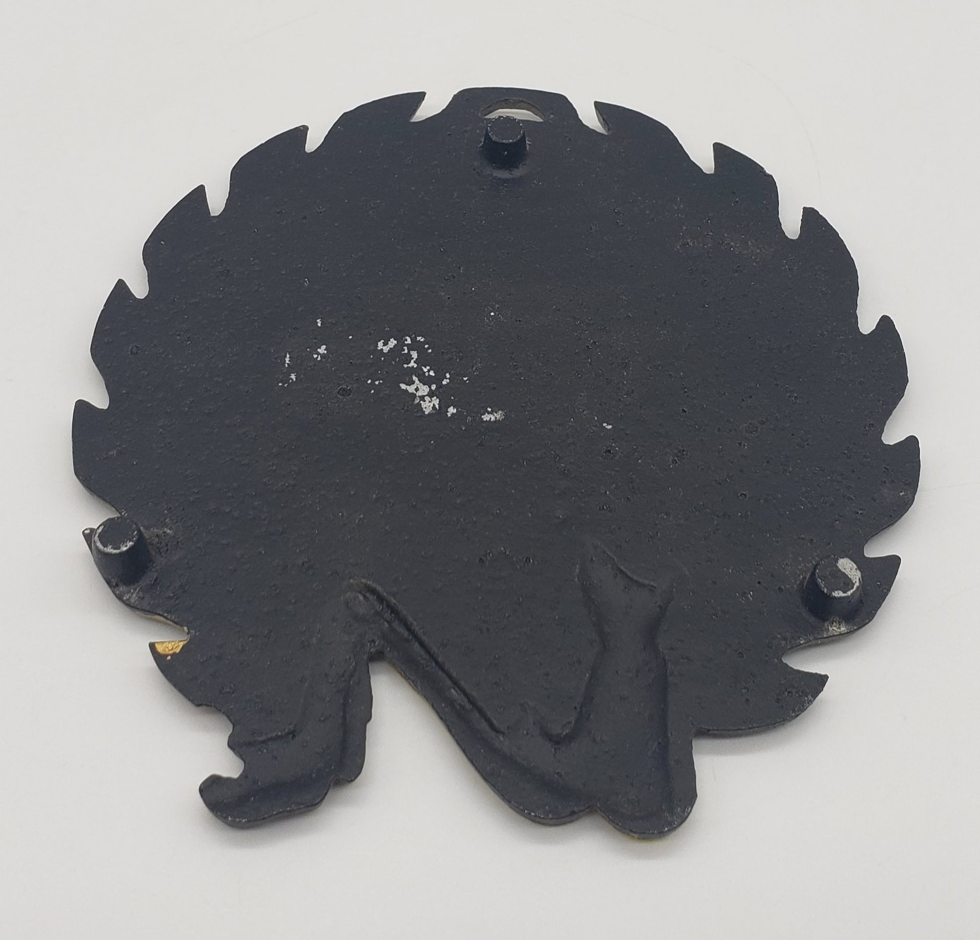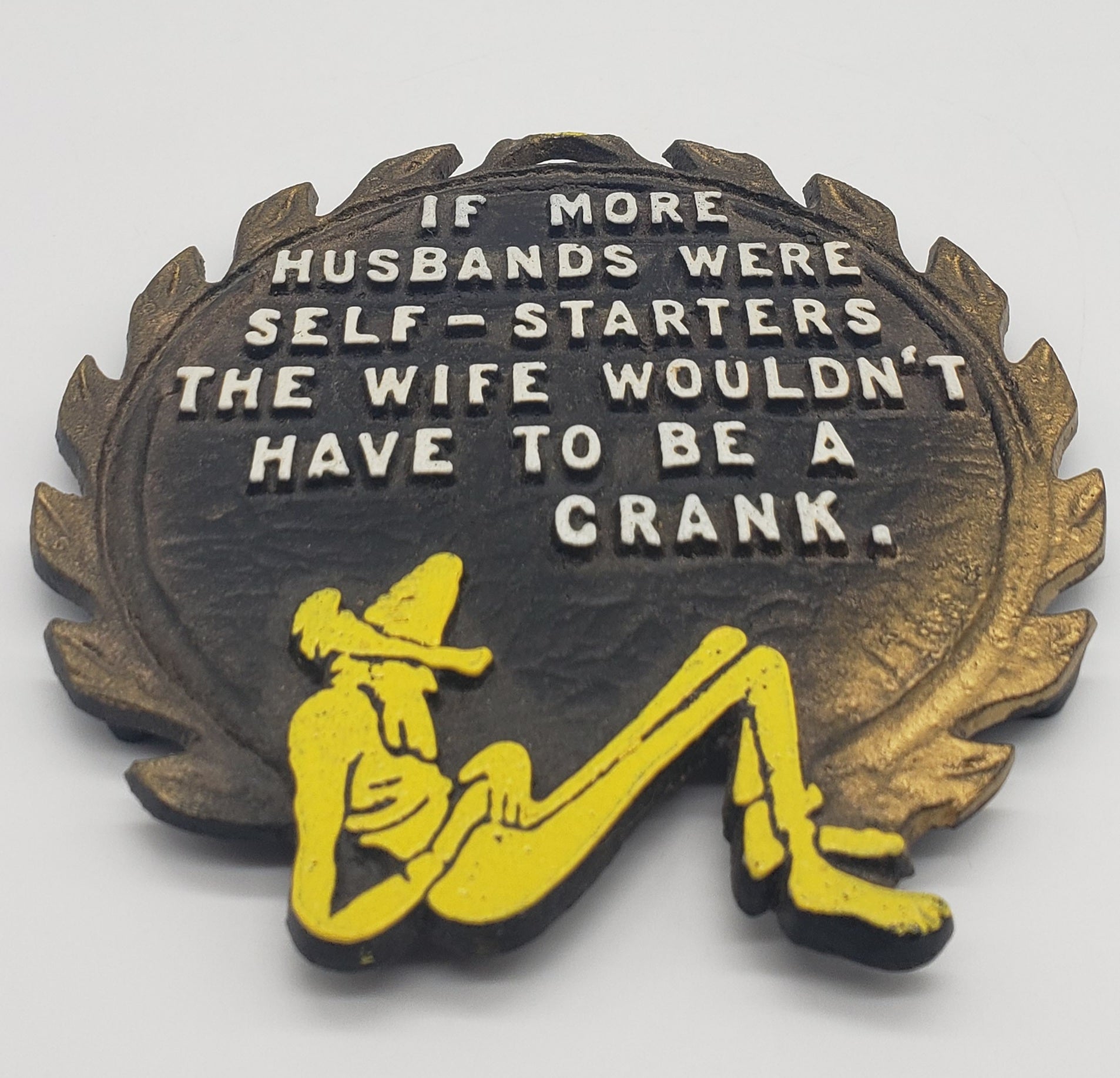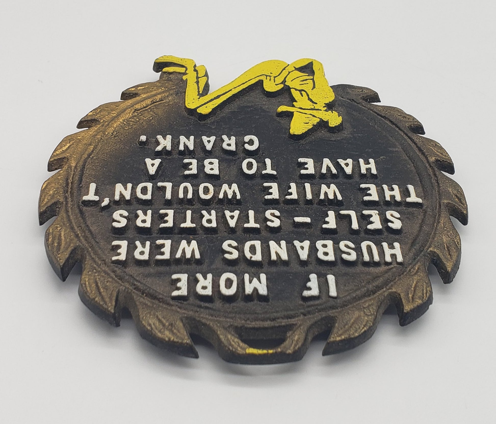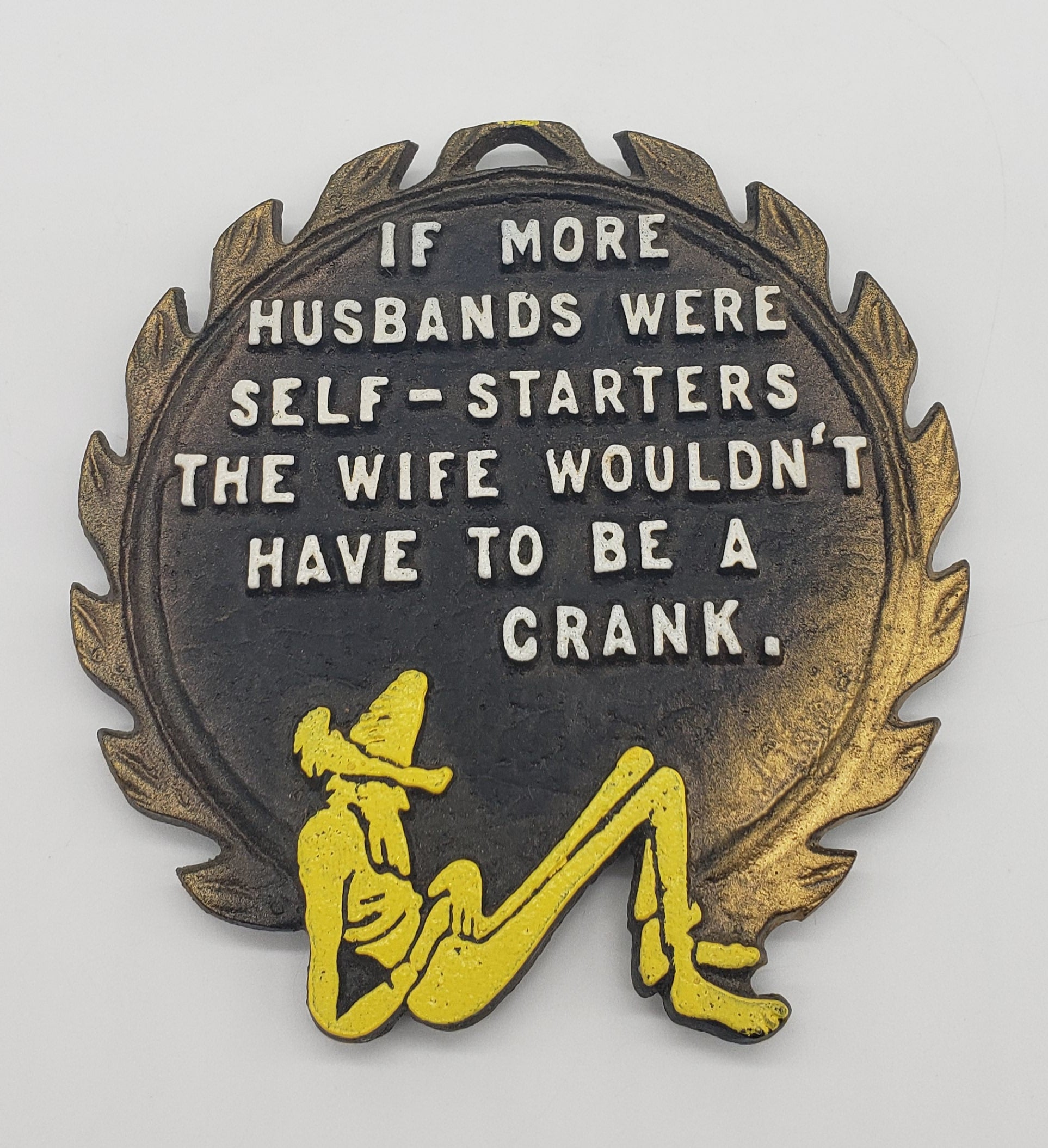 Mid Century 1960's Funny Saying Hillbilly Cast Metal Trivet. It measures 4-5/8" x 5" and has has 3 feet on the bottom and has a little surface wear on the surface but is in overall good condition. Great for use or wall hanging.