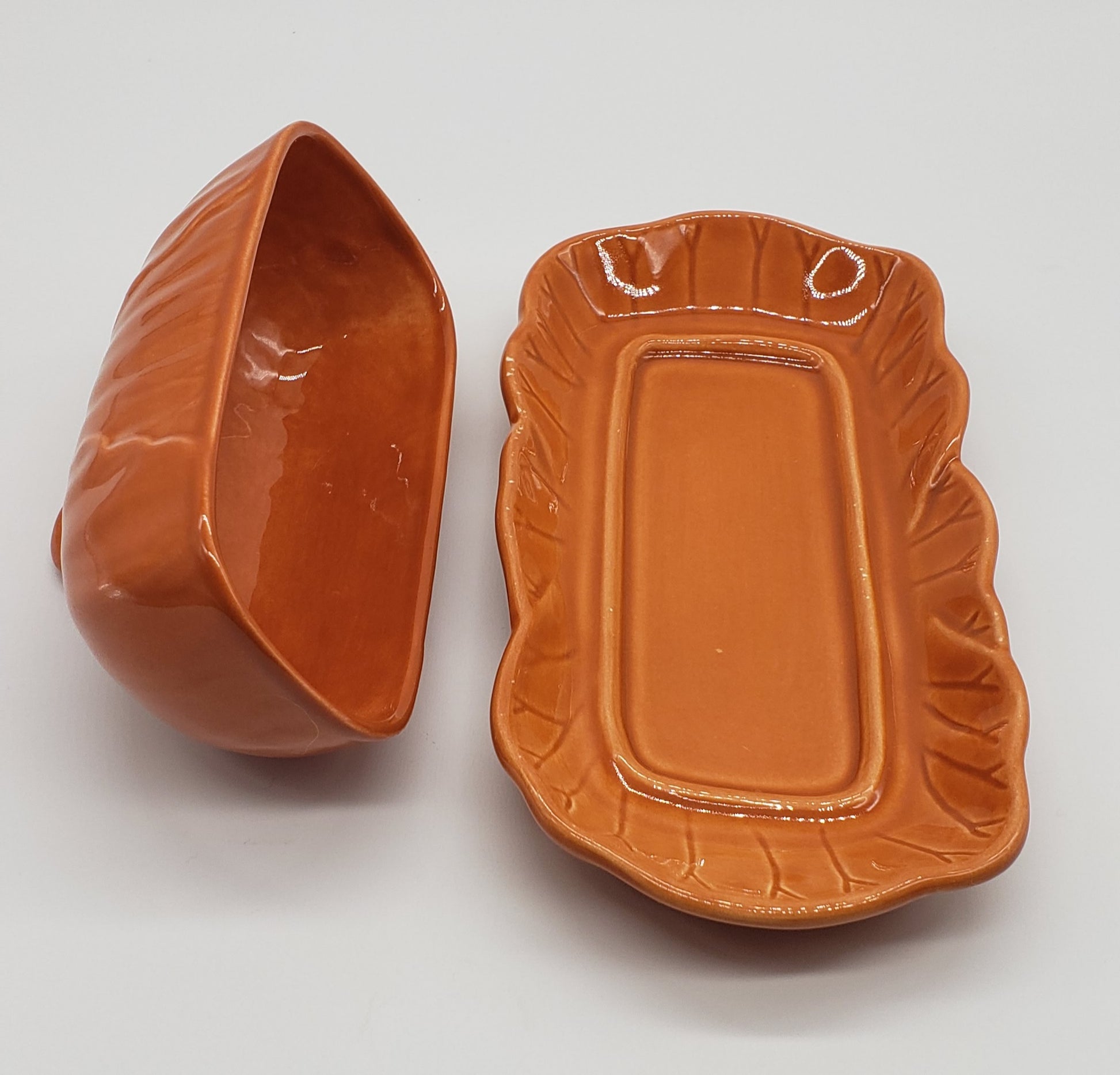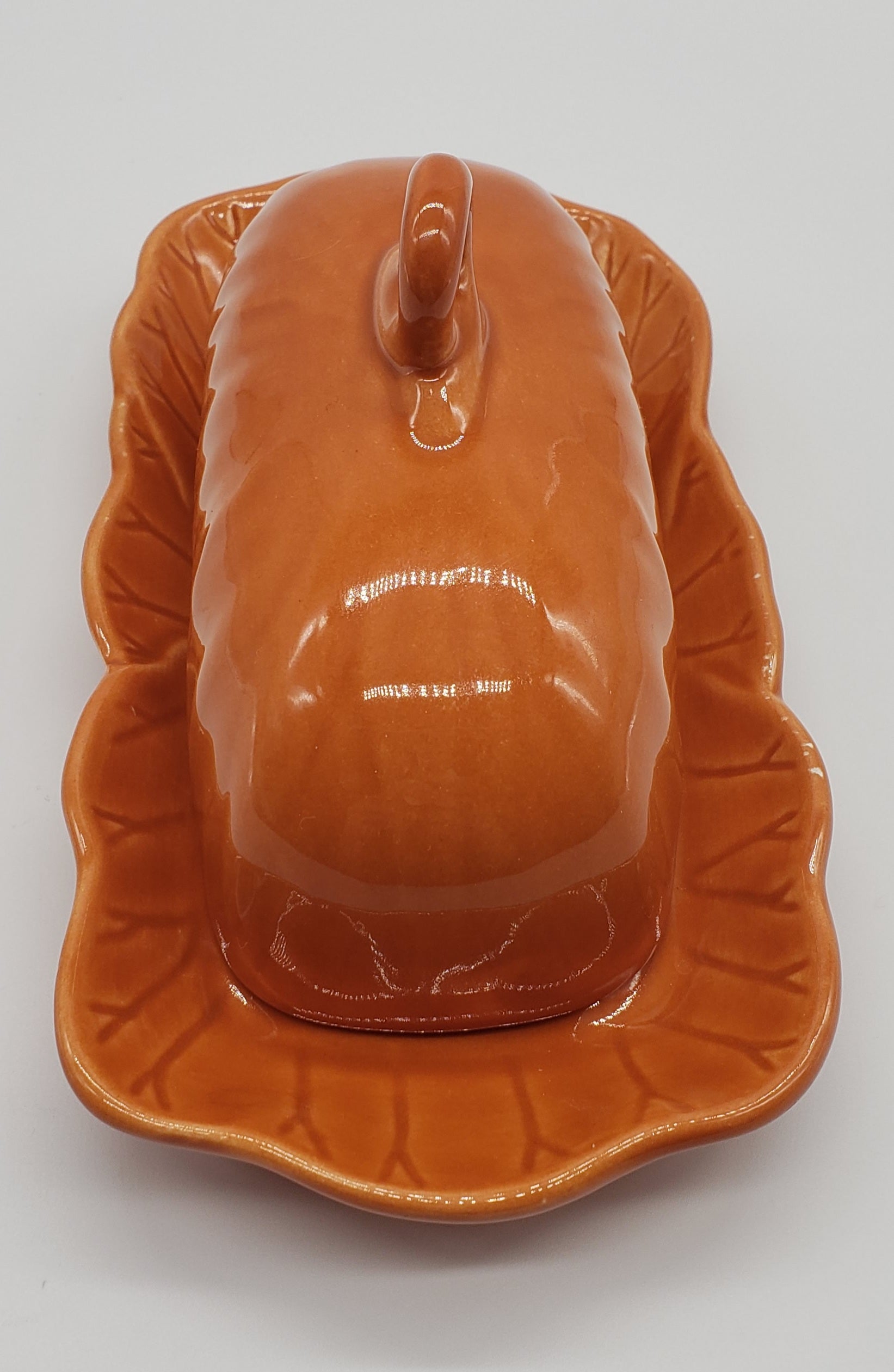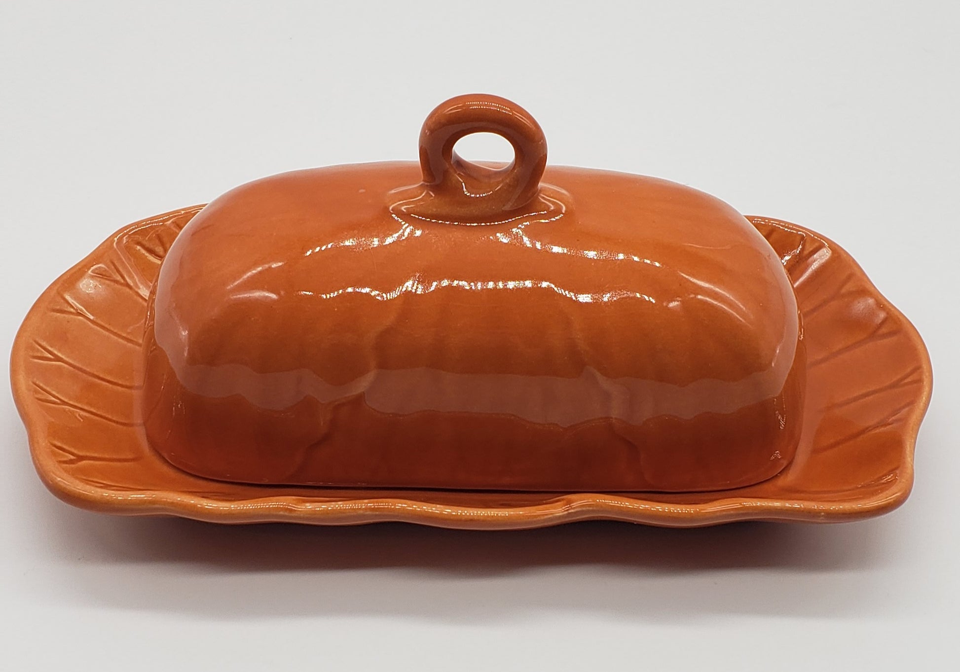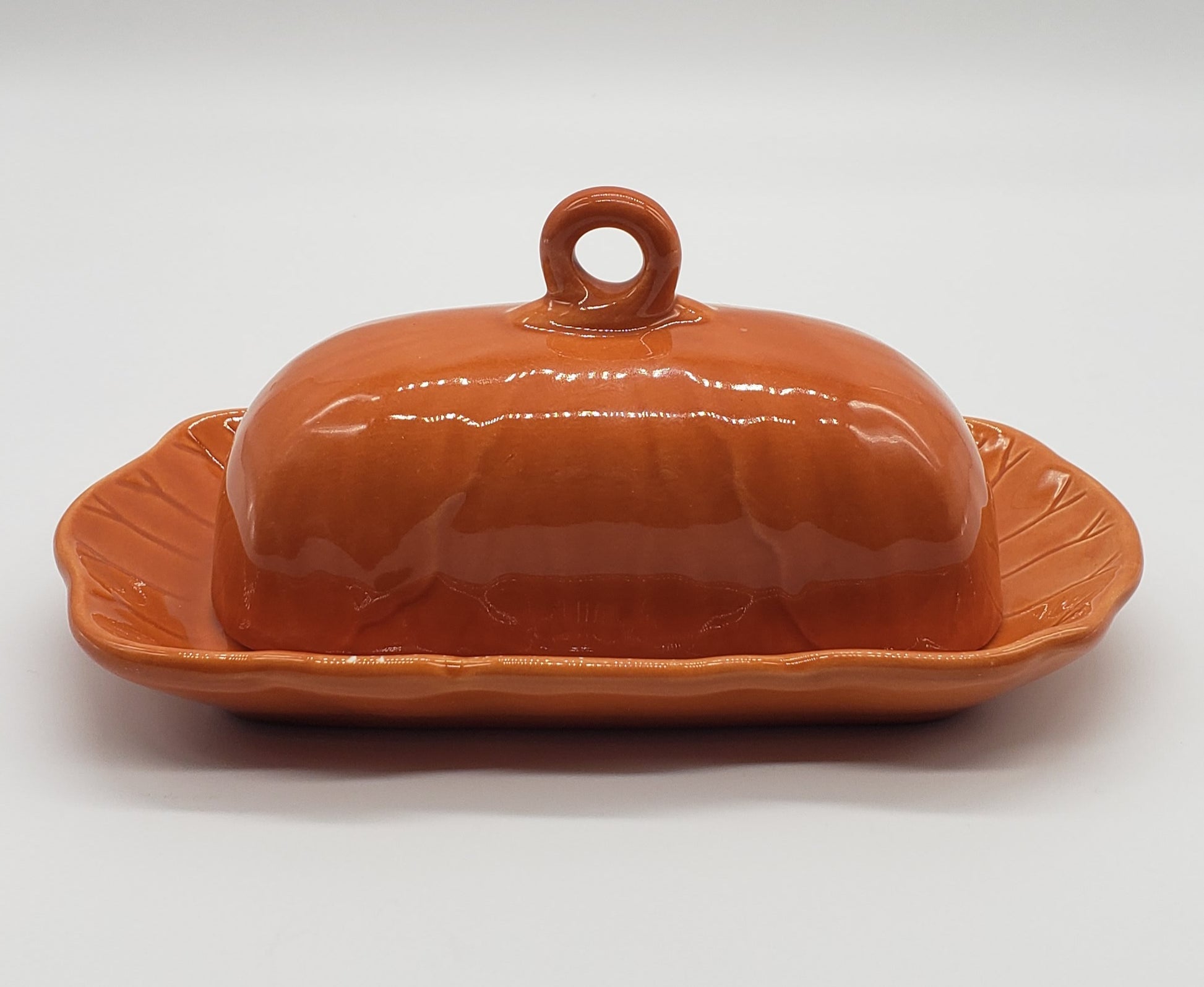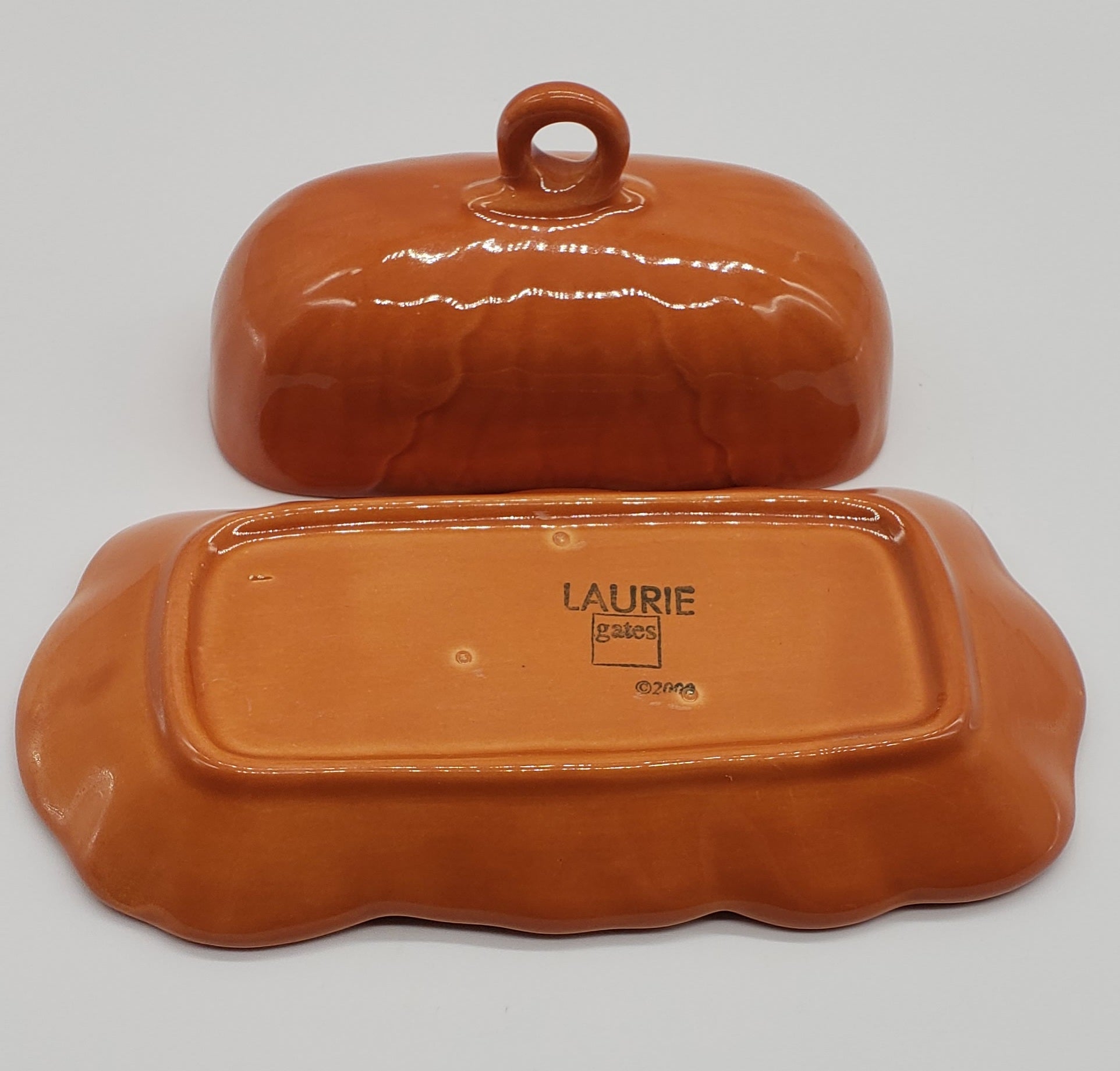 Laurie Gates Orange Ceramic Covered Butter Dish. See photos for small flea bites on side.