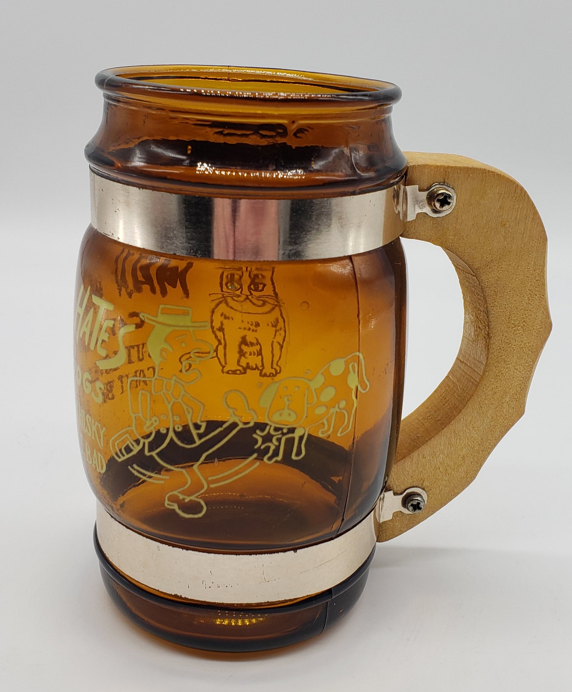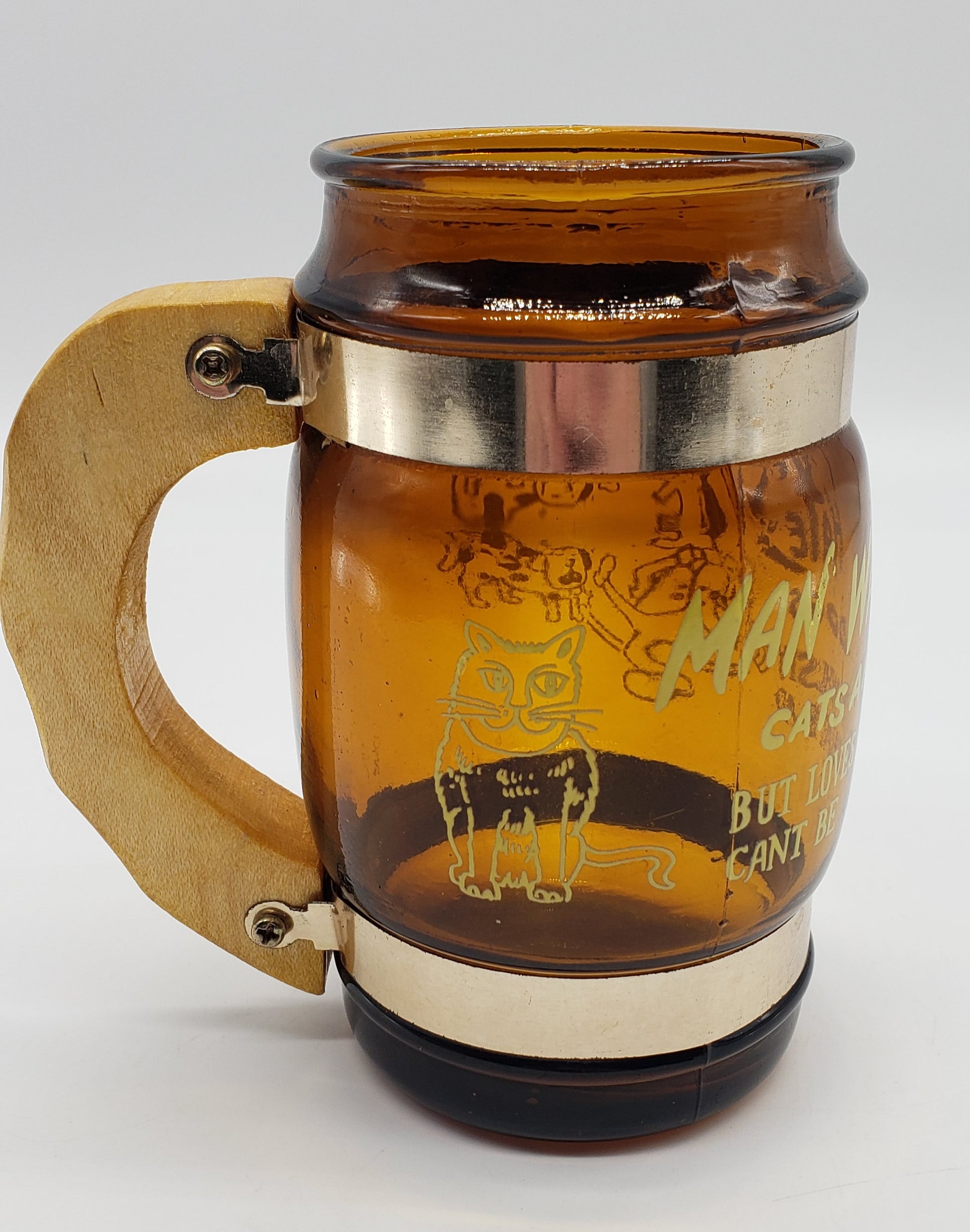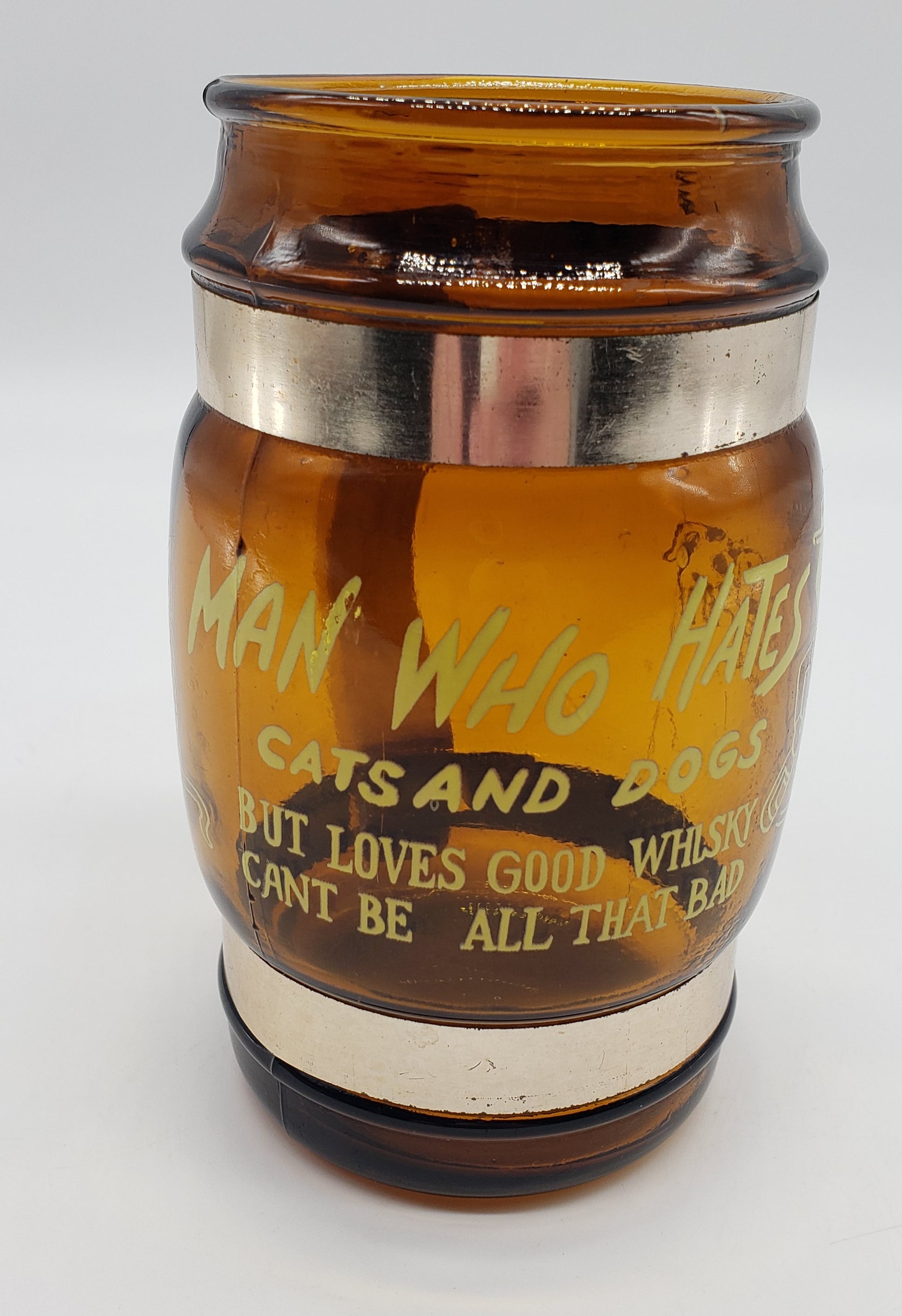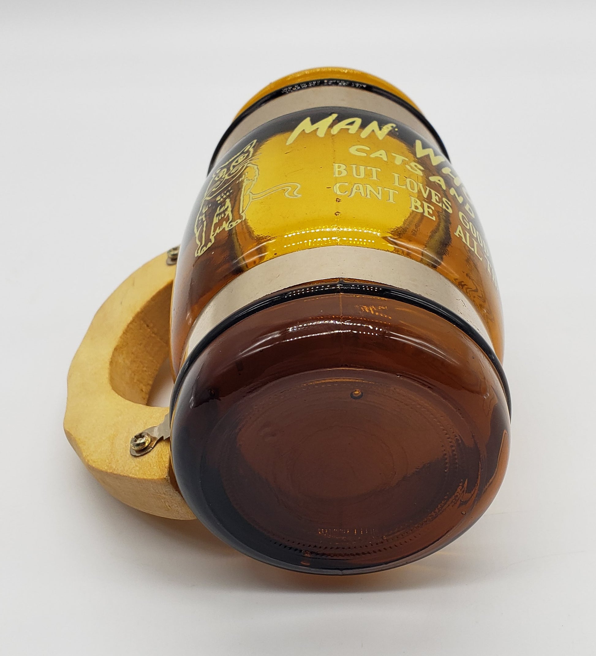 Siesta Ware Amber Glass Barware Barrel Mug w/ Wooden Handle featuring "Man who hates cats and dogs but loves good whiskey cant be all that bad"