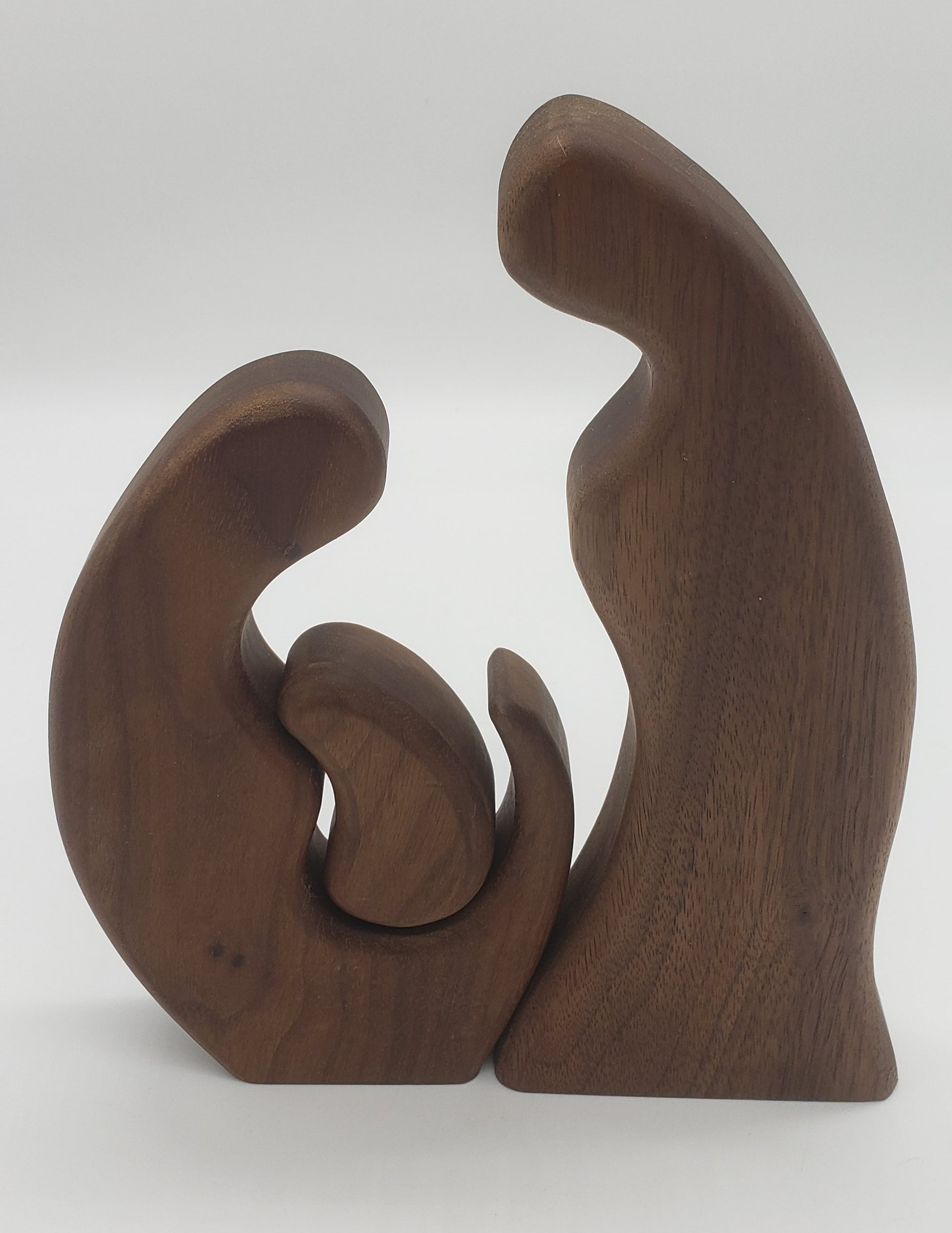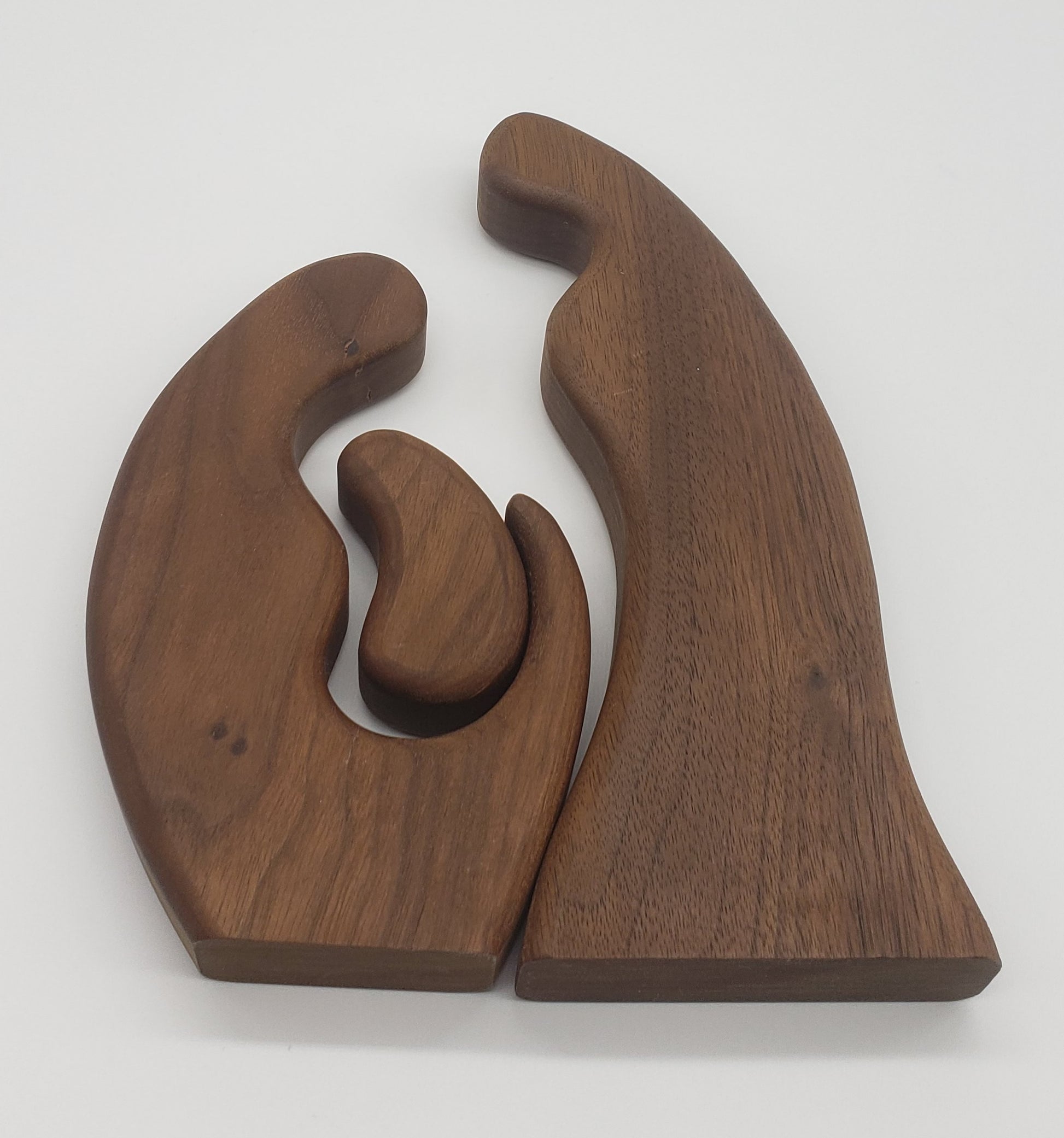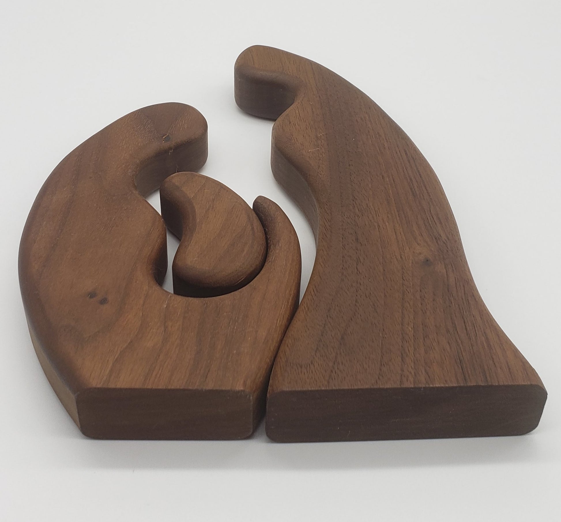 Holy Family statues in wood with Joseph overlooking Mary and Jesus. Mary holding baby Jesus.