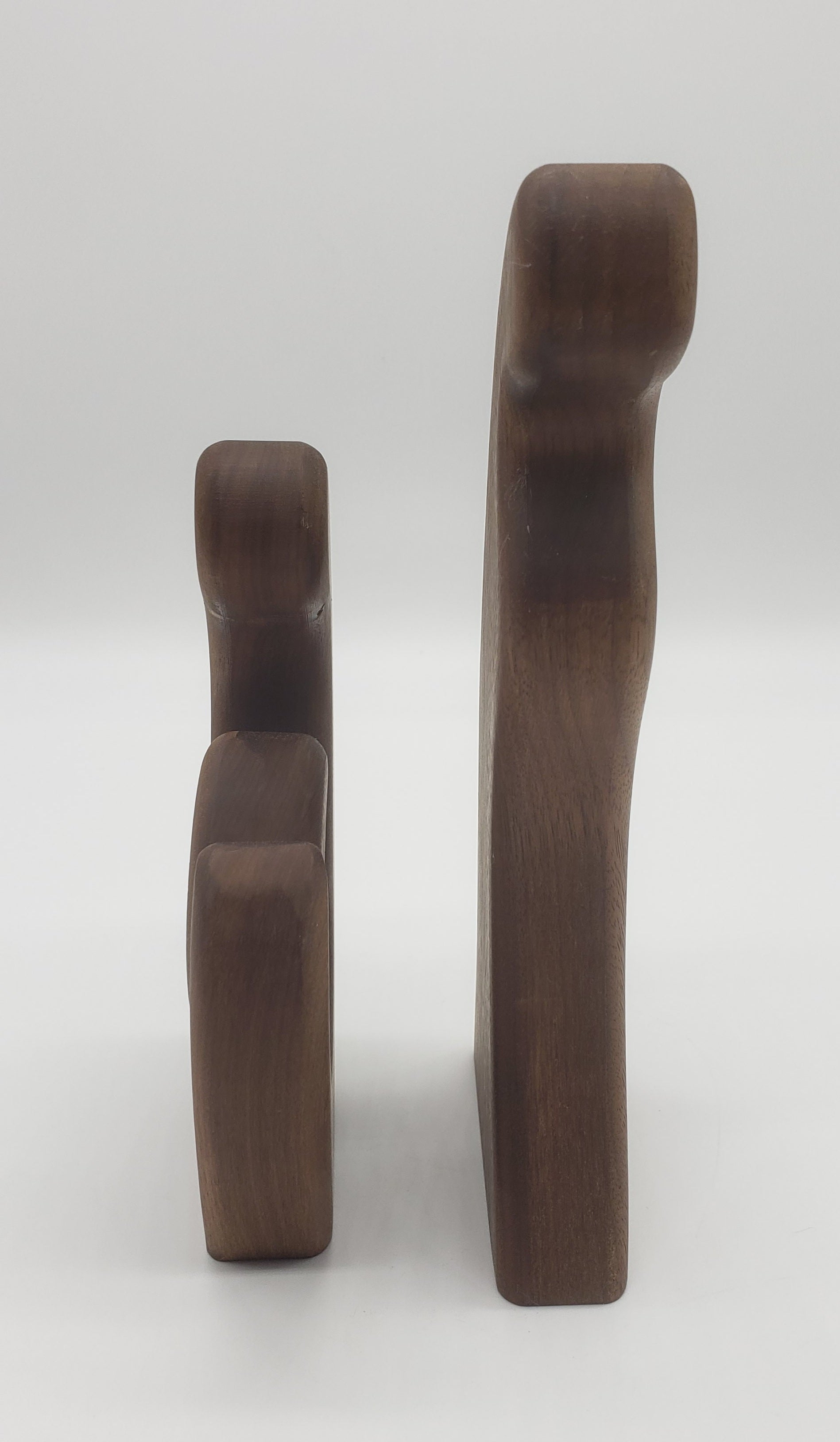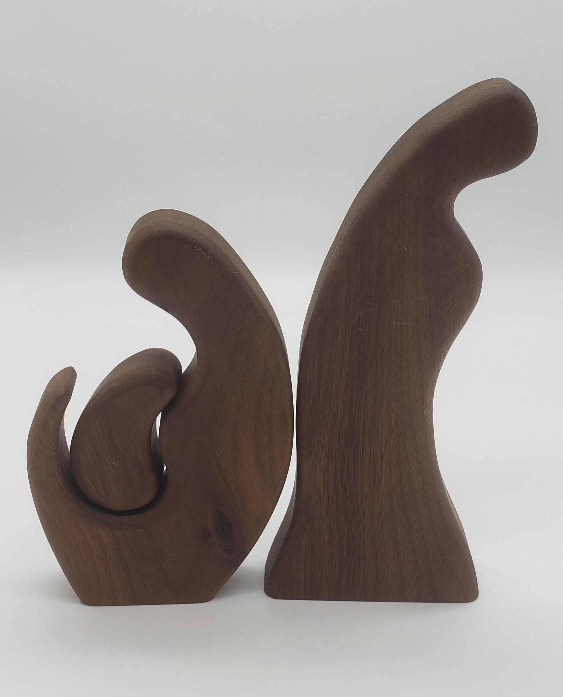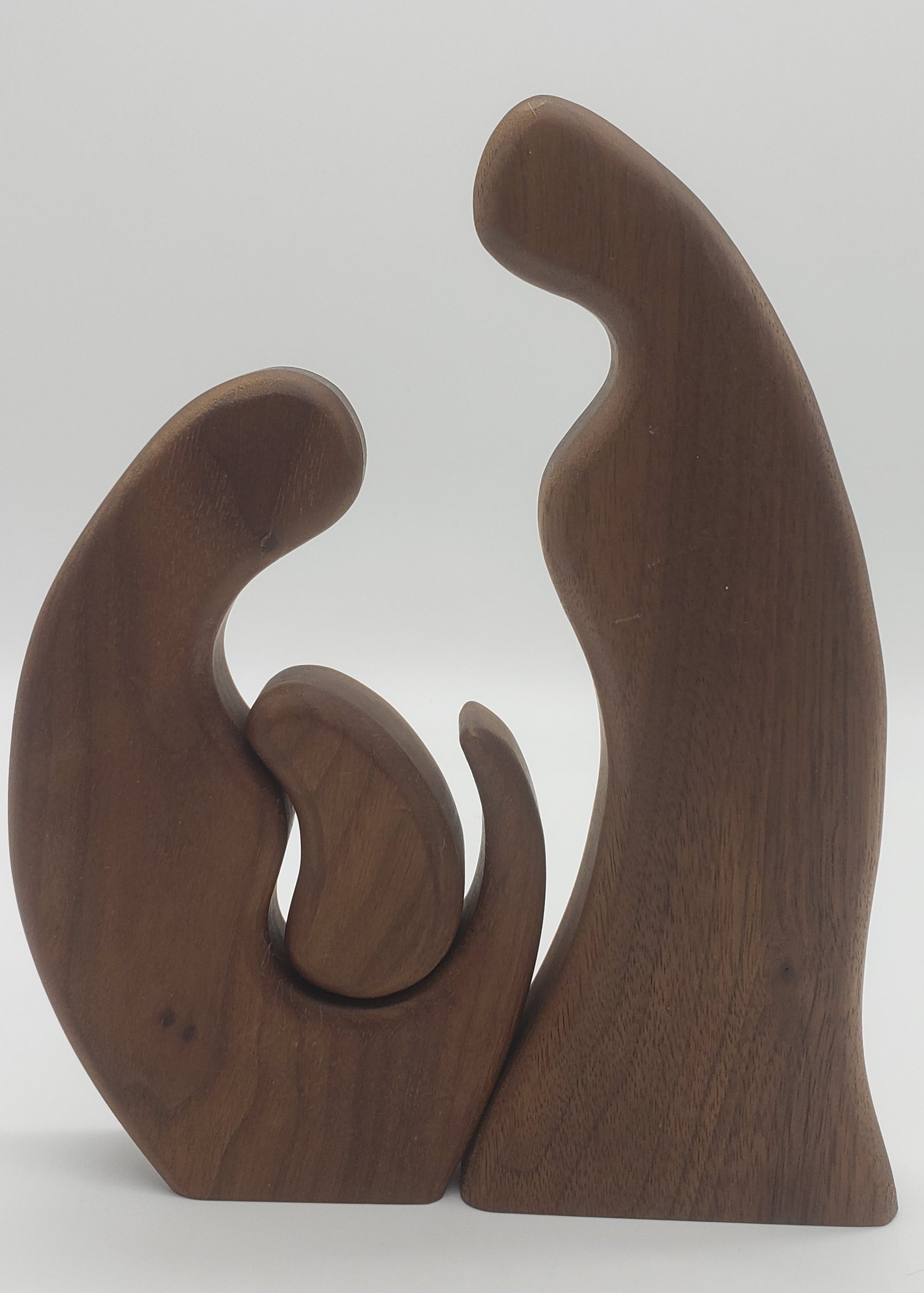 Holy Family statues in wood with Joseph overlooking Mary and Jesus. Mary holding baby Jesus.