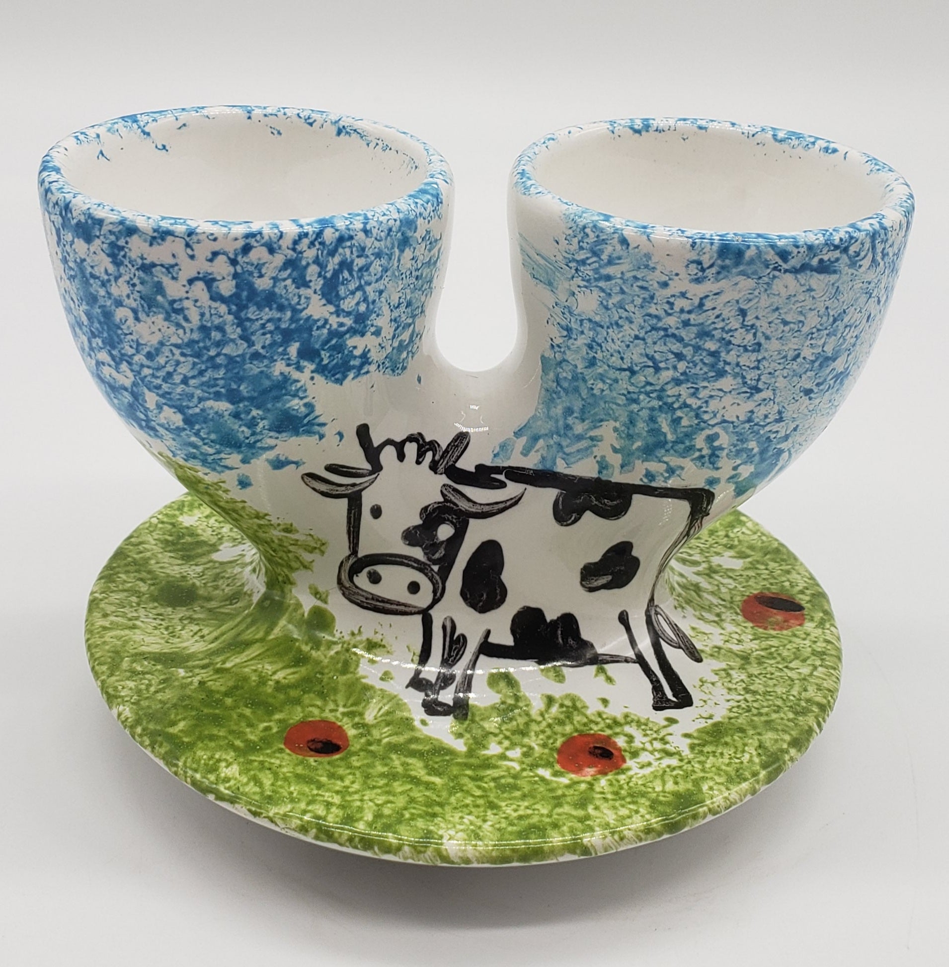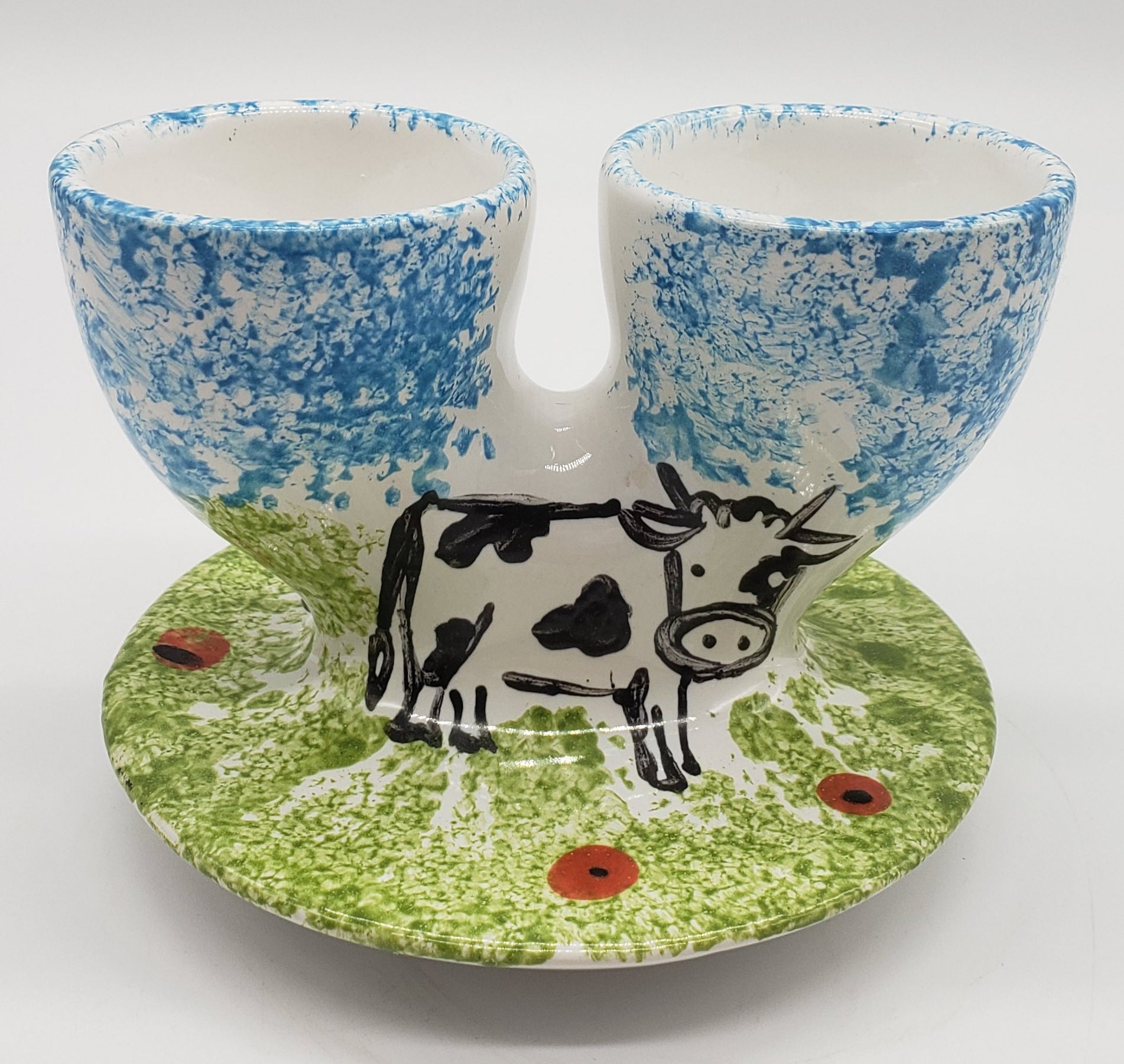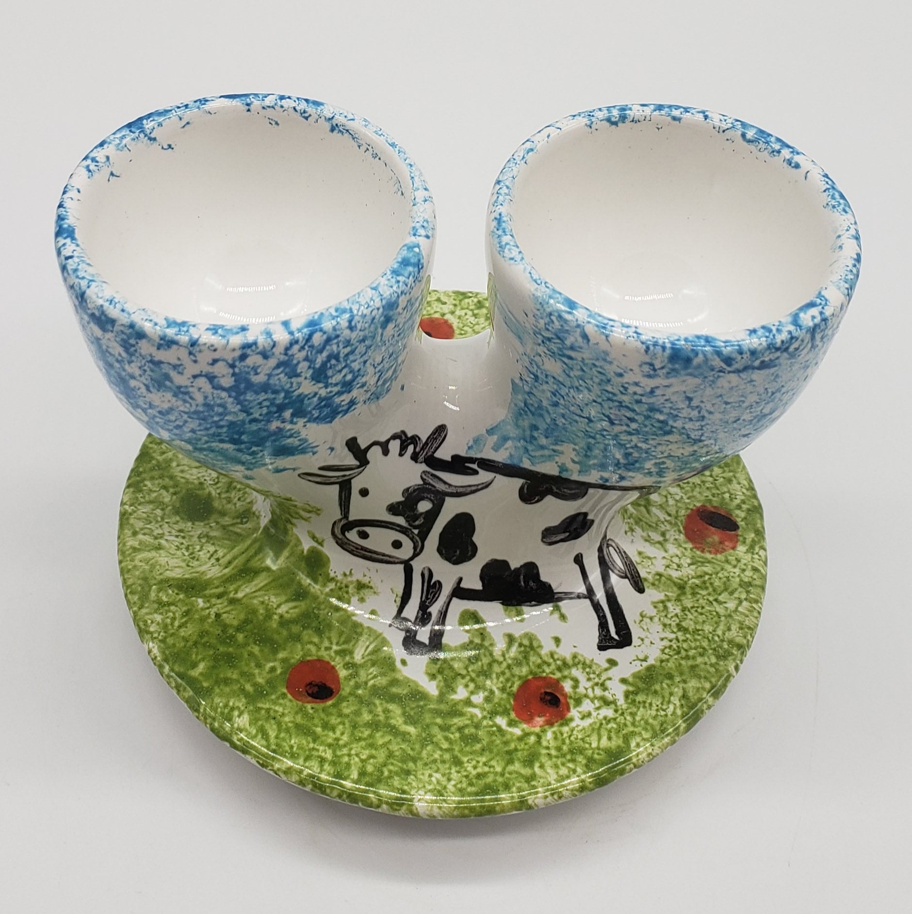 Honiton Double Egg Cup Pottery with hand painted cow in the meadow.
