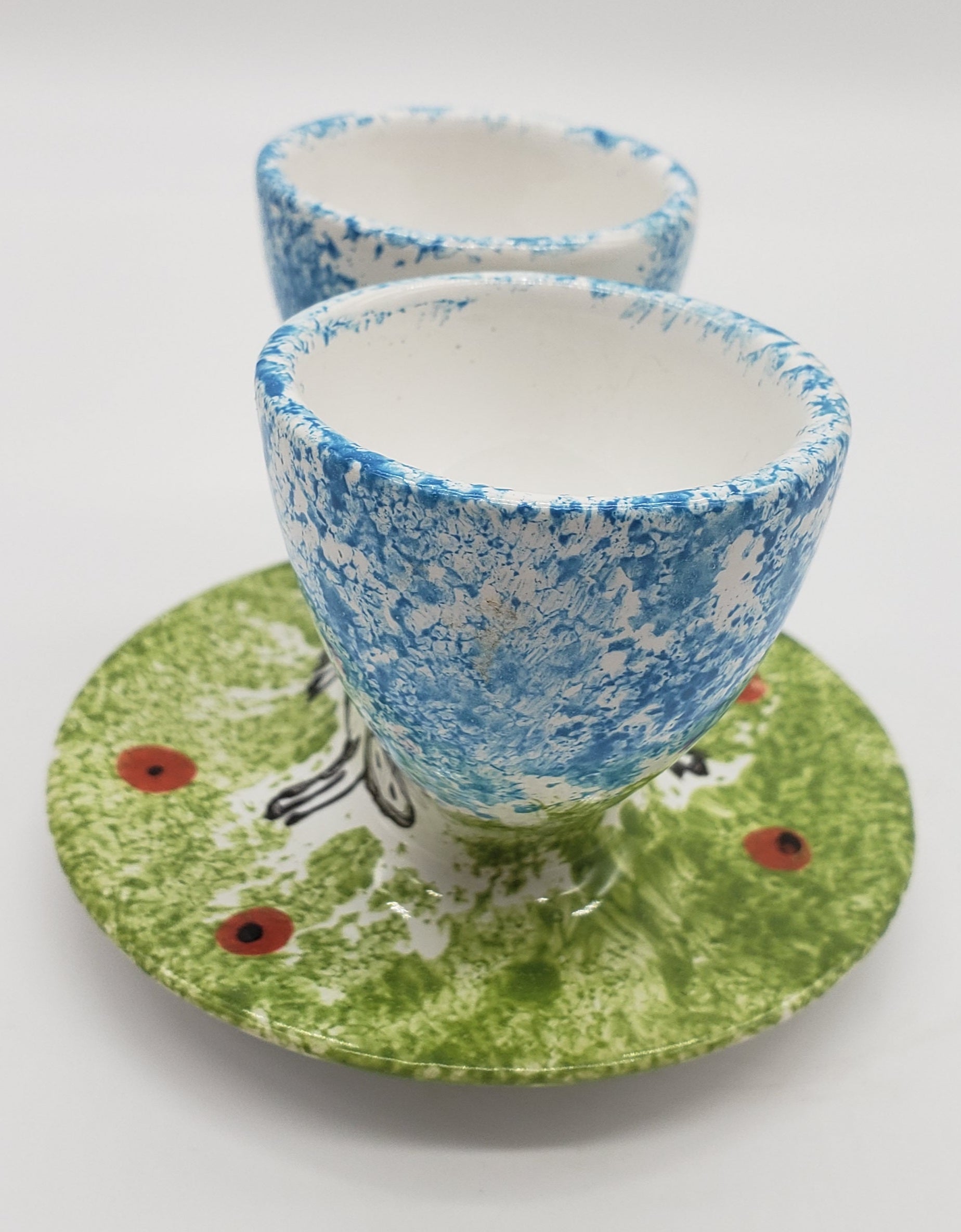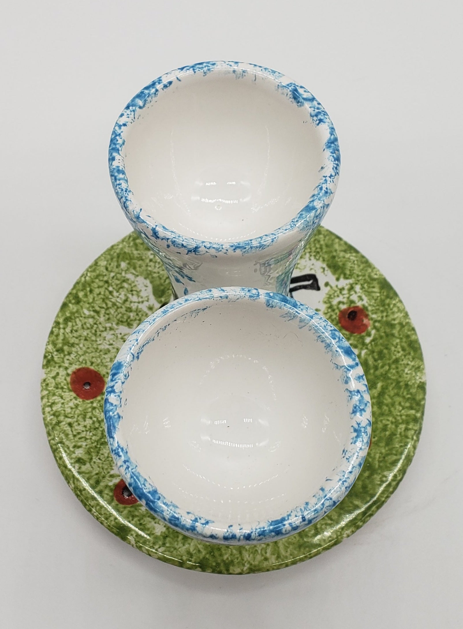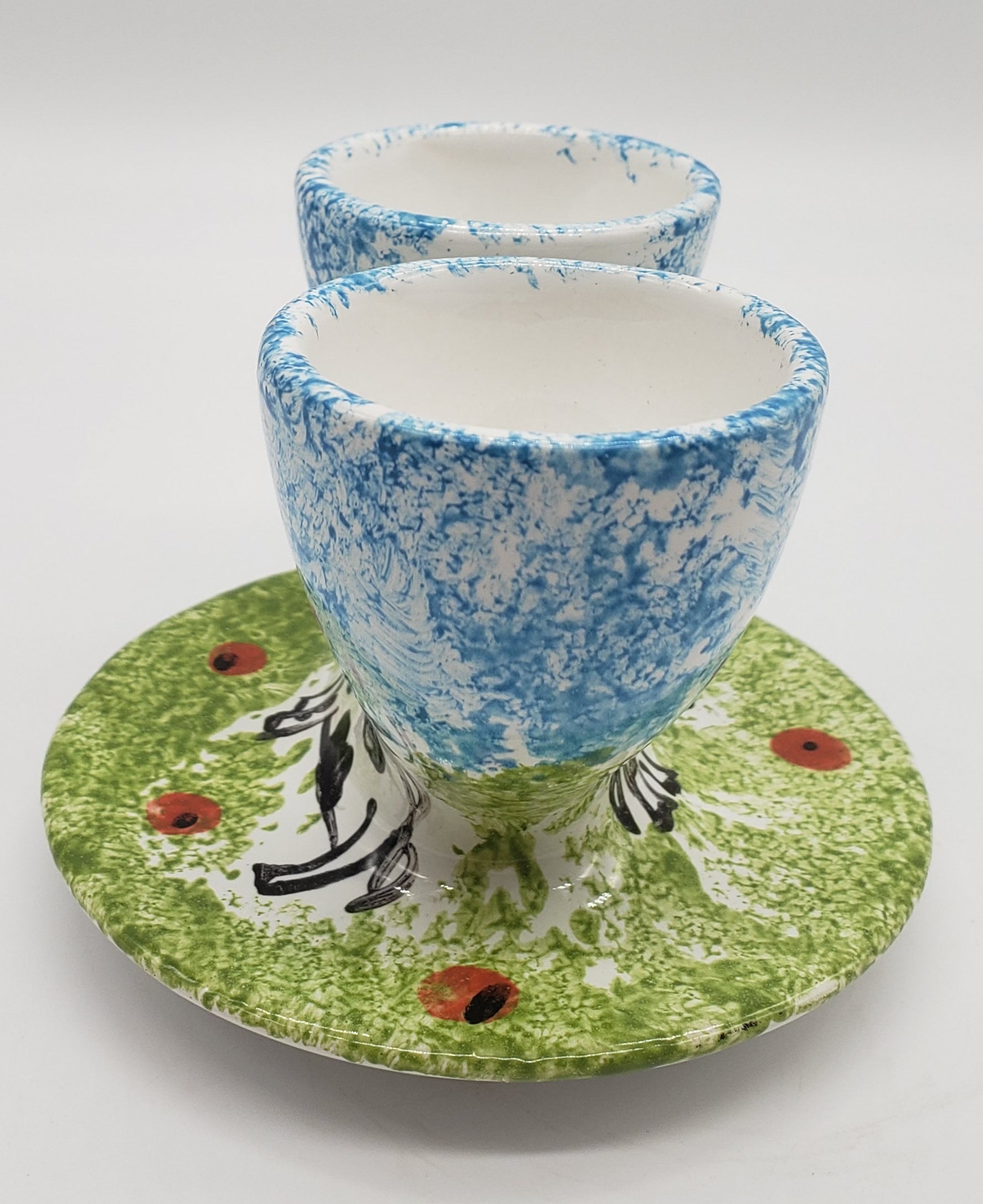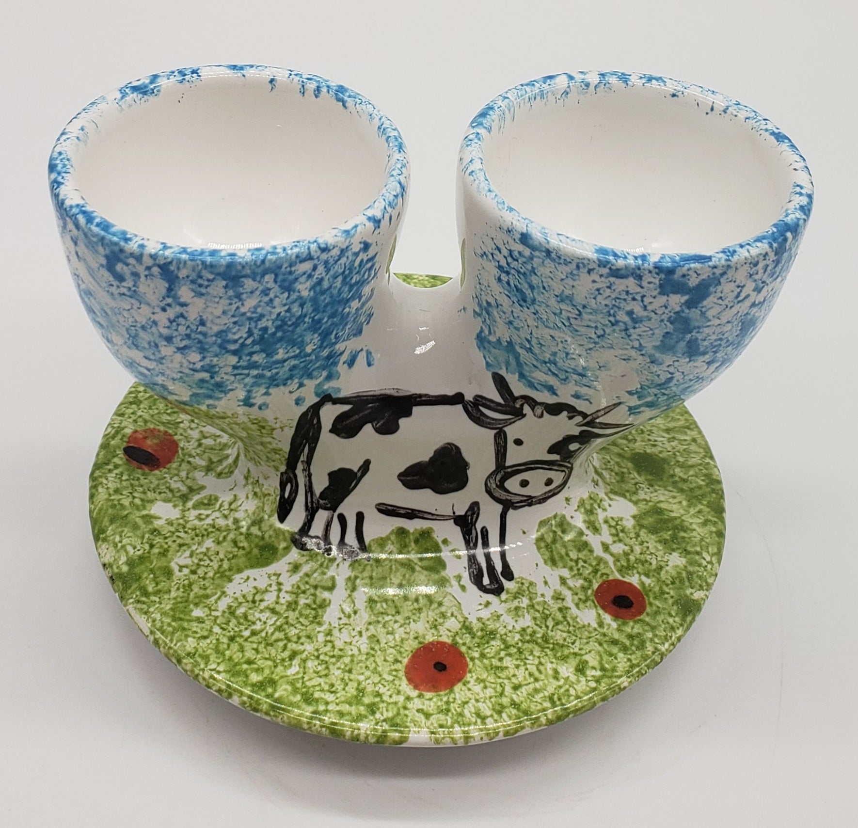 Honiton Double Egg Cup Pottery with hand painted cow in the meadow.