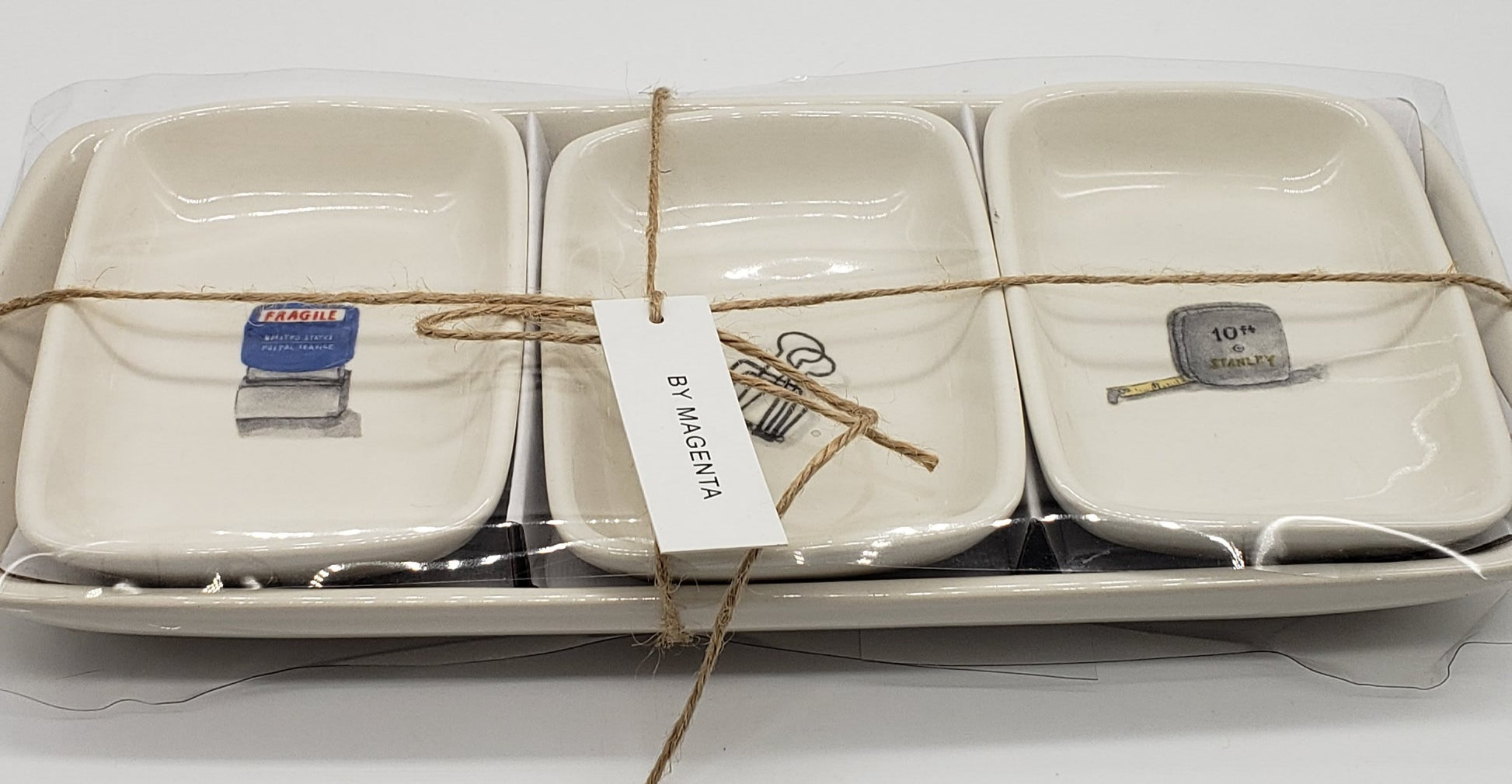Rae Dunn Fragile Stamp, Clip, Tape Measure Desk Set Organizer 4-Pc Trinket Dish BRAND NEW, still in plastic