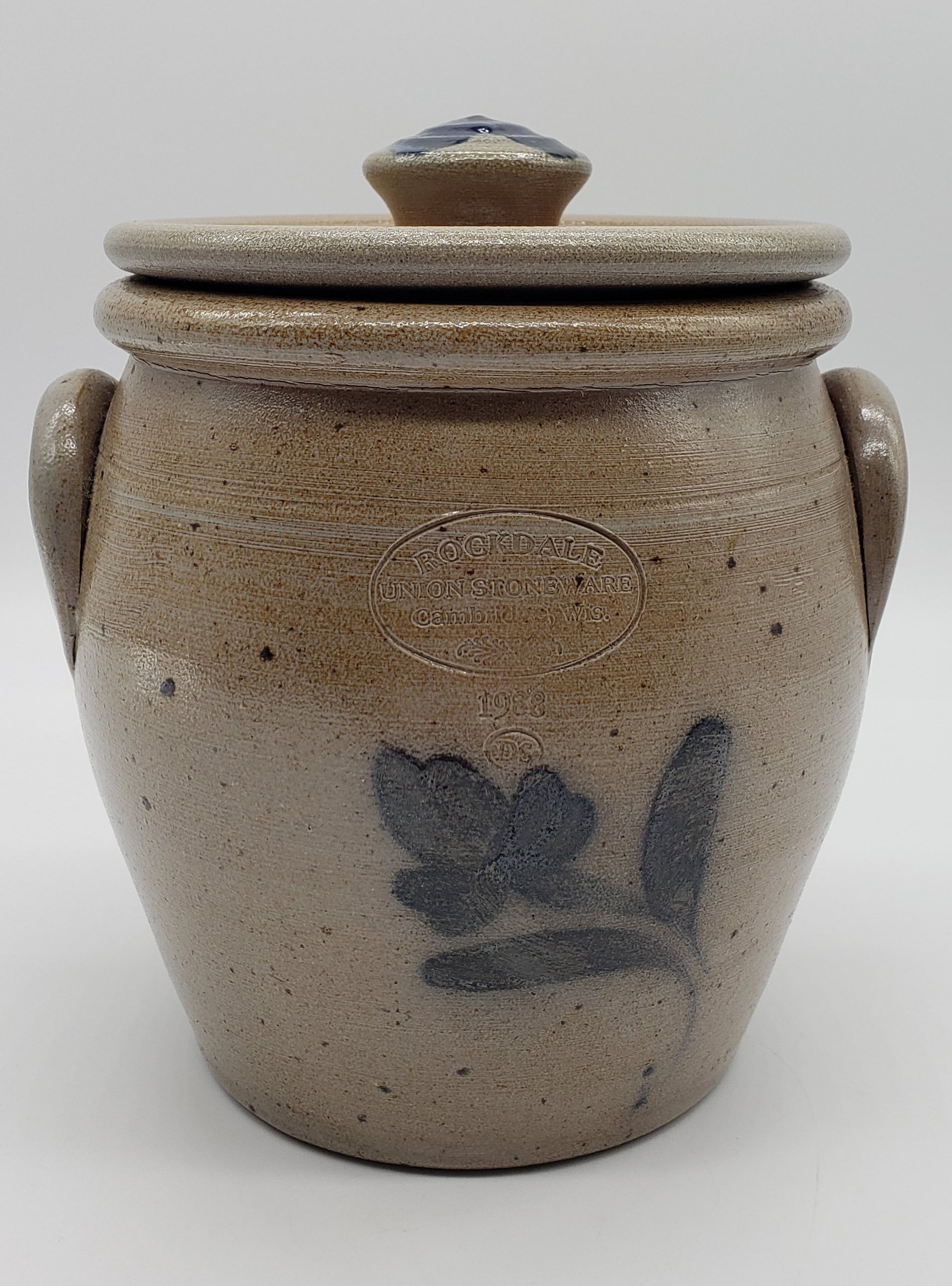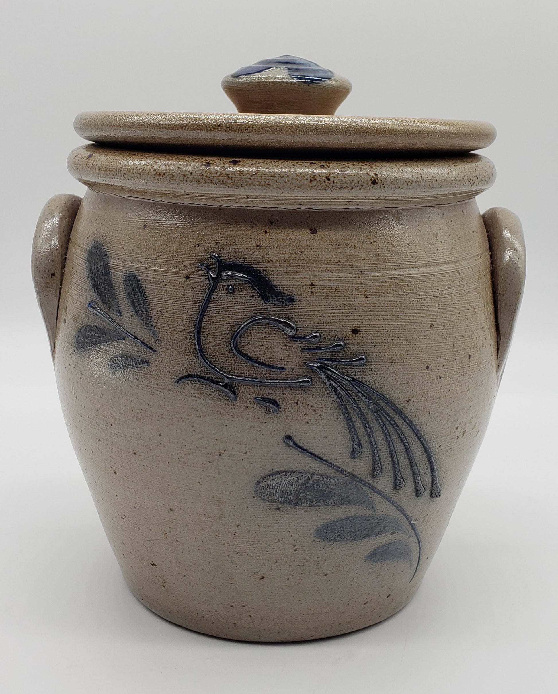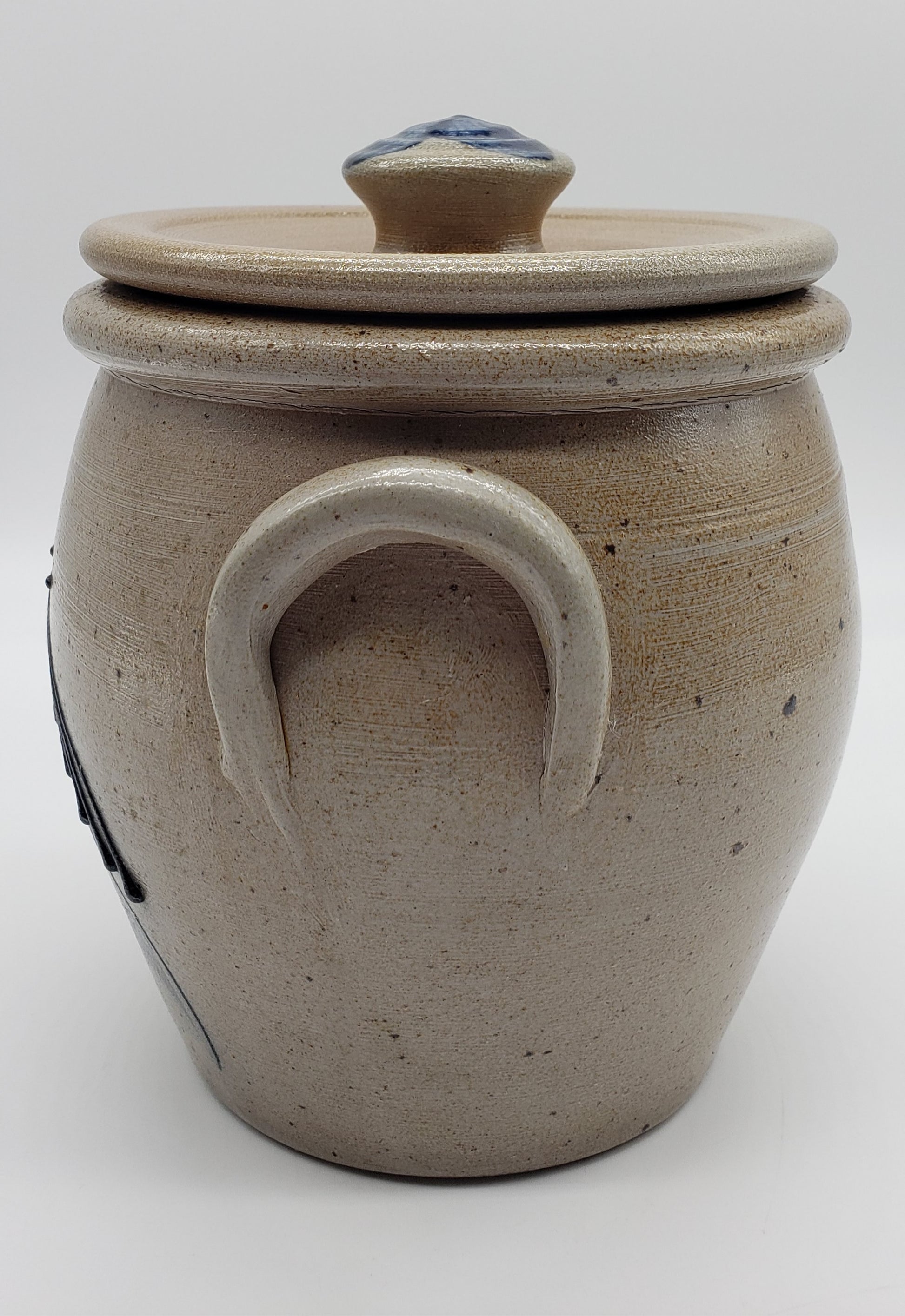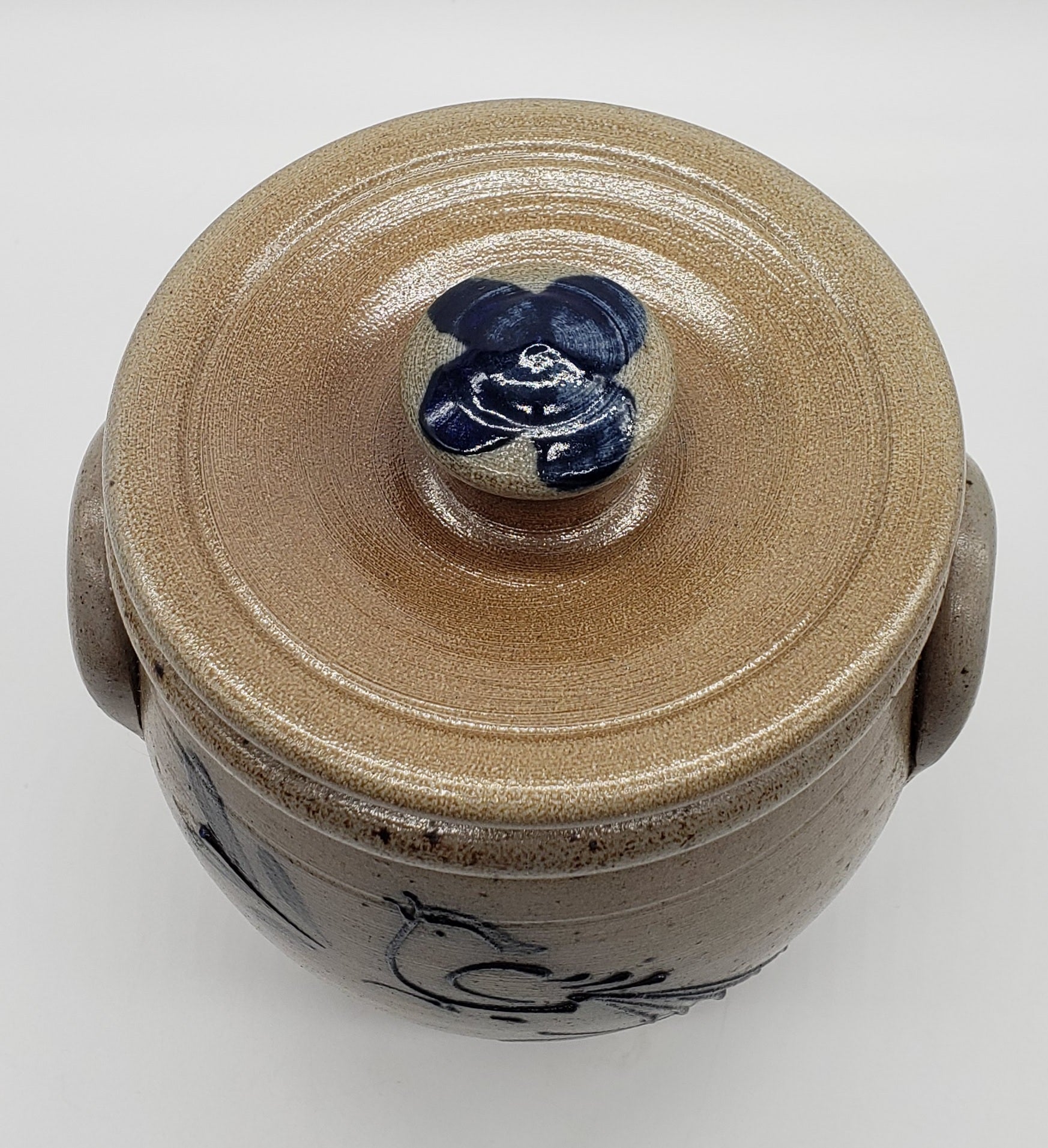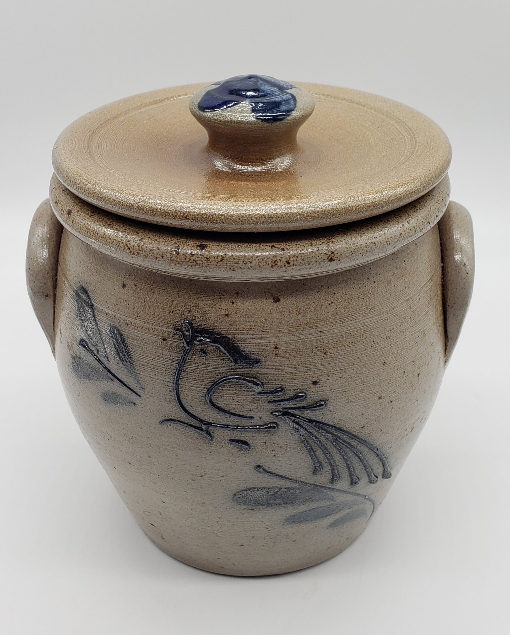 Rockdale Union Stoneware Lidded Crock Jar Salt Glaze Bird and Flower design with handles.