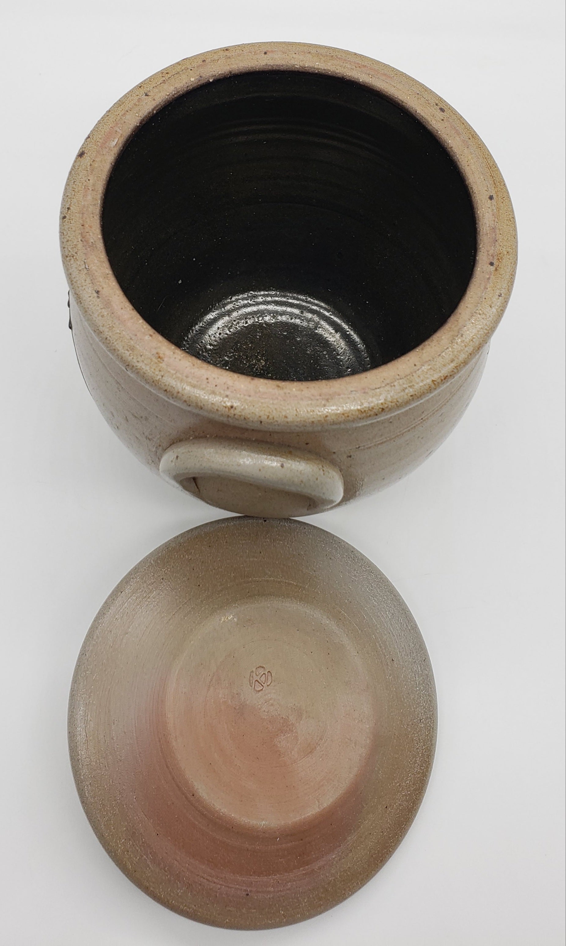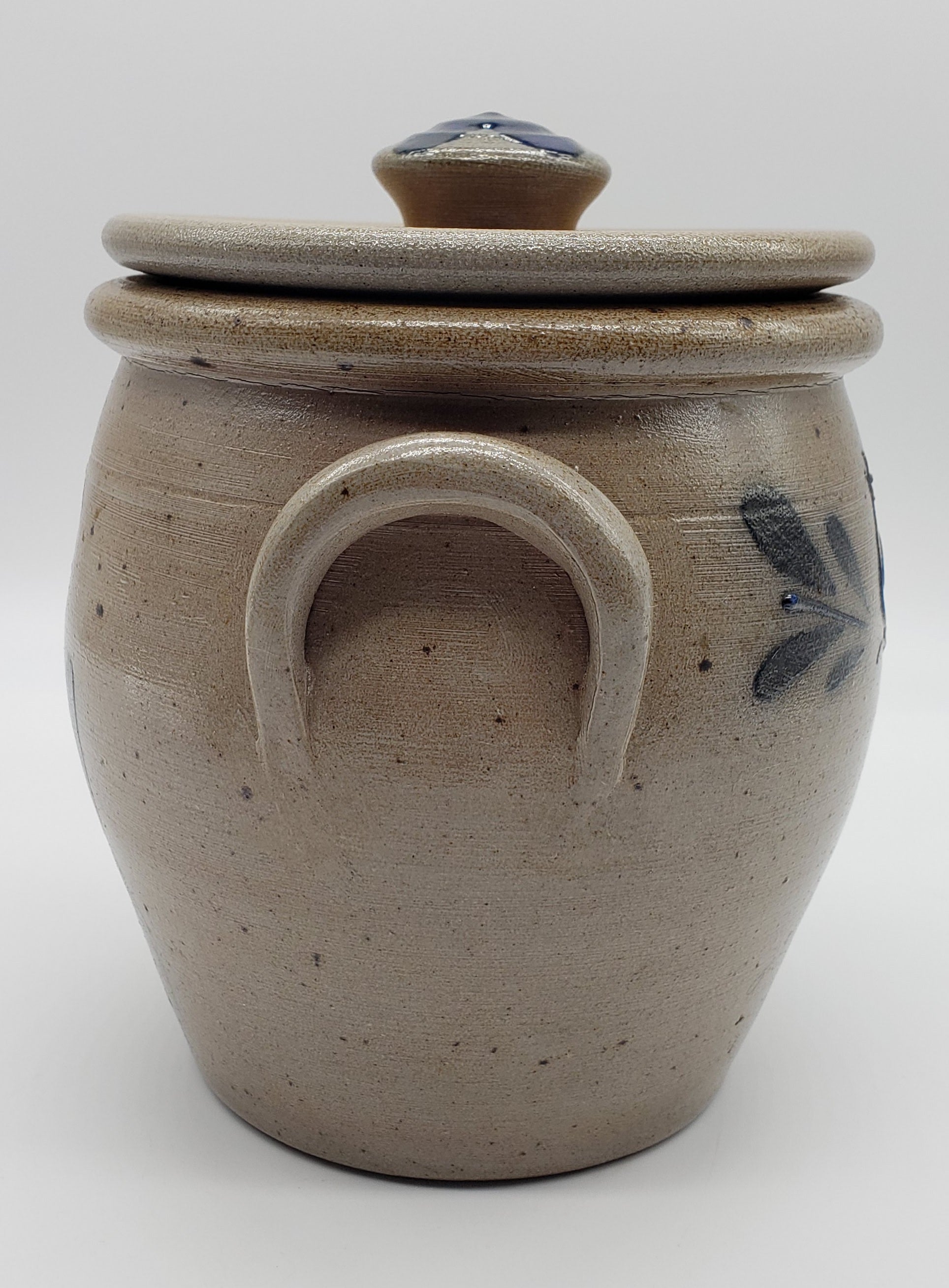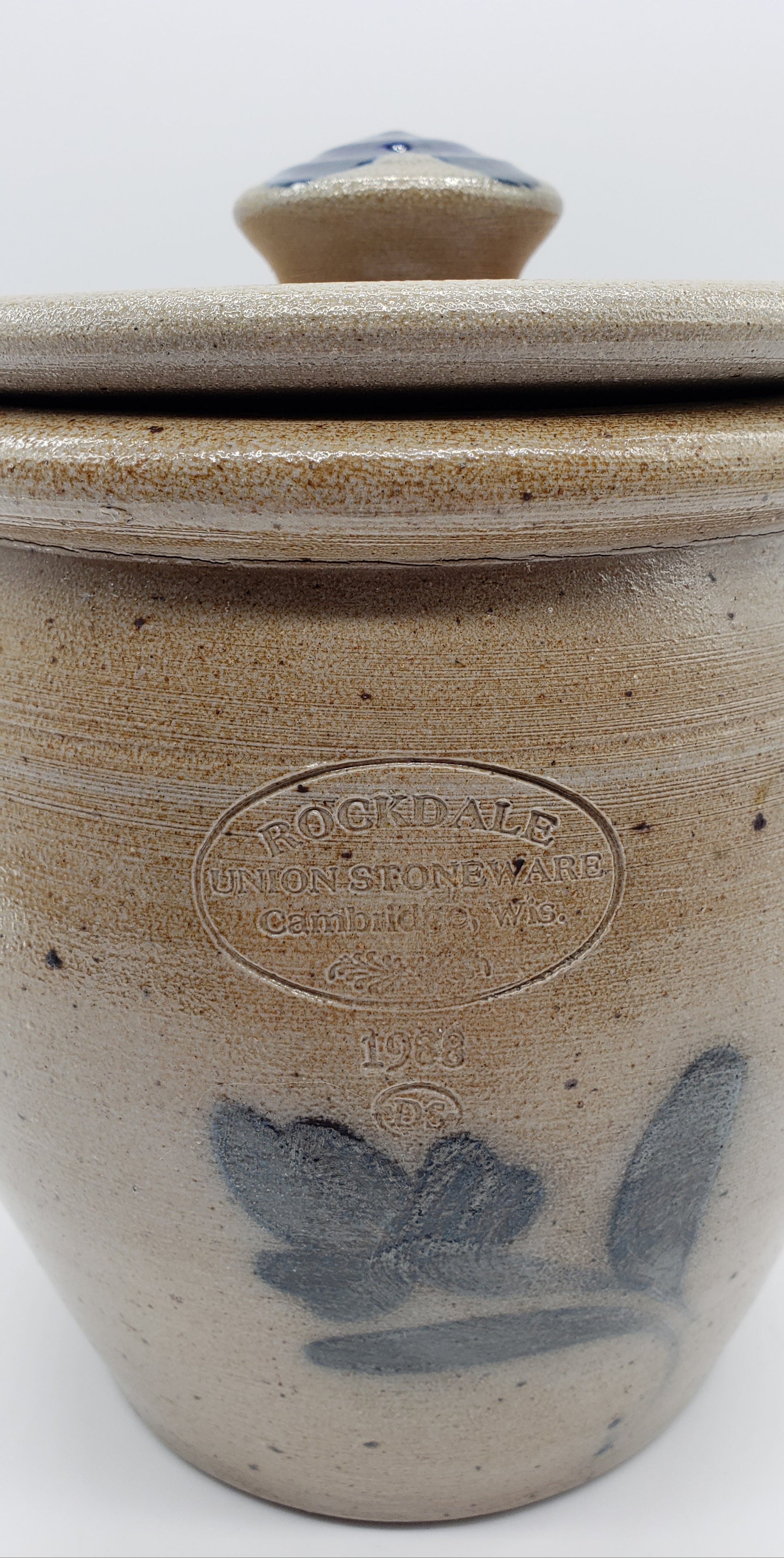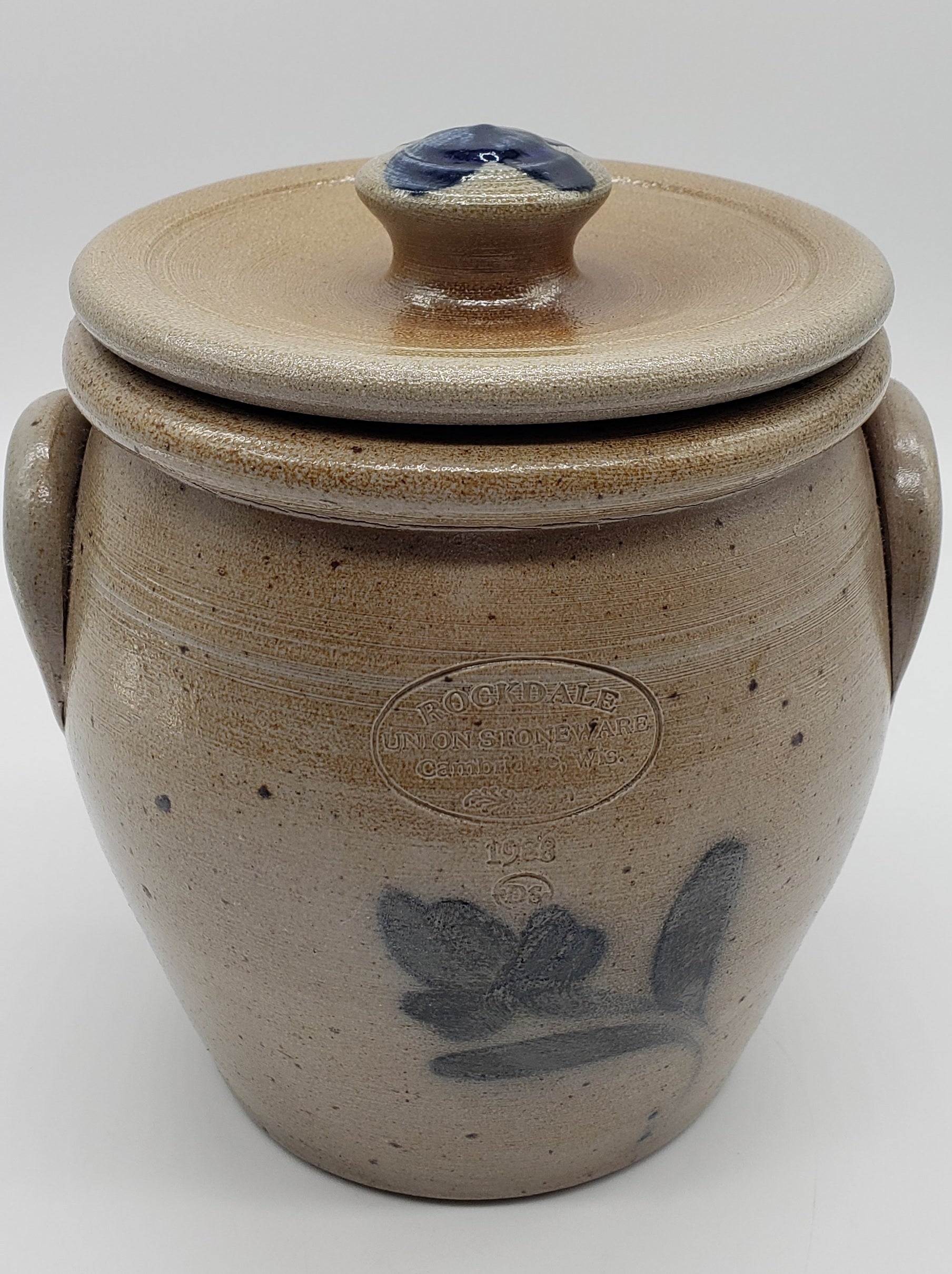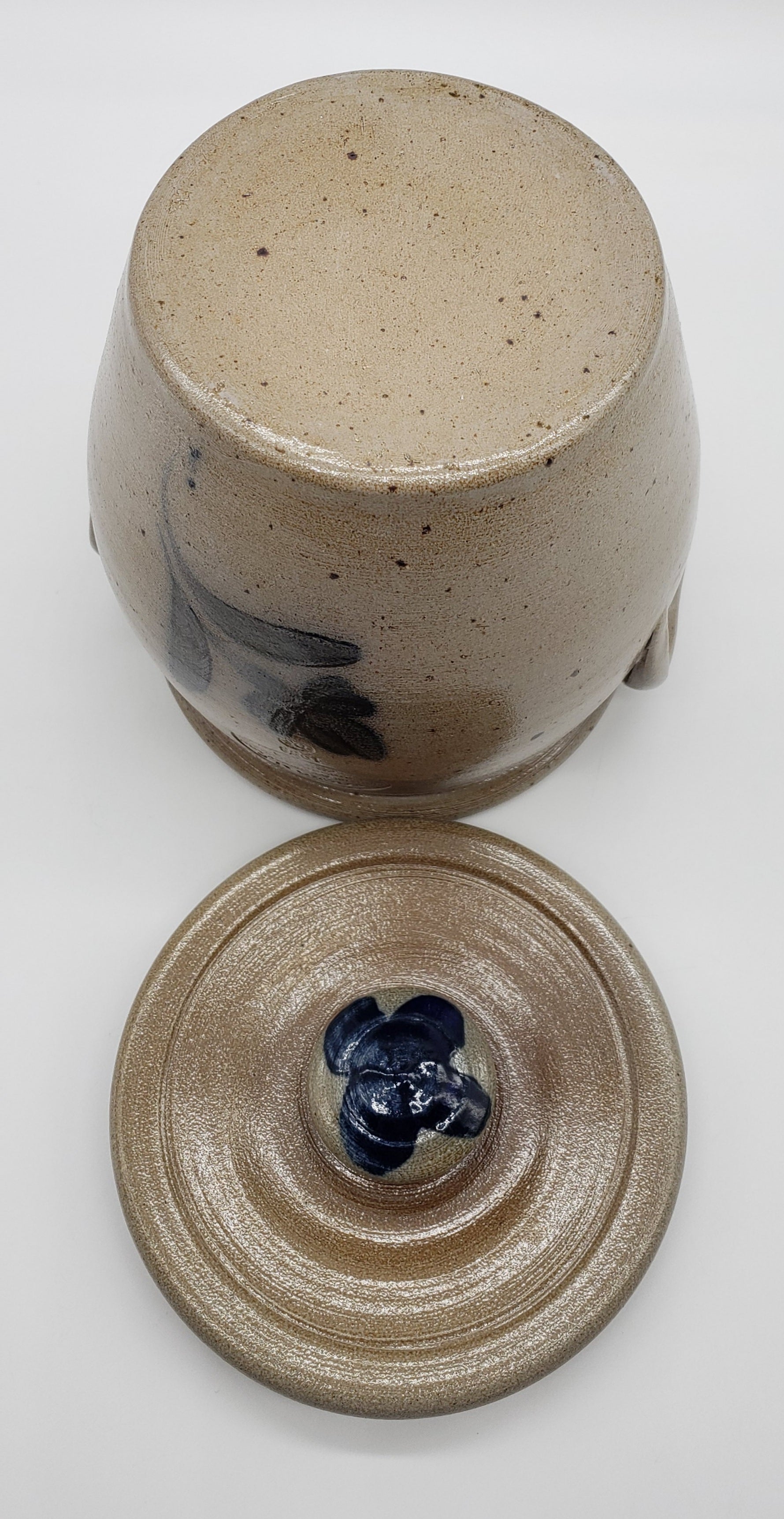 Rockdale Union Stoneware Lidded Crock Jar Salt Glaze Bird and Flower design with handles.