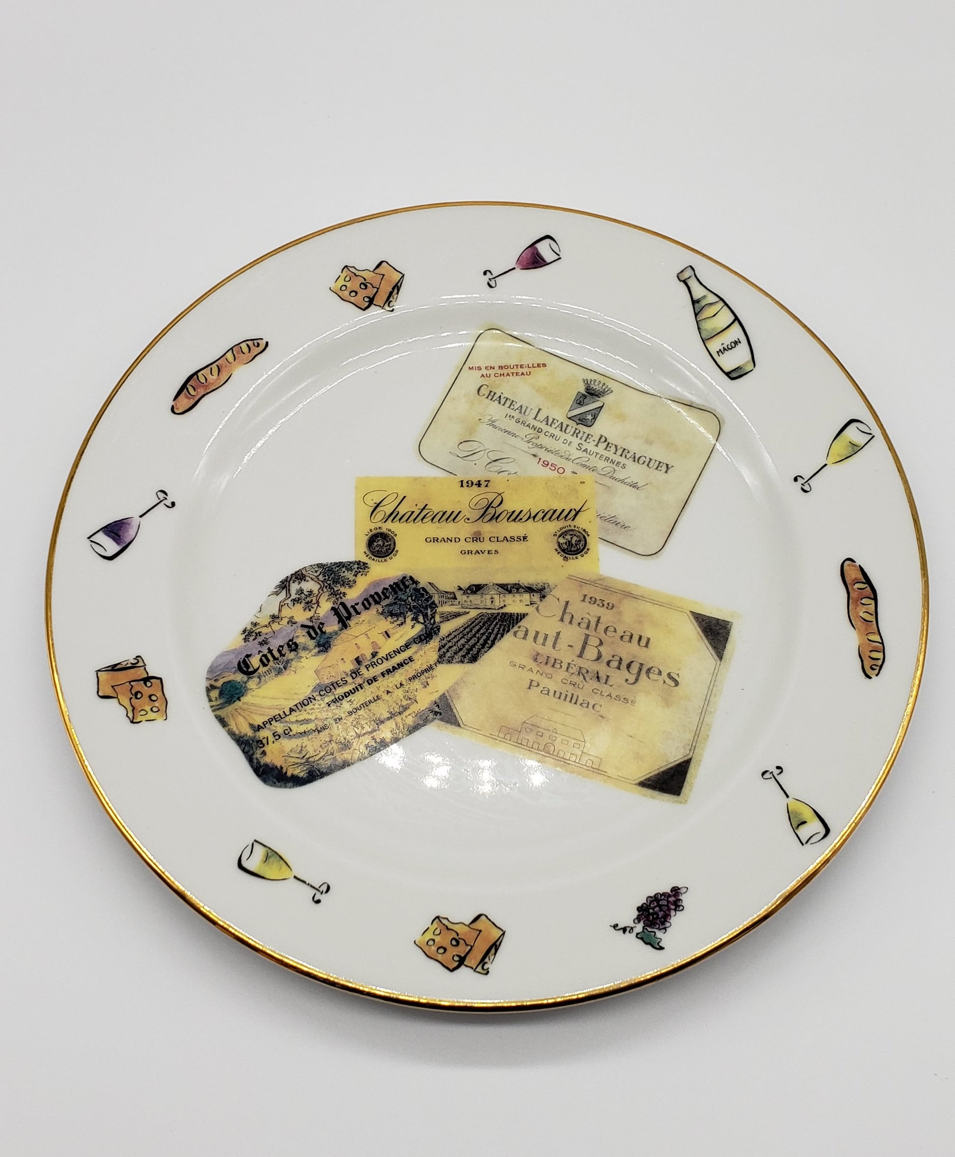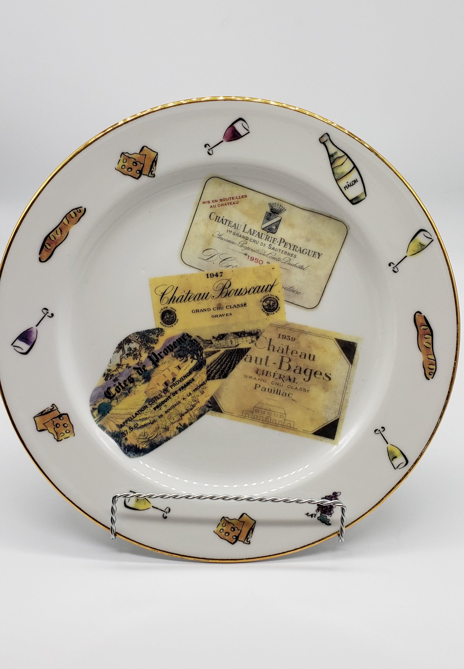 Rosanna Italy Porcelain Cheese Plate/Platter 11.5" Wine Label Cheese Bread Grape Gold