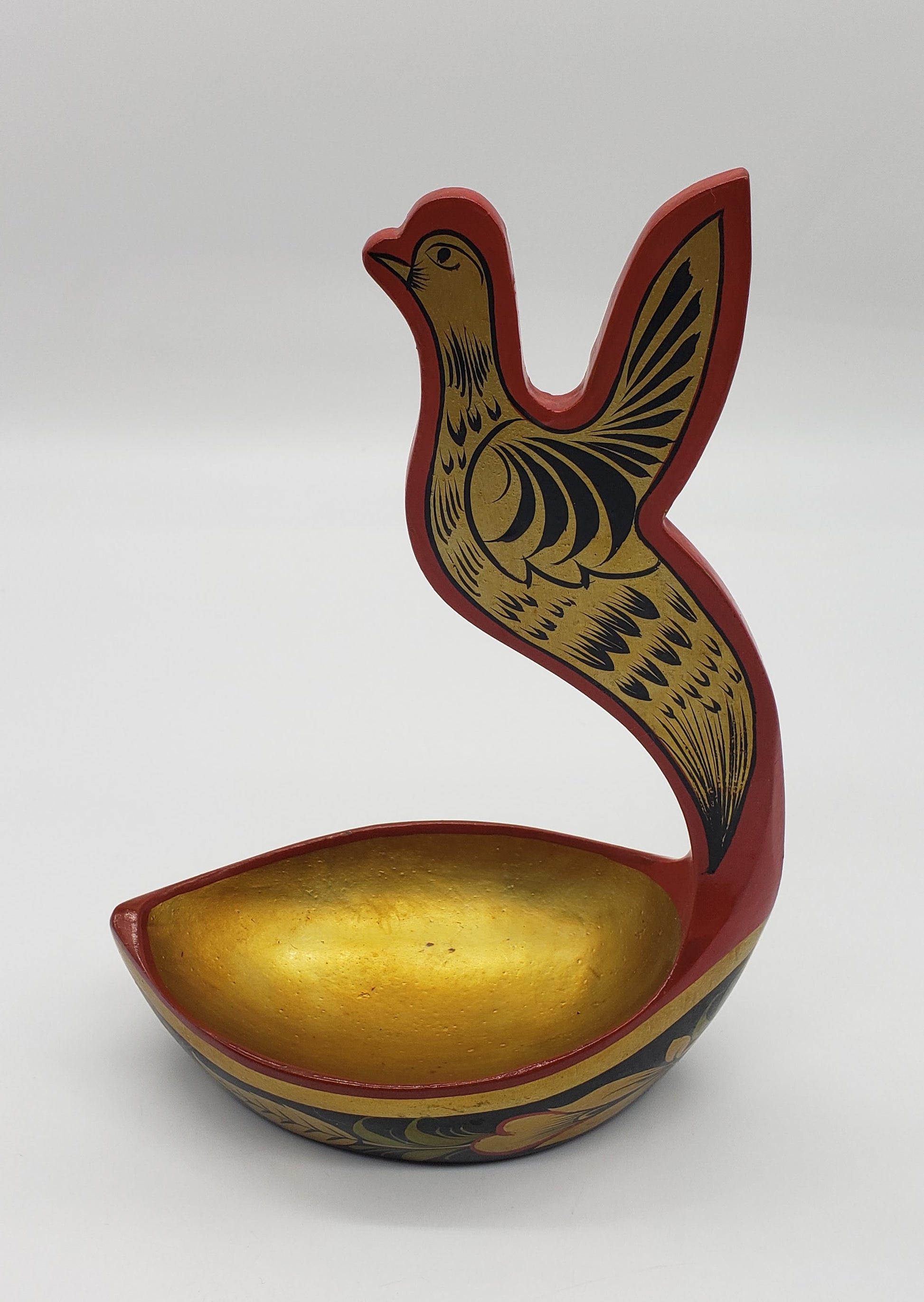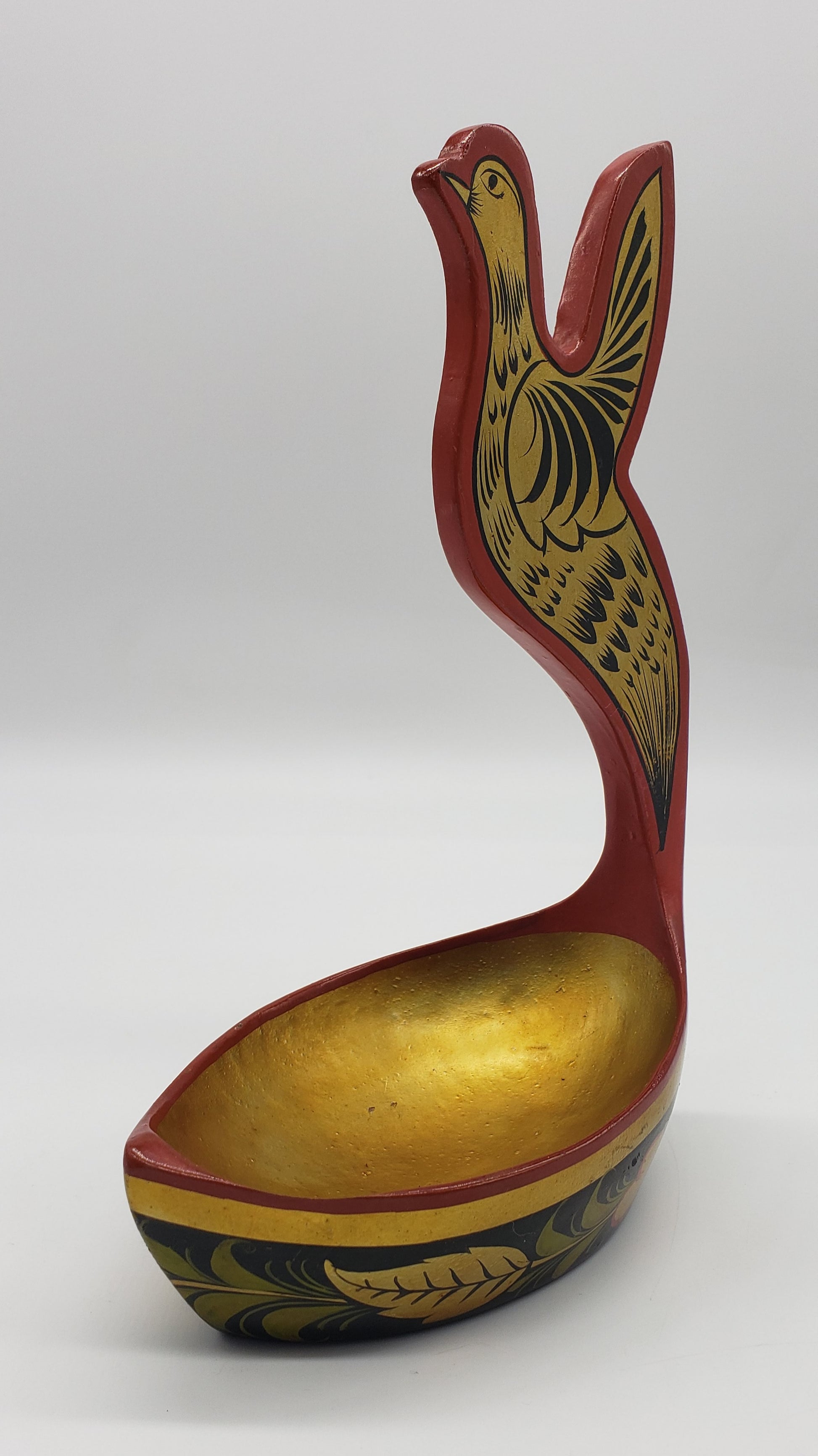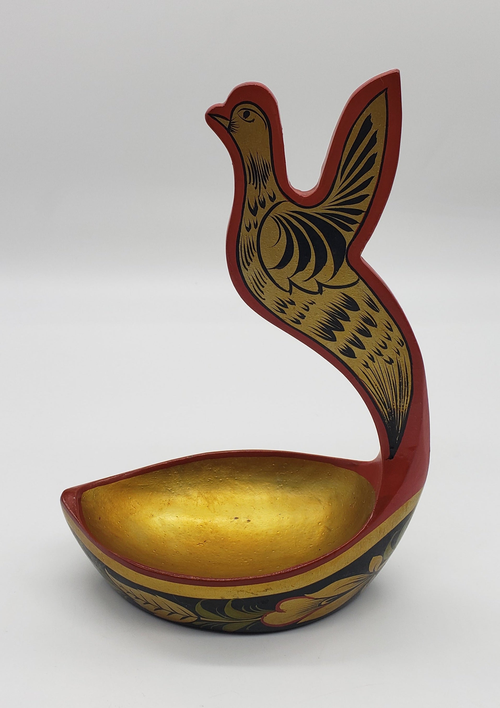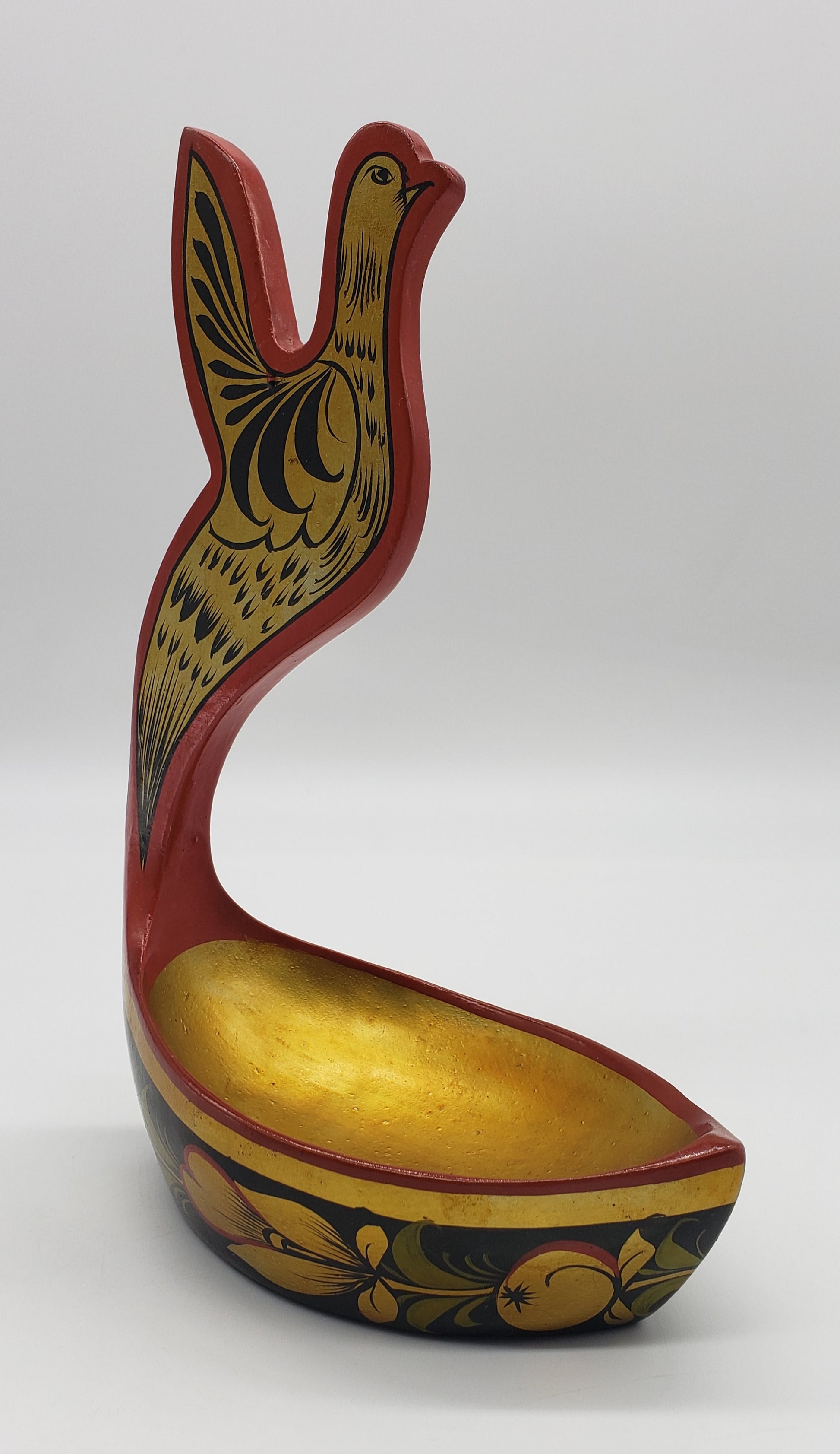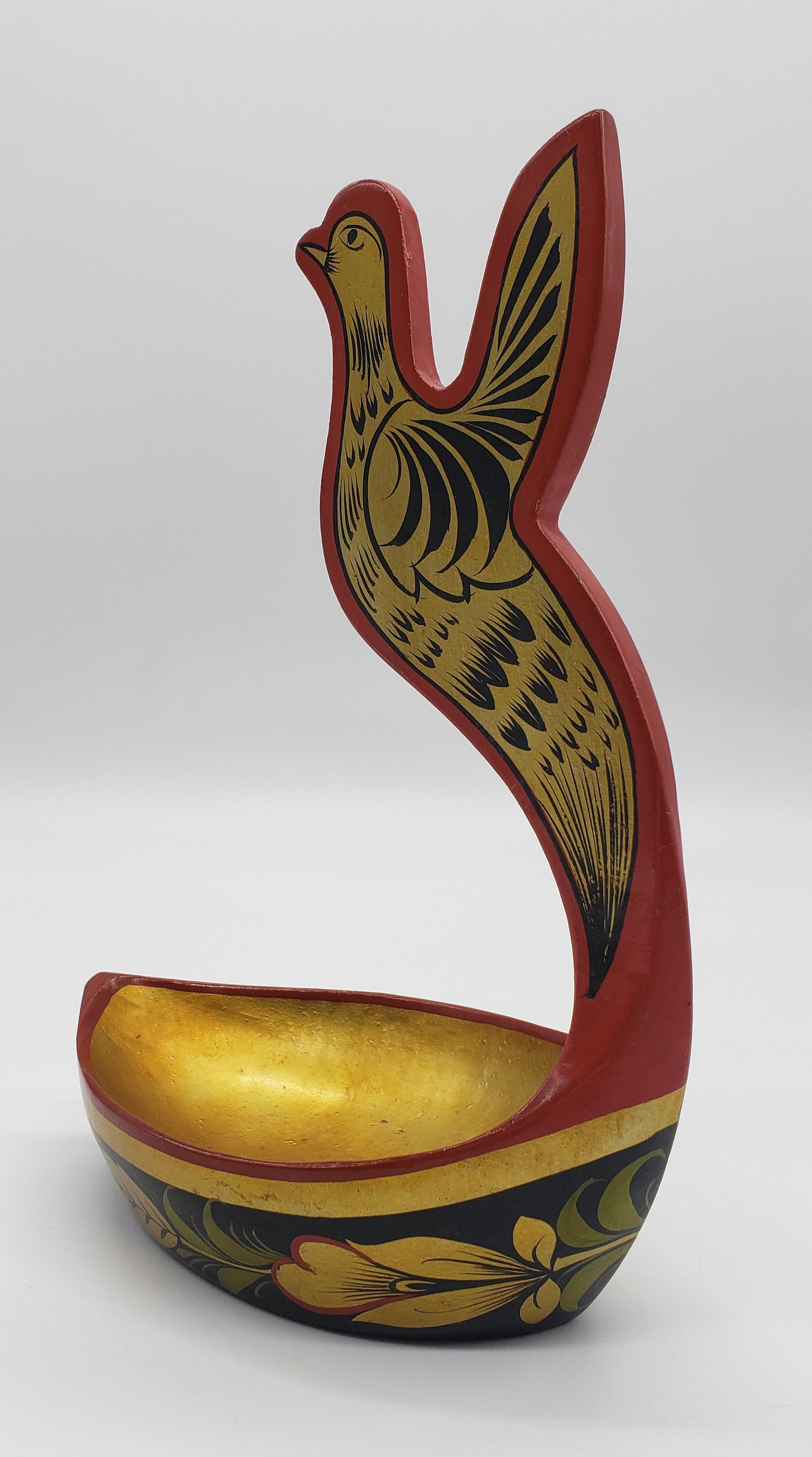 Soviet/Russian Lacquered Kvosh in the Form of a Griffen Like Bird Gold on Red