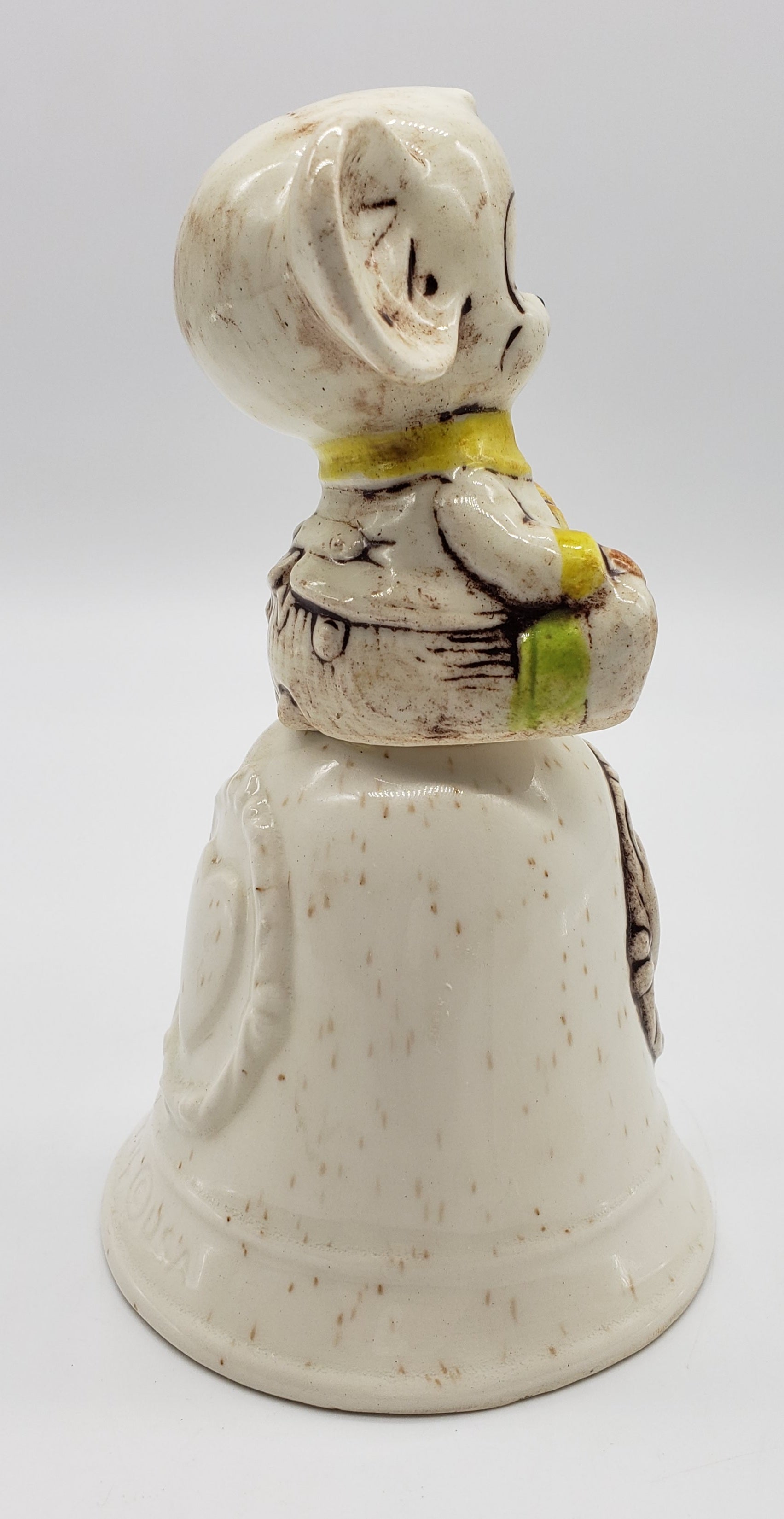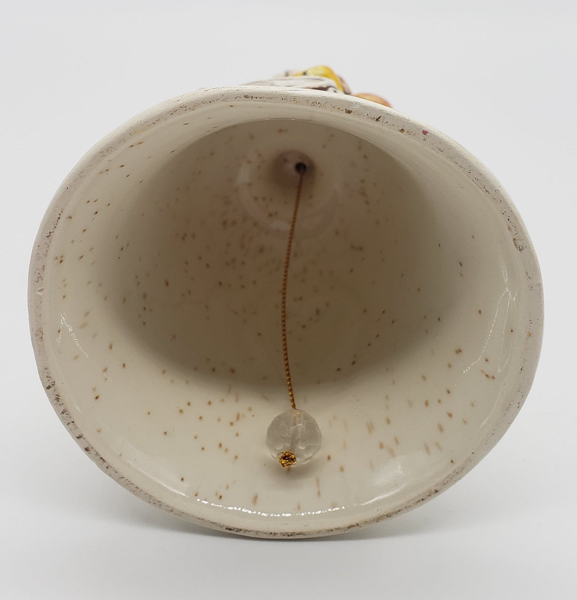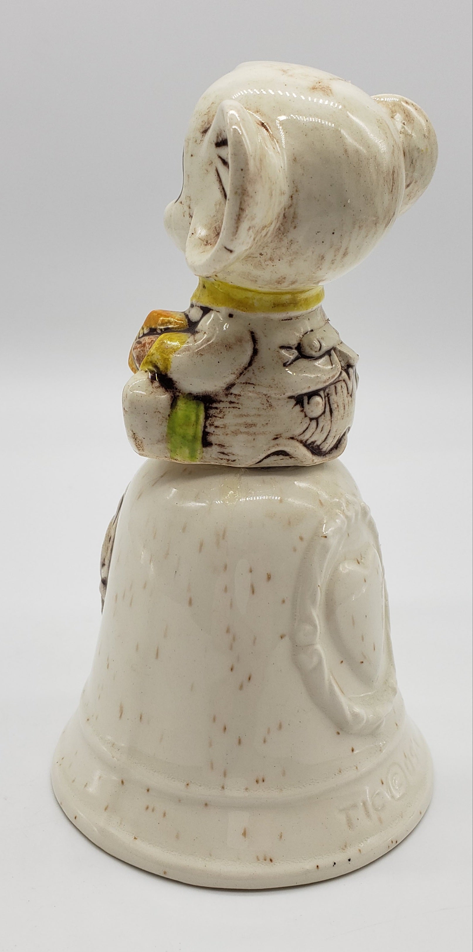 On top, this adorable bell has a mouse holding a wedge of cheese. The bell has a raised area with "TAKE ME I'M YOURS" and the back of the bell has a heart. This bell has an off white background with green and yellow used in the mouses outfit. The mouse has a light yellow collar.