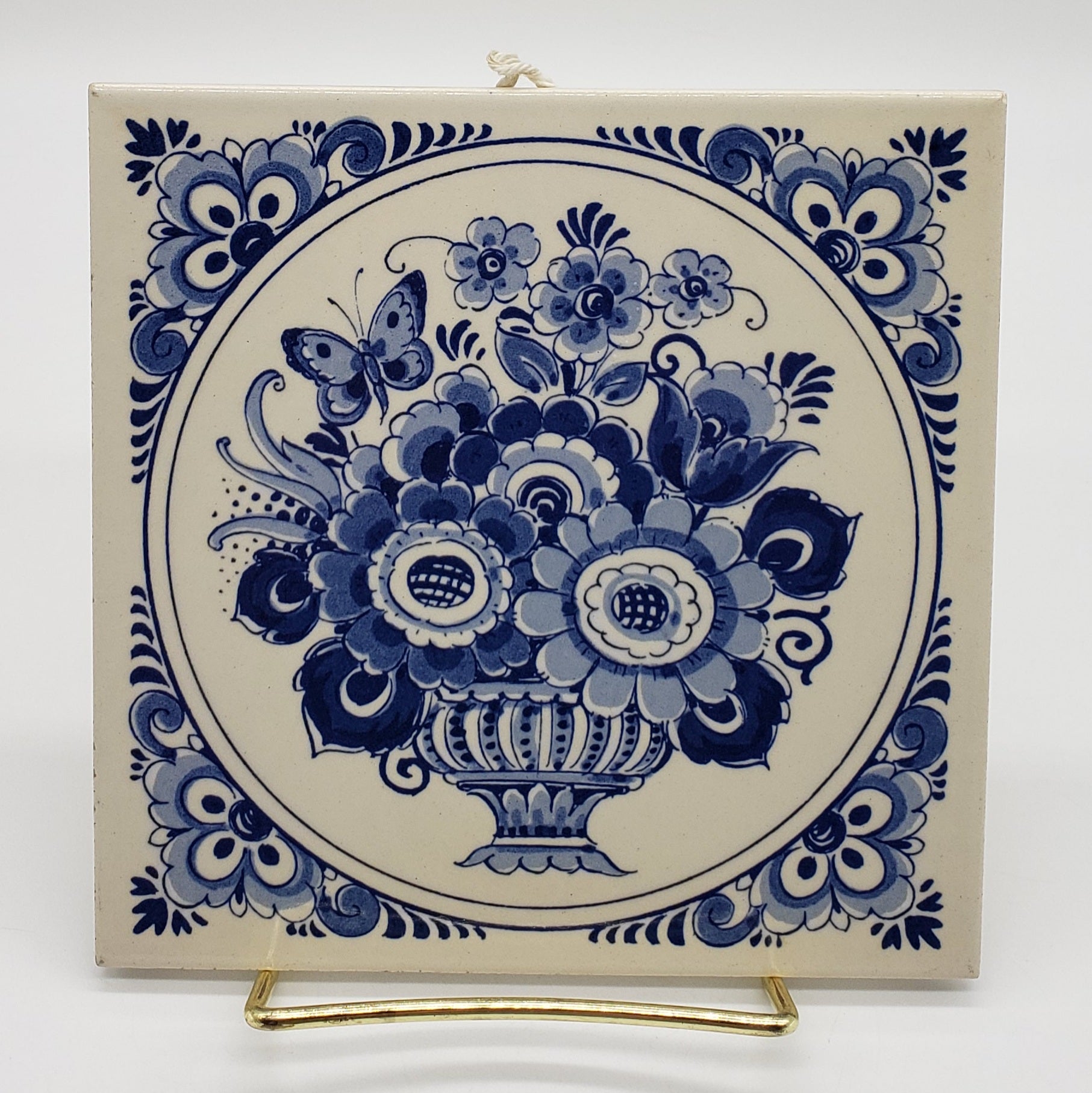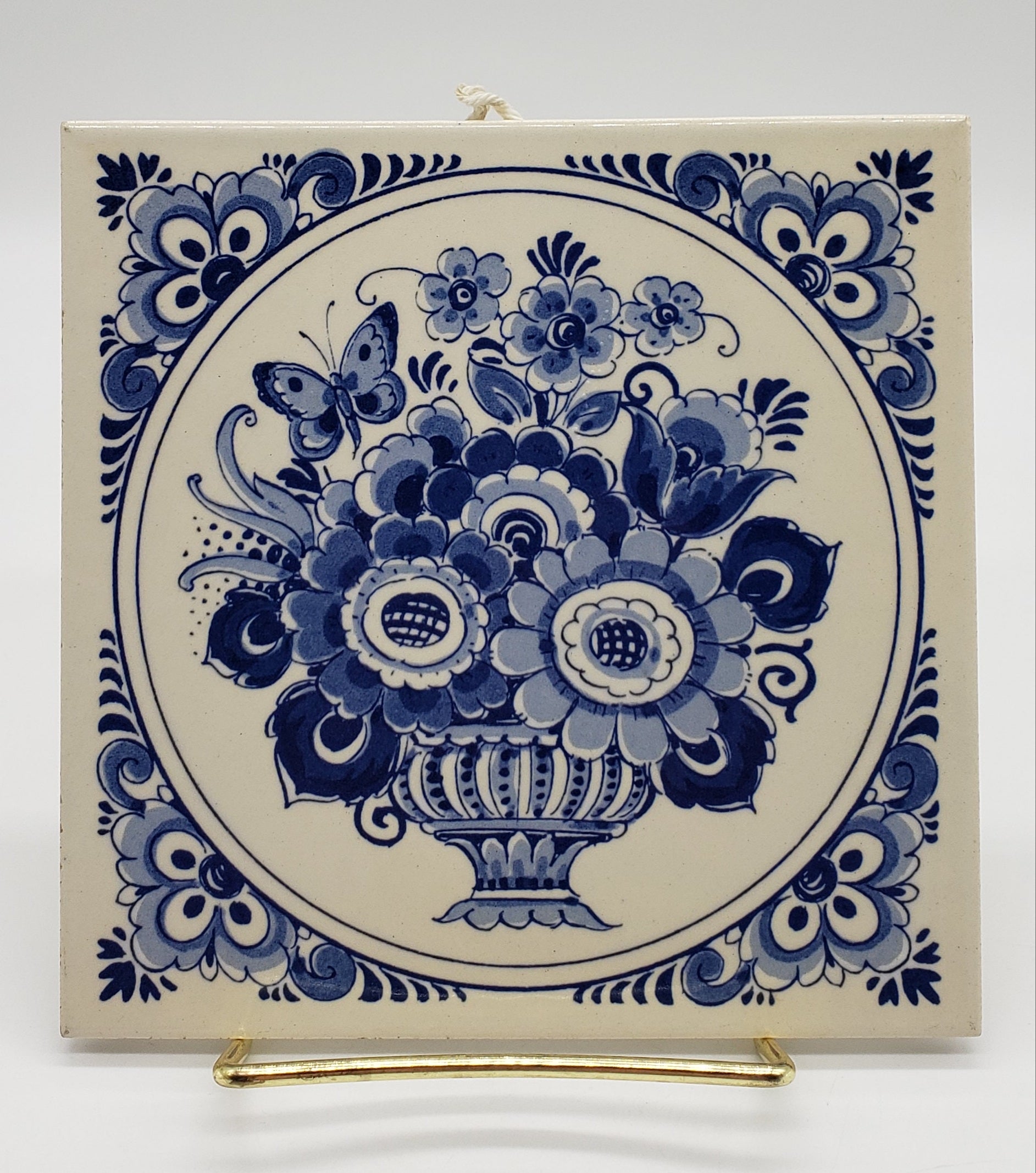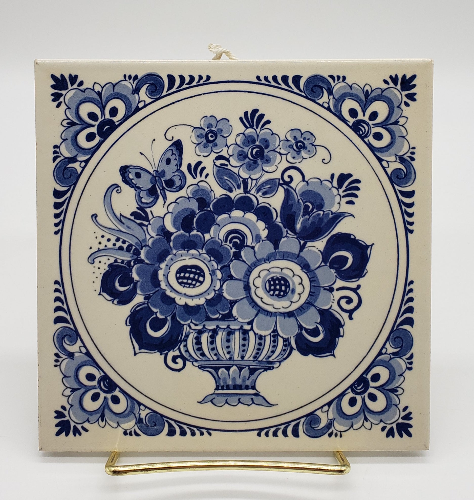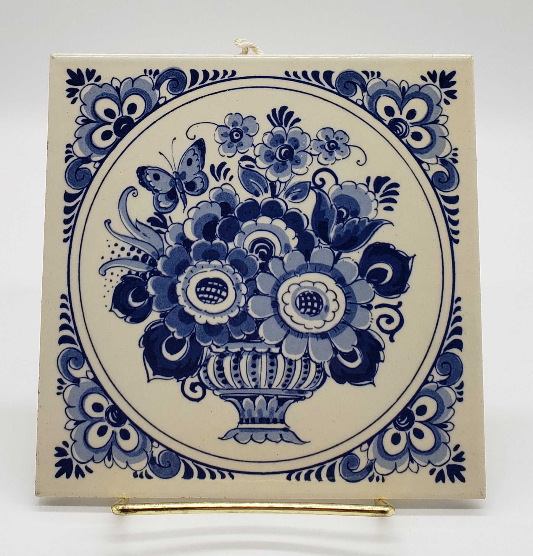 Vintage Delft Schoonhoven Keramiek Holland Blue and White Tile - Vase with Flowers