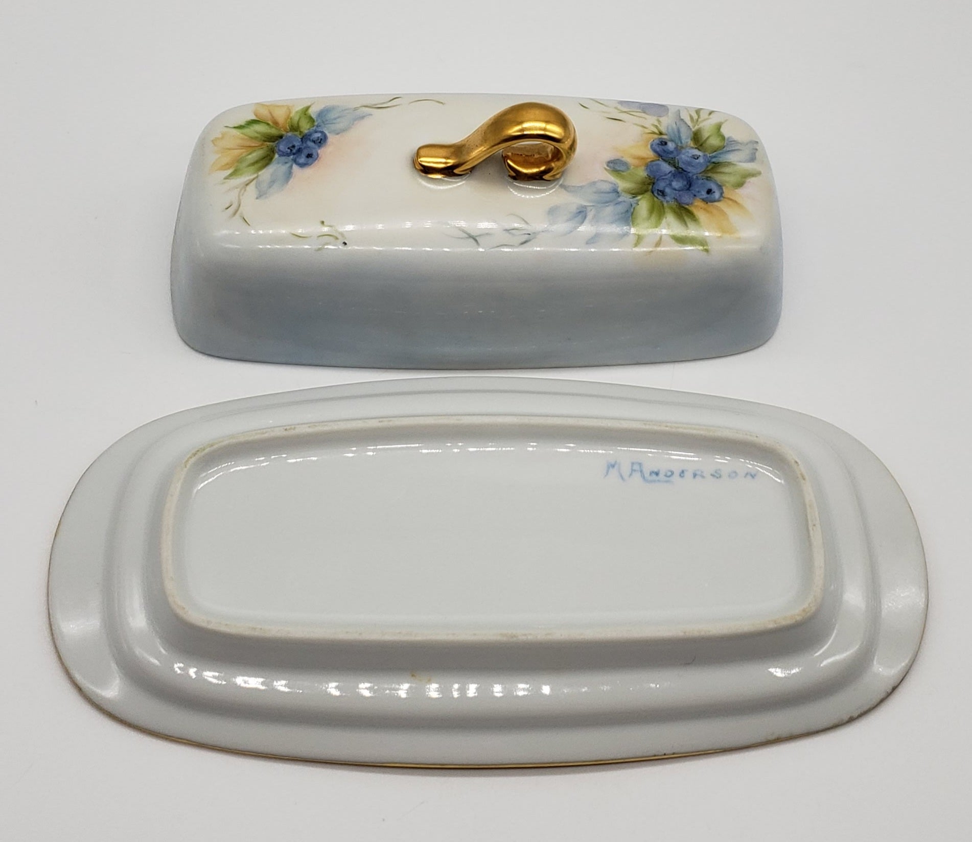 Vintage Hand Painted Blueberry Porcelain Butter Dish Artist Signed M Anderson