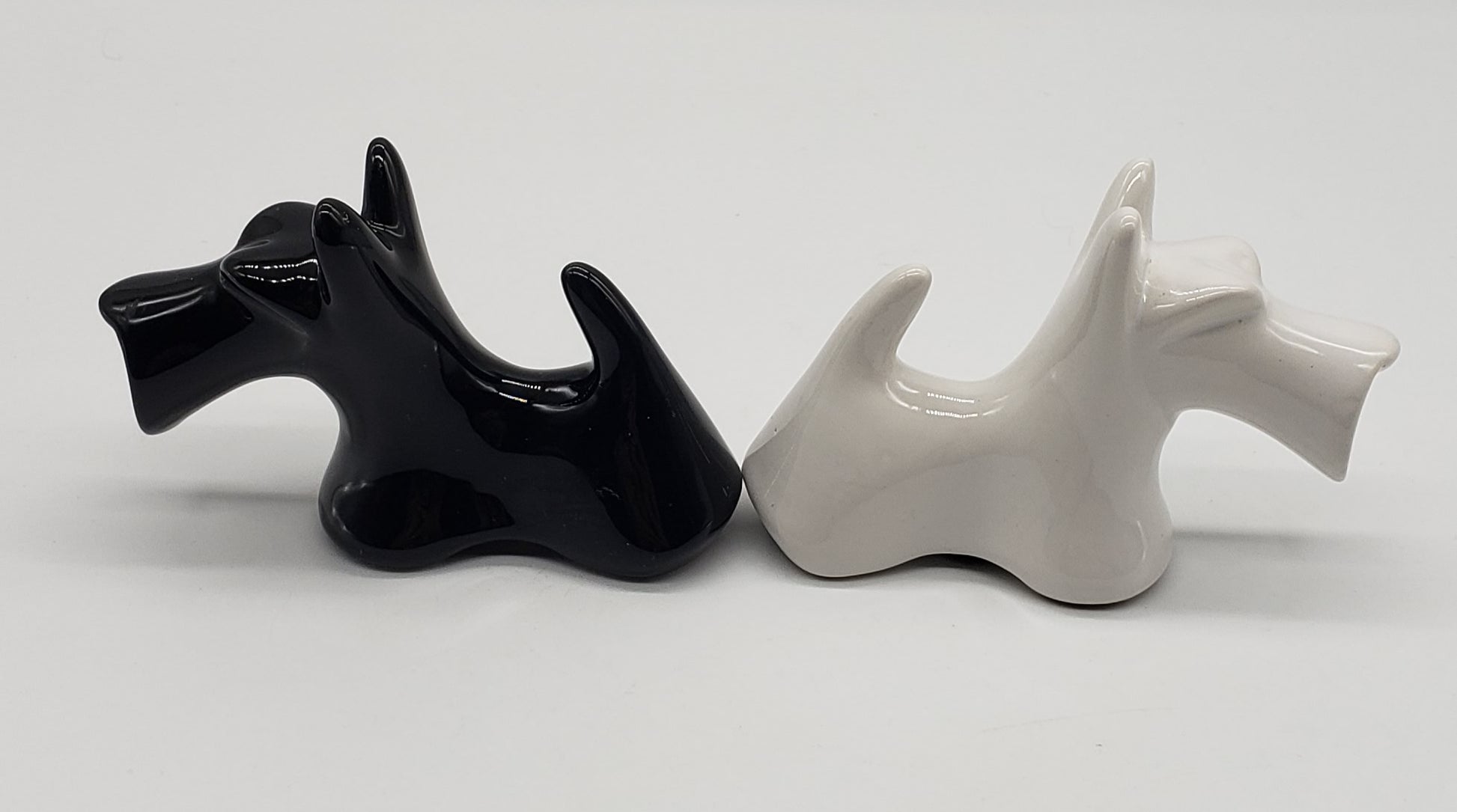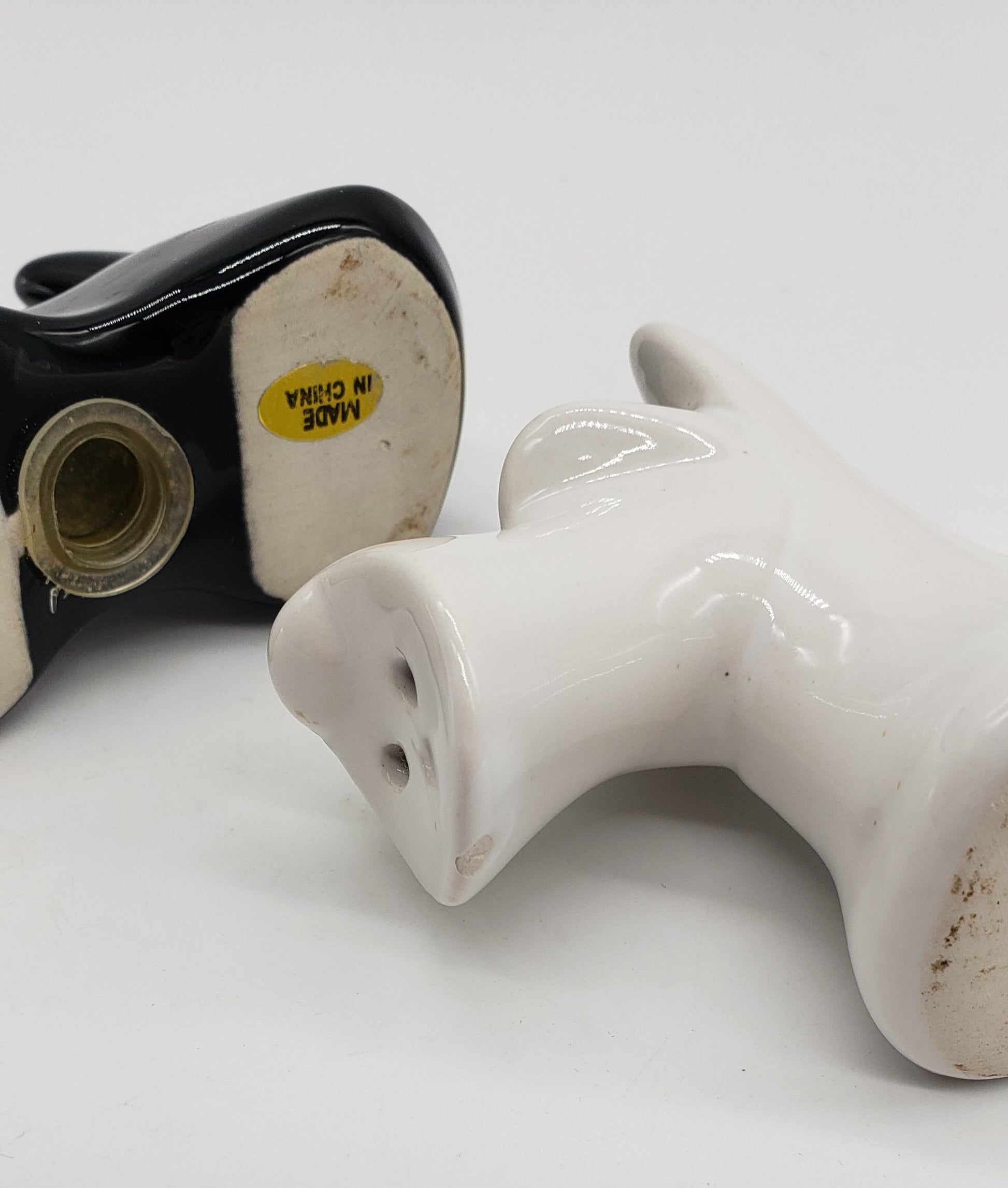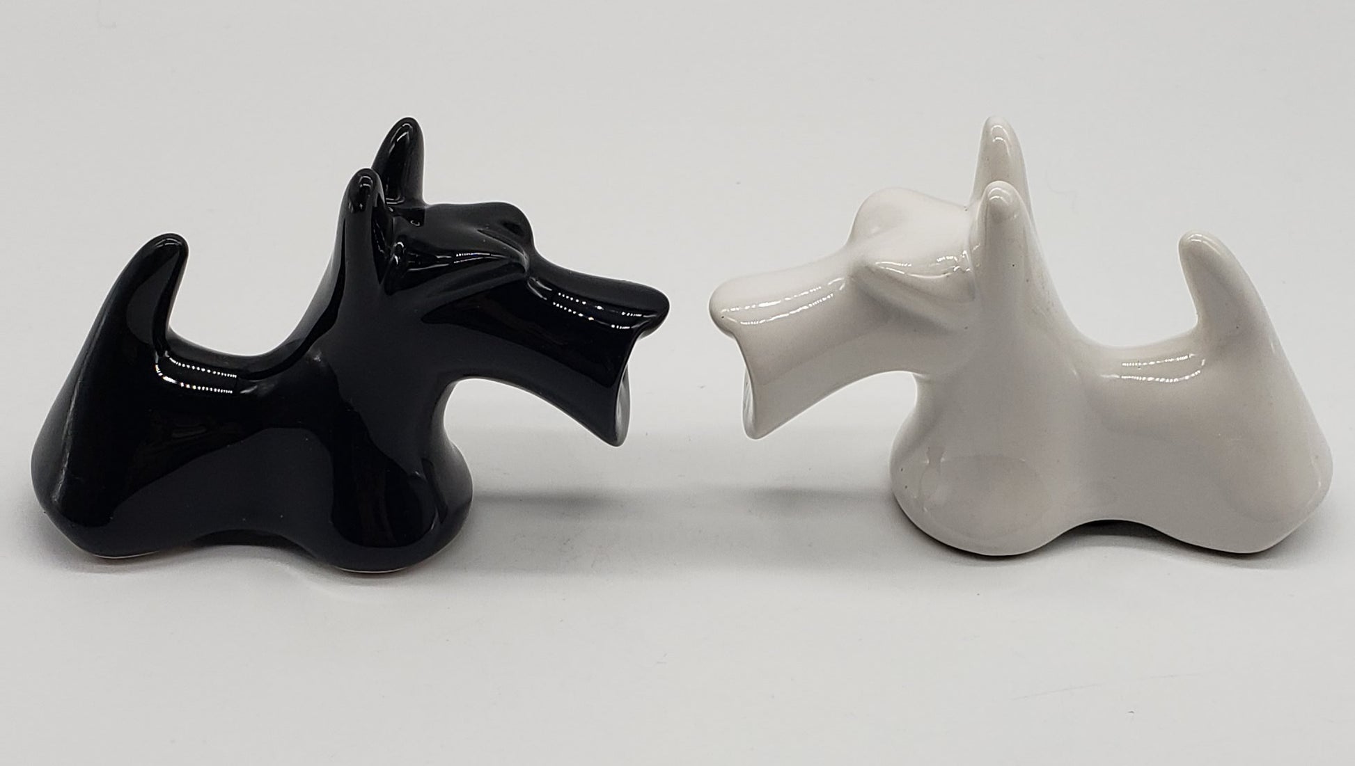 Scotty Dog Salt & Pepper Set -Scottish Terrier Black & White Ceramic Dog Shakers. White dog has small chip under snout