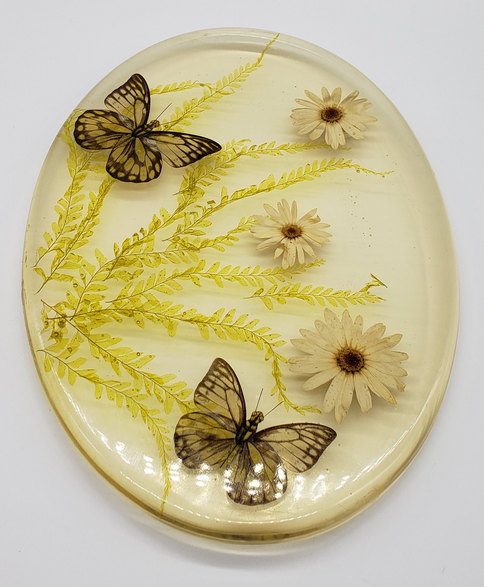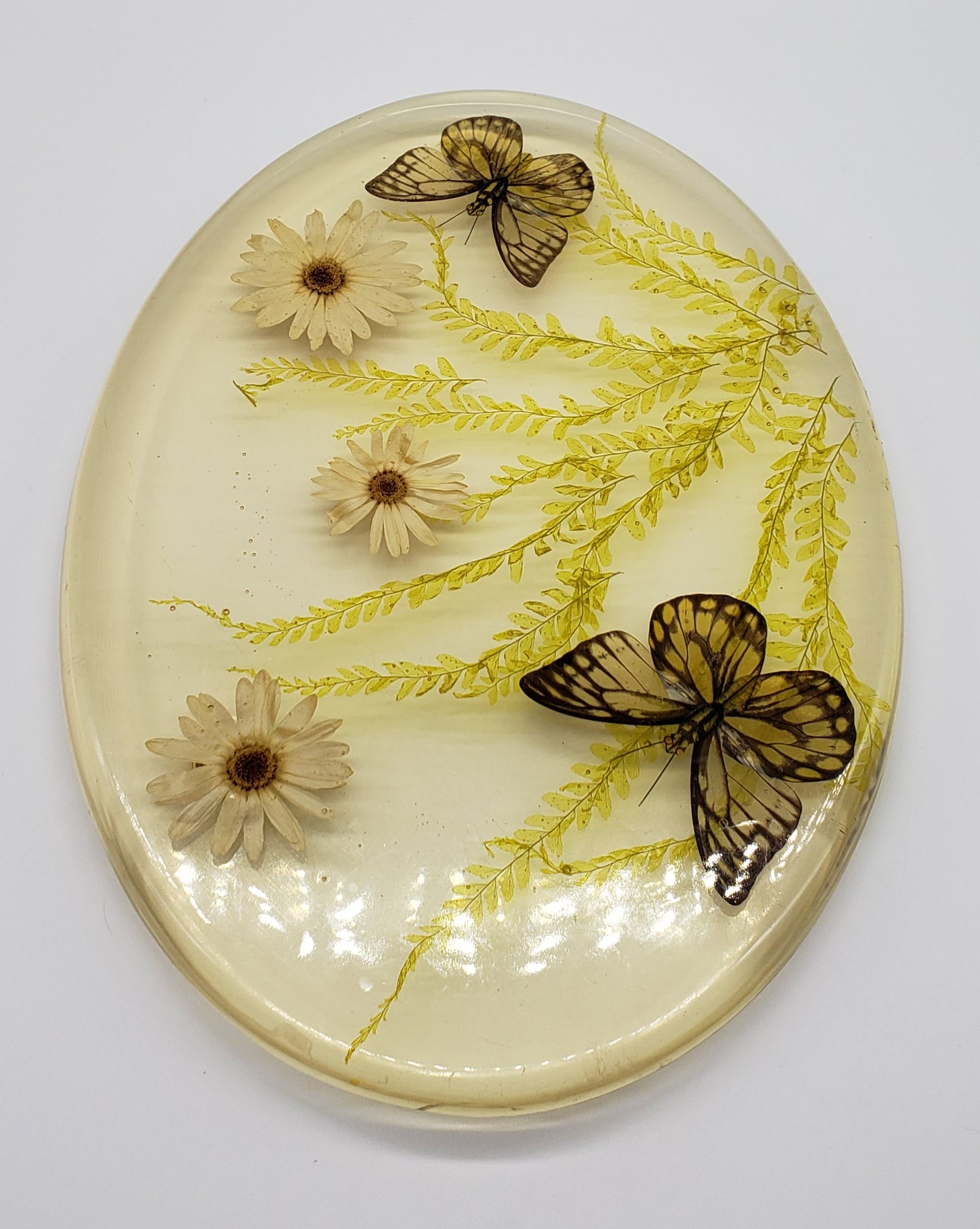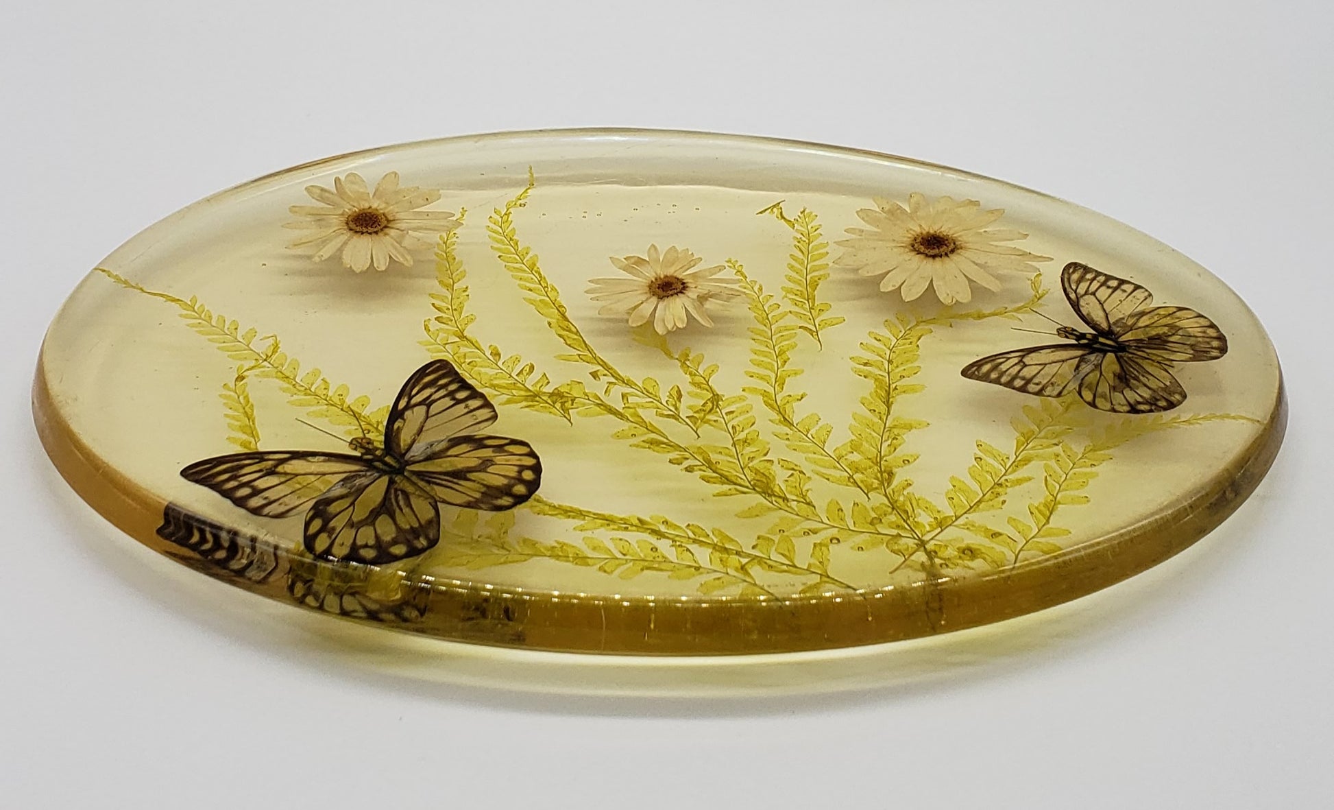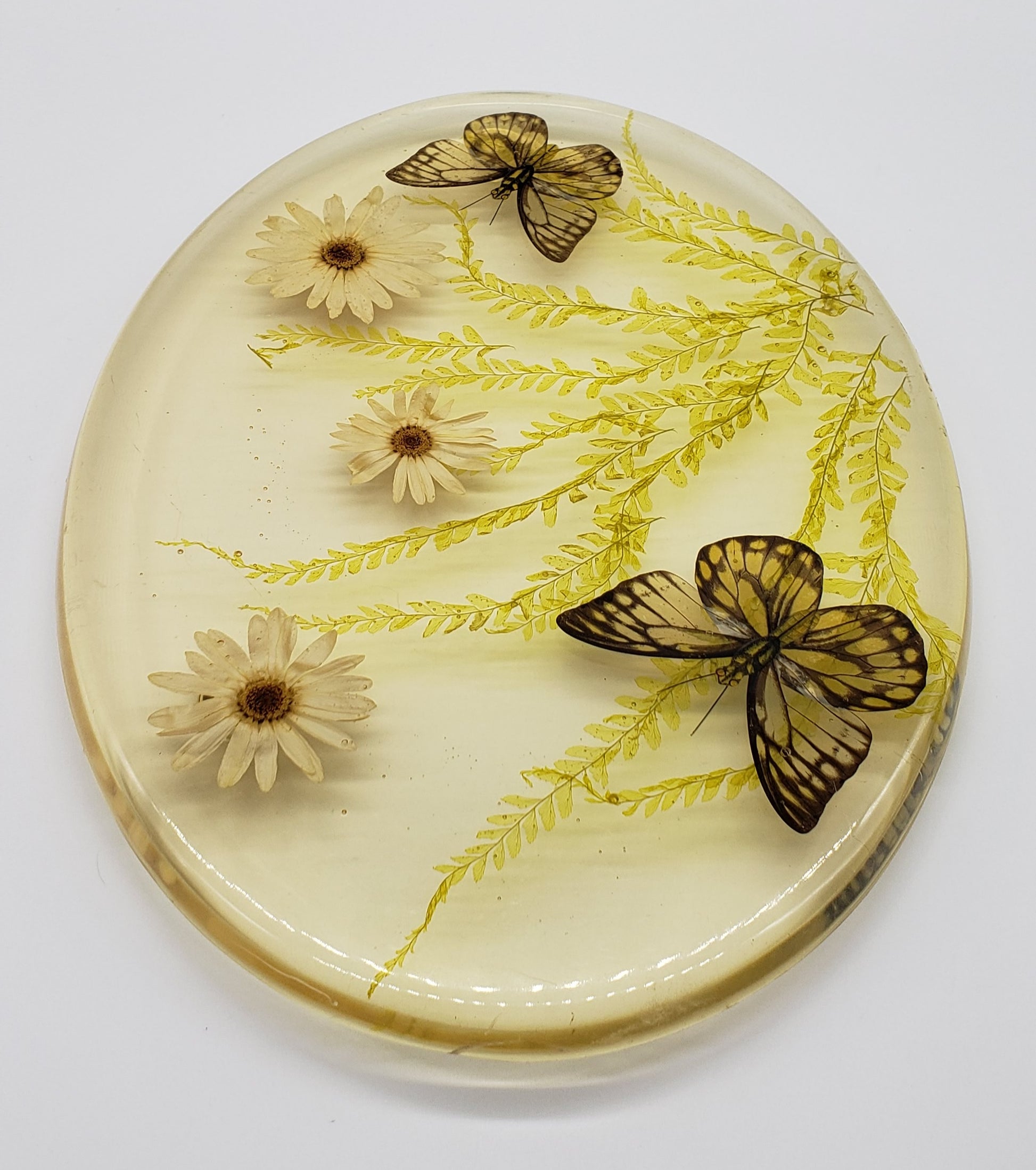 Acrylic Resin Trivet Footed Pressed Flowers With Butterfly Oval