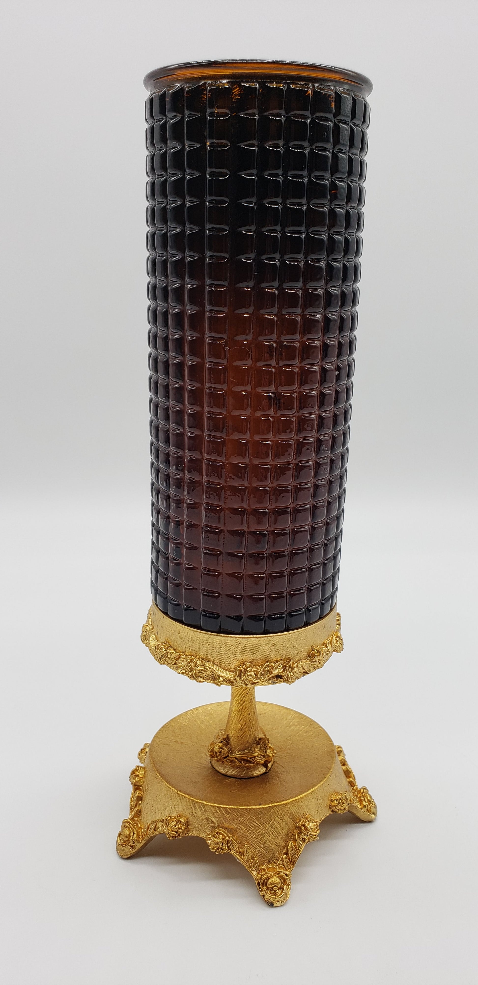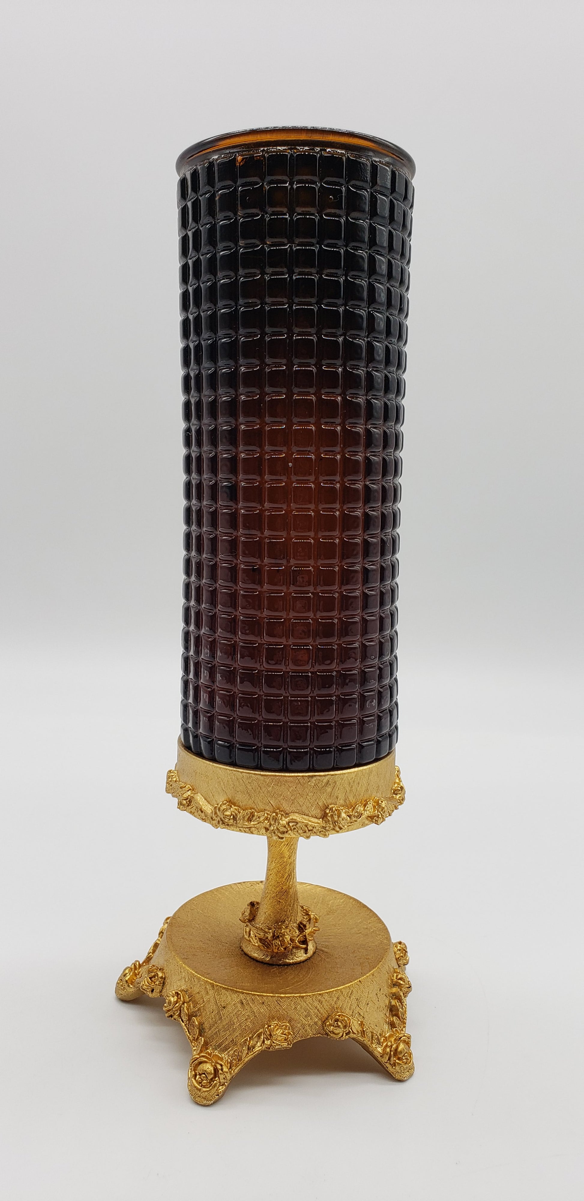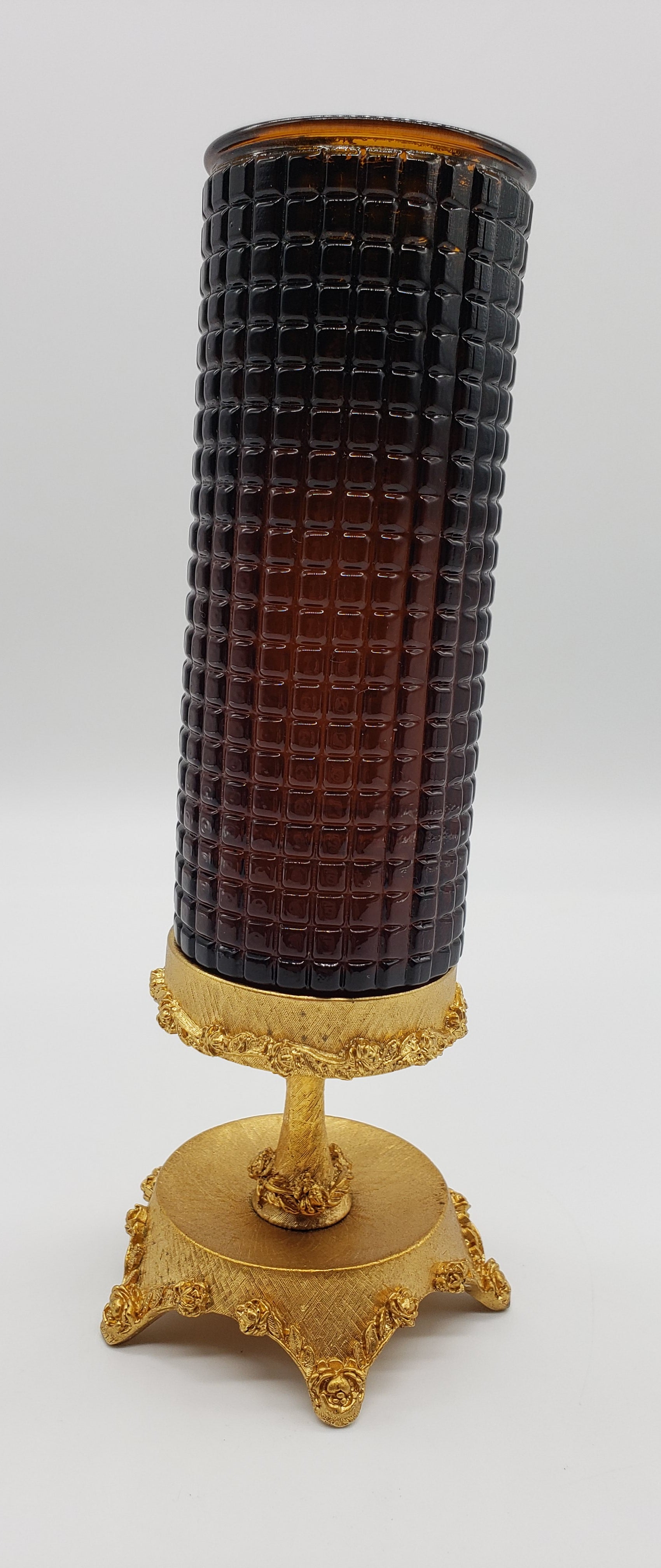 Amber Pressed Glass Candle Holder On Gold Metal Base