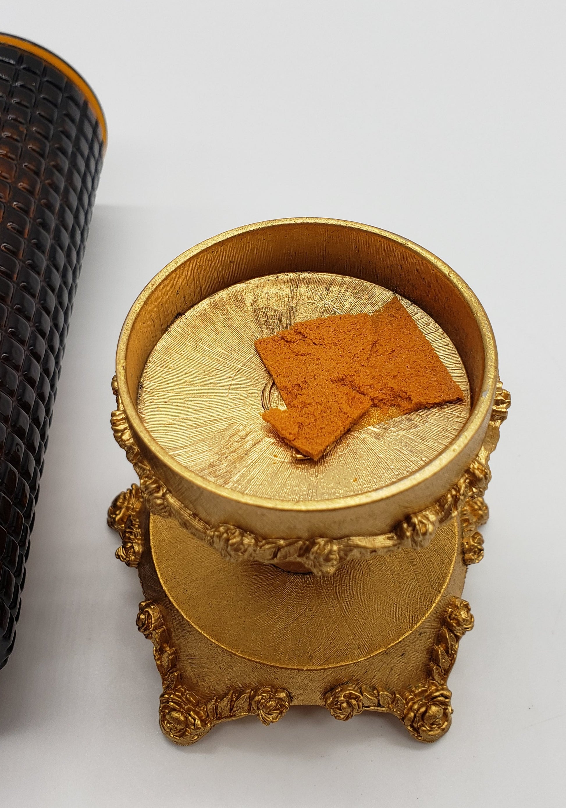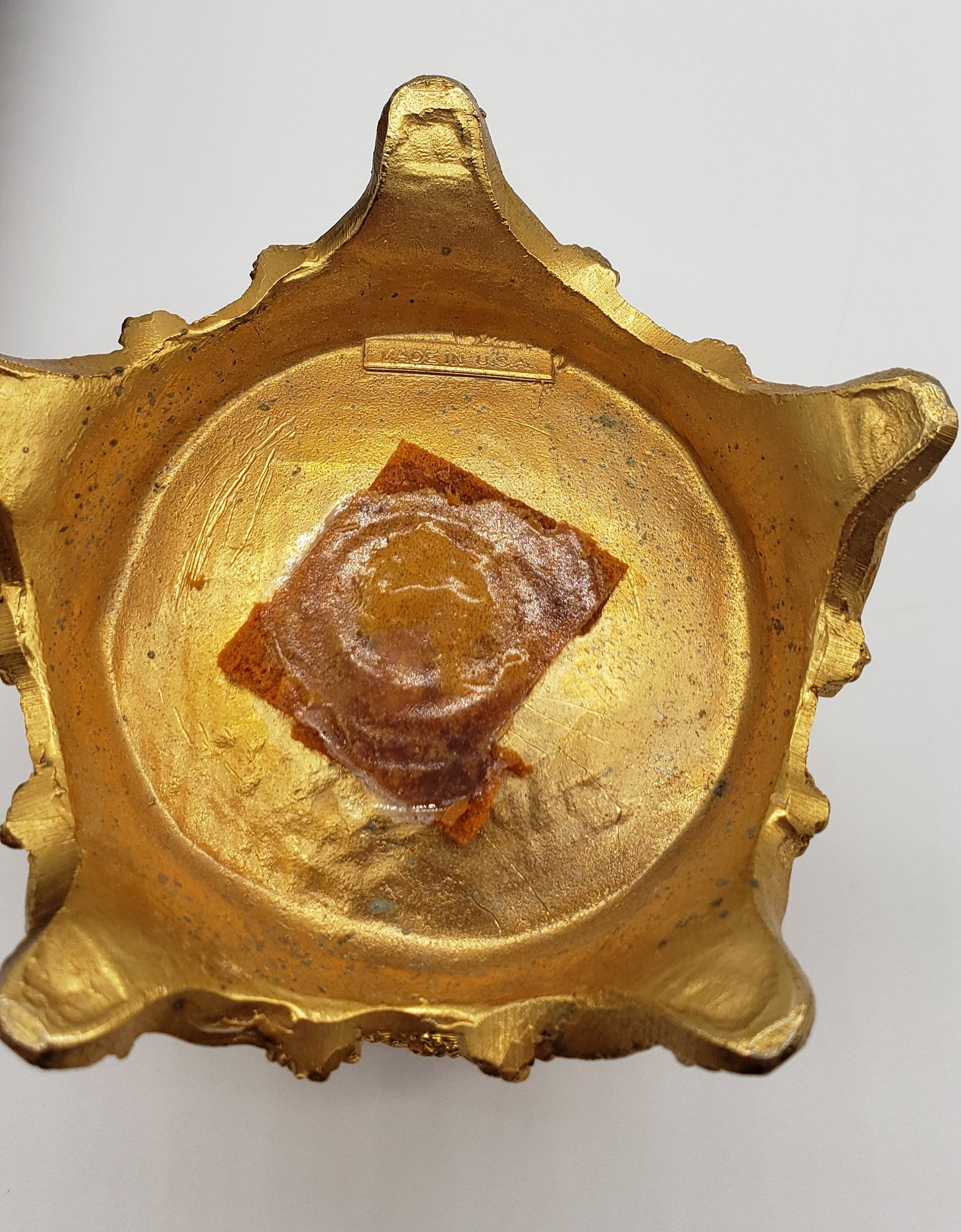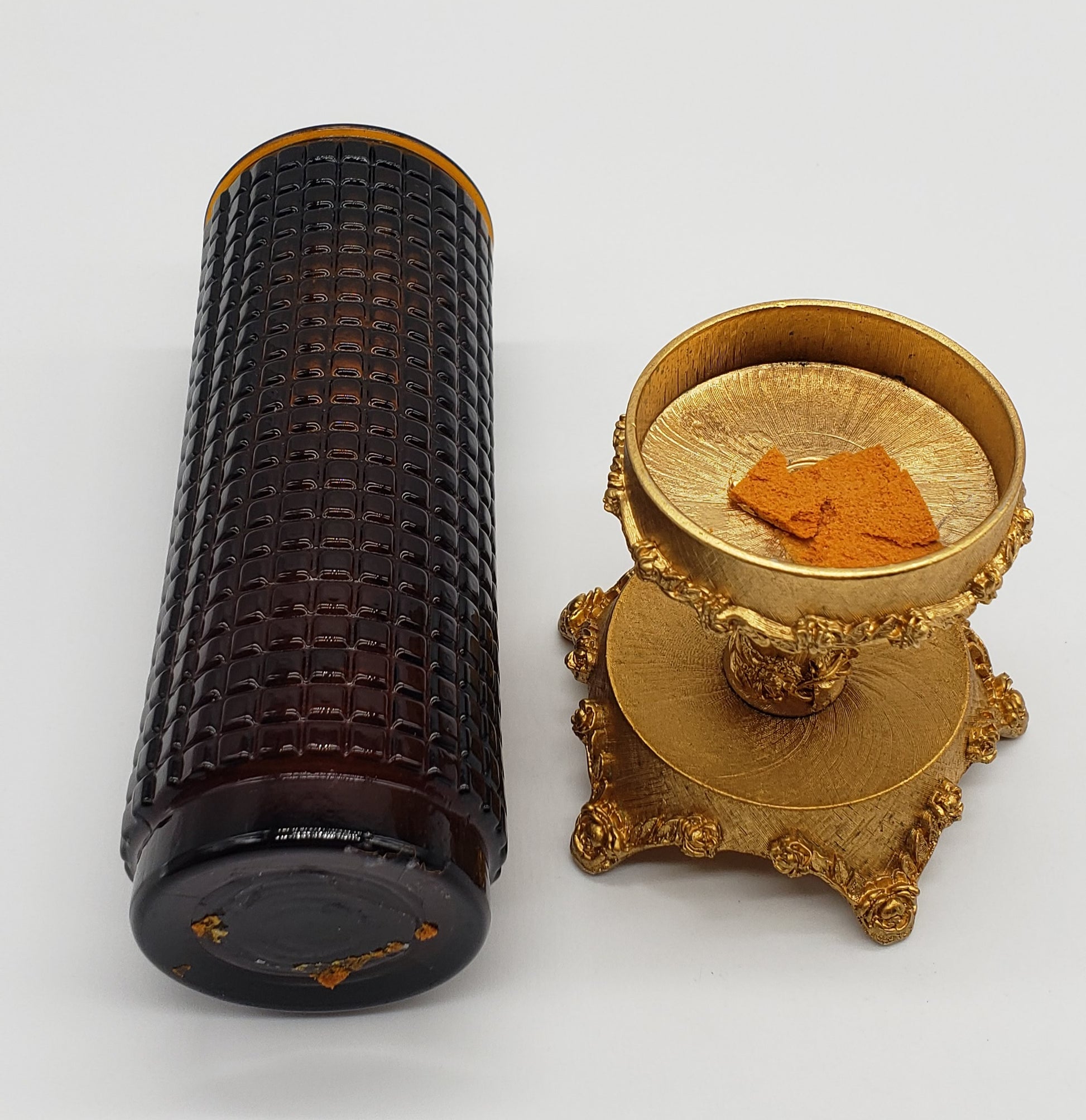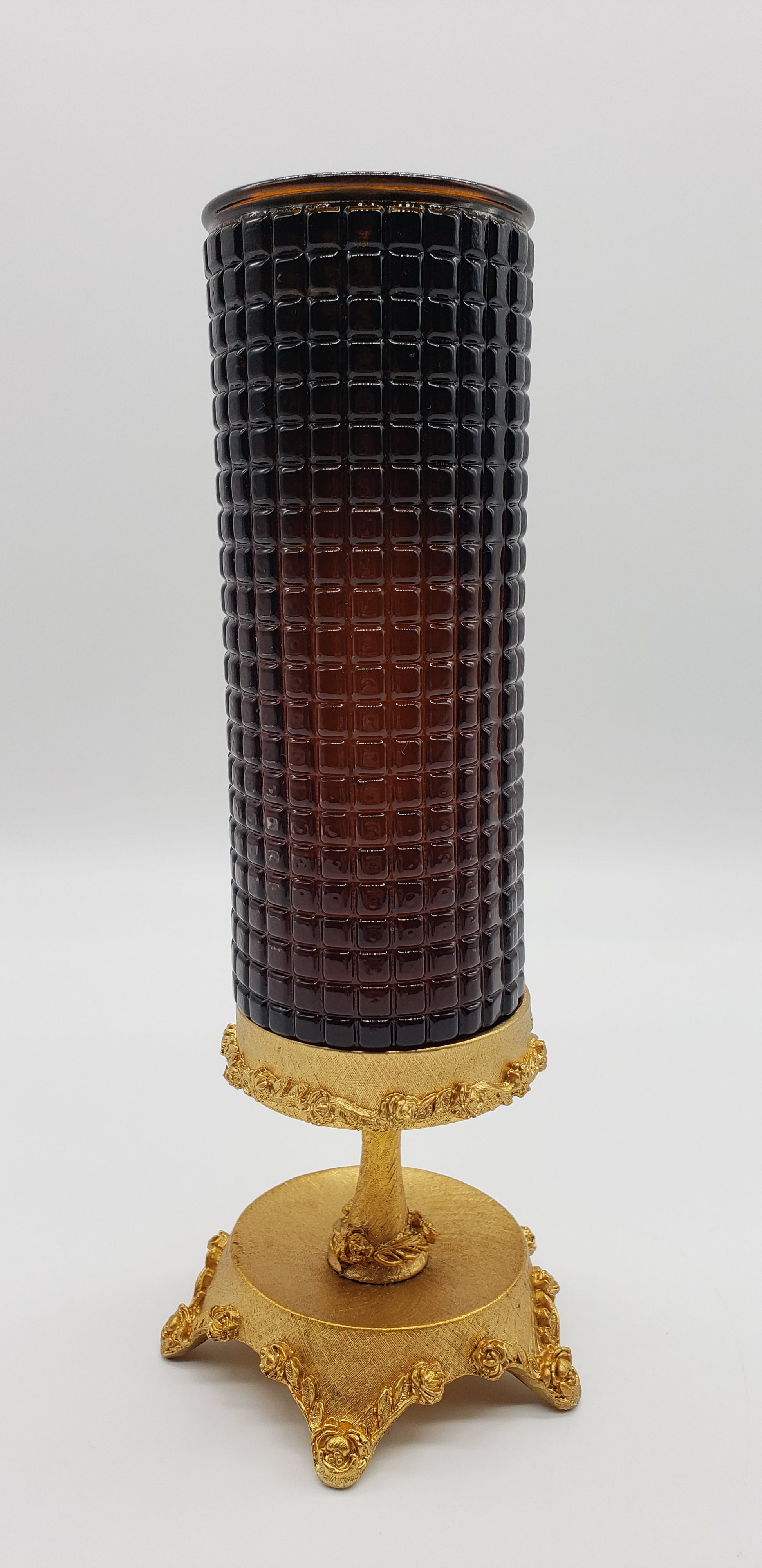 Amber Pressed Glass Candle Holder On Gold Metal Base