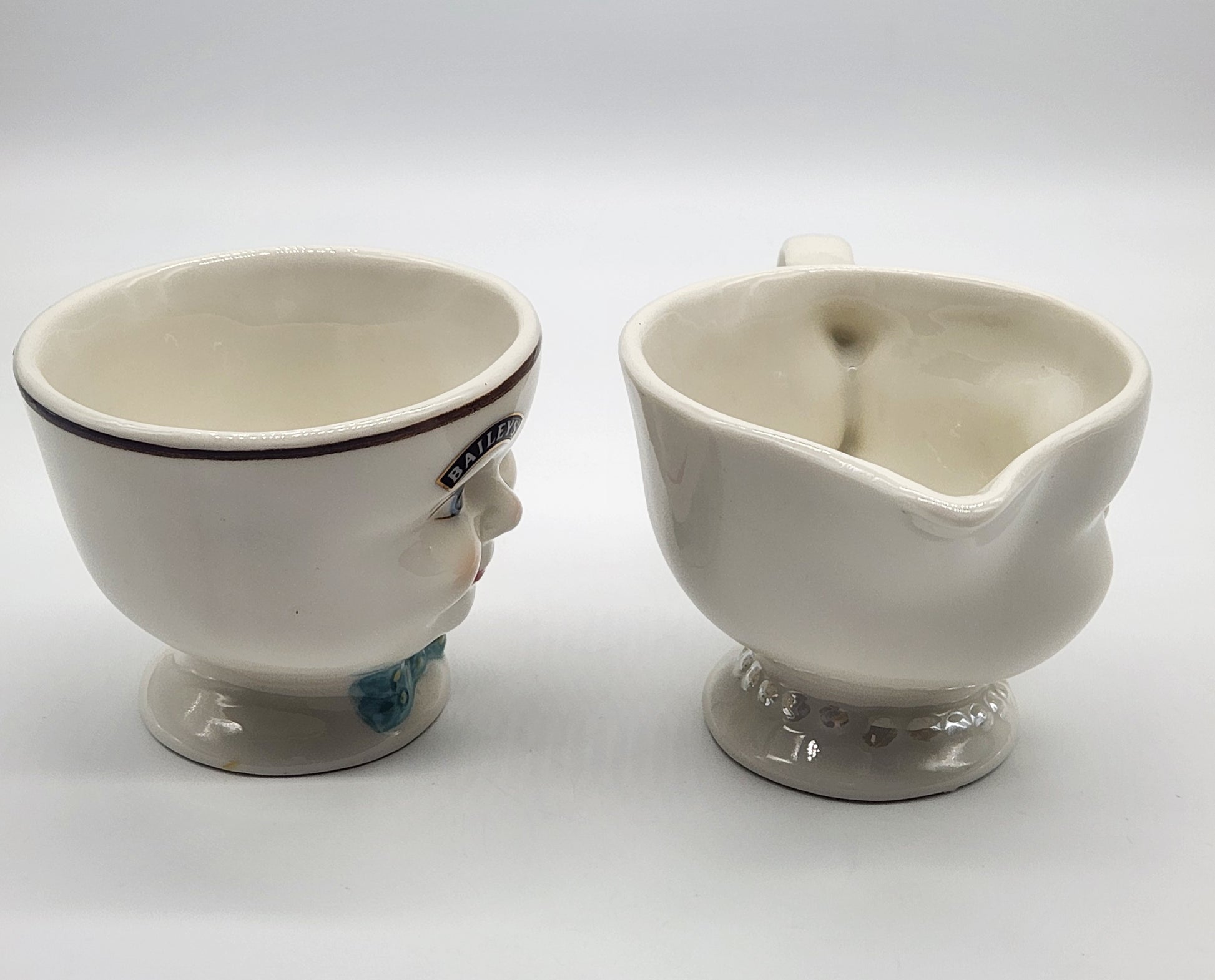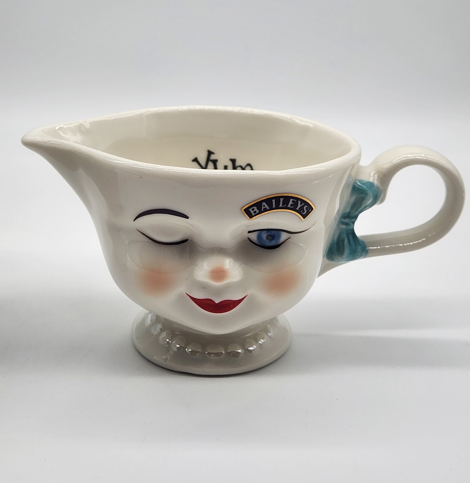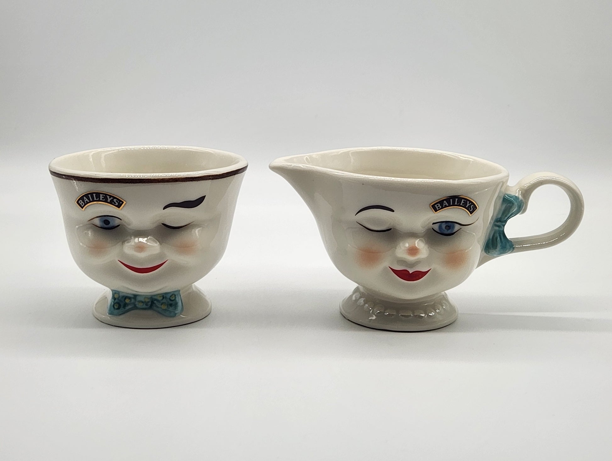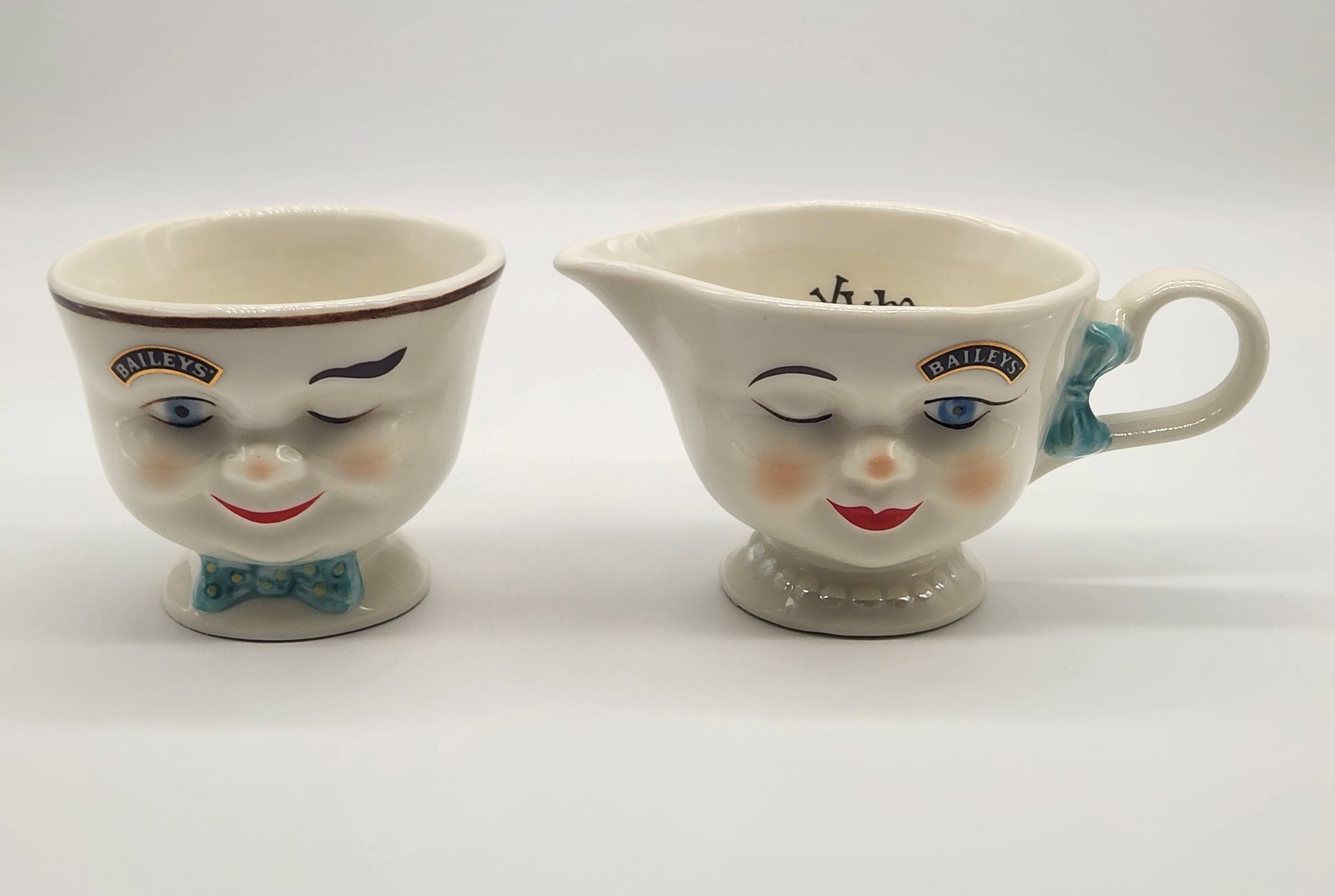 BAILEYS Irish Cream YUM Winking Eye Face Cream And Sugar Limited Edition 1996. Creamer measures 4.5" wide x 3" tall. Sugar bowl measures 3.5" wide x 3" tall