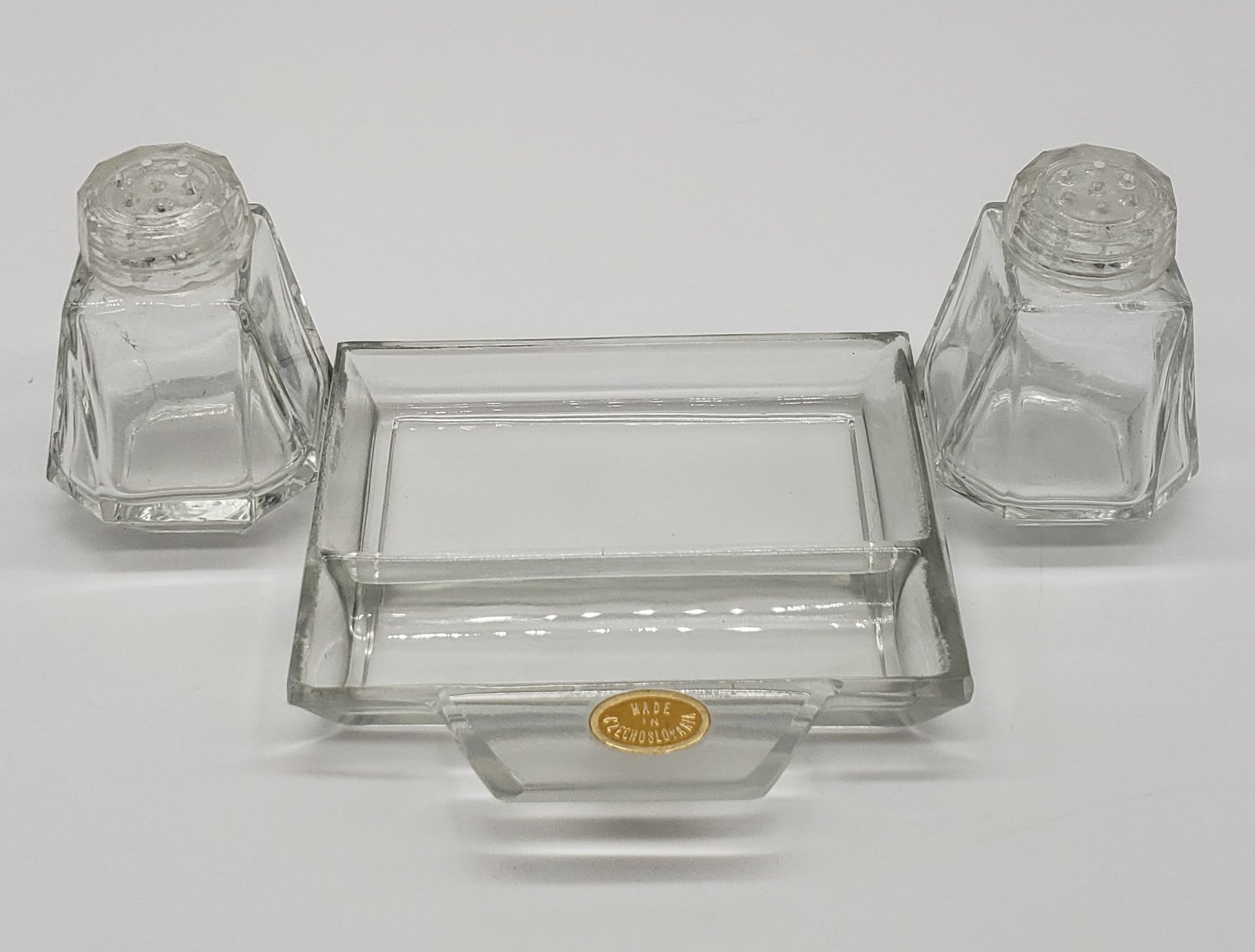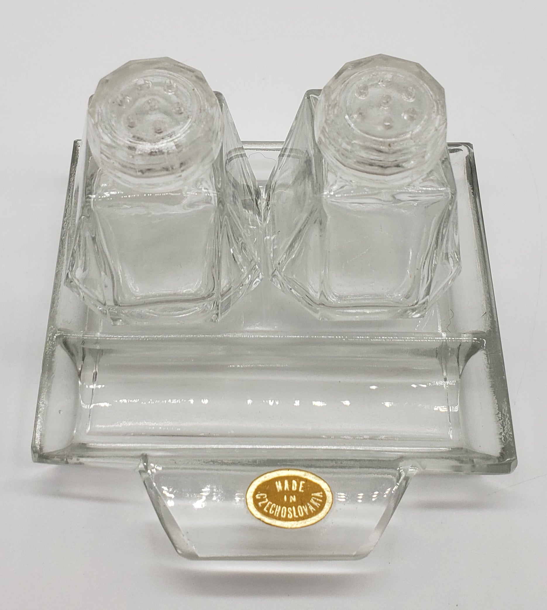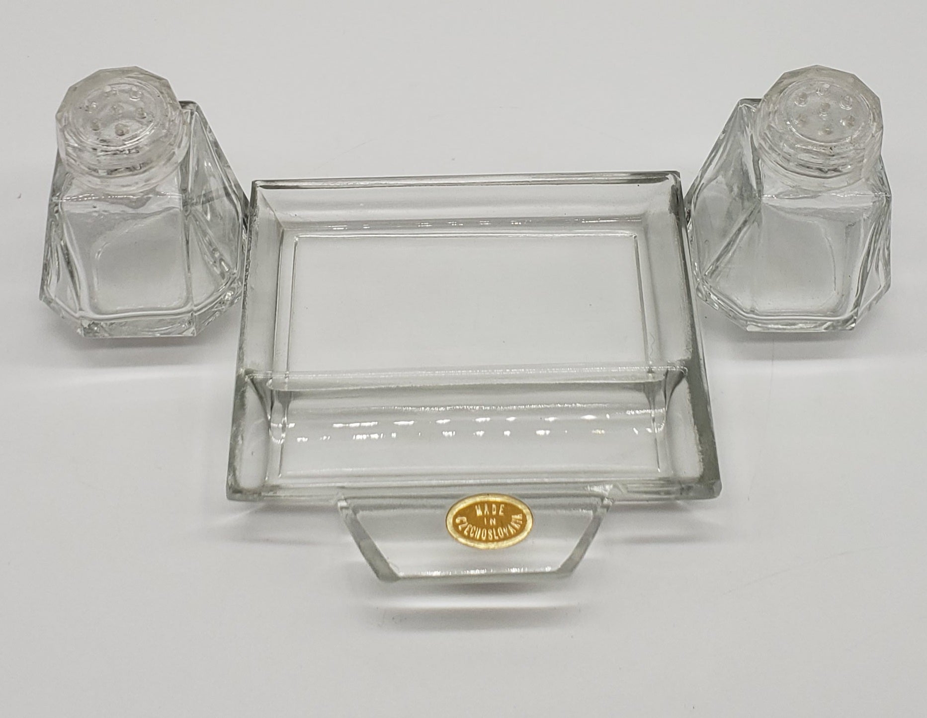 Bohemia Glass Salt & Pepper Shakers w/Crystal Tray Mid-Century Modern Czech