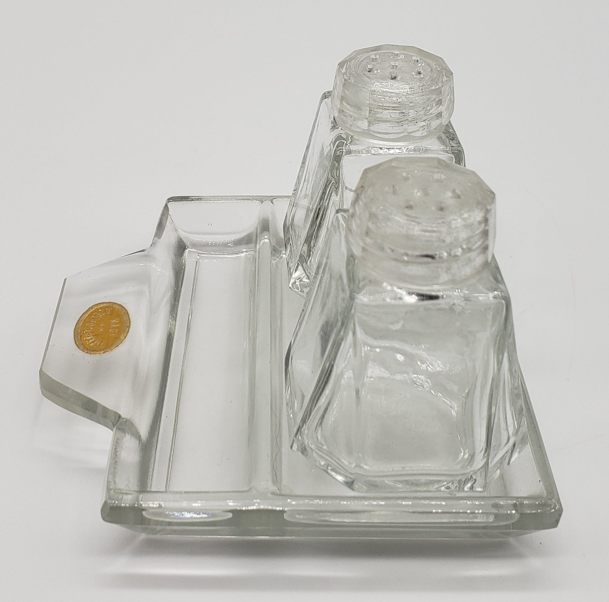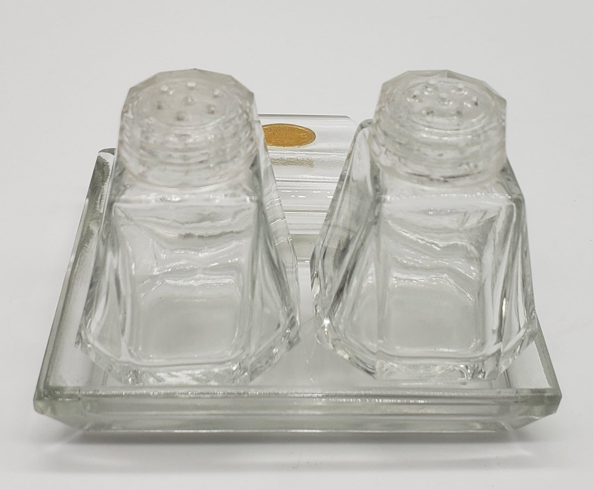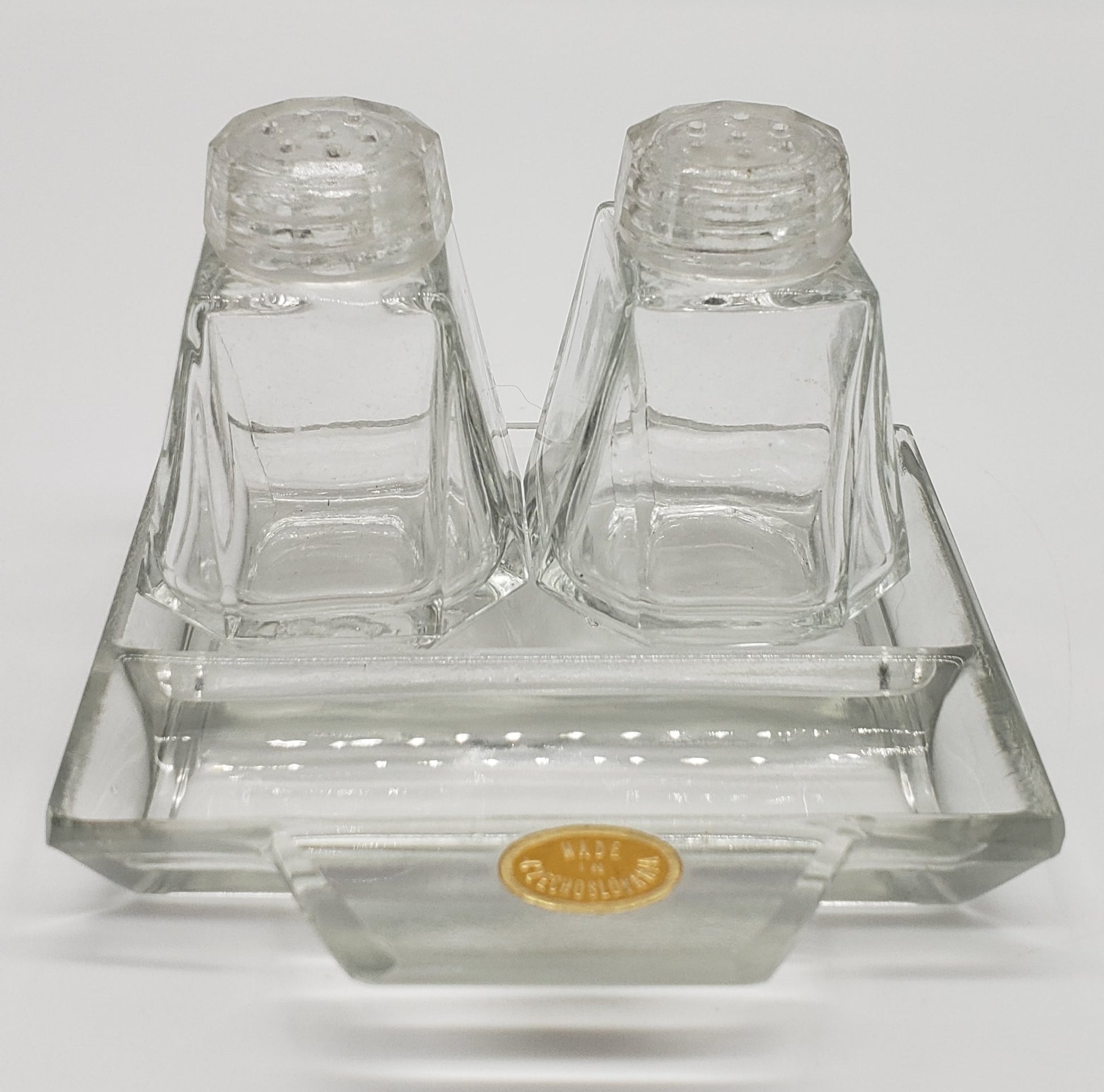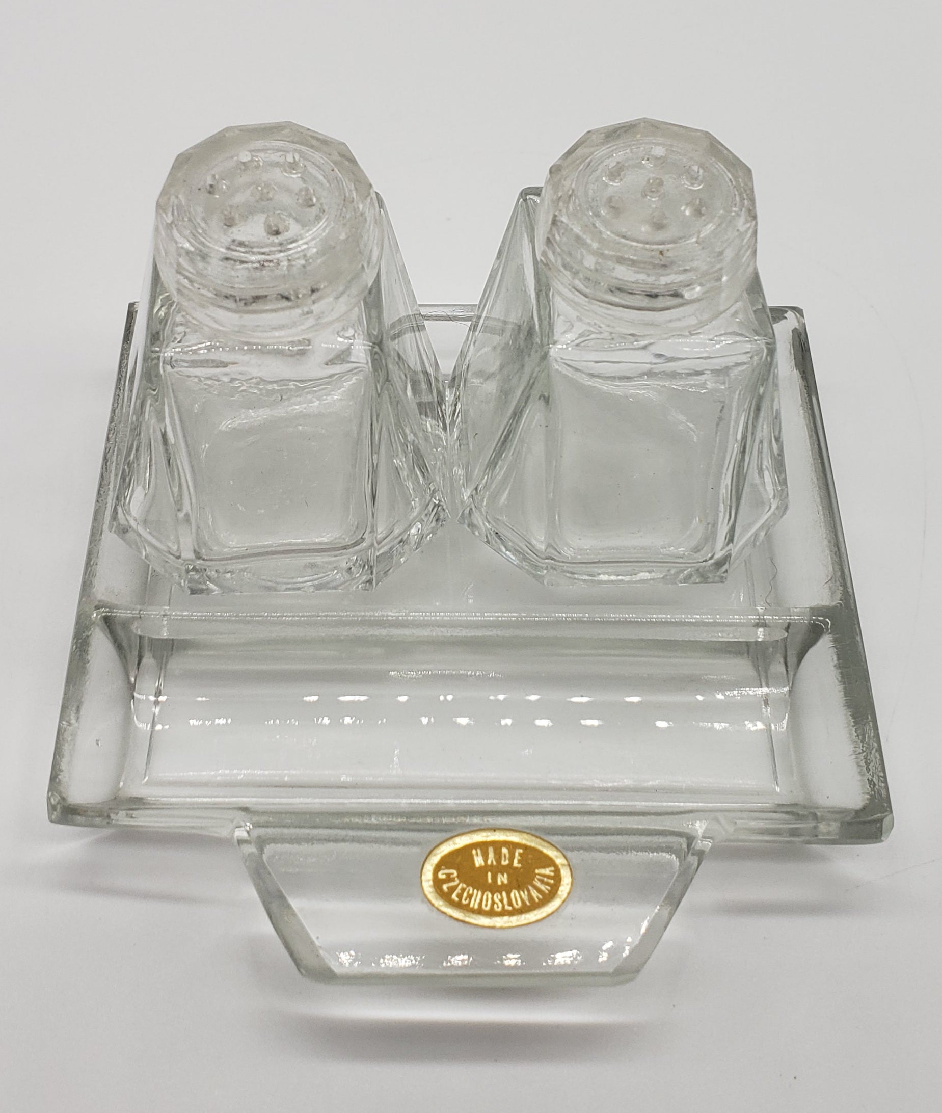 Bohemia Glass Salt & Pepper Shakers w/Crystal Tray Mid-Century Modern Czech