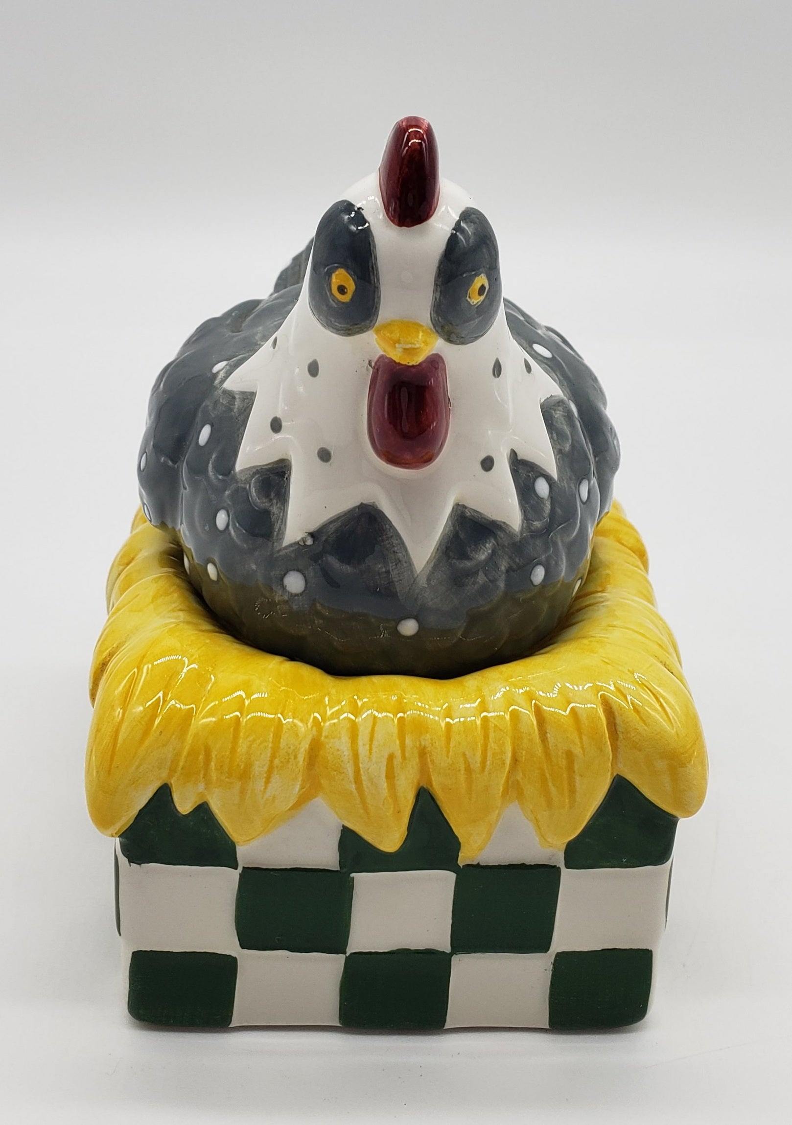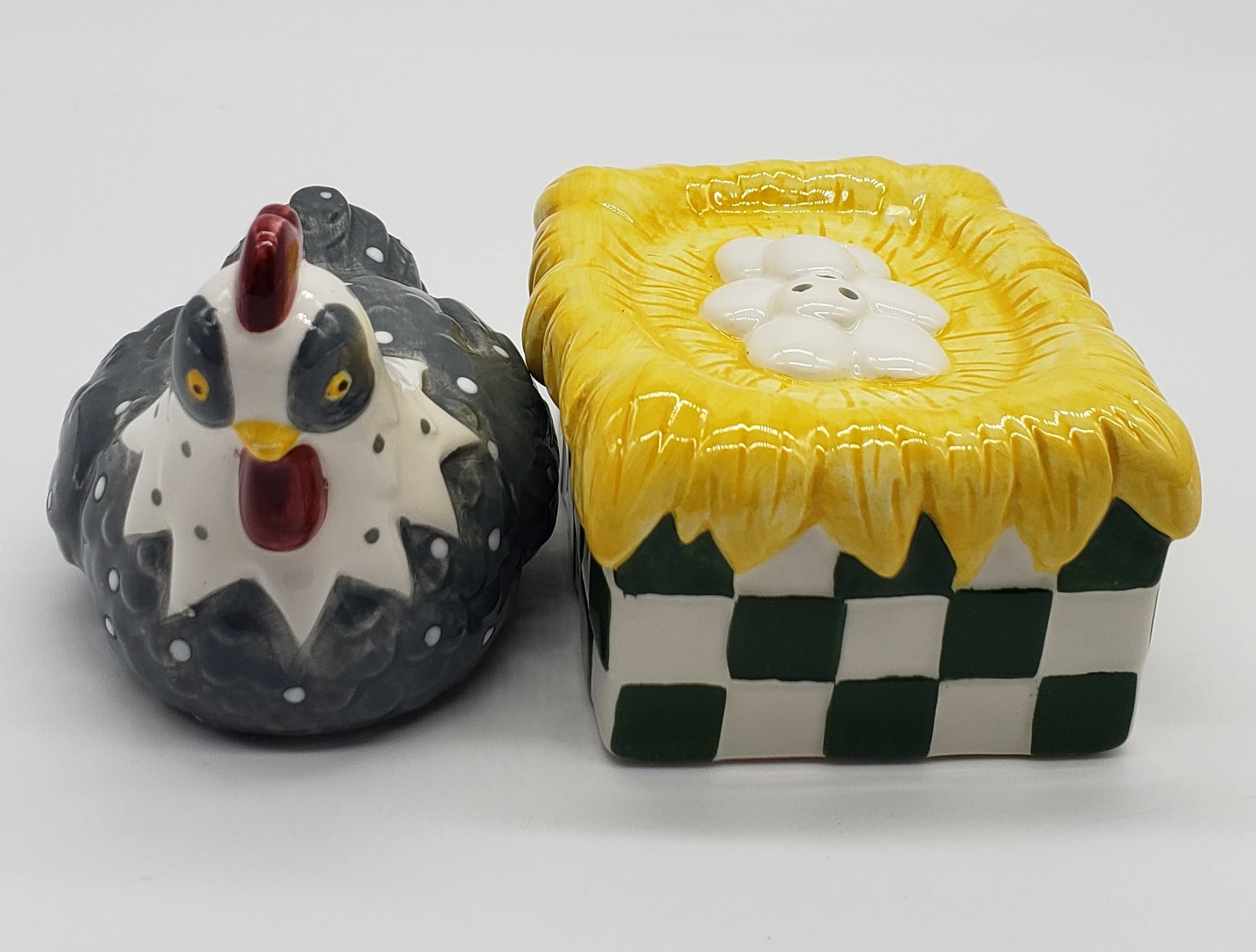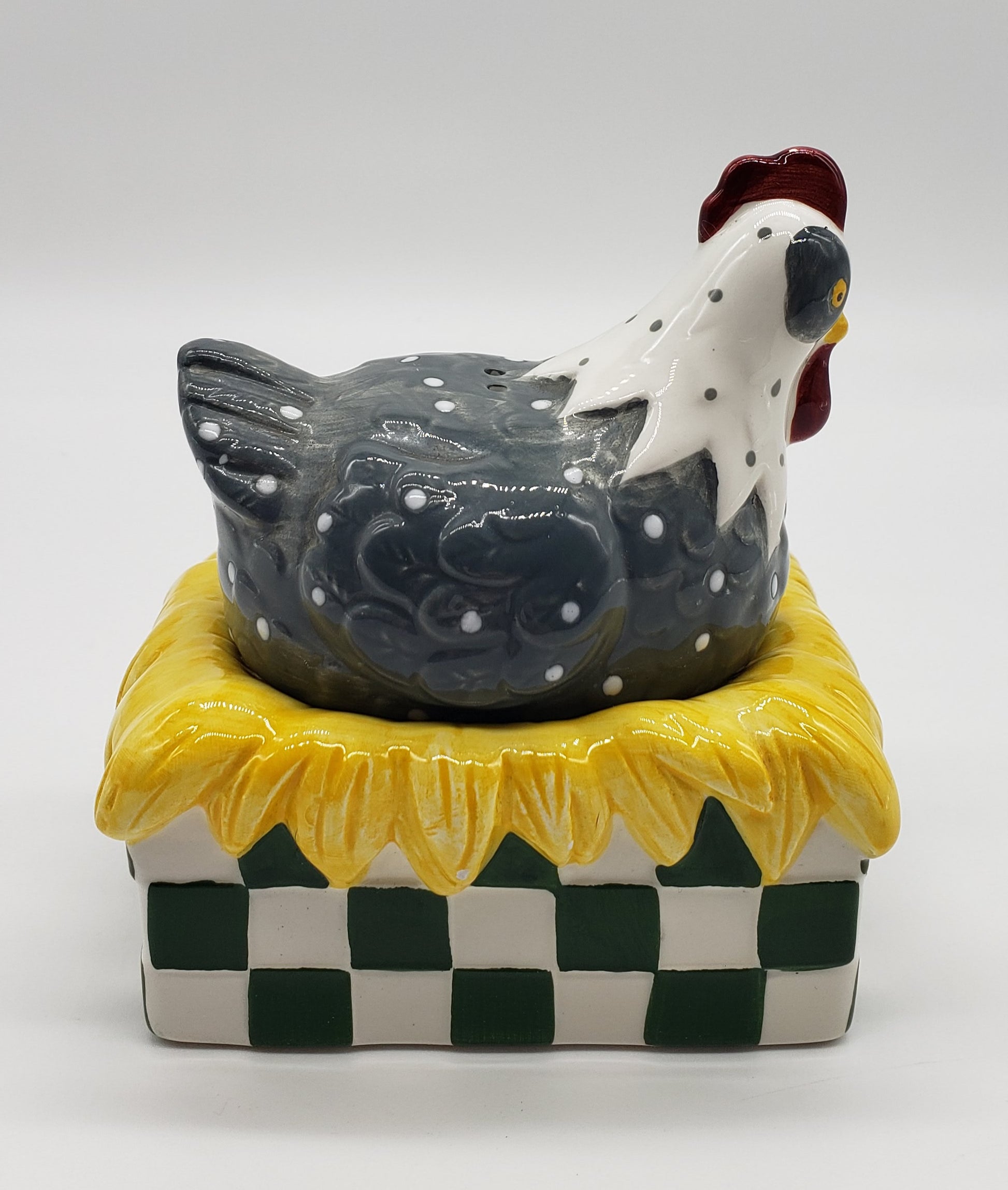 Cook's Club Ceramic Nesting Hen Chicken Salt & Pepper Shaker Set. Some chipping present on nest.