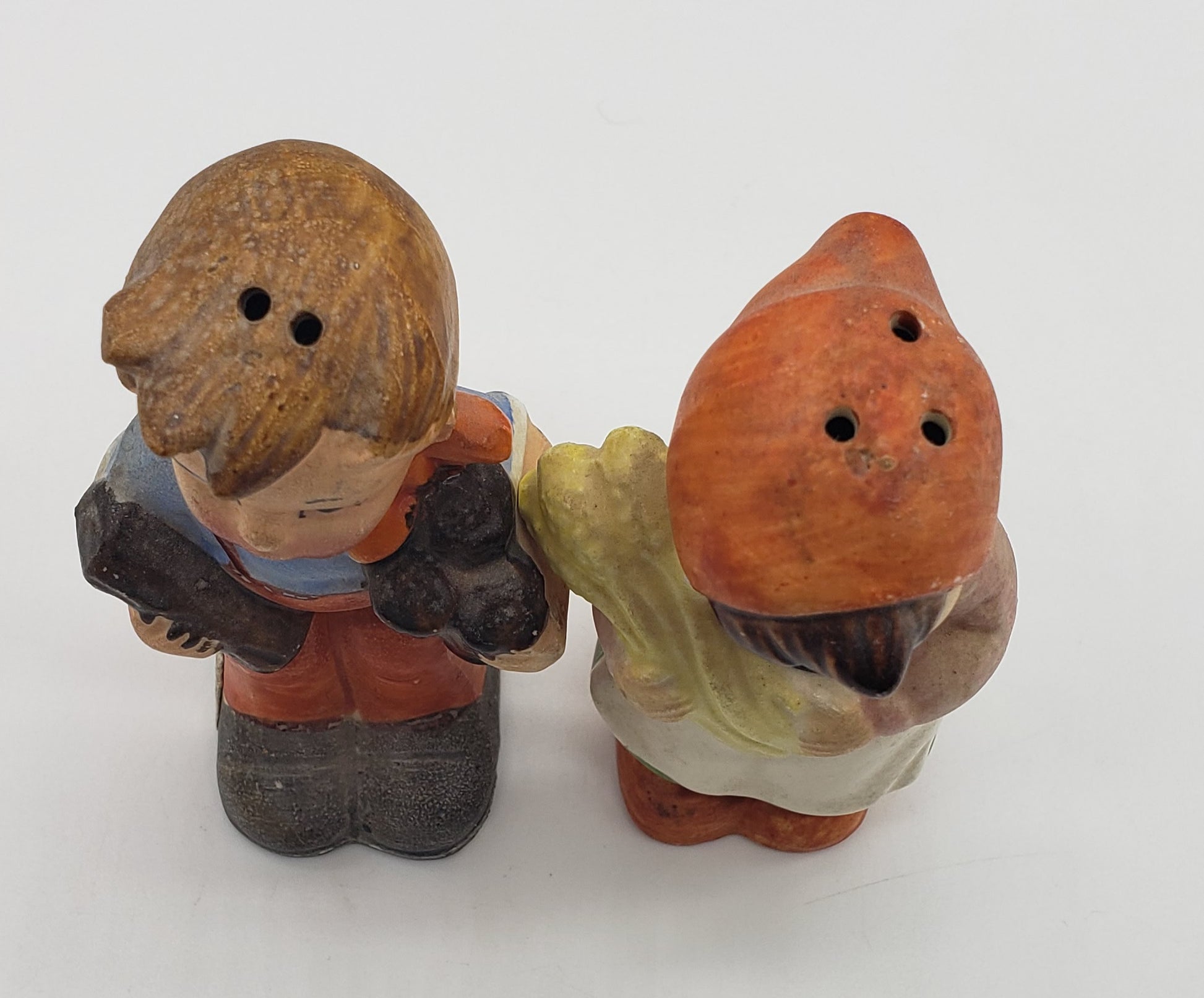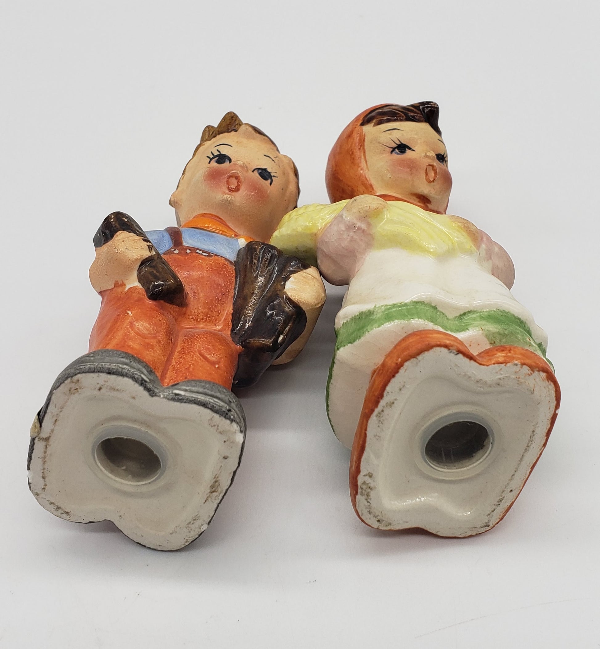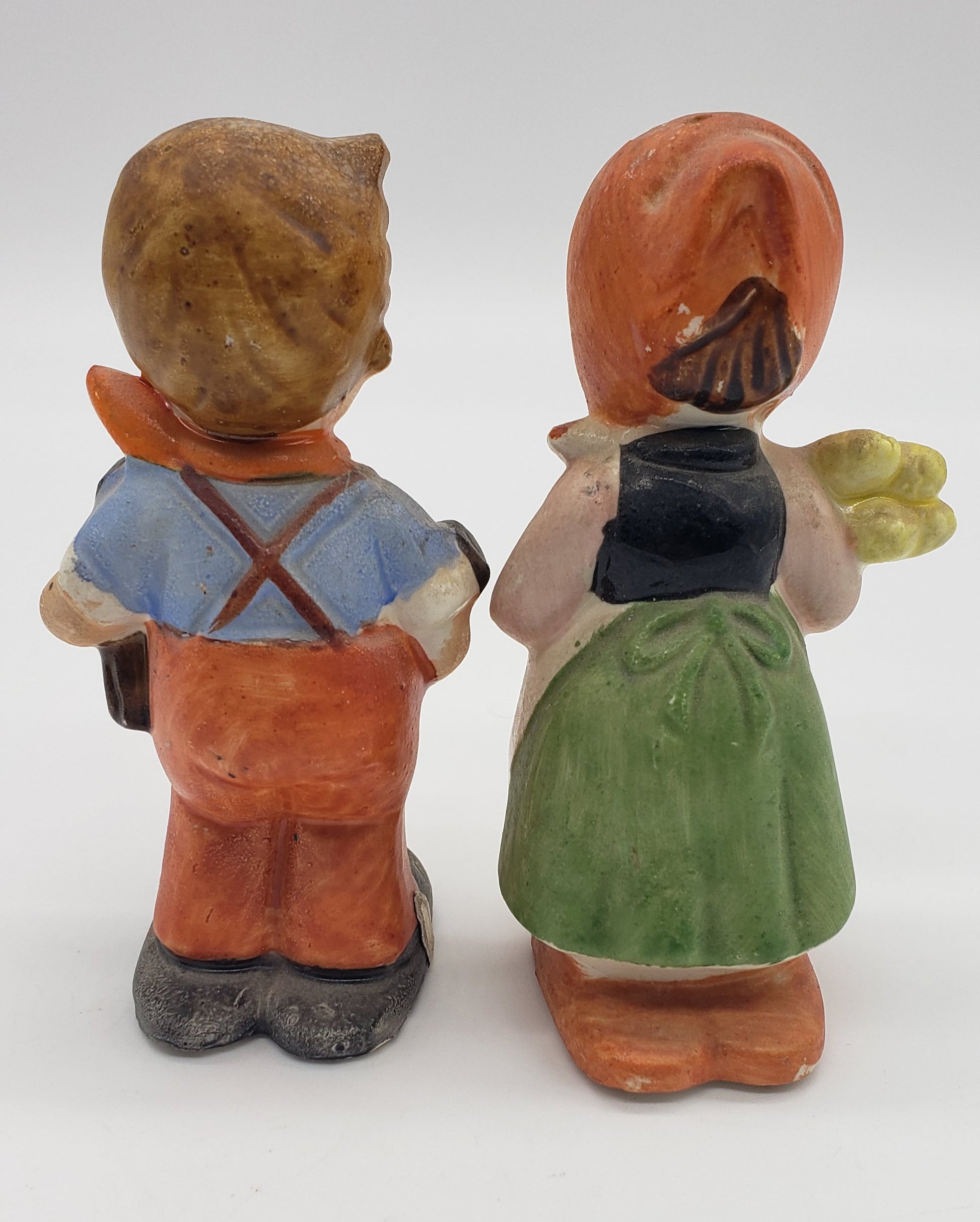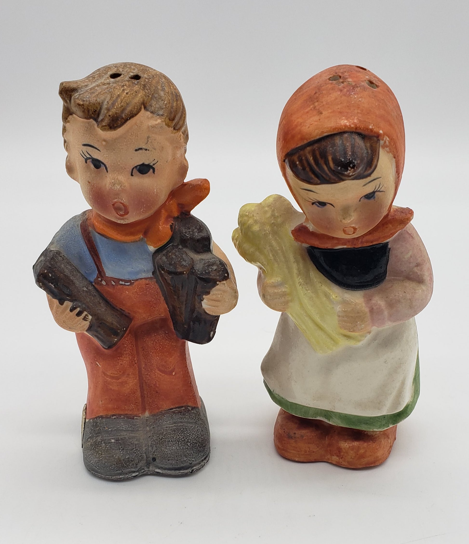 Country Kids Salt and Pepper Shakers. Little girl is holding corn stalks and little boy is carrying wooden logs.
