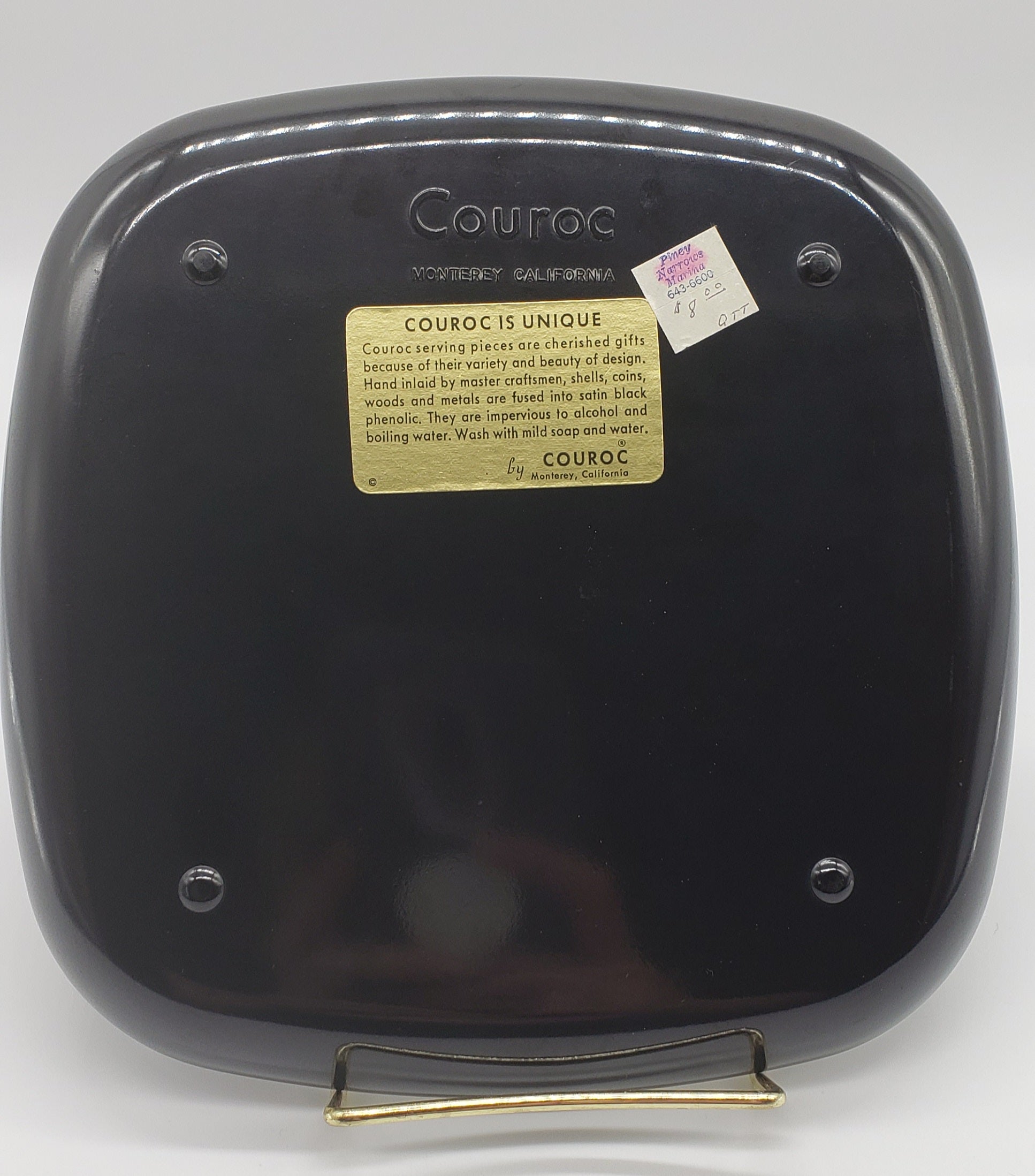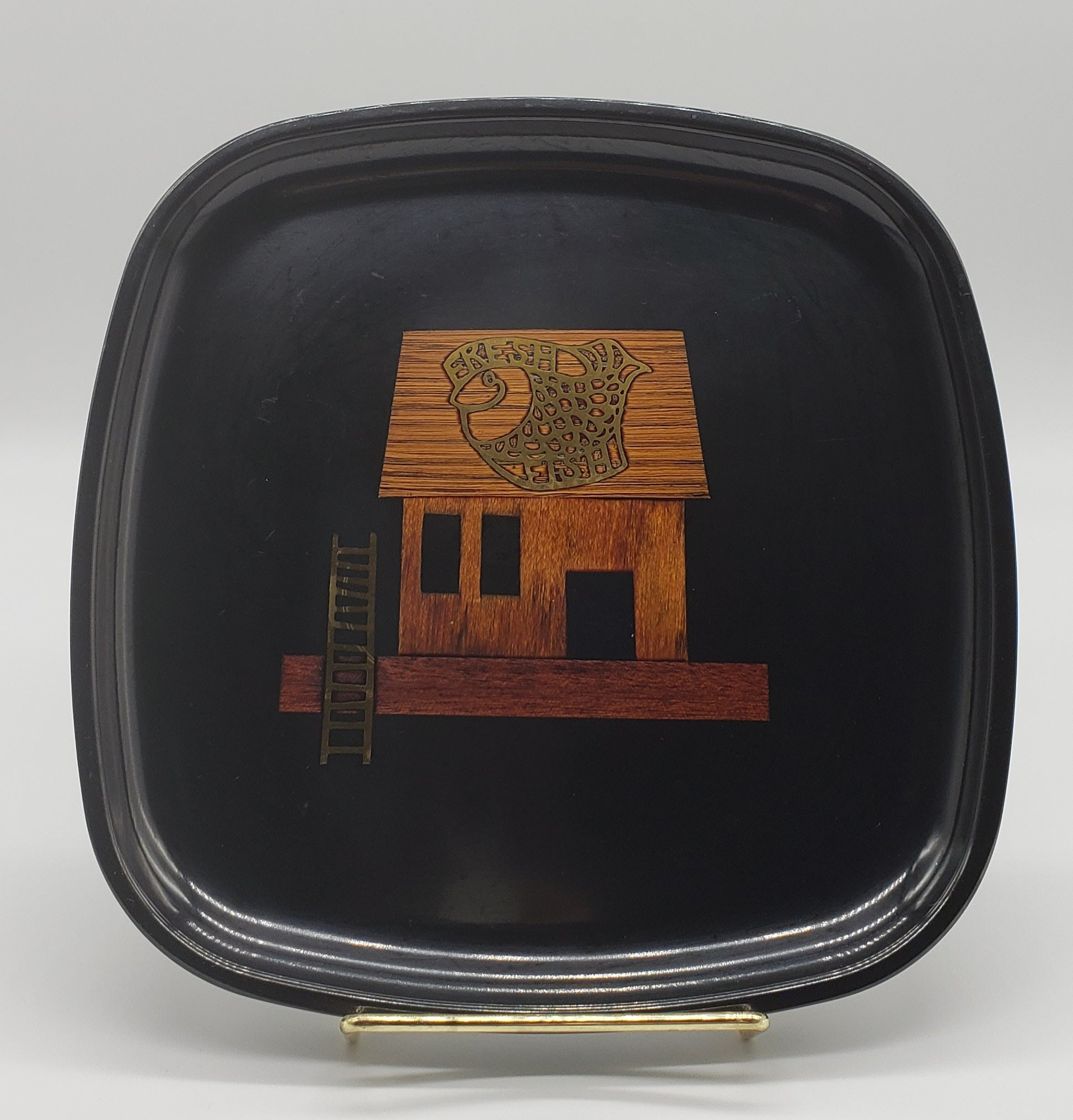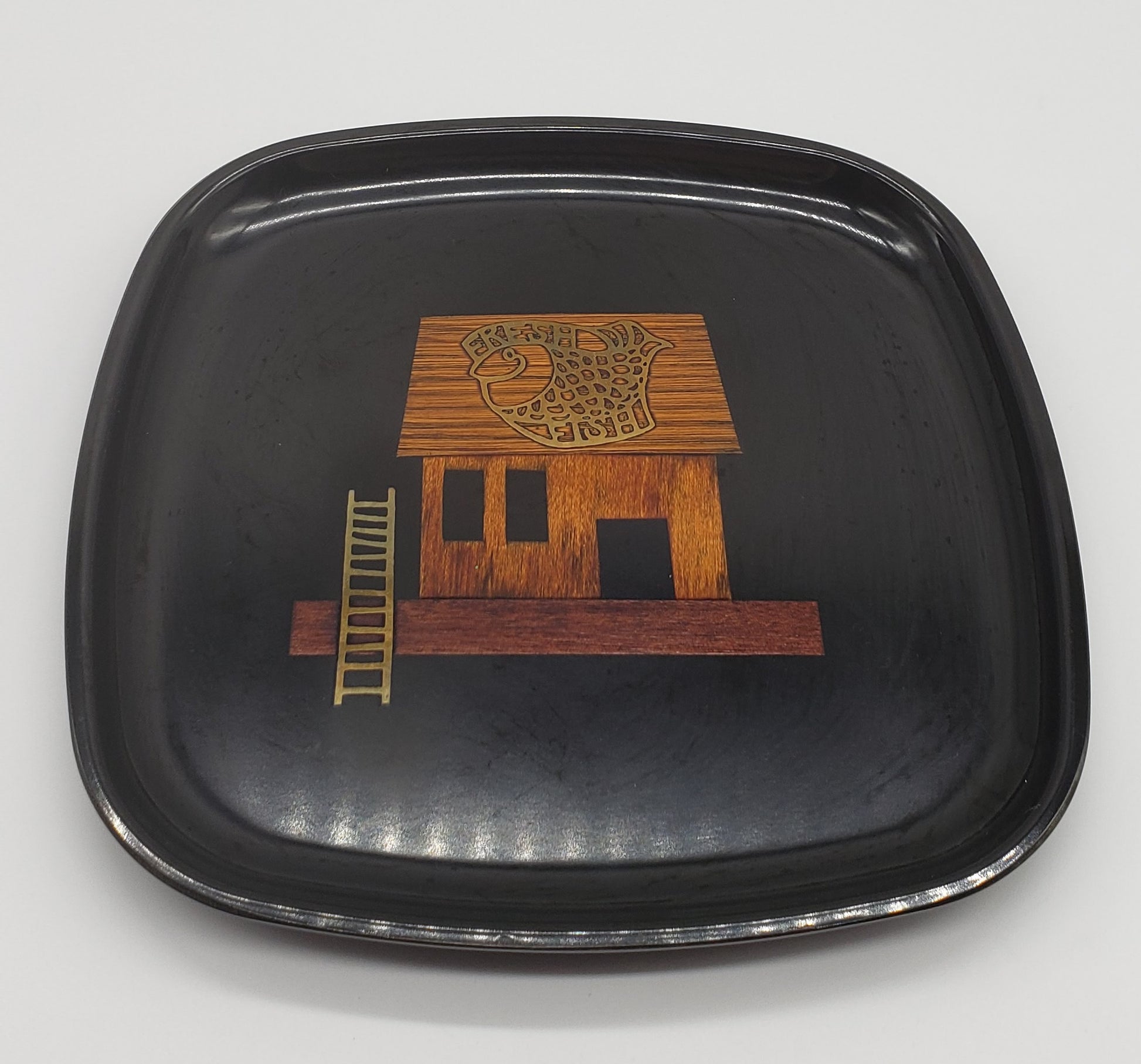Vintage Couroc Square Plate Tray of Black Resin / Fresh Fish Market / Inlaid Wood and Brass.