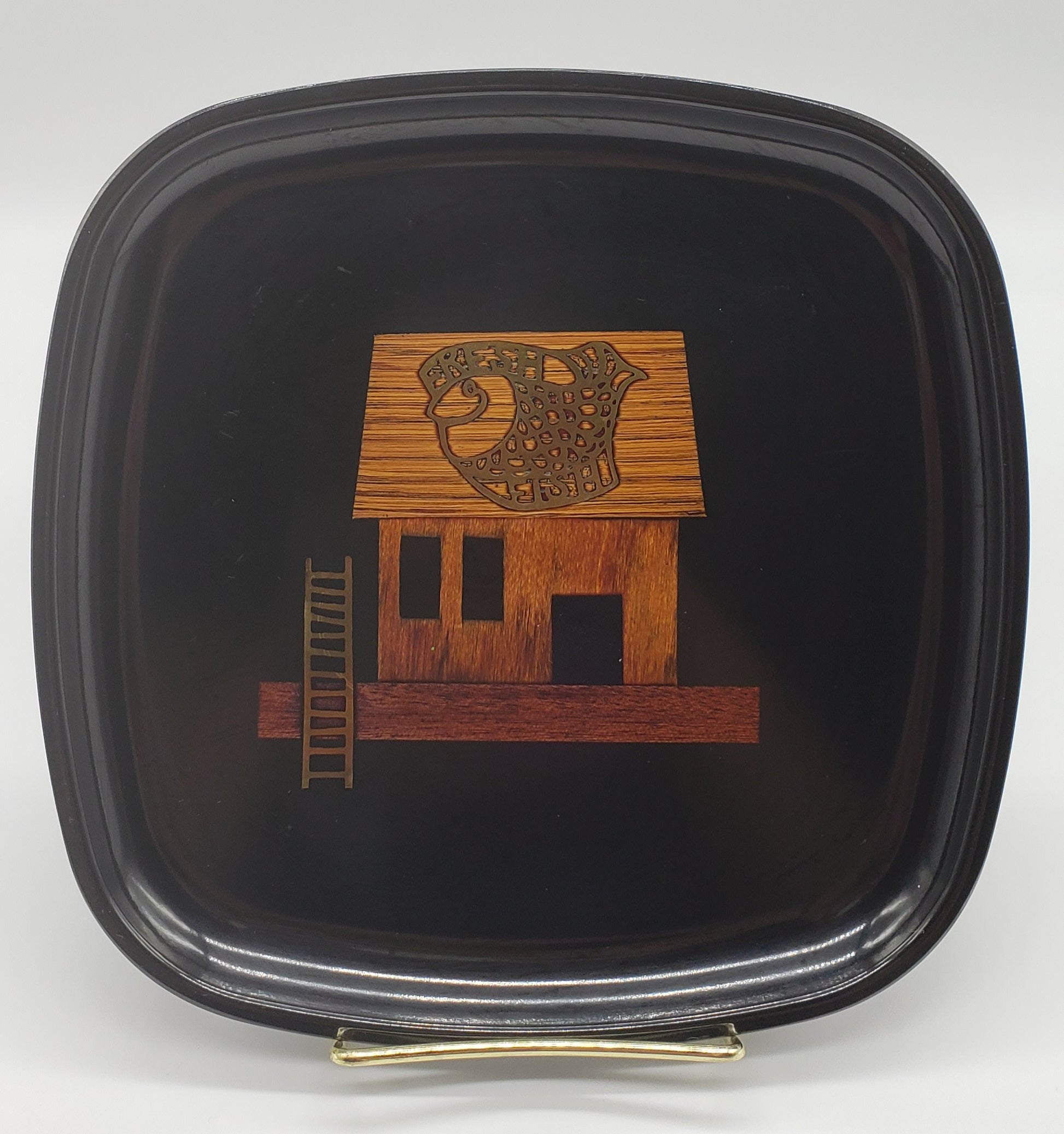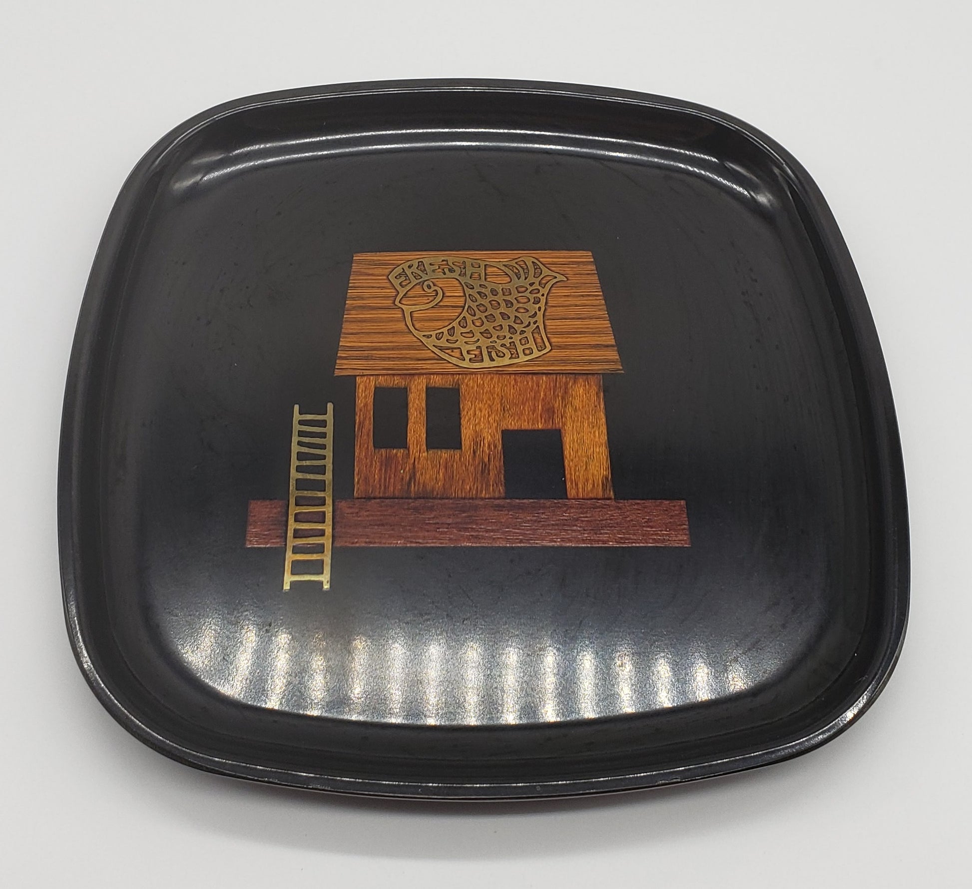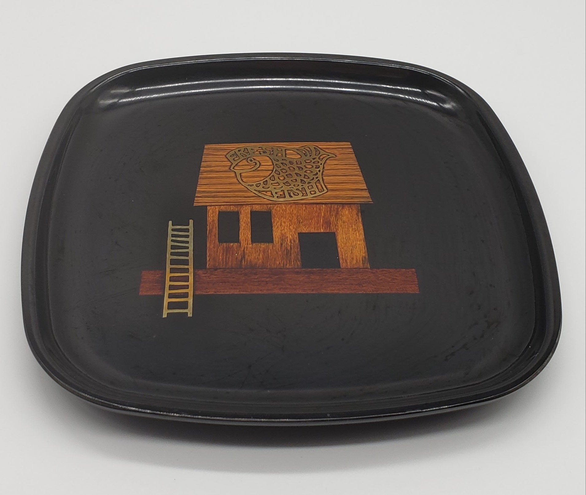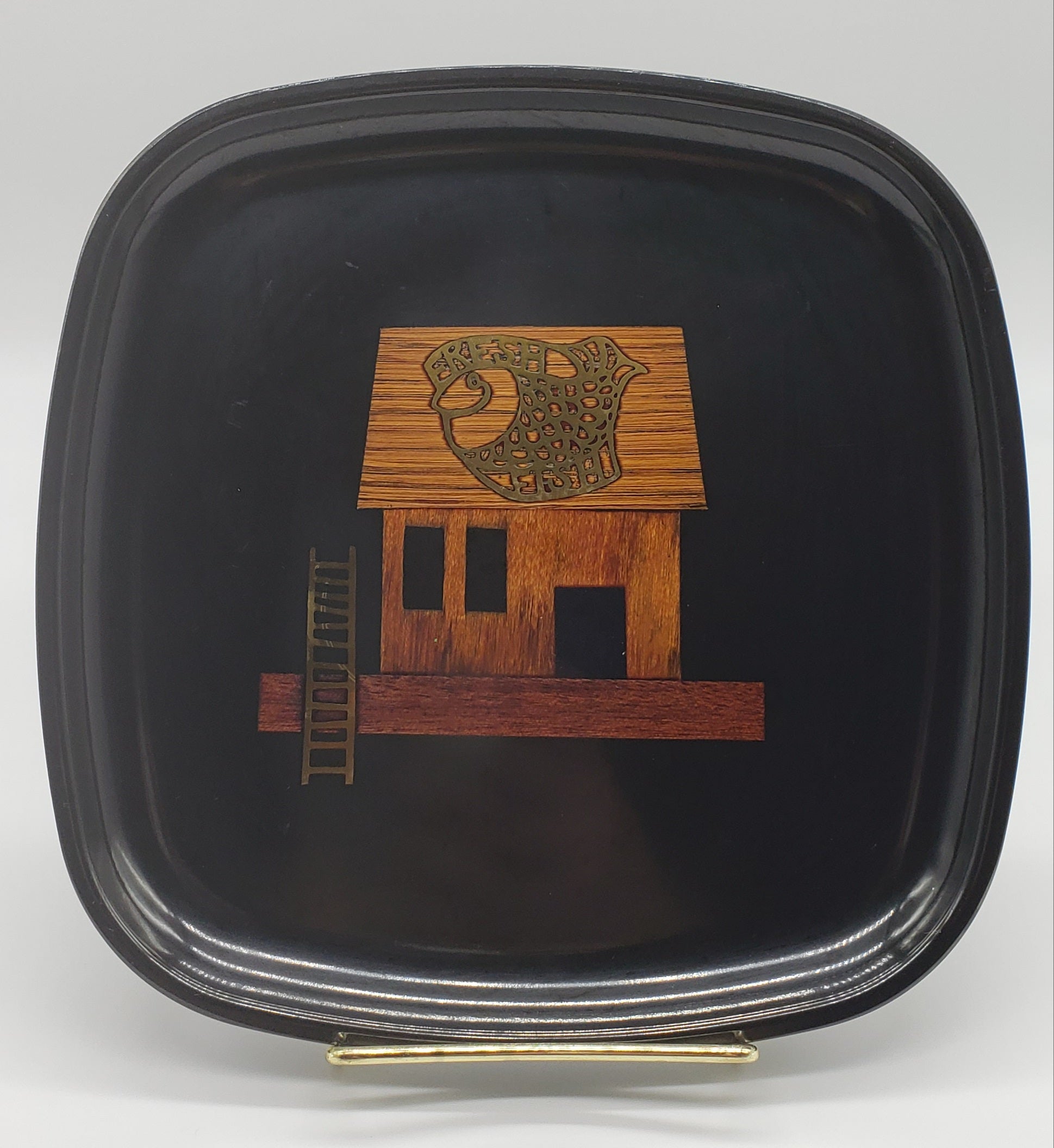 Vintage Couroc Square Plate Tray of Black Resin / Fresh Fish Market / Inlaid Wood and Brass.