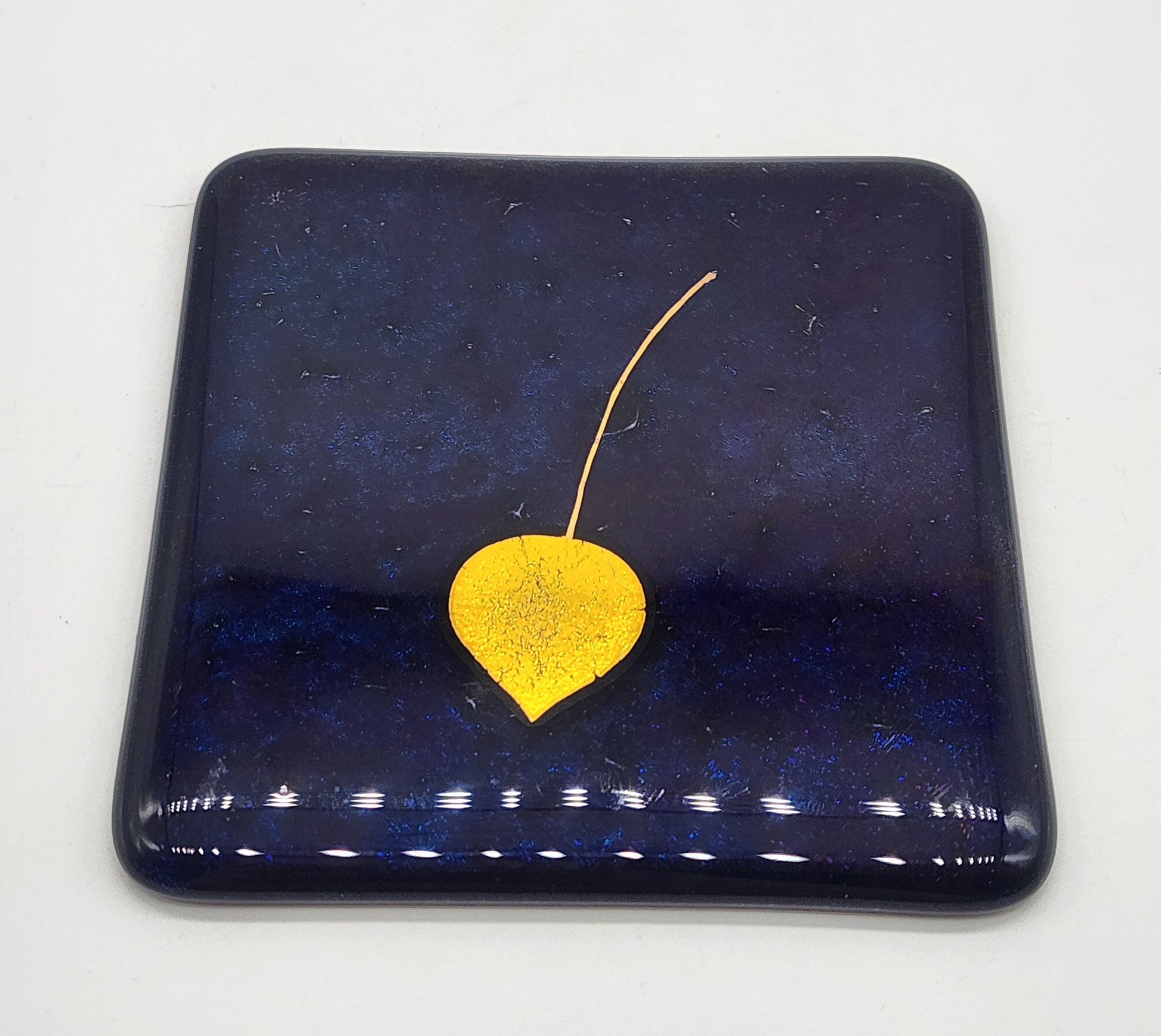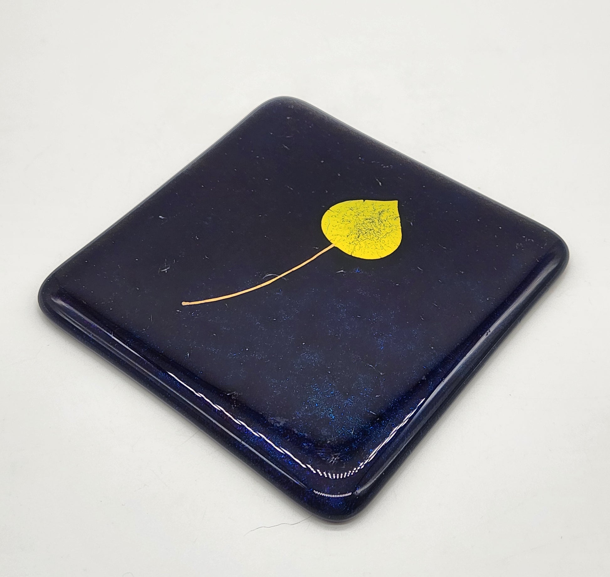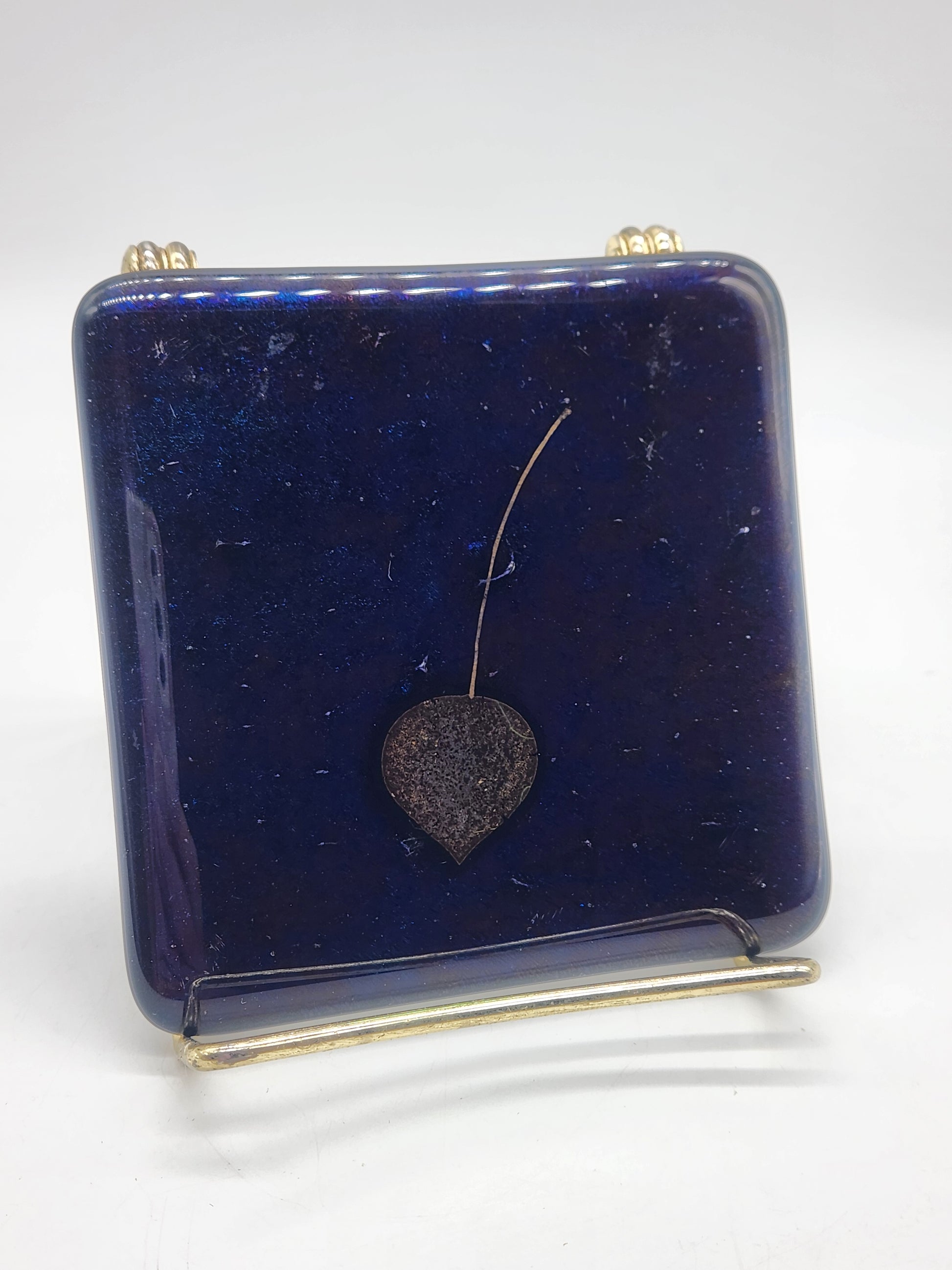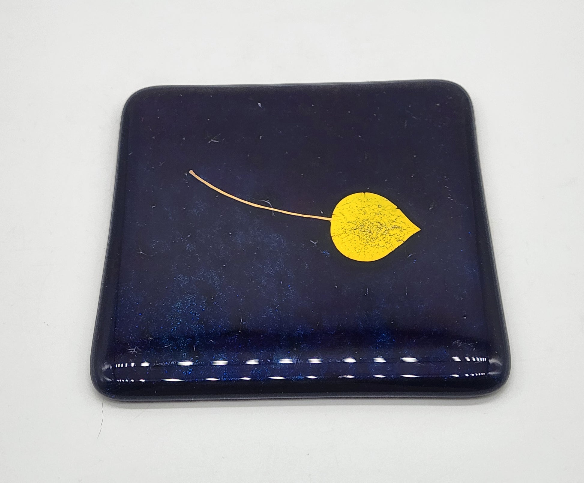 David Cuin Glass Coasters Cobalt Blue Leaf Iridescent Fused Slumped Signed 4.5"