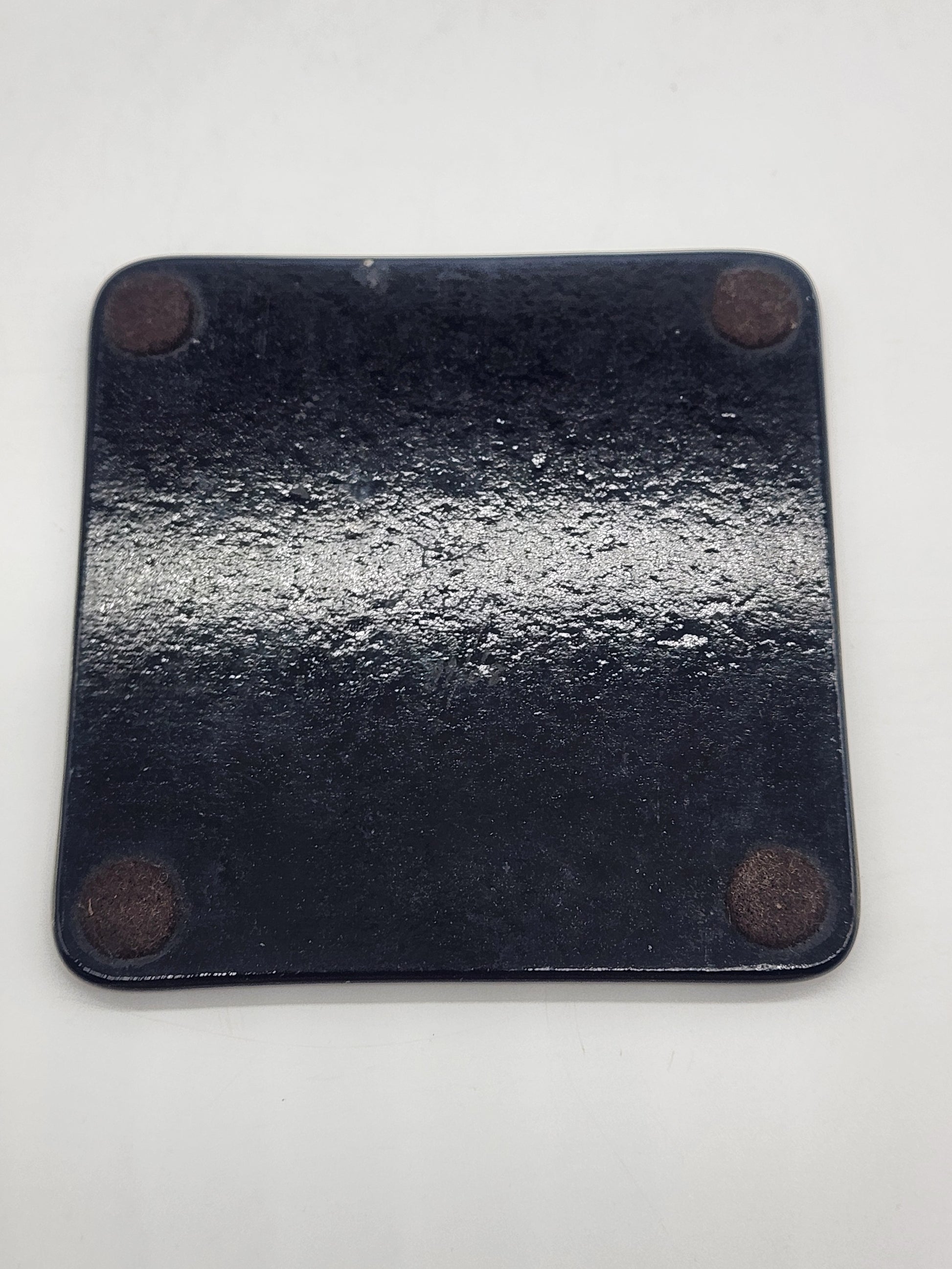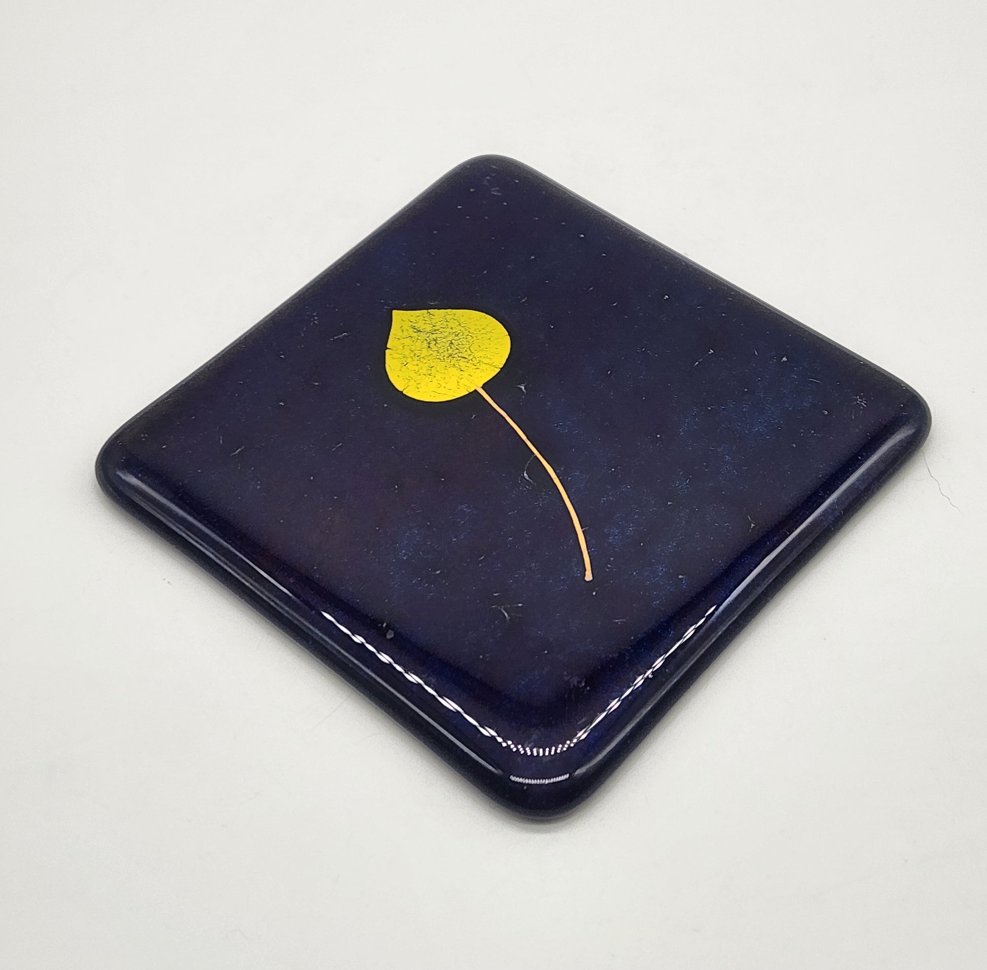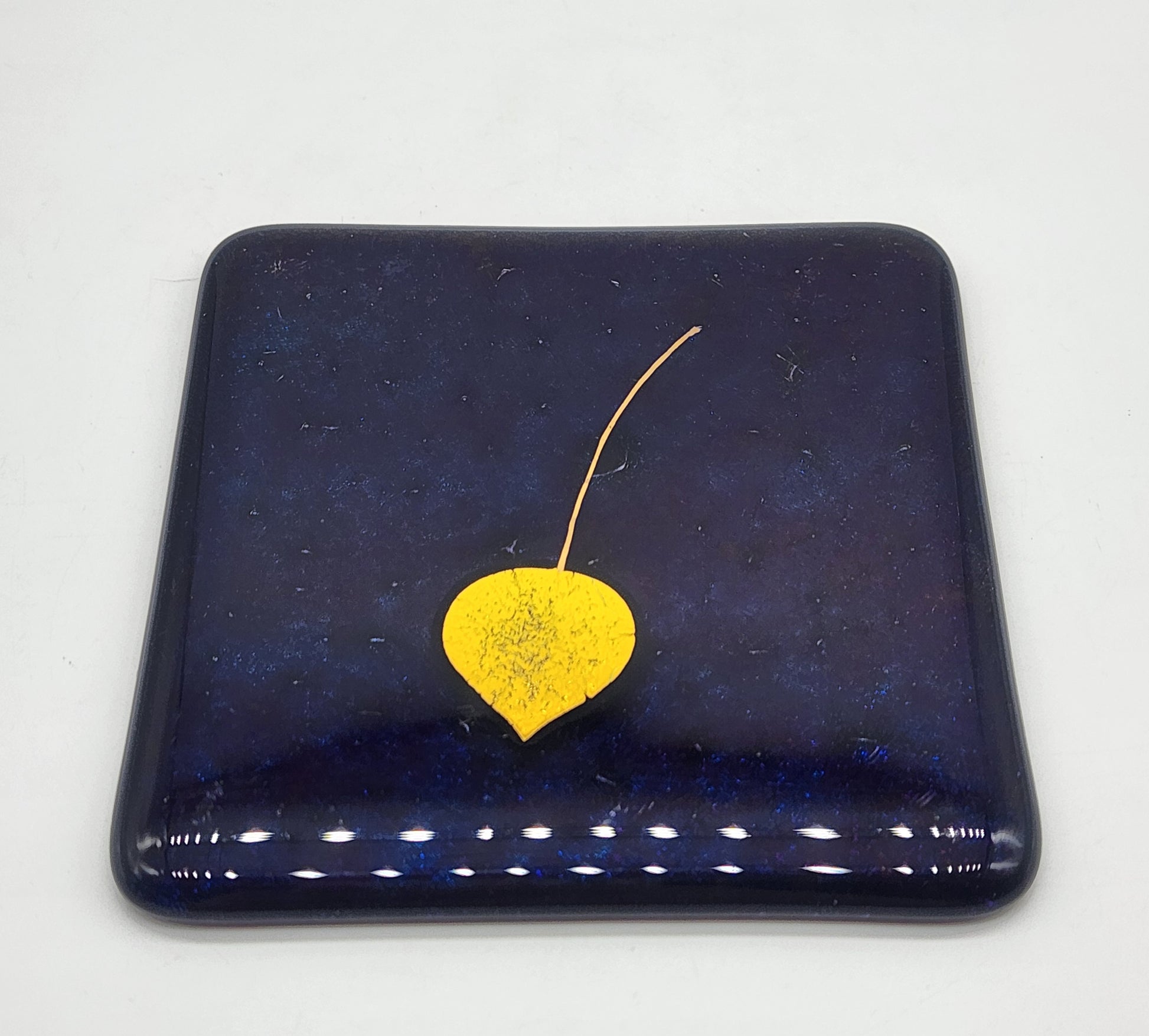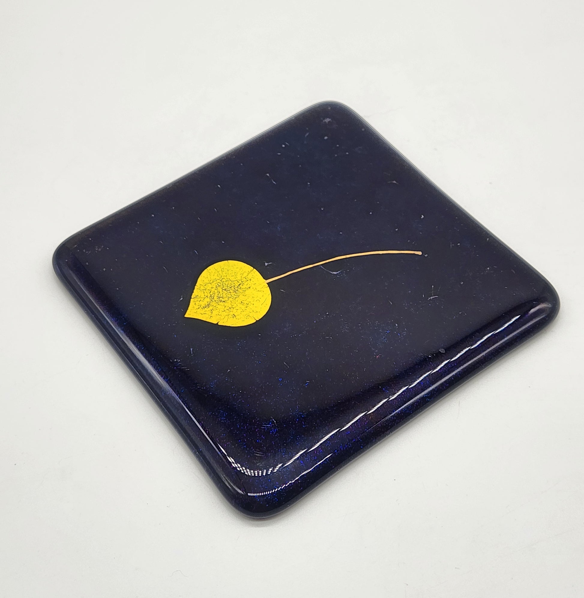 David Cuin Glass Coasters Cobalt Blue Leaf Iridescent Fused Slumped Signed 4.5"
