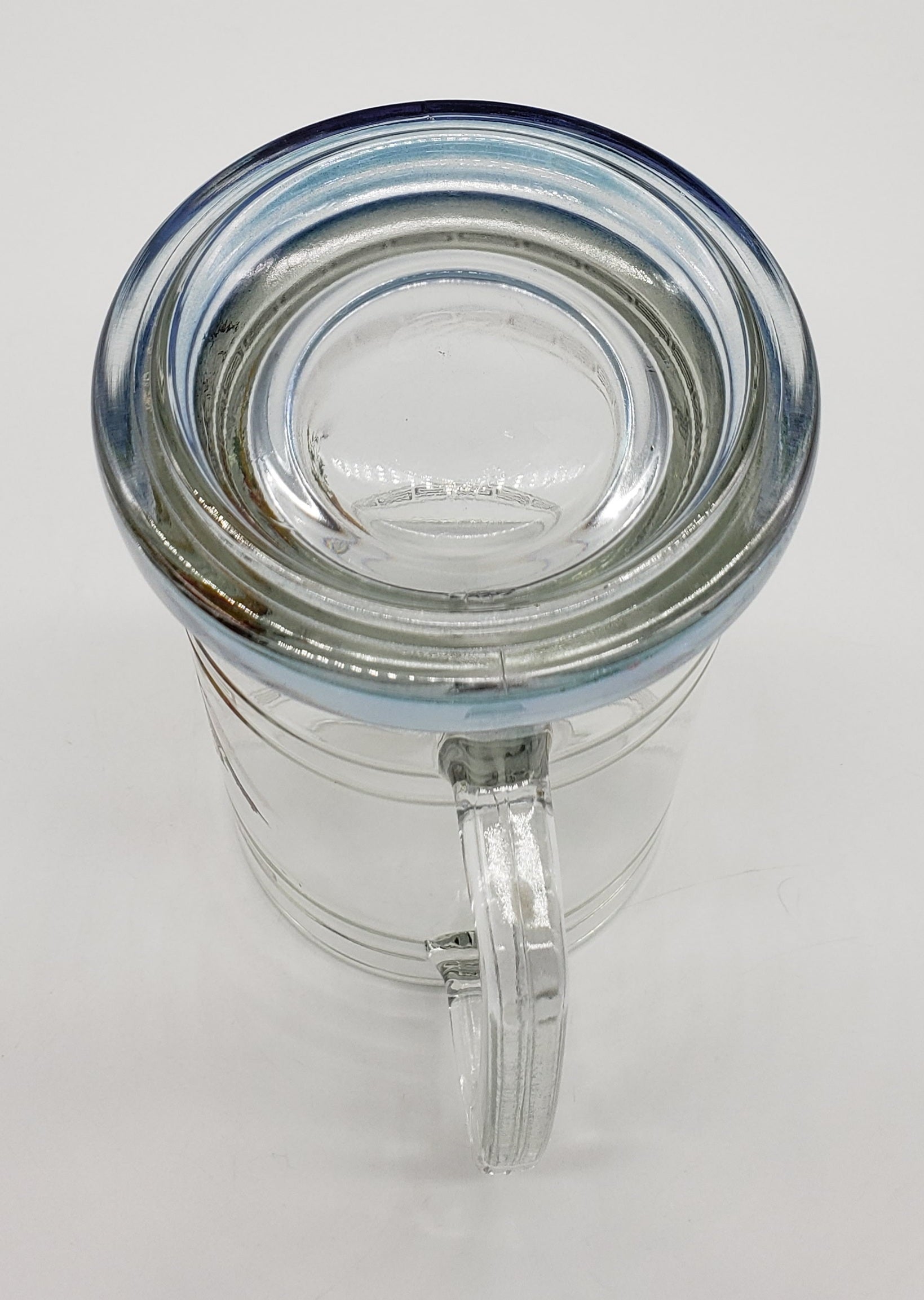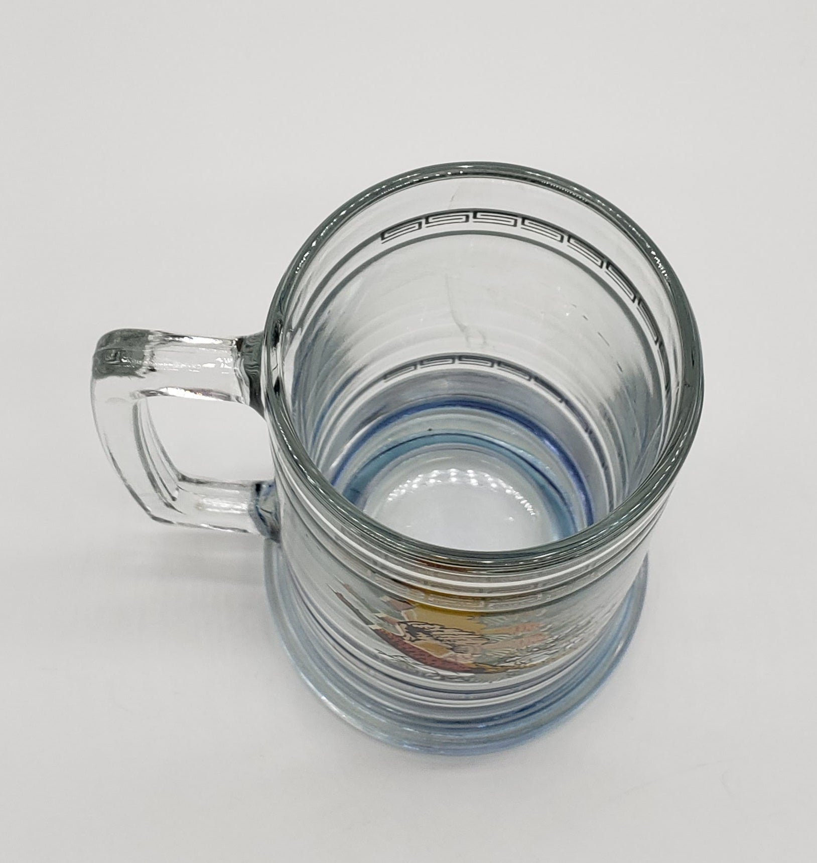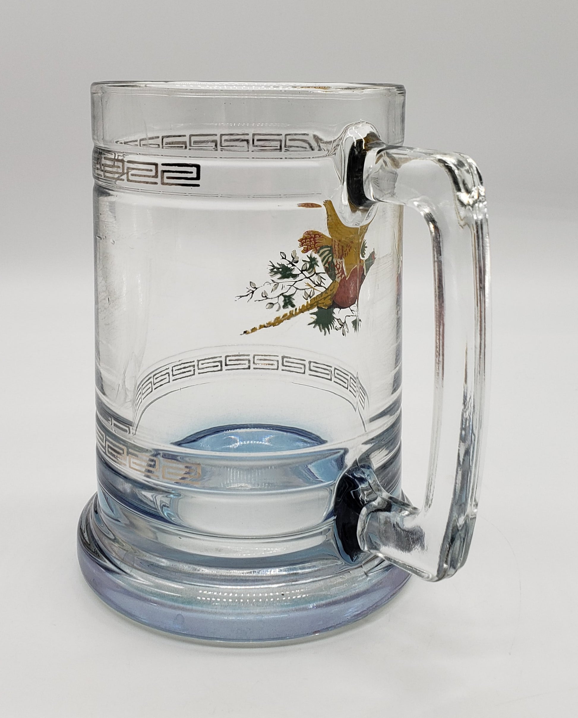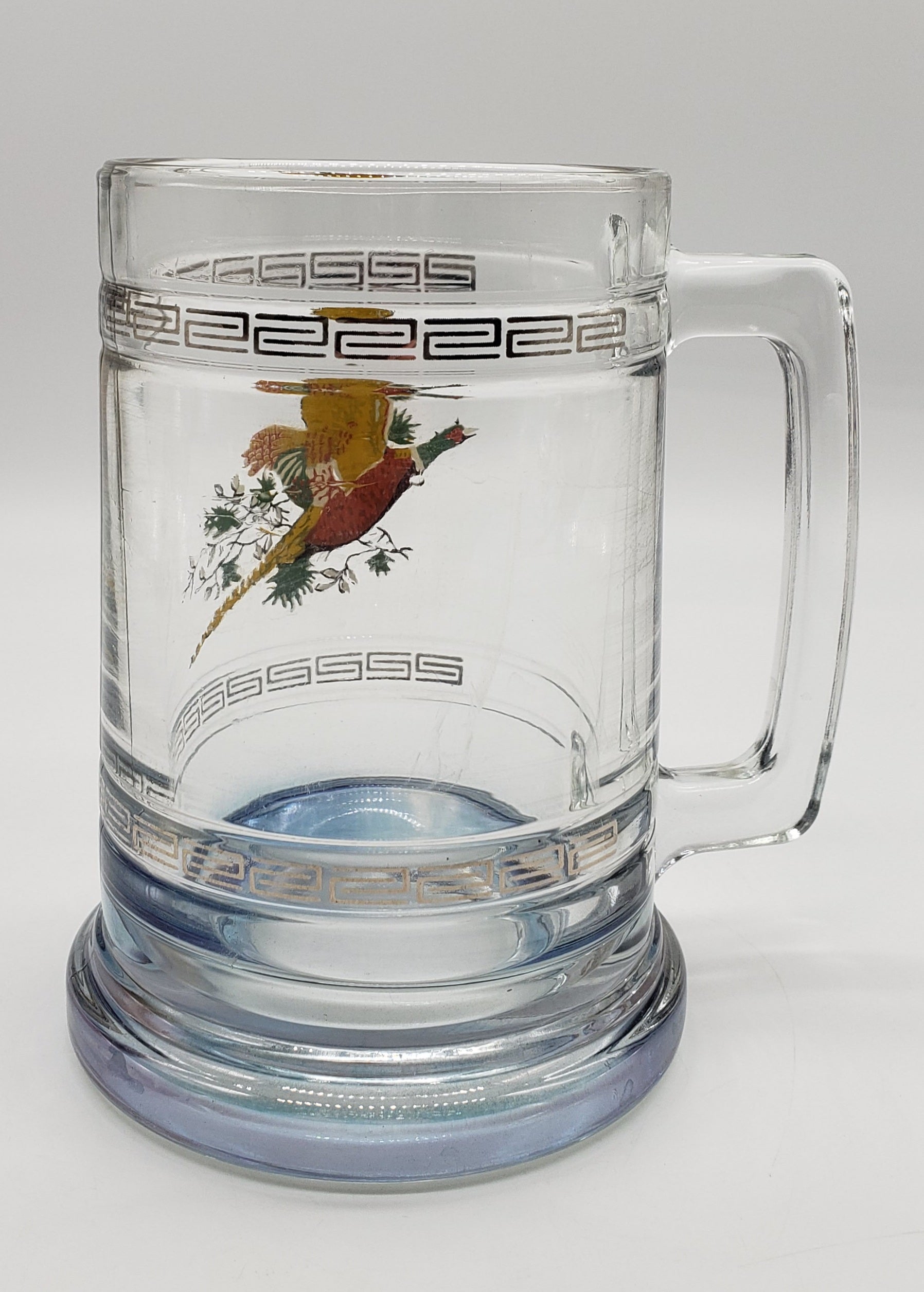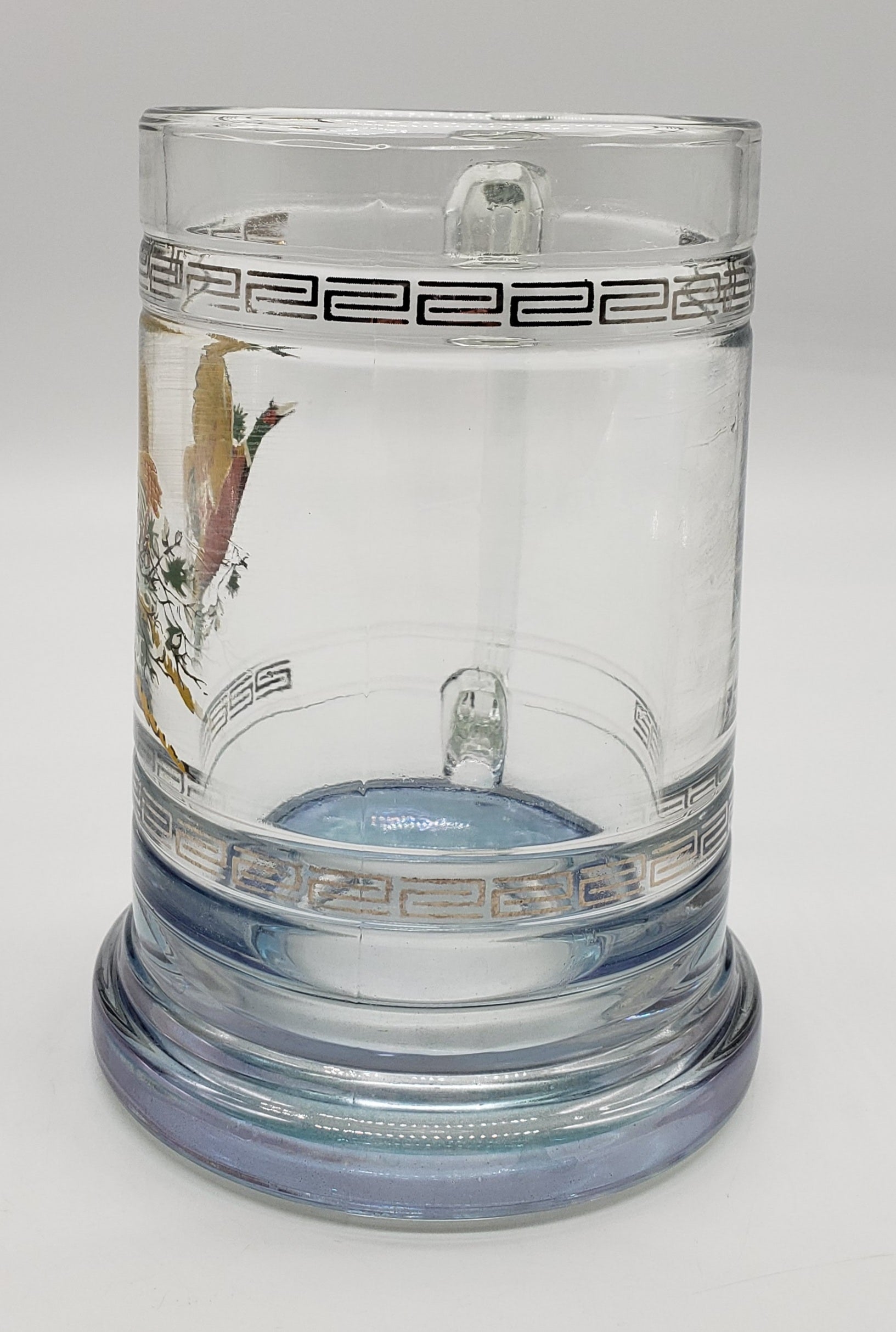 Stunning beer stein with a flying grouse pictured in full color Crystal clear glass with an iridescent band around the bottom that has a rose gold/purple/unicorn hue, depending on what way you view it.