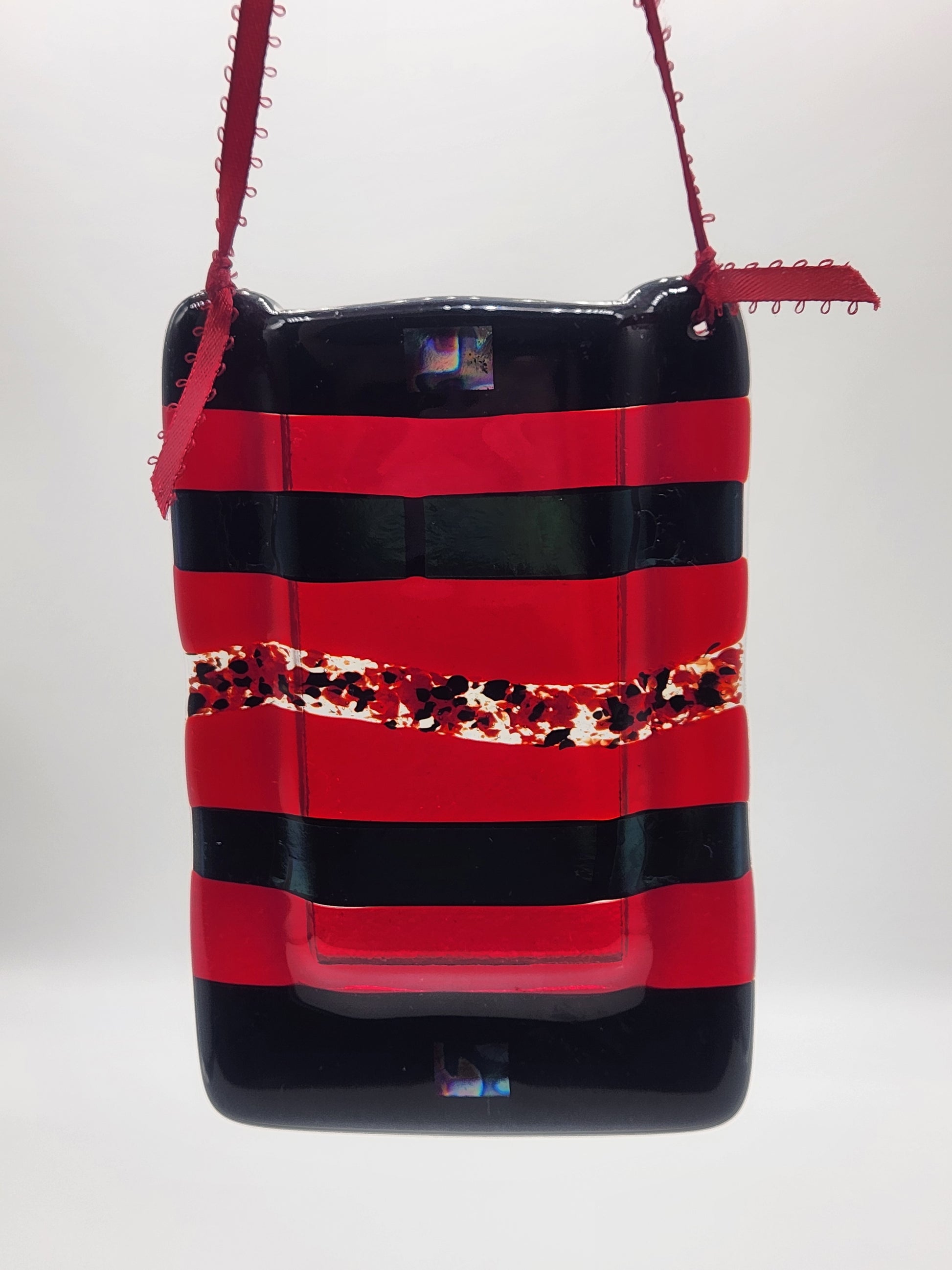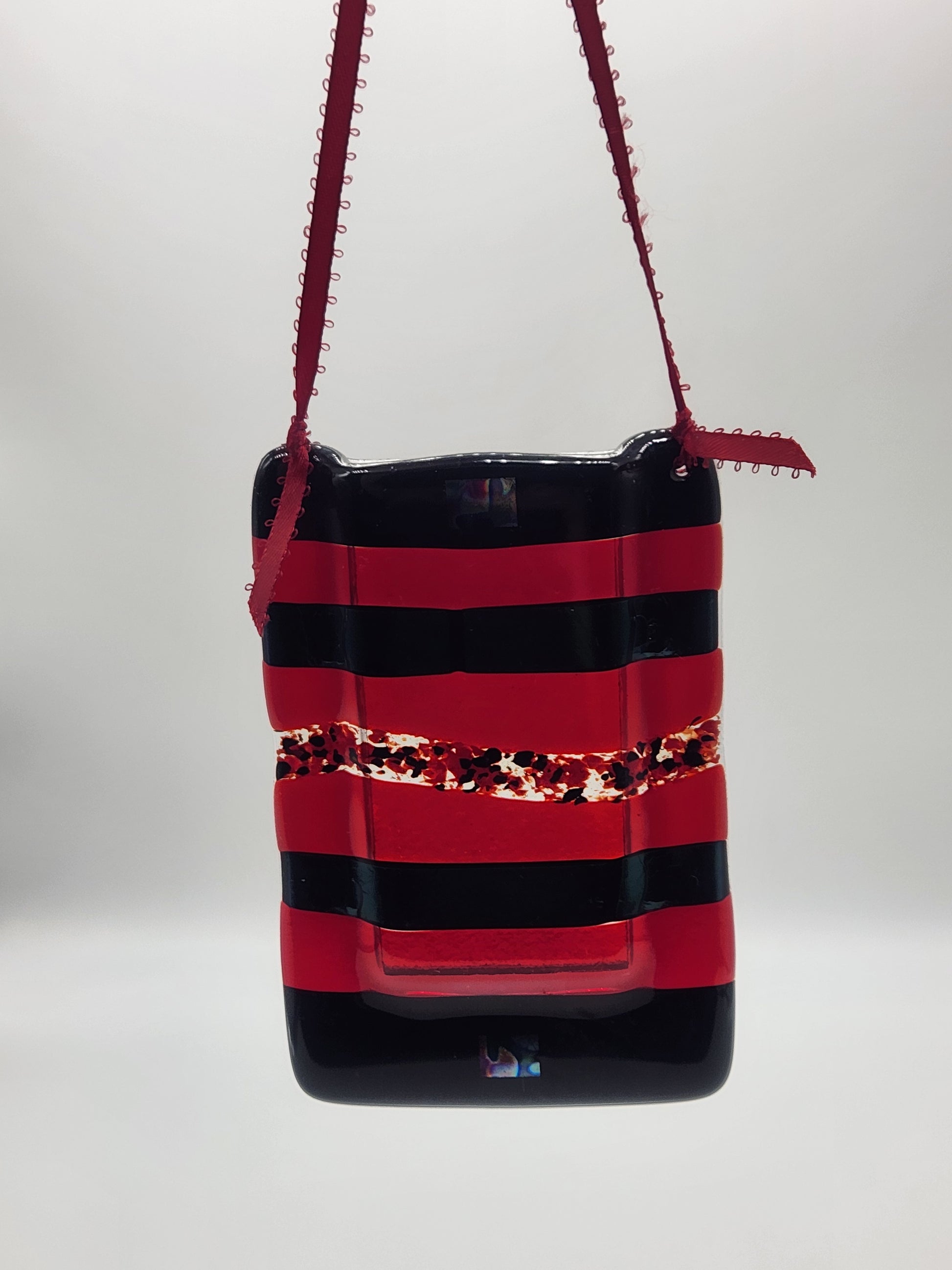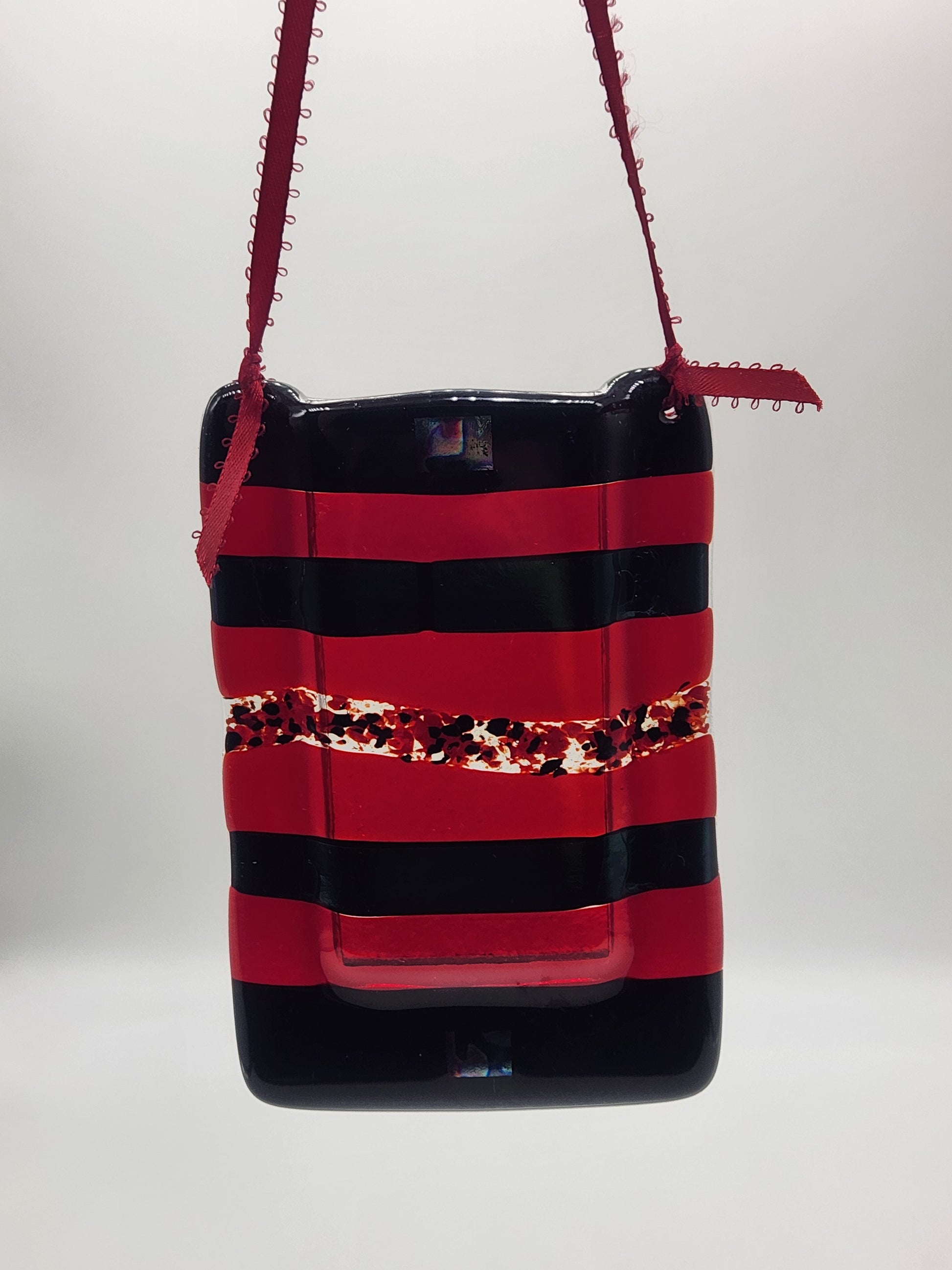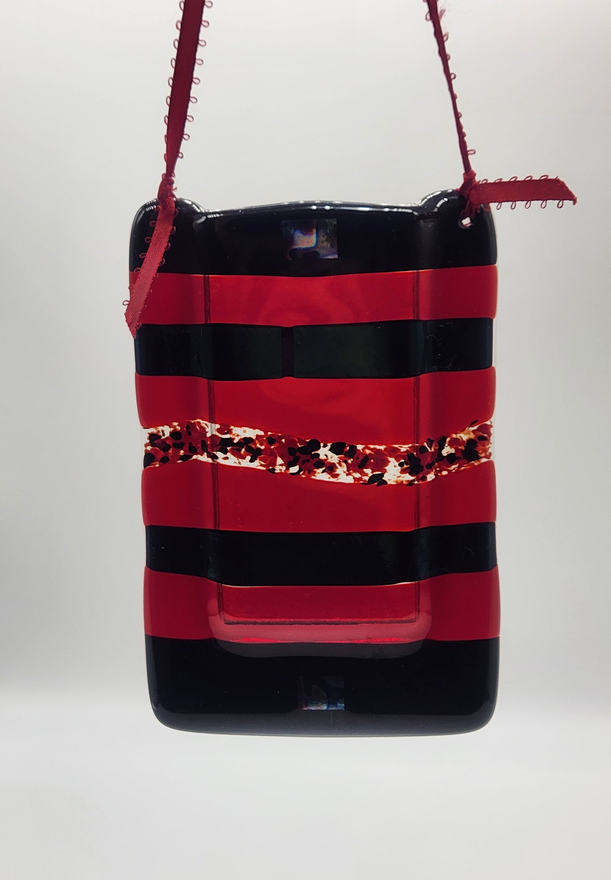 Fused Black & Red Art Glass Hanging Wall Pocket Vase With Ribbon Hanger. Measures approximately 5.5" tall x just under 4" wide.