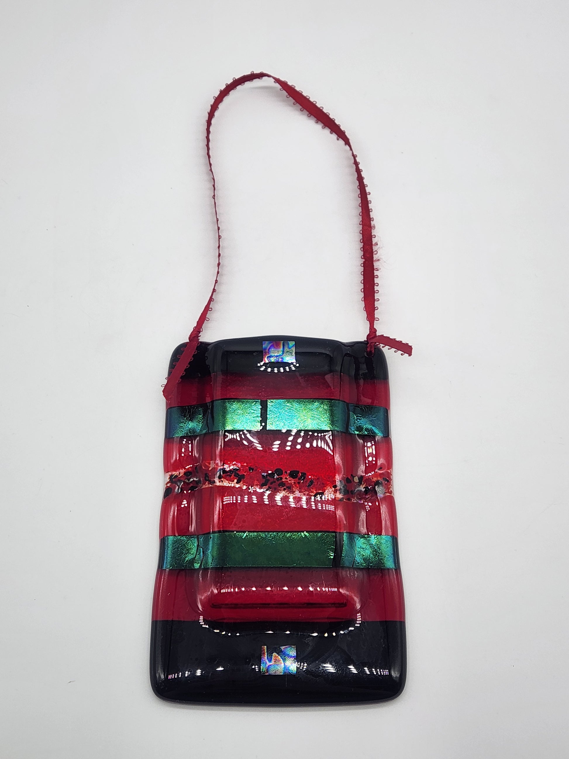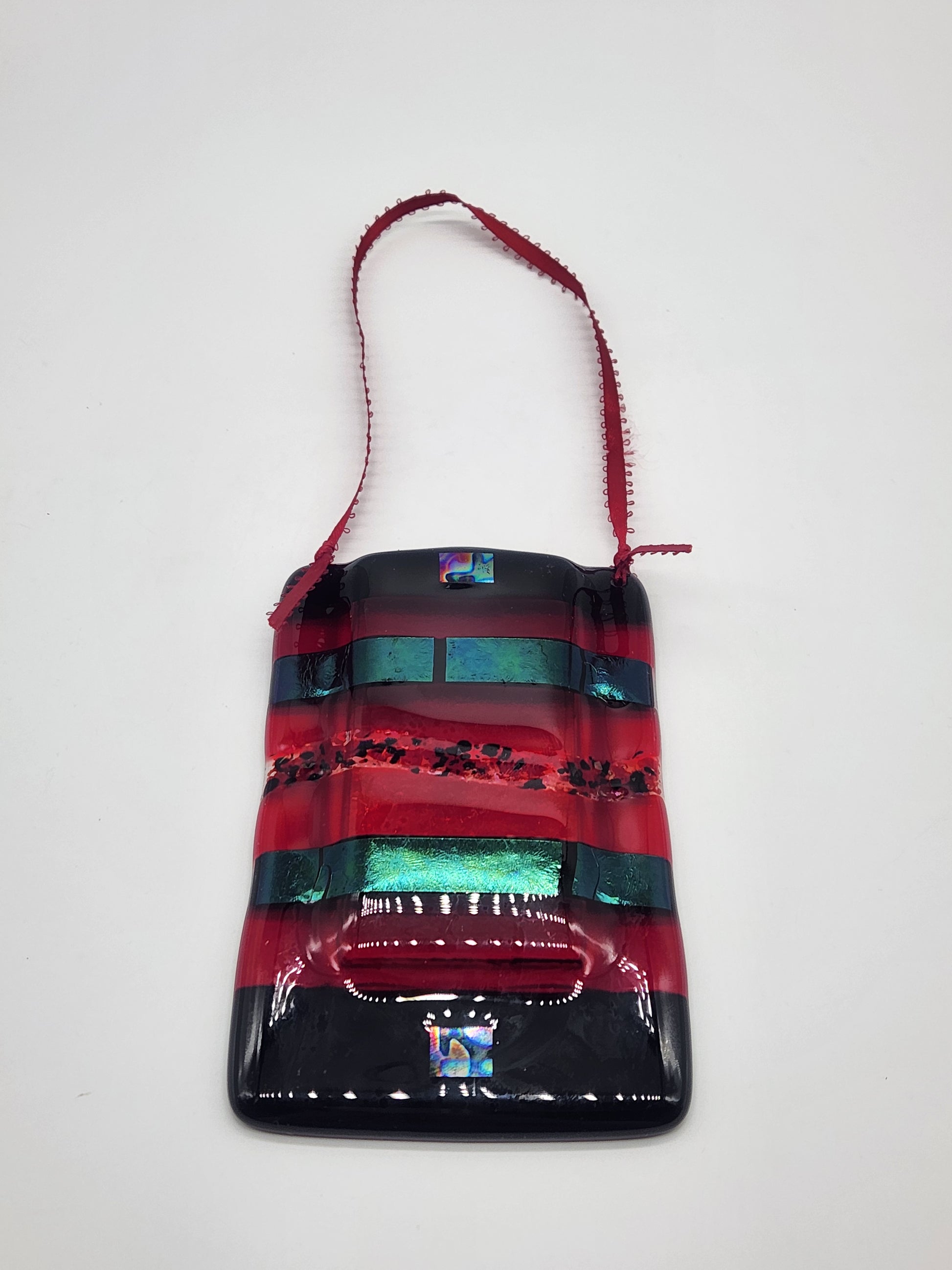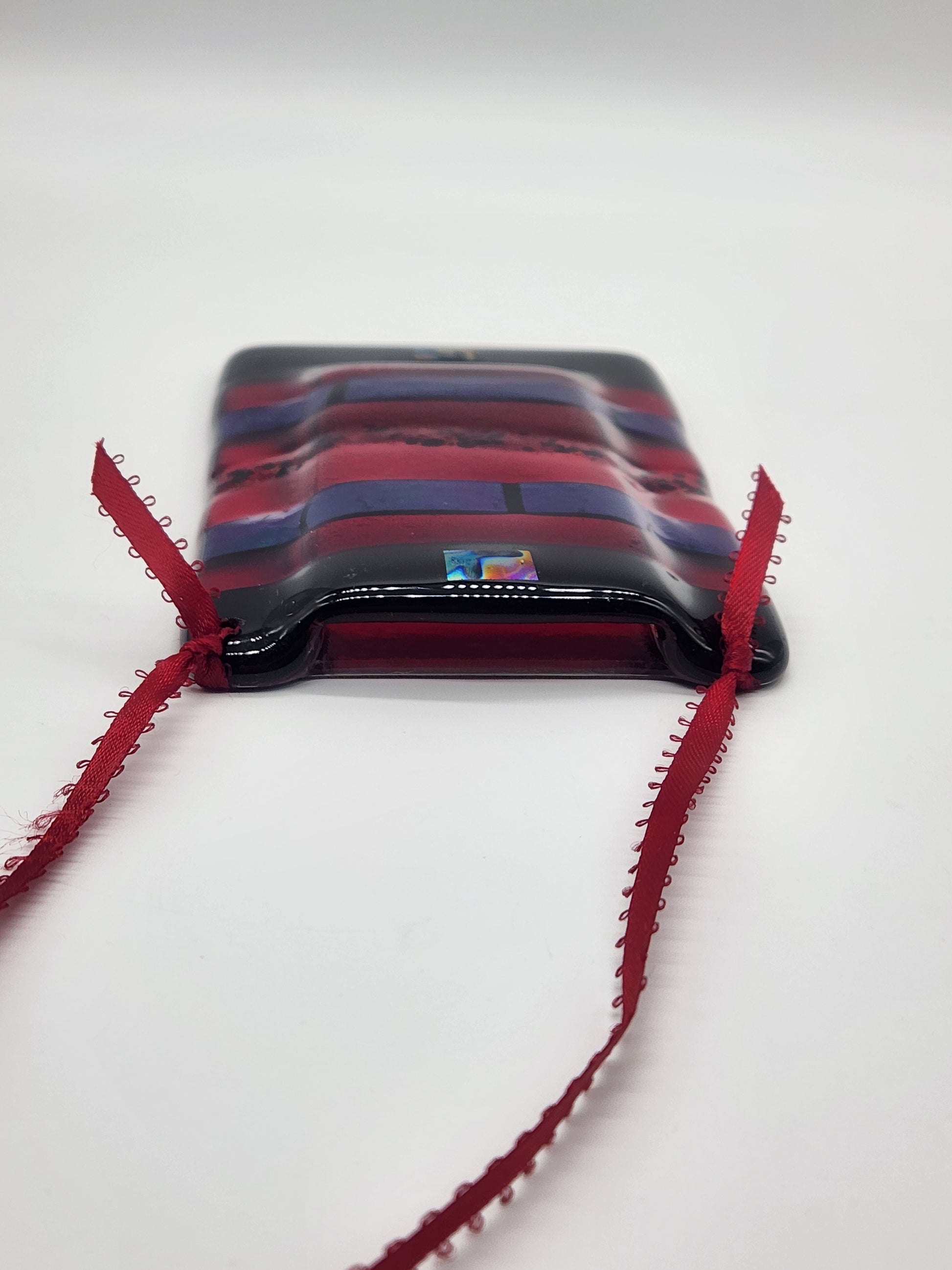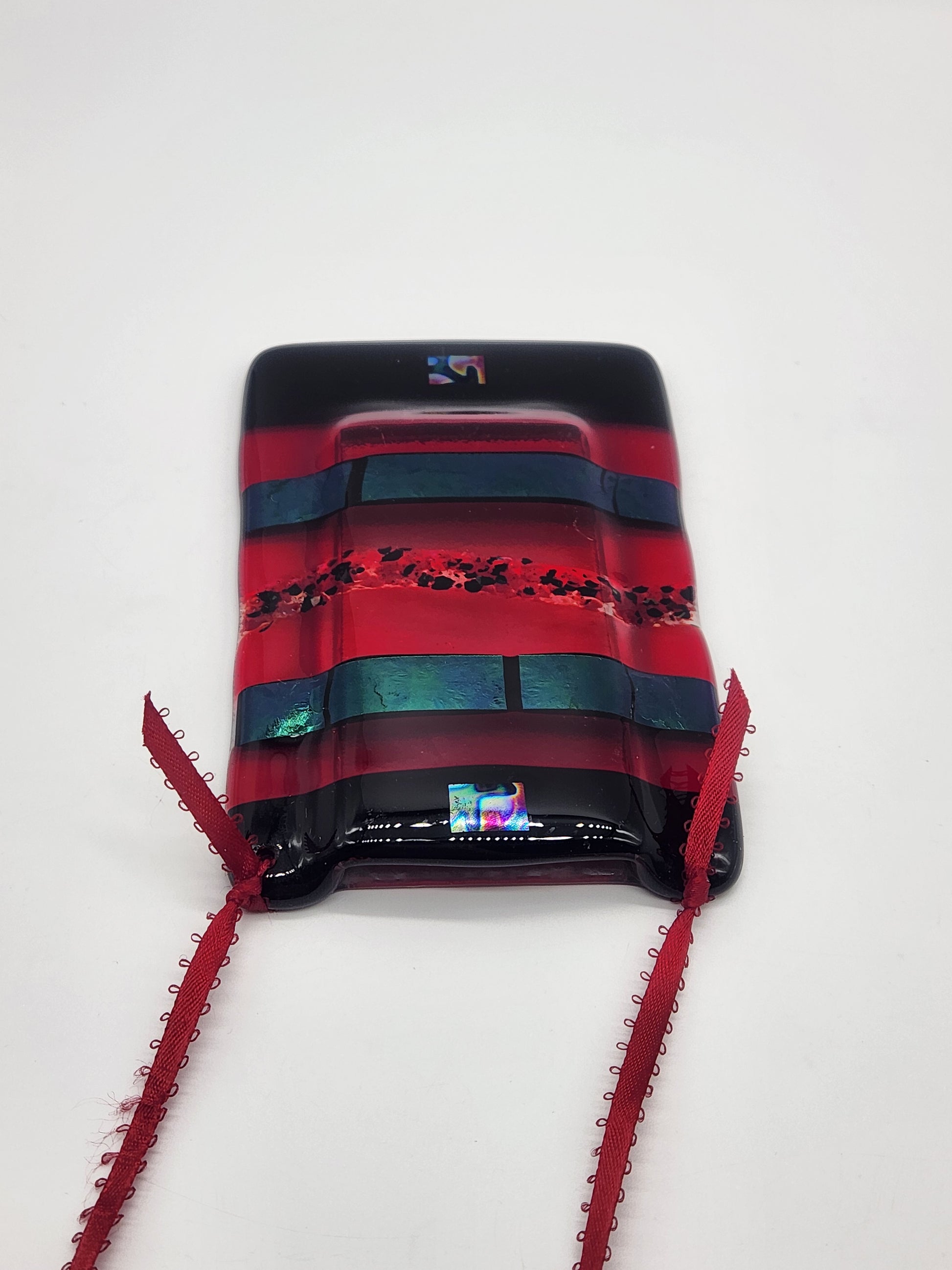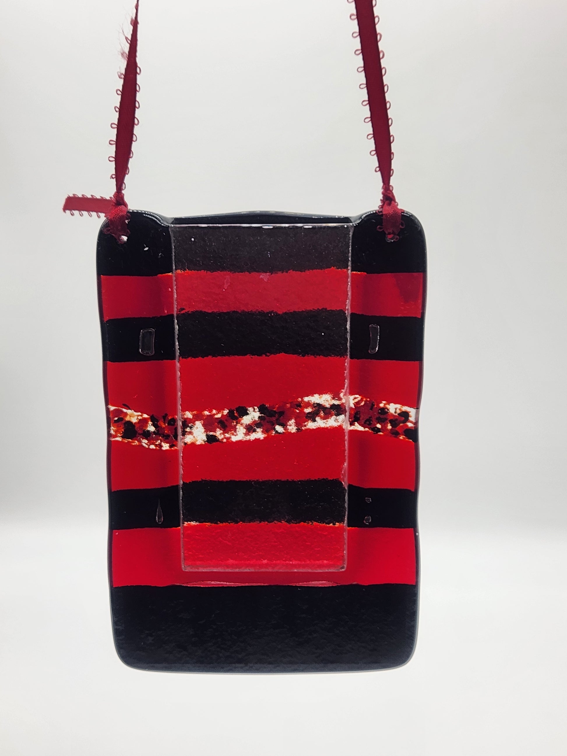 Fused Black & Red Art Glass Hanging Wall Pocket Vase With Ribbon Hanger. Measures approximately 5.5" tall x just under 4" wide.