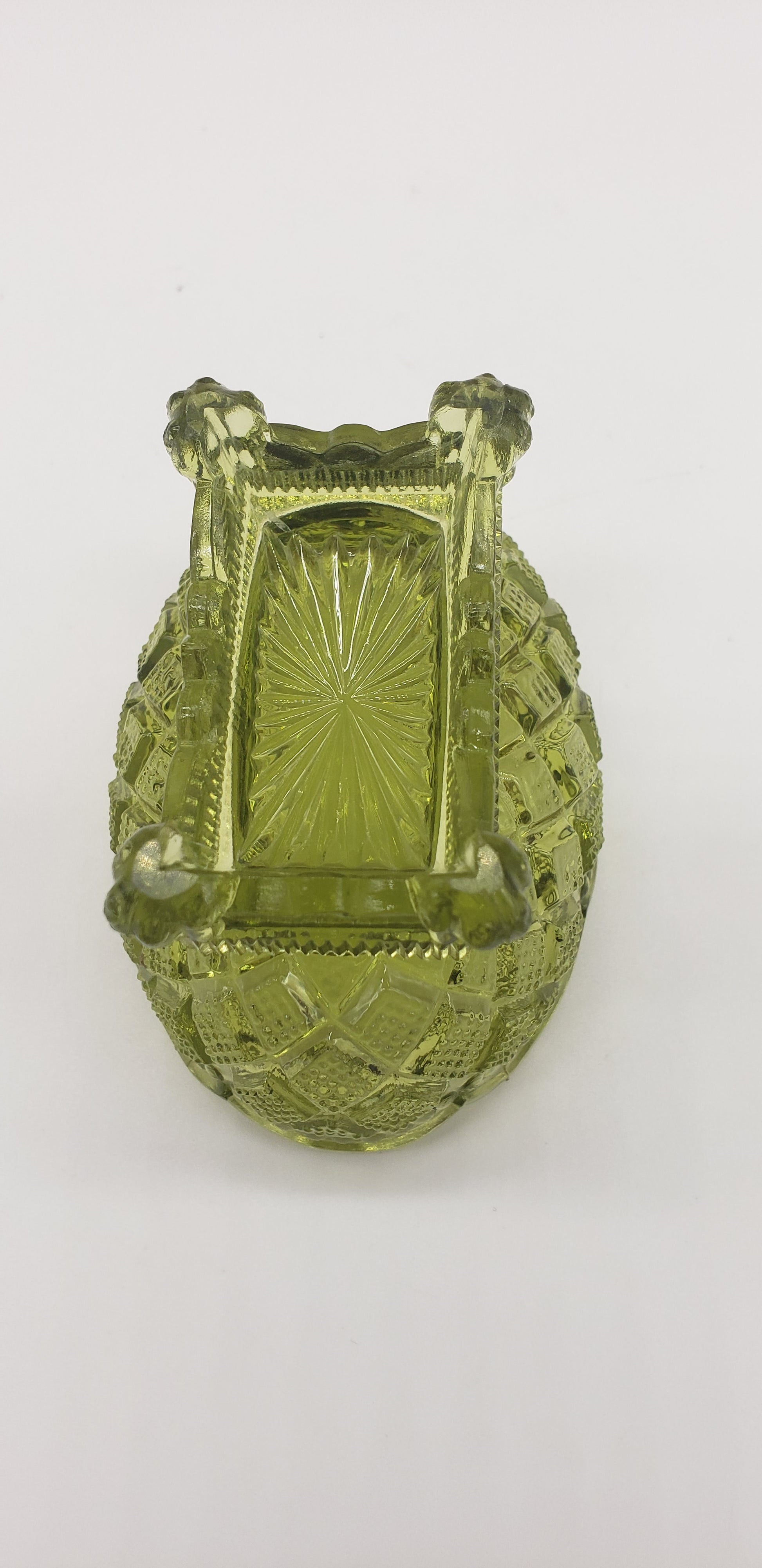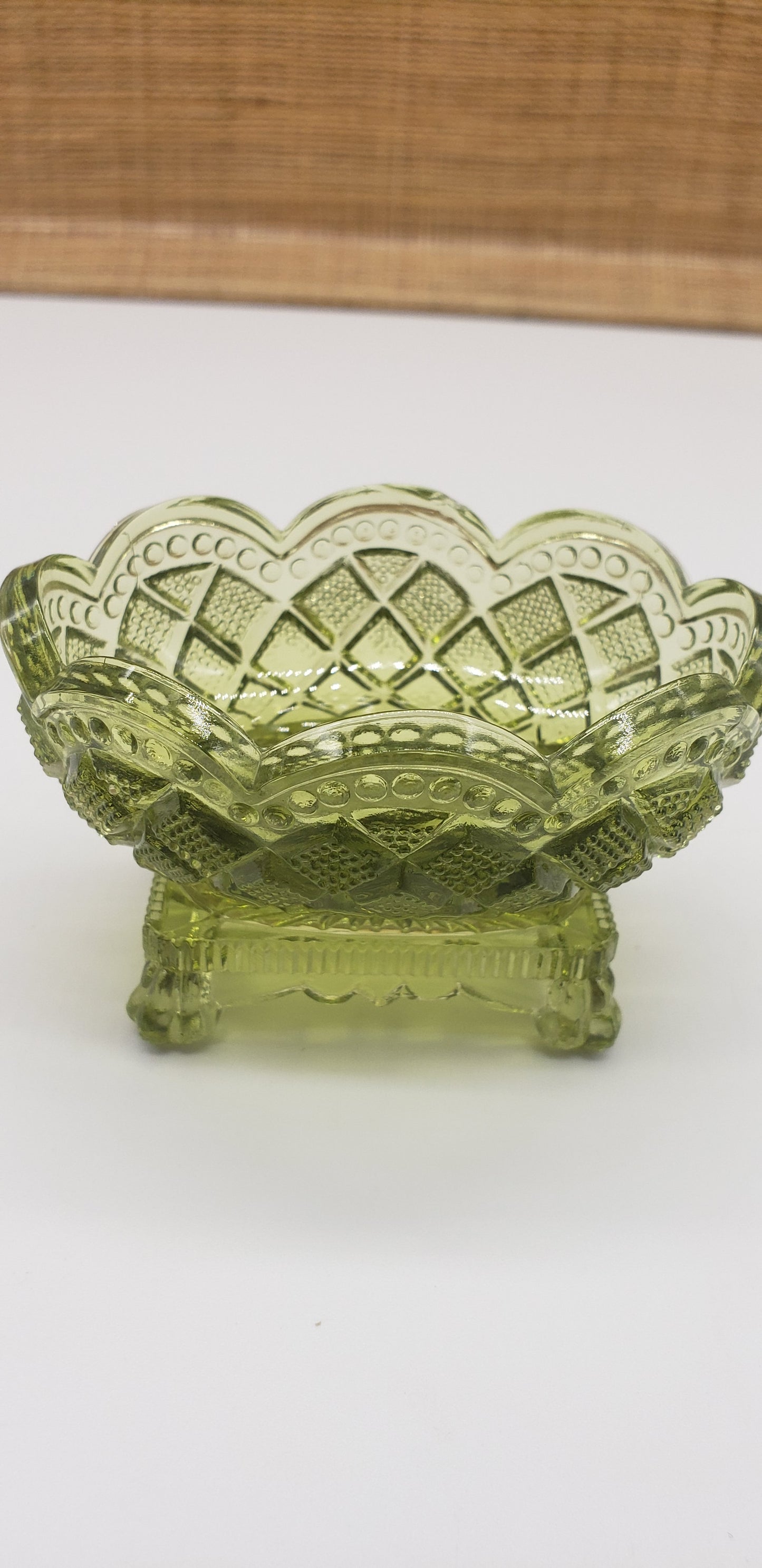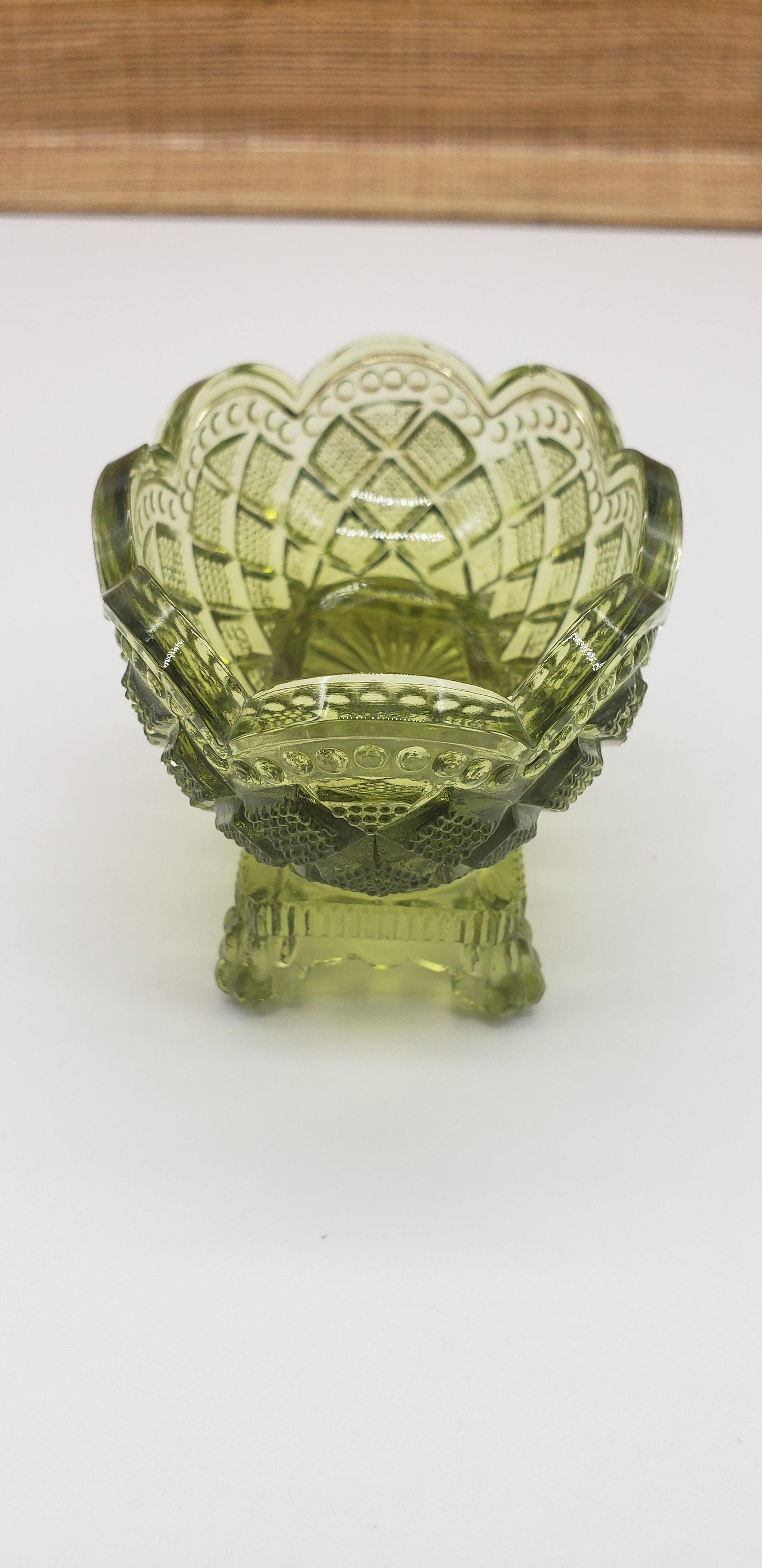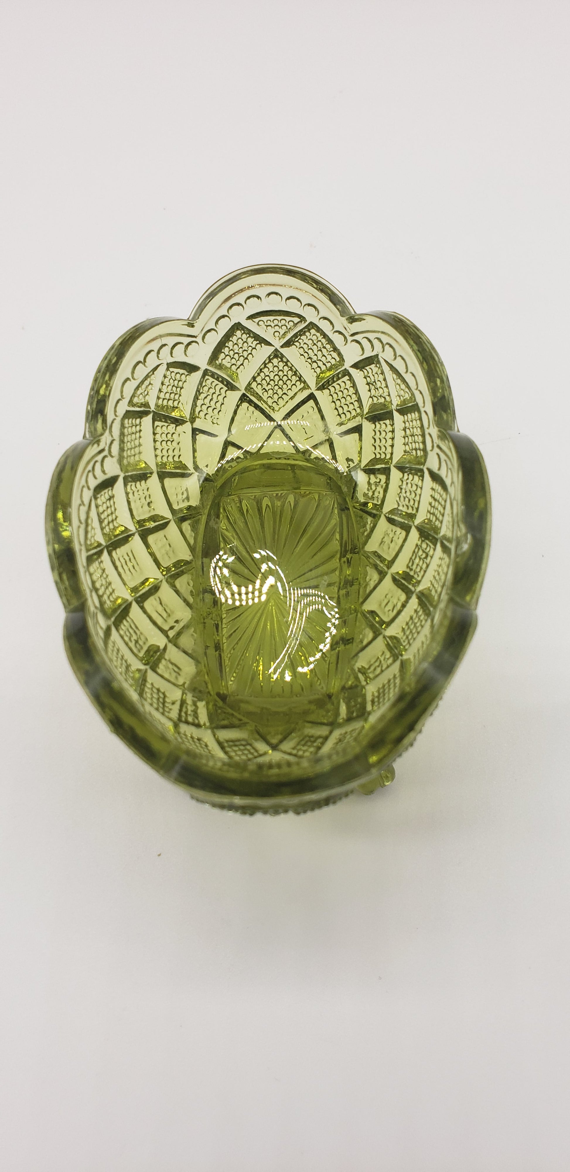 Green glass oval salt dip cellar diamond cut pattern.