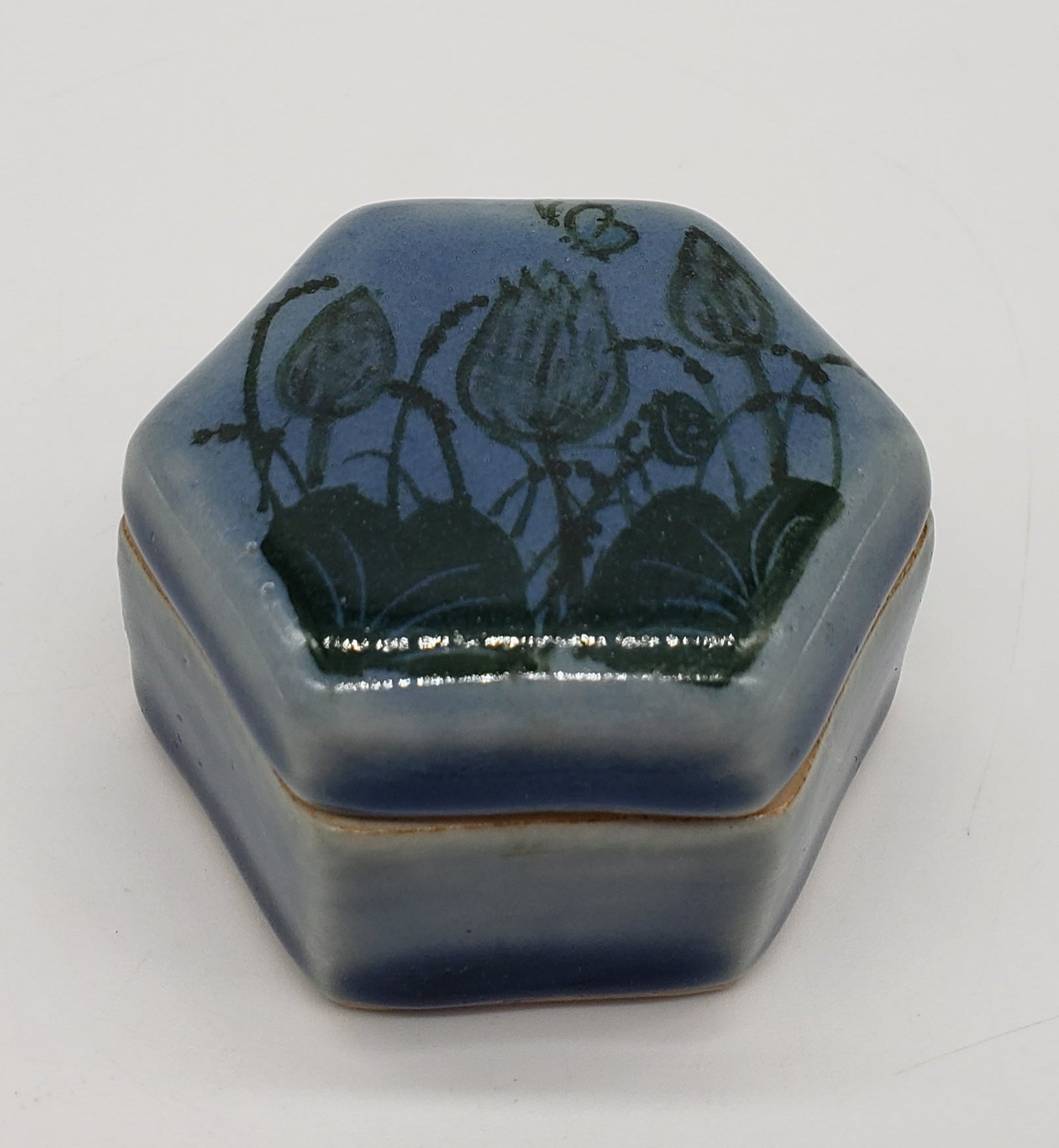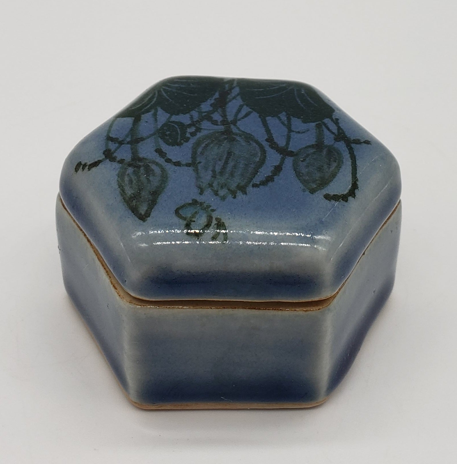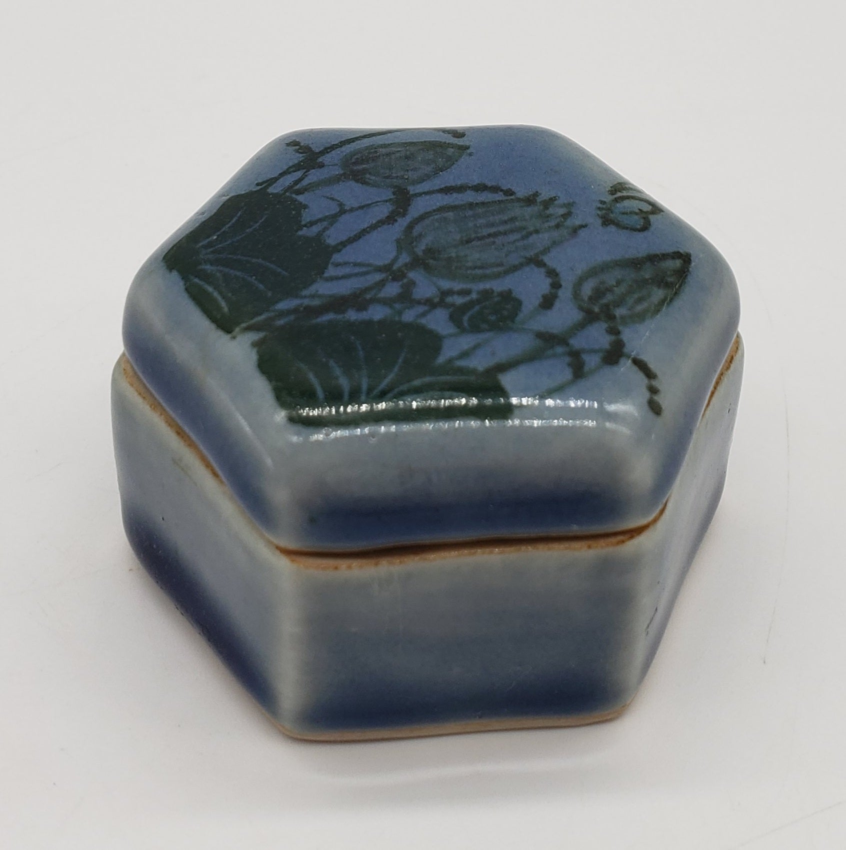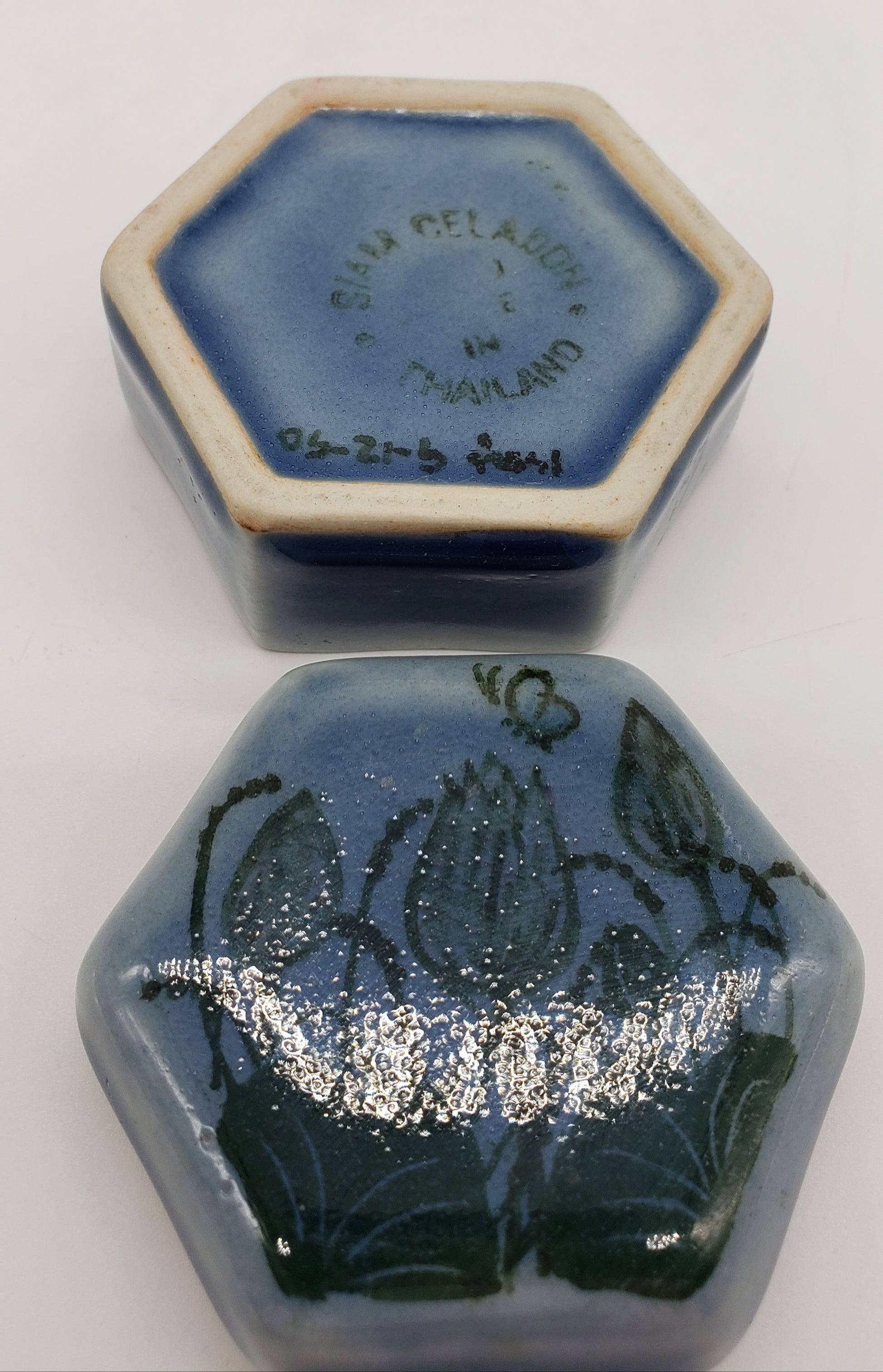 Vintage Hexagon Lidded Porcelain Trinket Box, marked "Hand Painted in Thailand" featuring a blue flower design