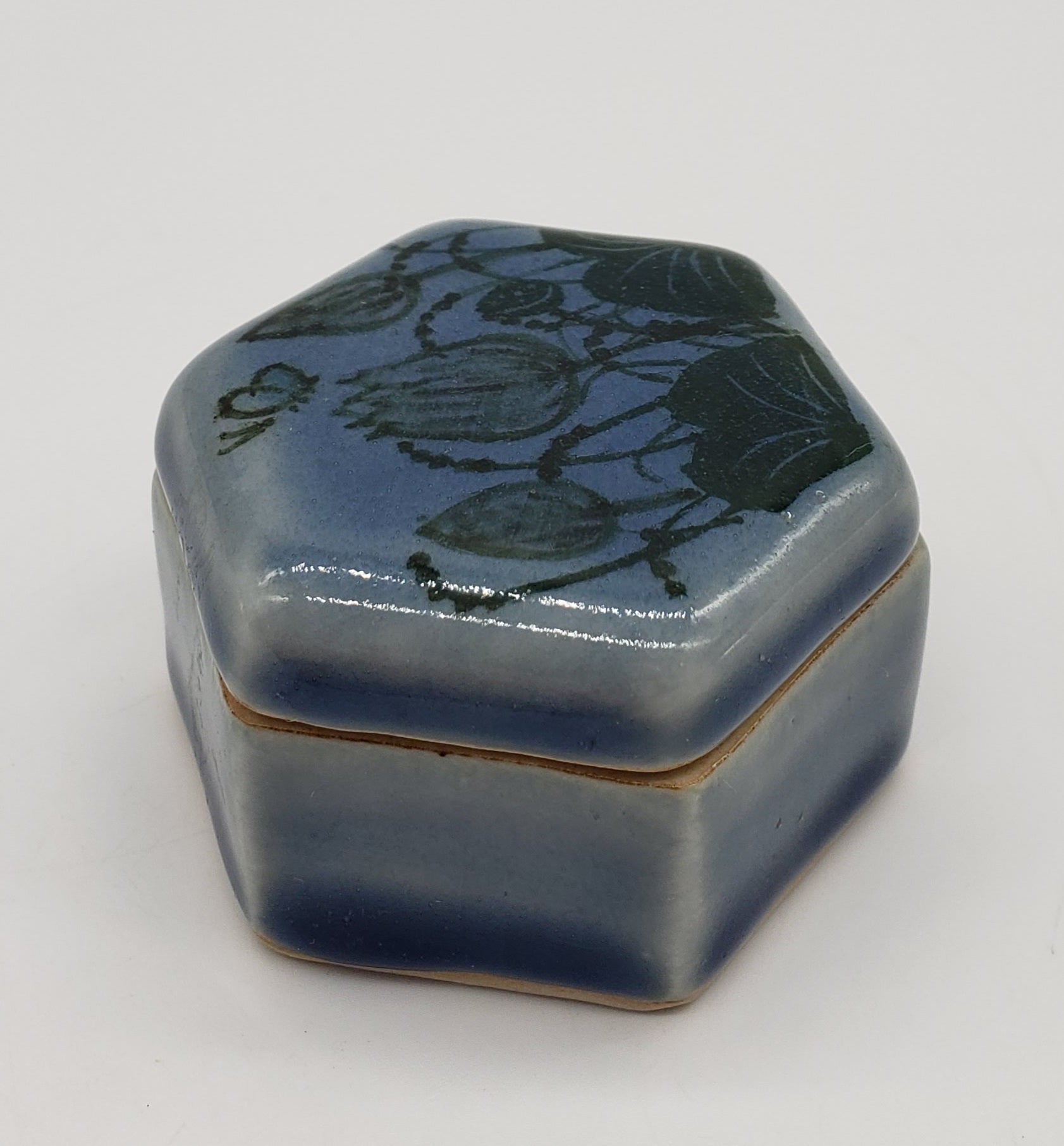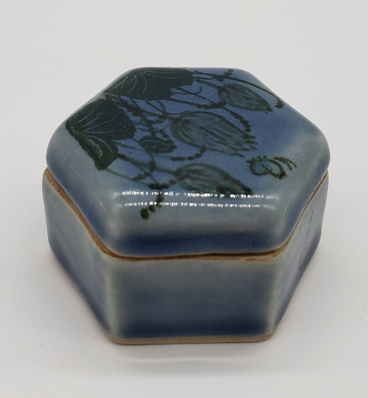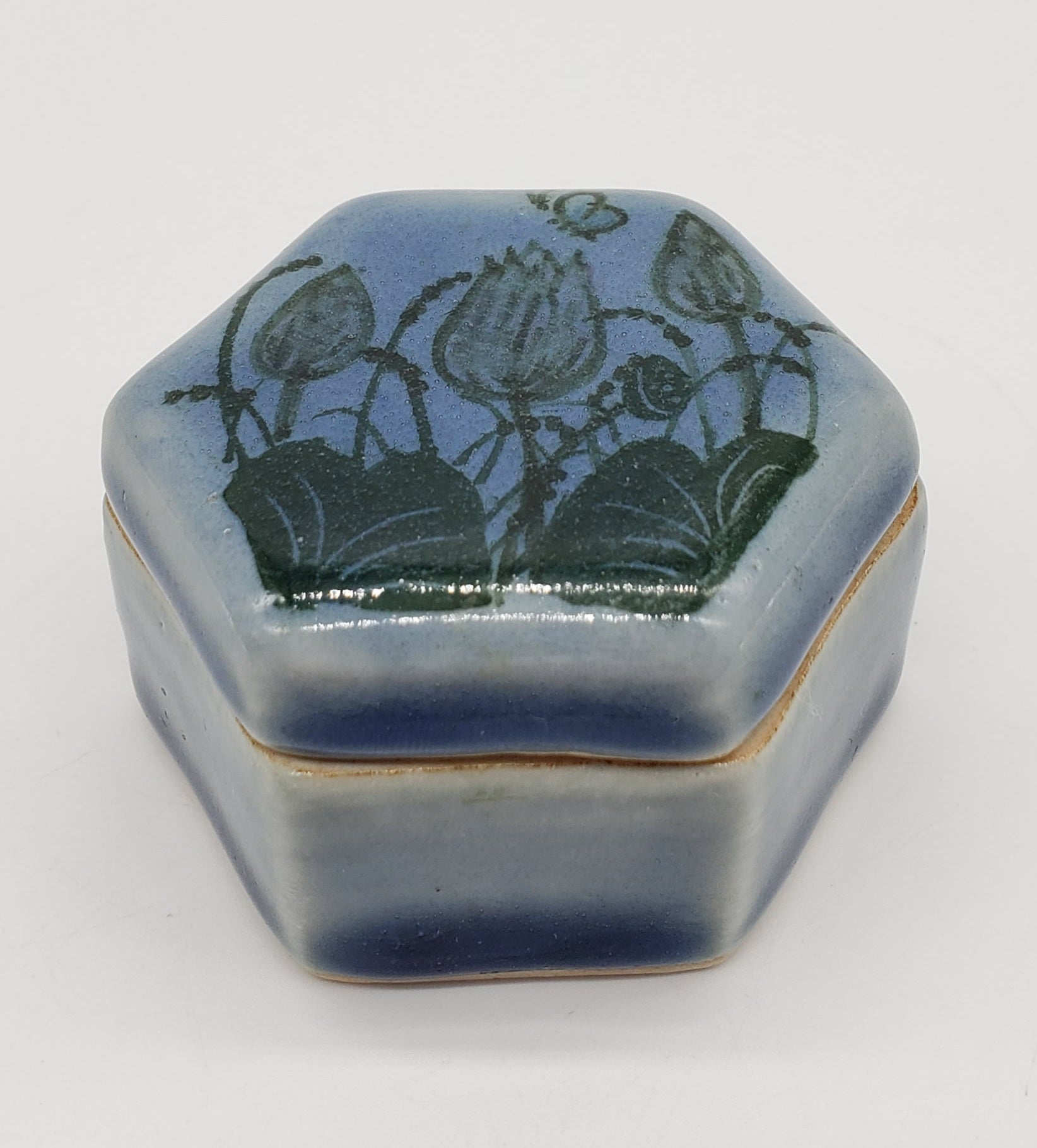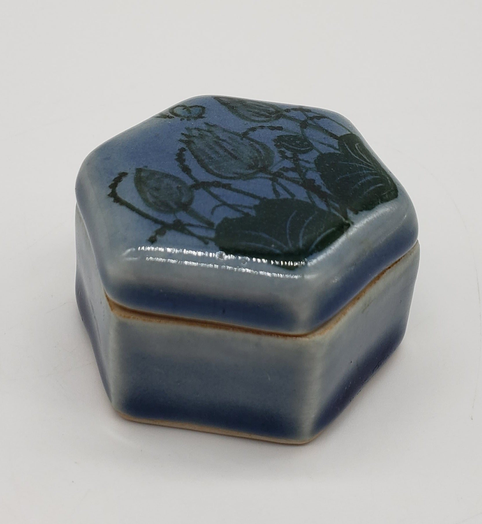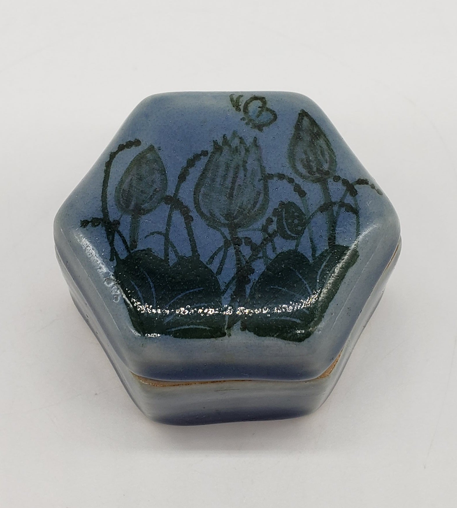 Vintage Hexagon Lidded Porcelain Trinket Box, marked "Hand Painted in Thailand" featuring a blue flower design