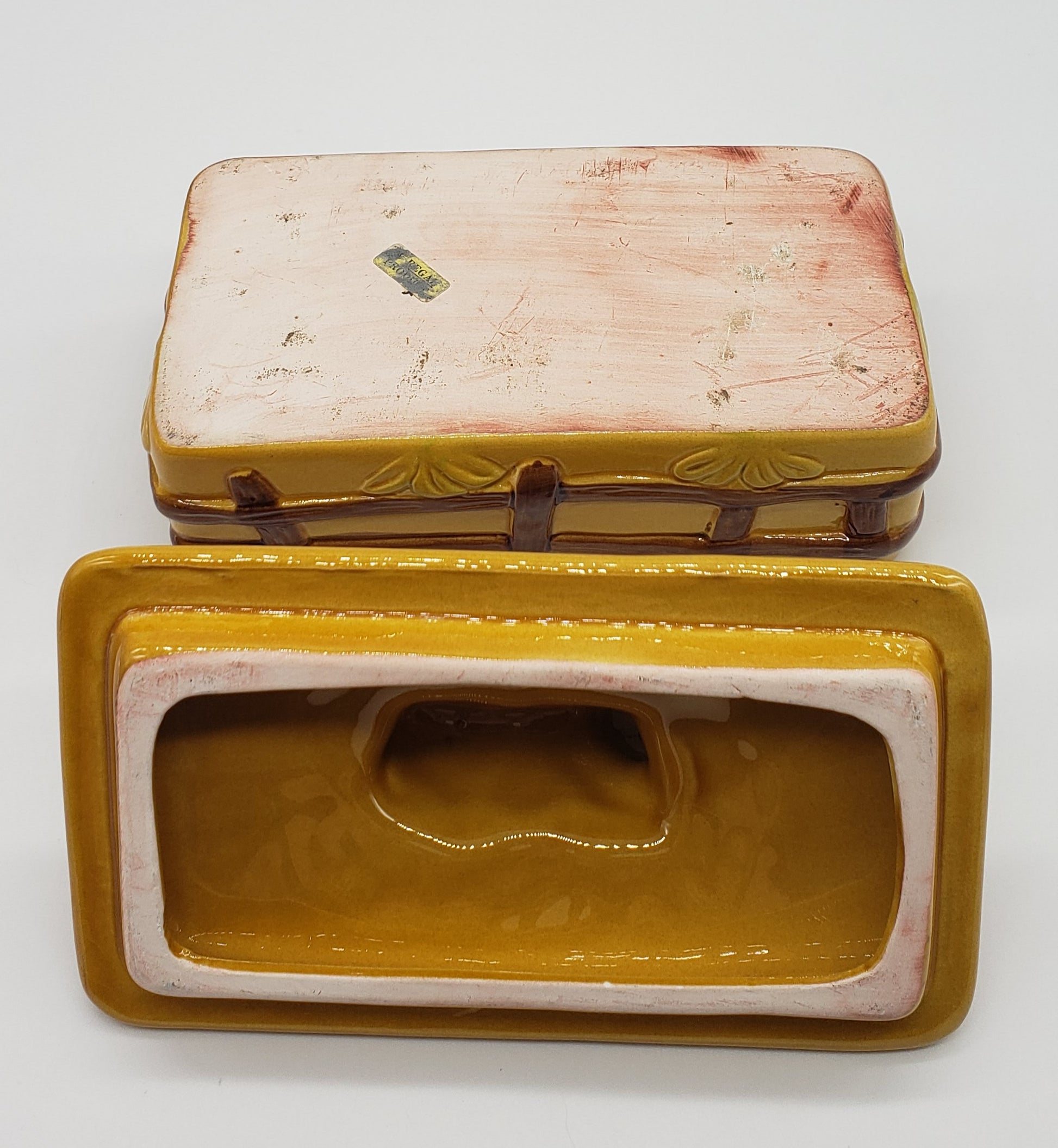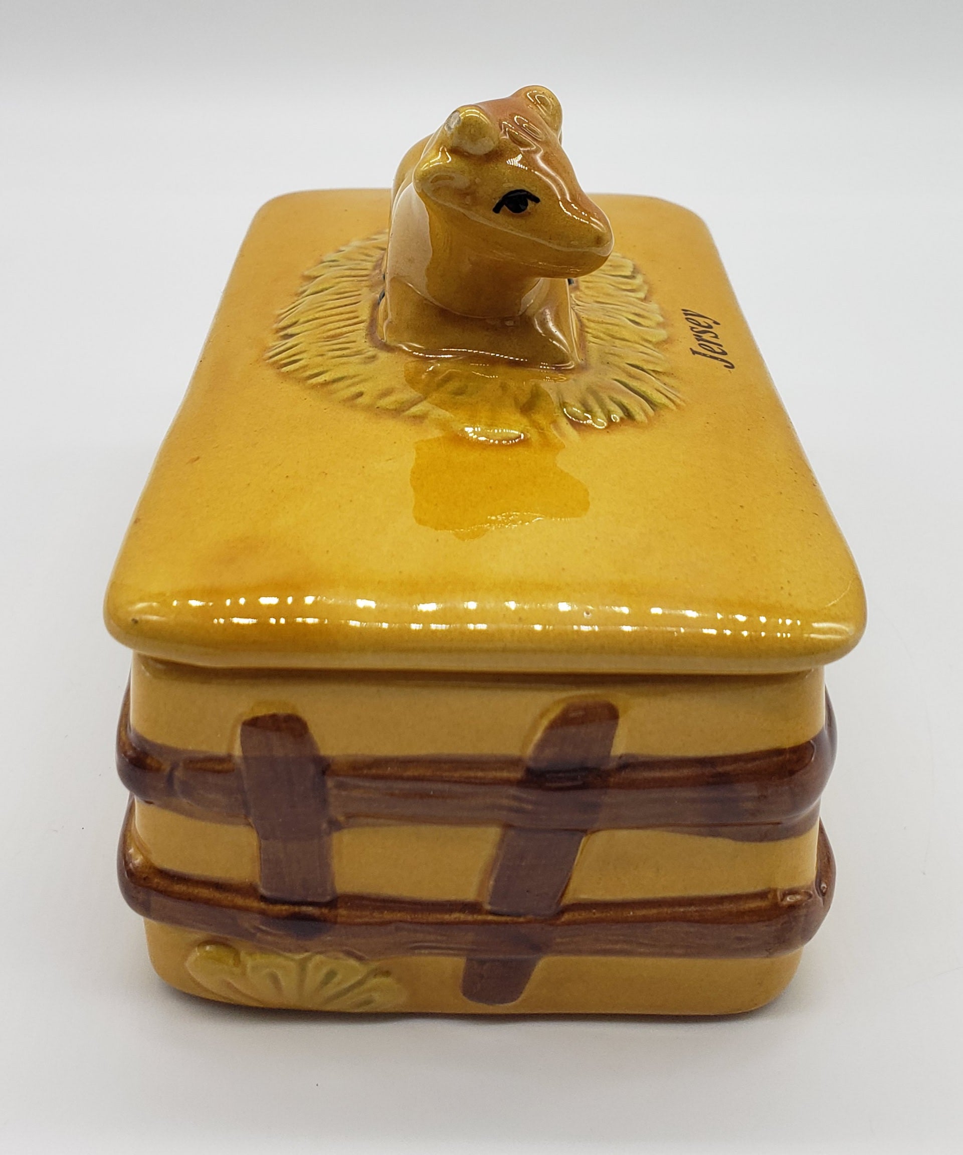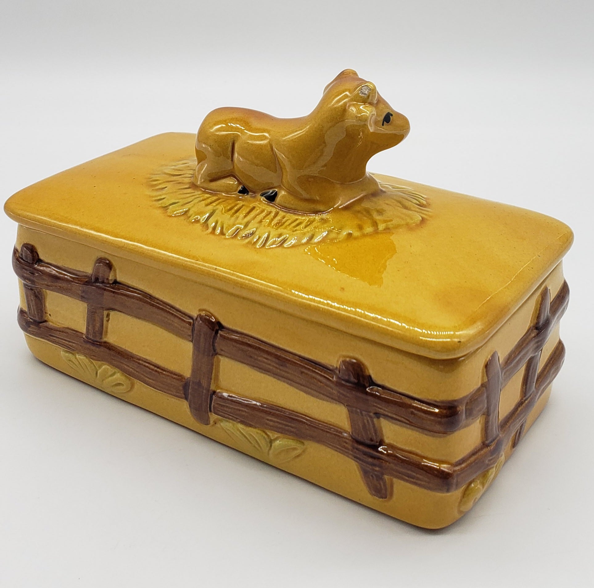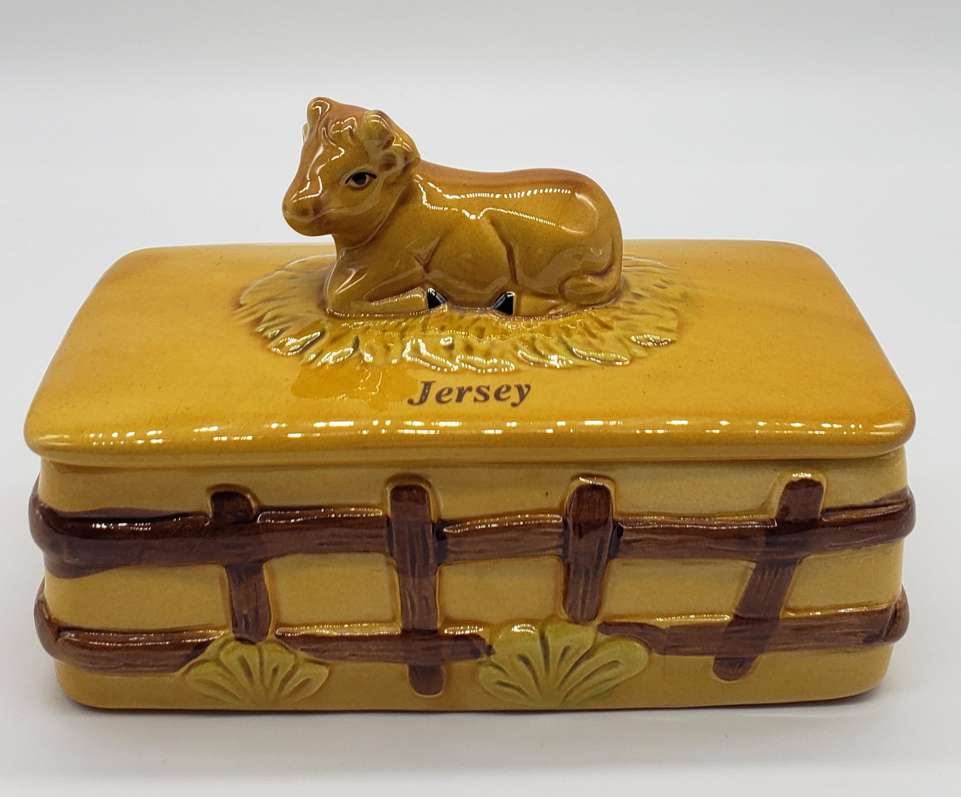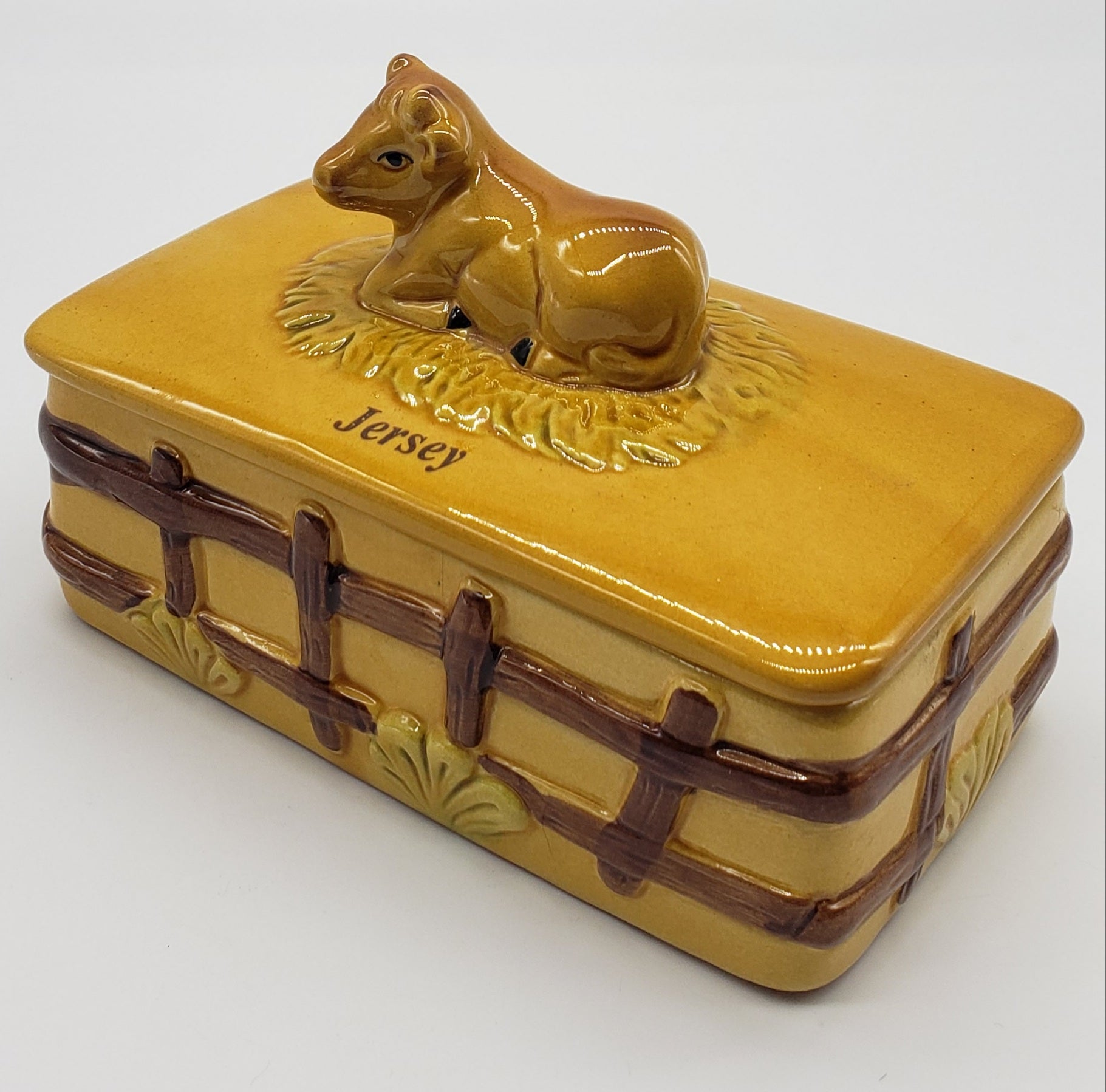 A Charming Vintage collectable Square Jersey Cow Ceramic Butter Dish With Lid. Small chip behind right horn.