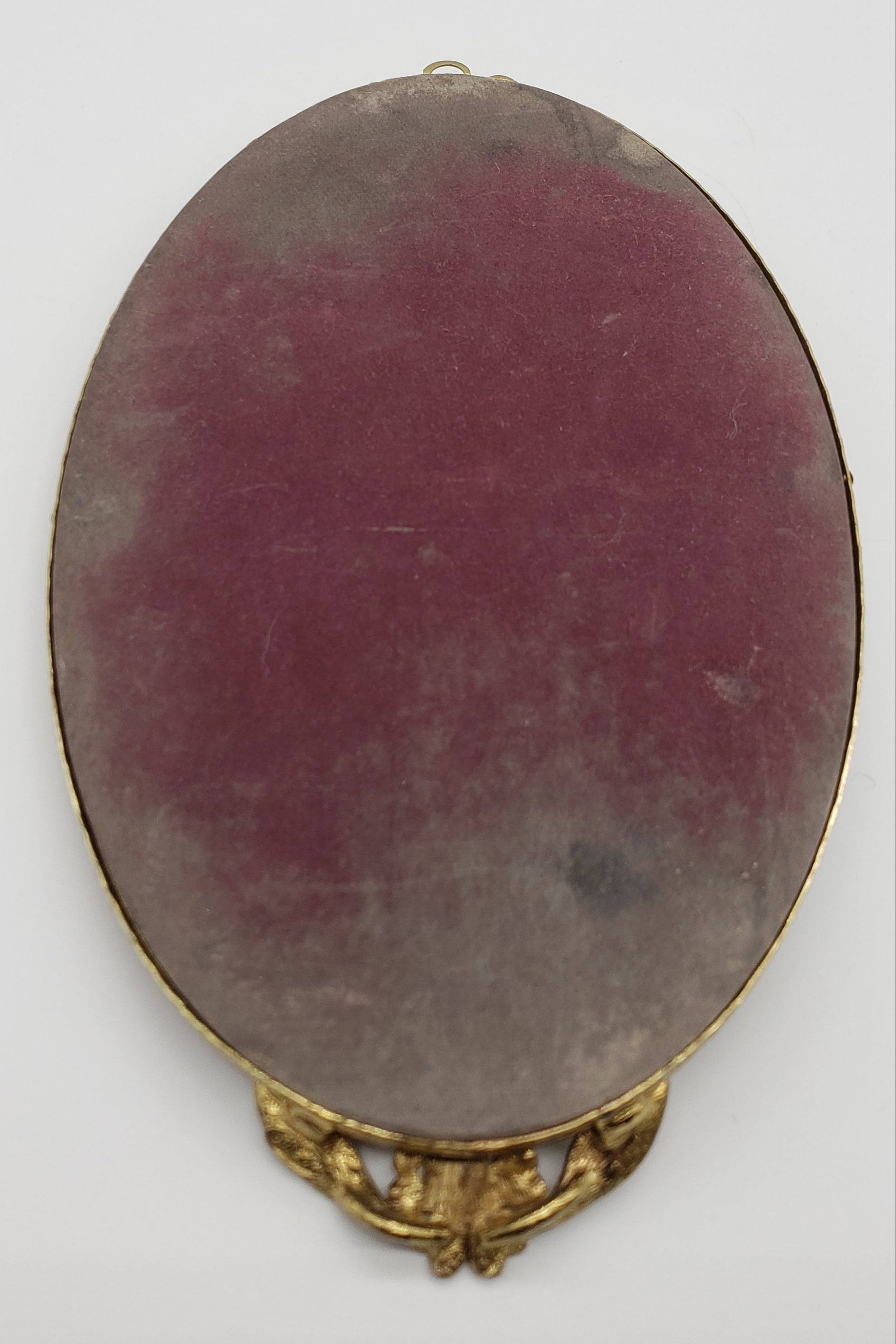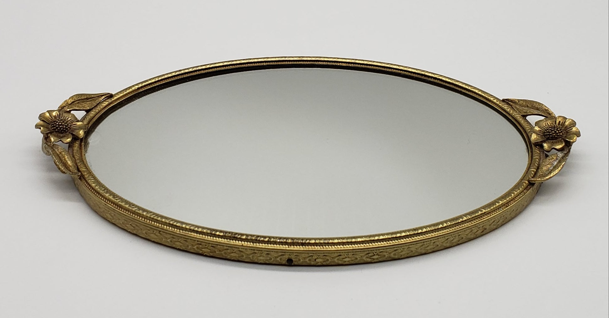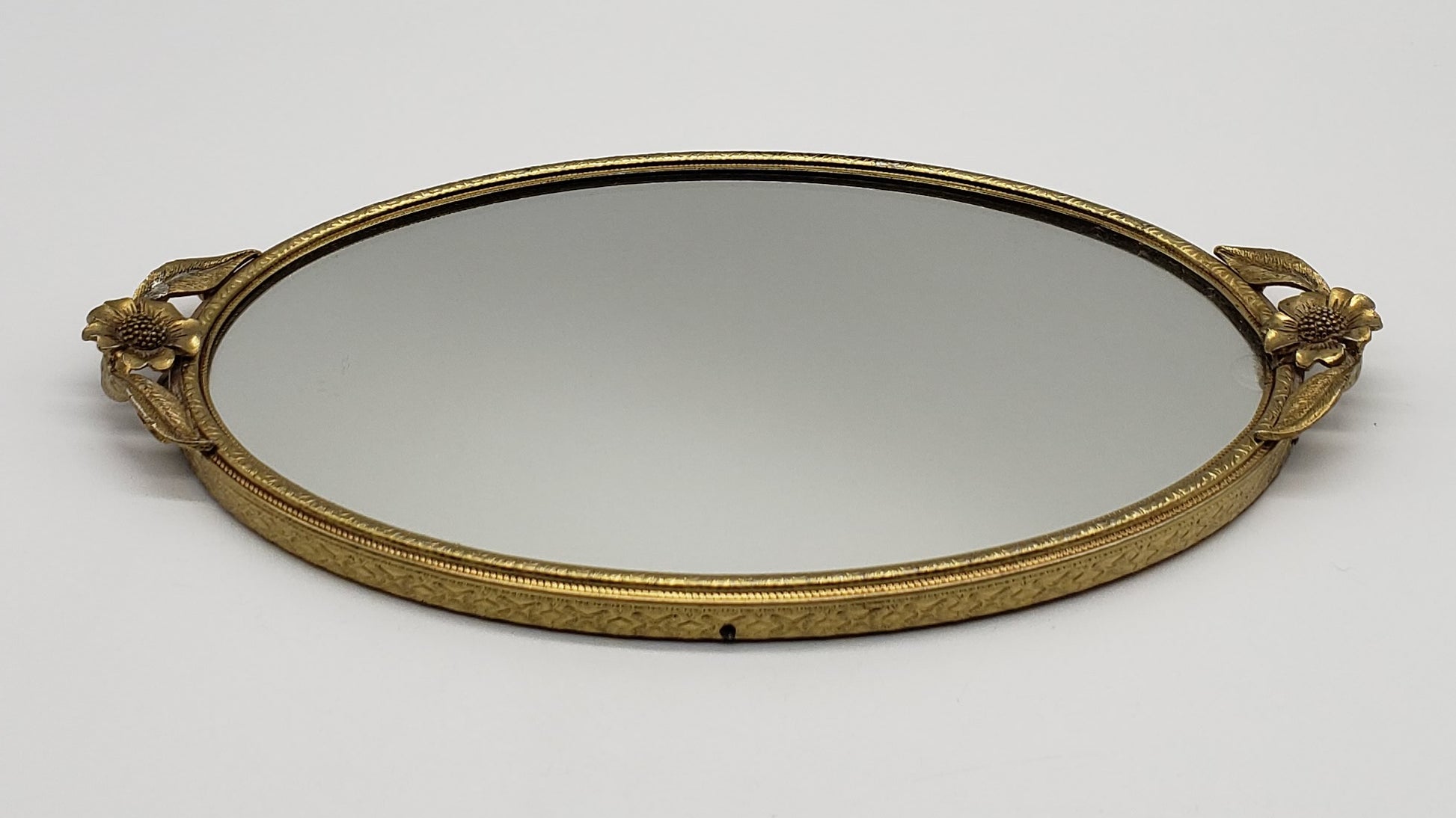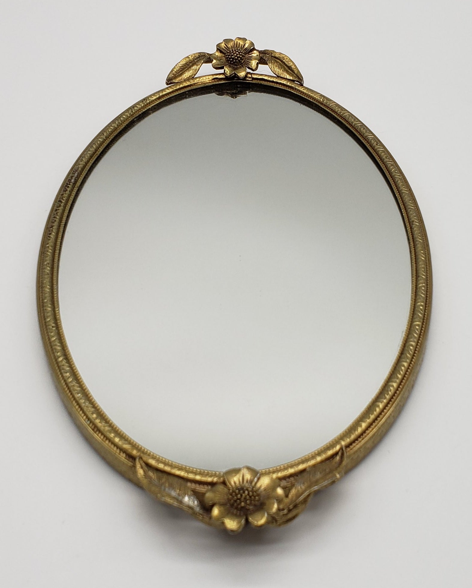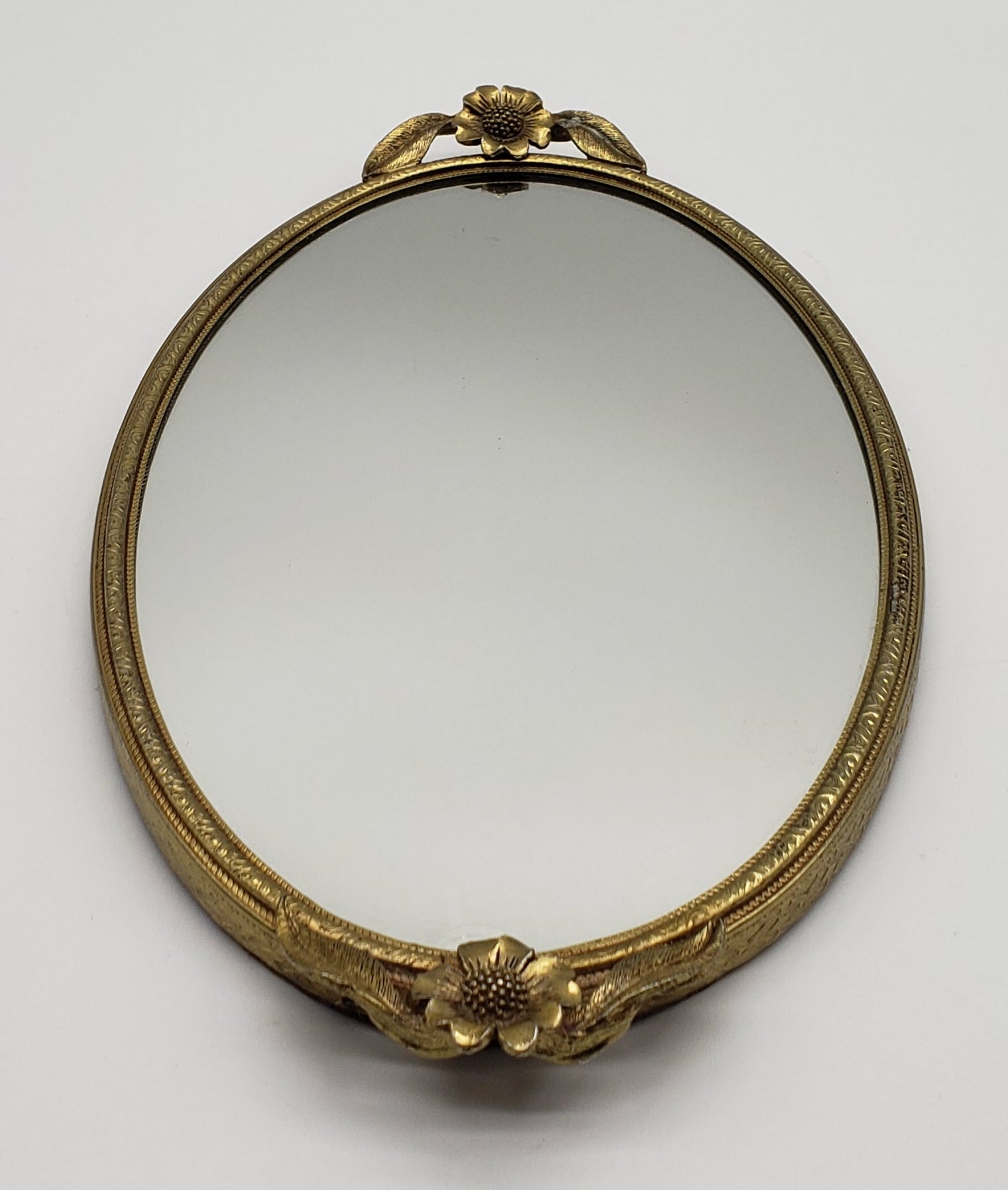 Beautiful and petite oval vintage vanity mirror that can also hang on wall. Made and signed by "Matson" on backside of one floral handle. In really good condition considering age and use. Some wear to bottom felt as shown in photo. Gold wash is antiqued and in really good shape. No bends in the metal and no chips, fleabits or cracks on the mirror. The glass mirror is in excellent condition. Tray measures about 10 1/4" in length and 5 3/4" across.