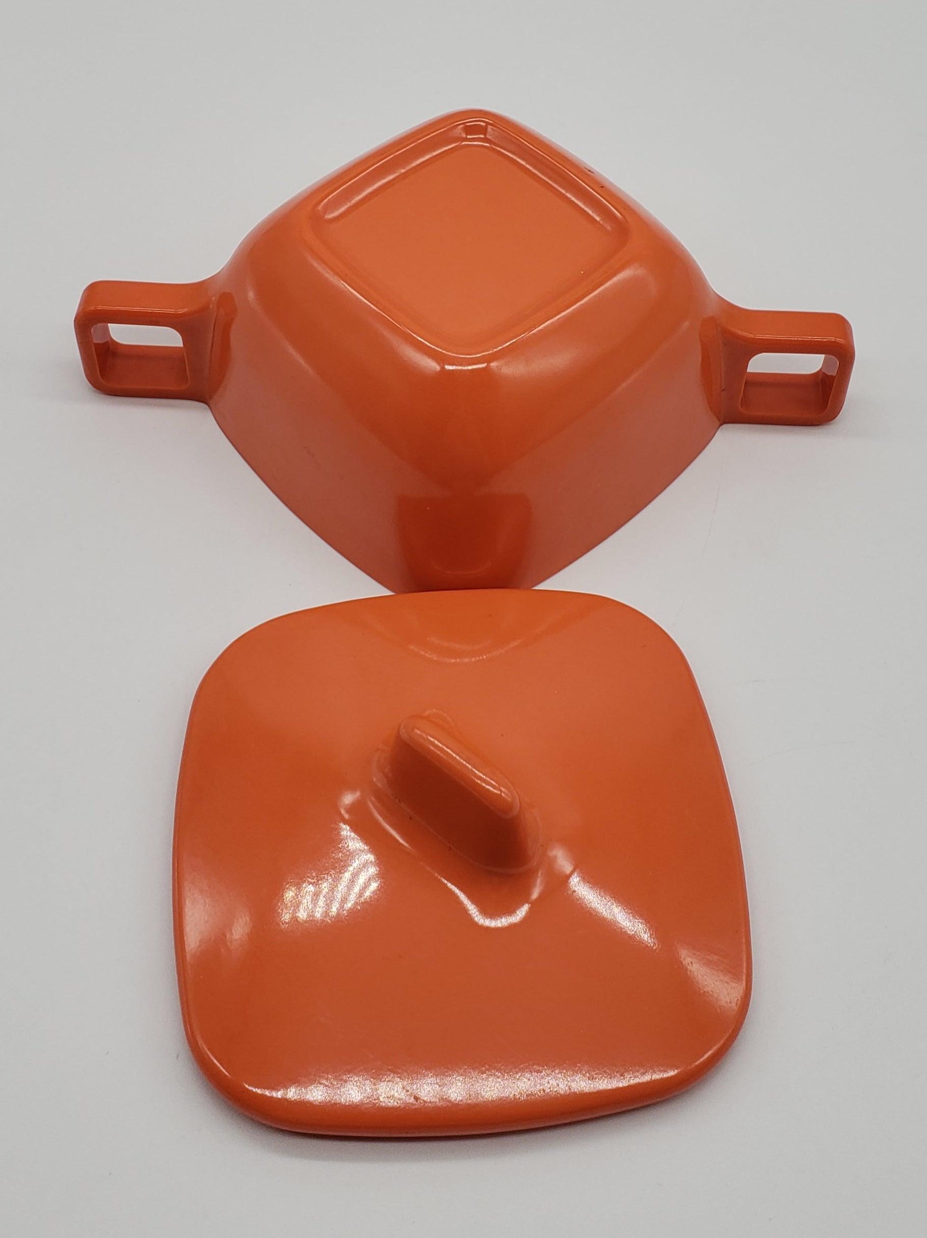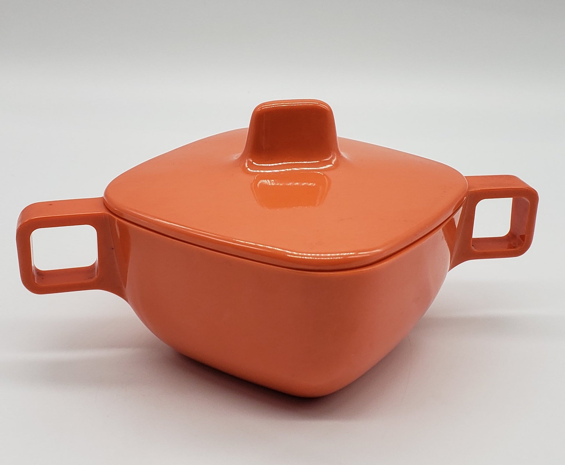 Melamine sugar bowl with handles. Cracked on one handle but still functional
