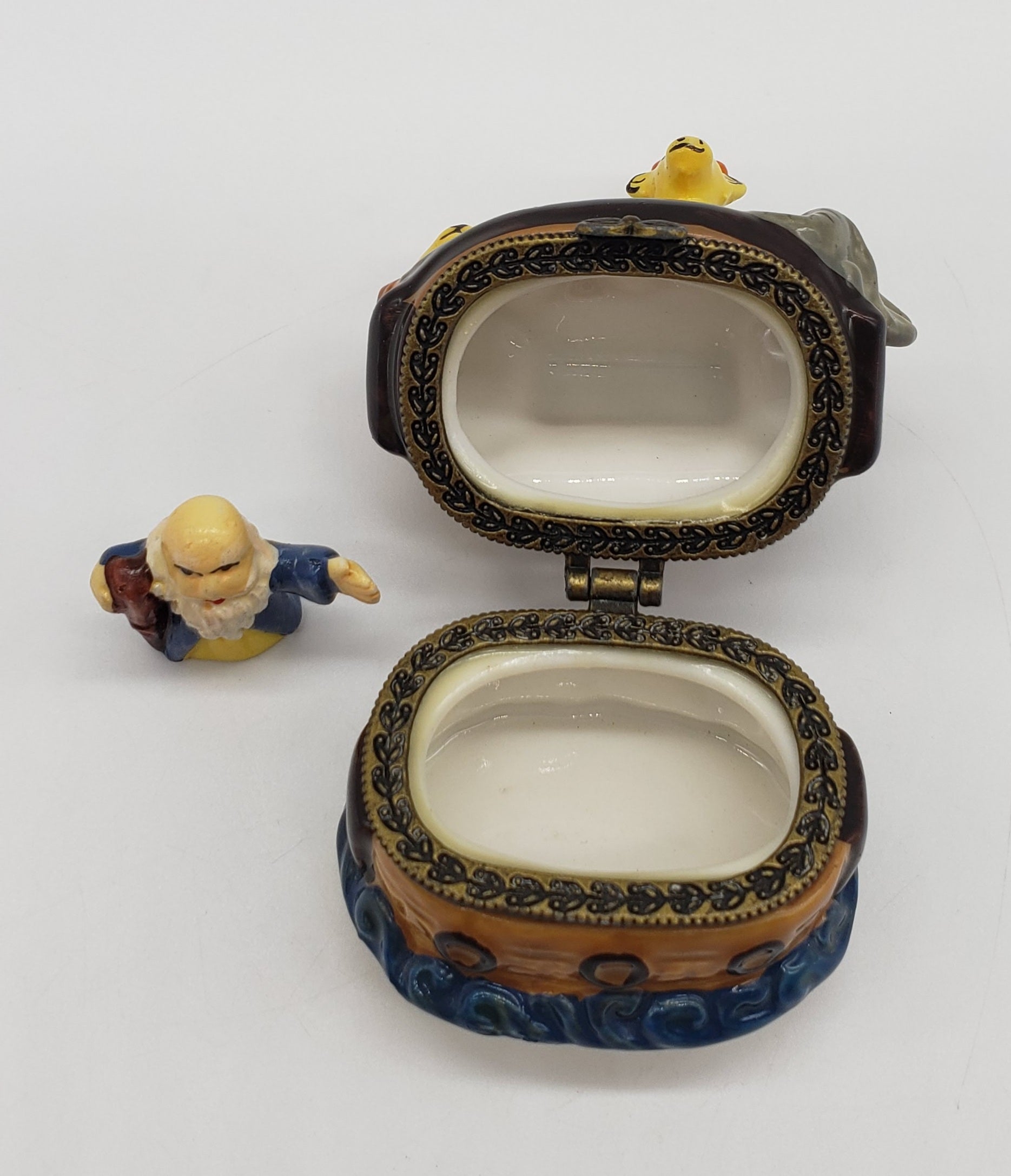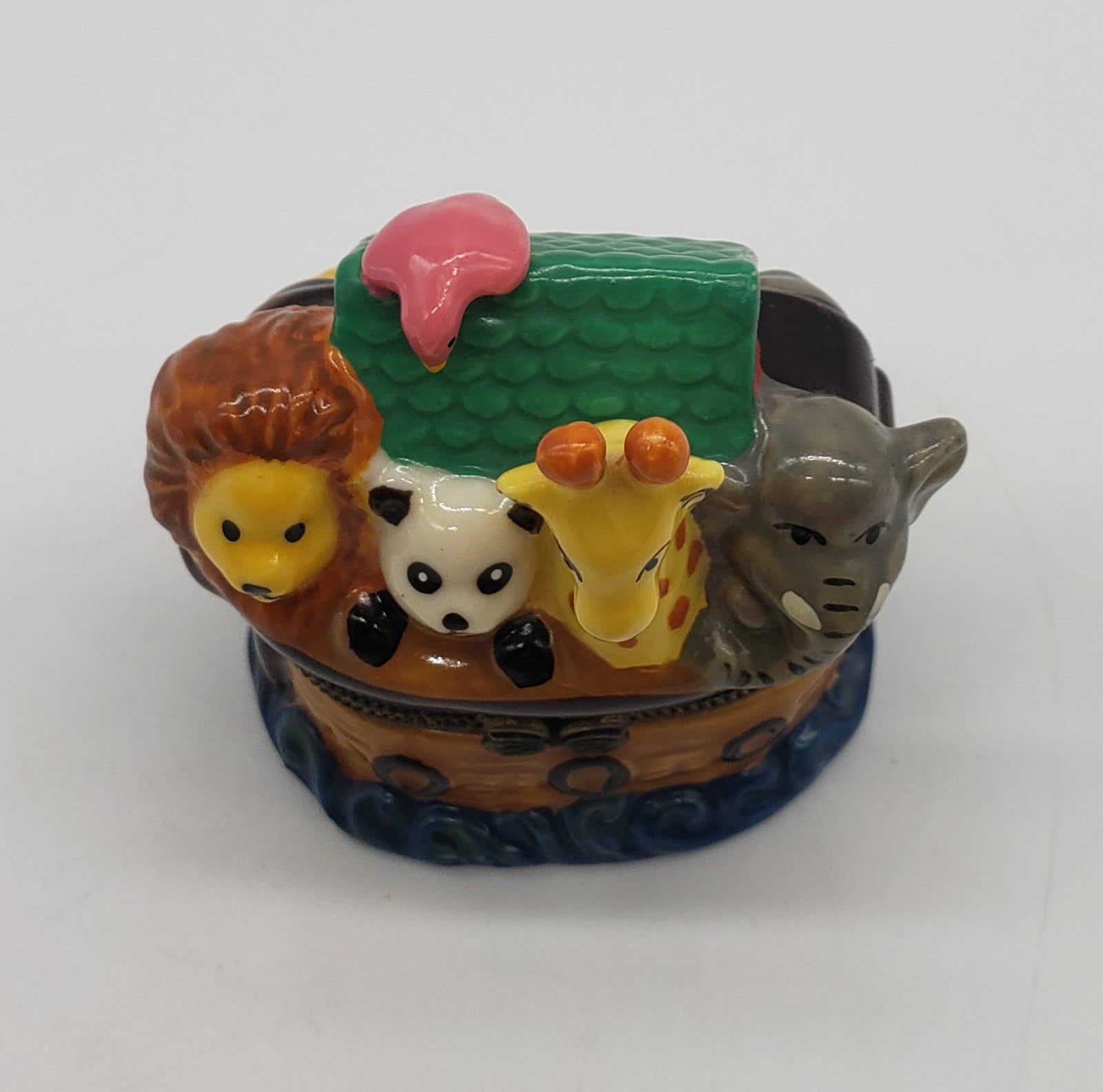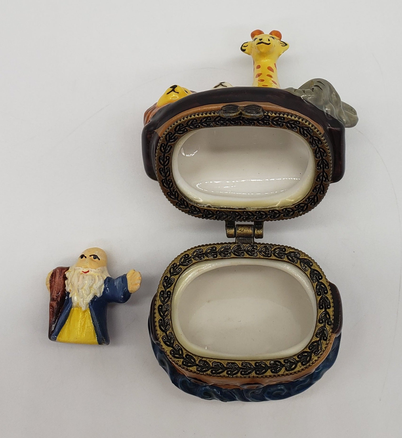 1998 NOAH'S ARK PORCELAIN COLLECTIBLE HINGED TRINKET BOX WITH MINI NOAH. Use for secret messages, love notes, jewelry and baby keepsakes.