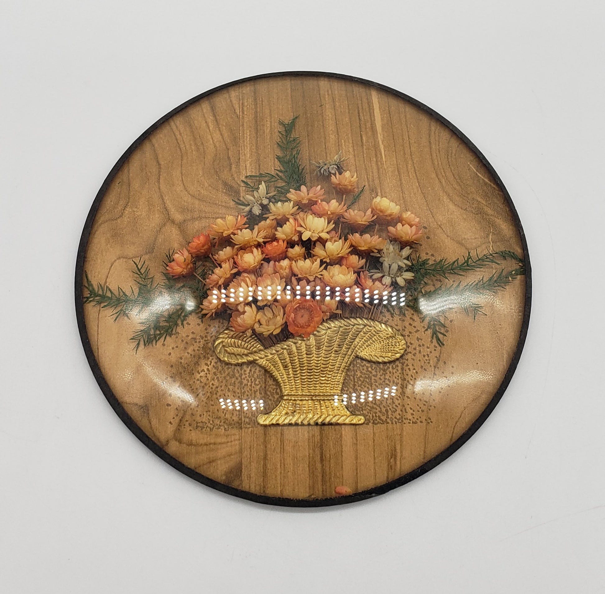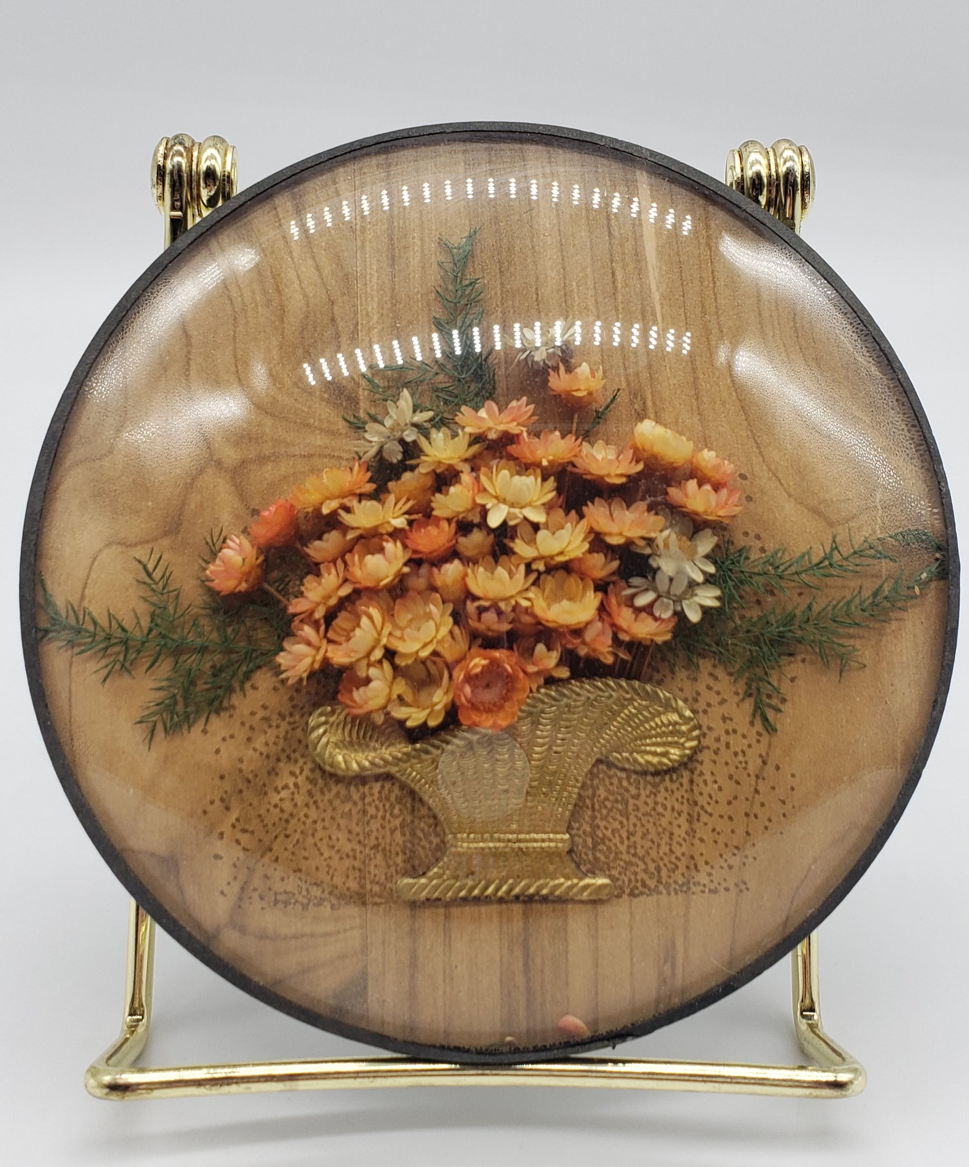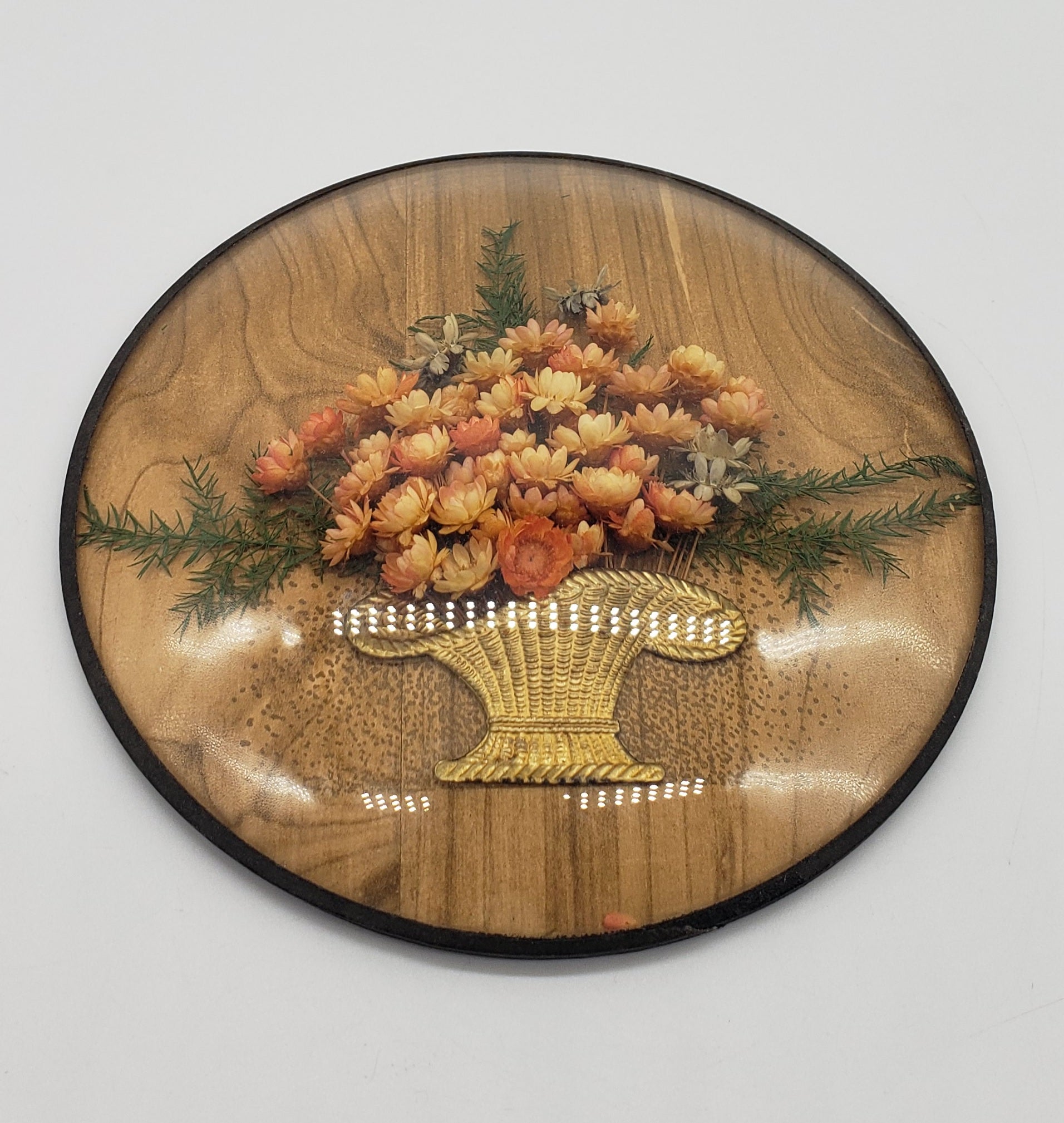 This is a Hand Made Wall Hanging that measure approx 4” in diameter from Peter Watson’s Studios that have a convex glass dried floral arrangement against a faux wood background.