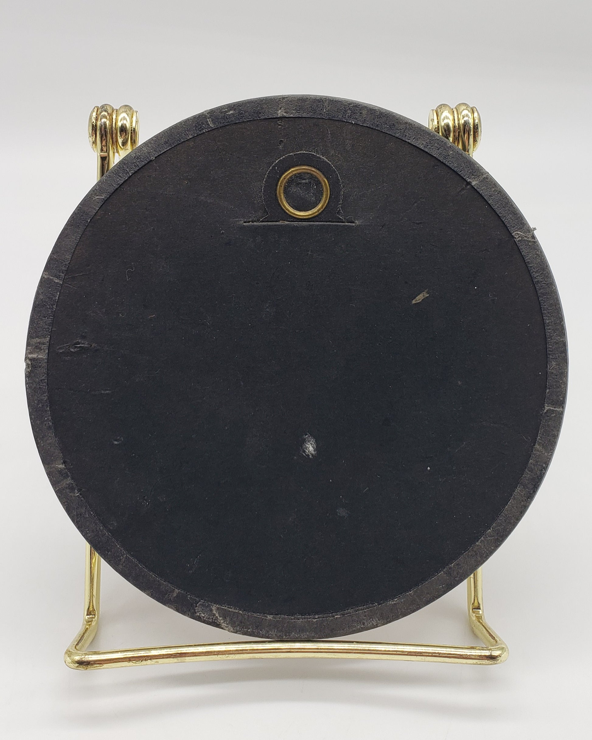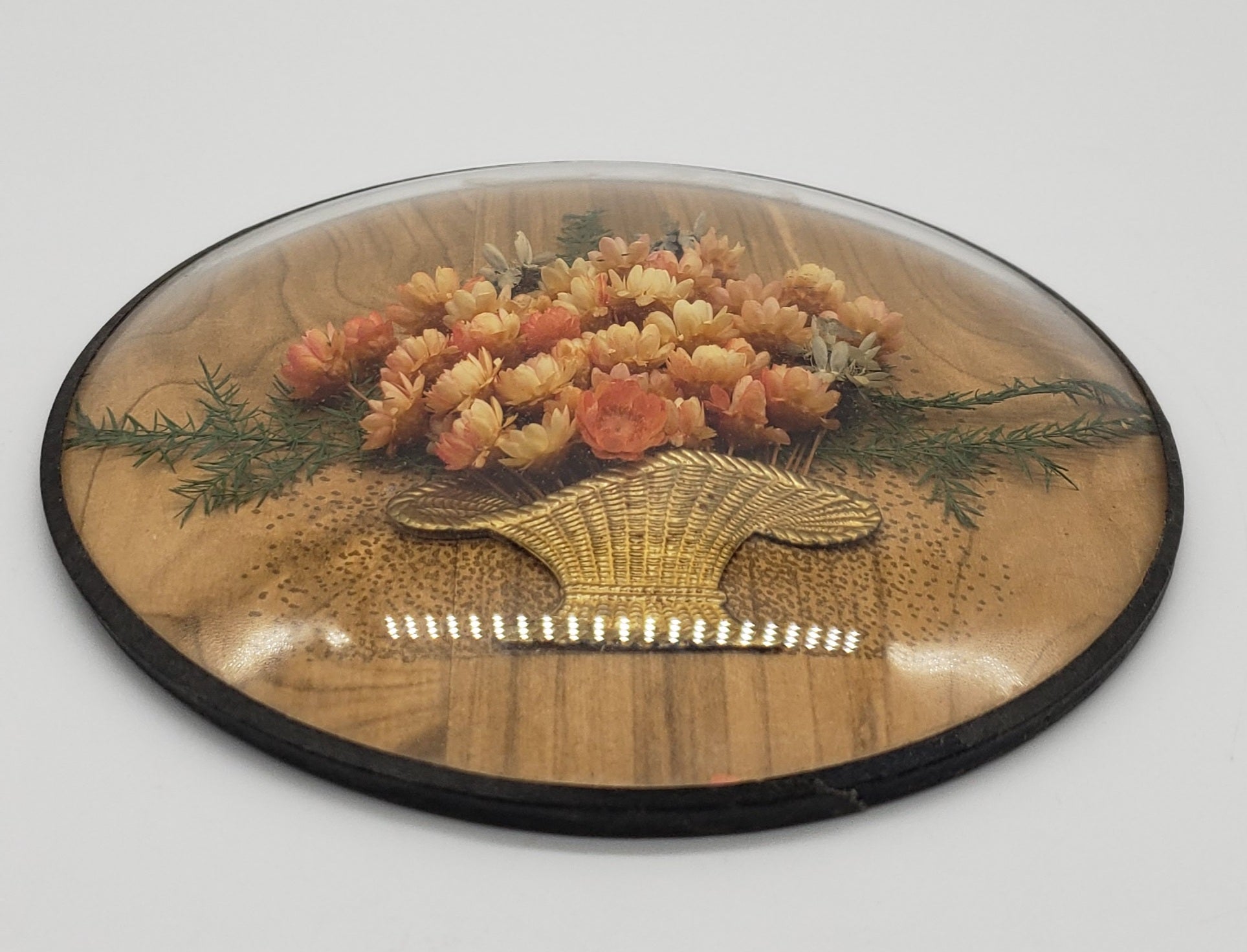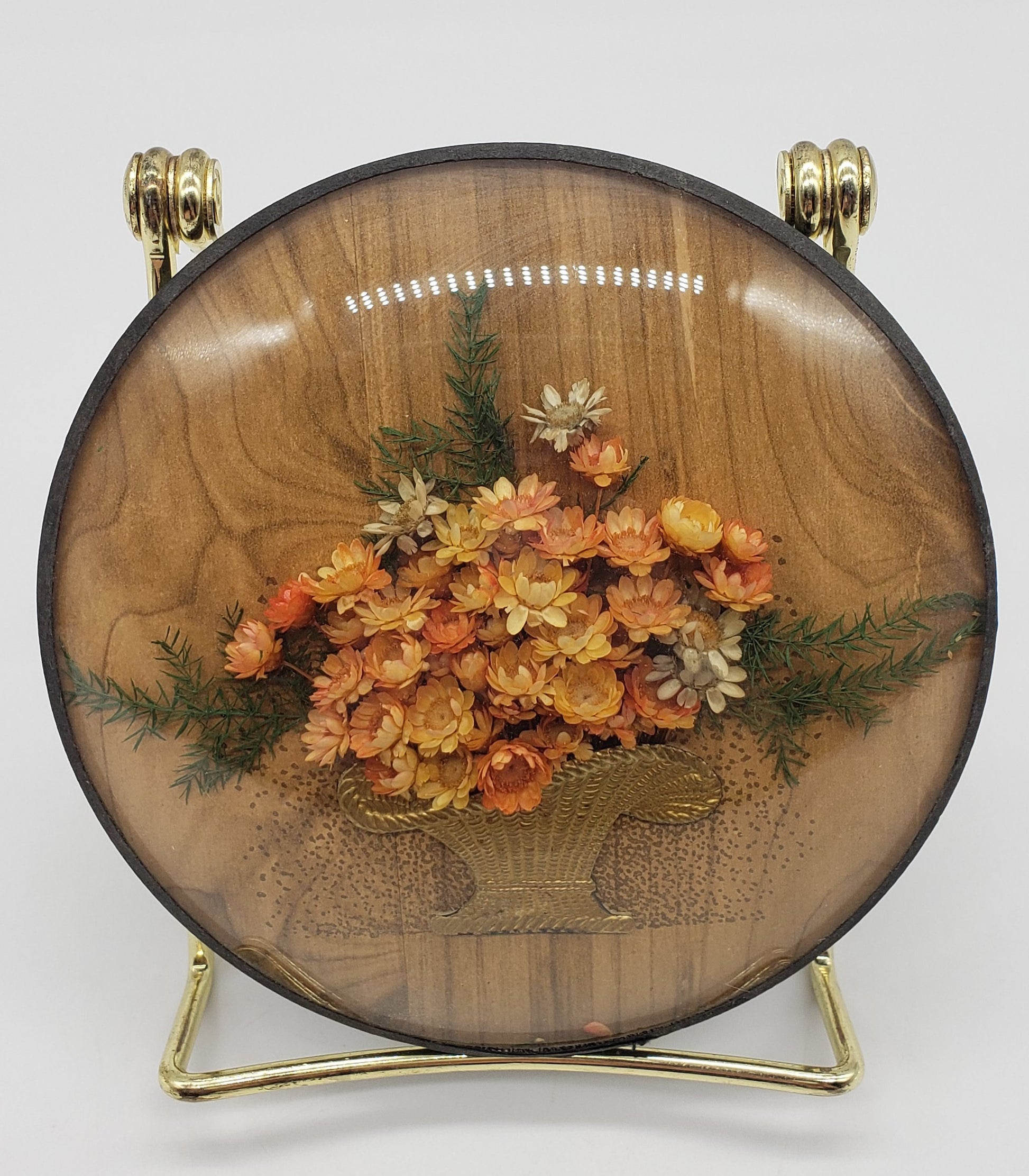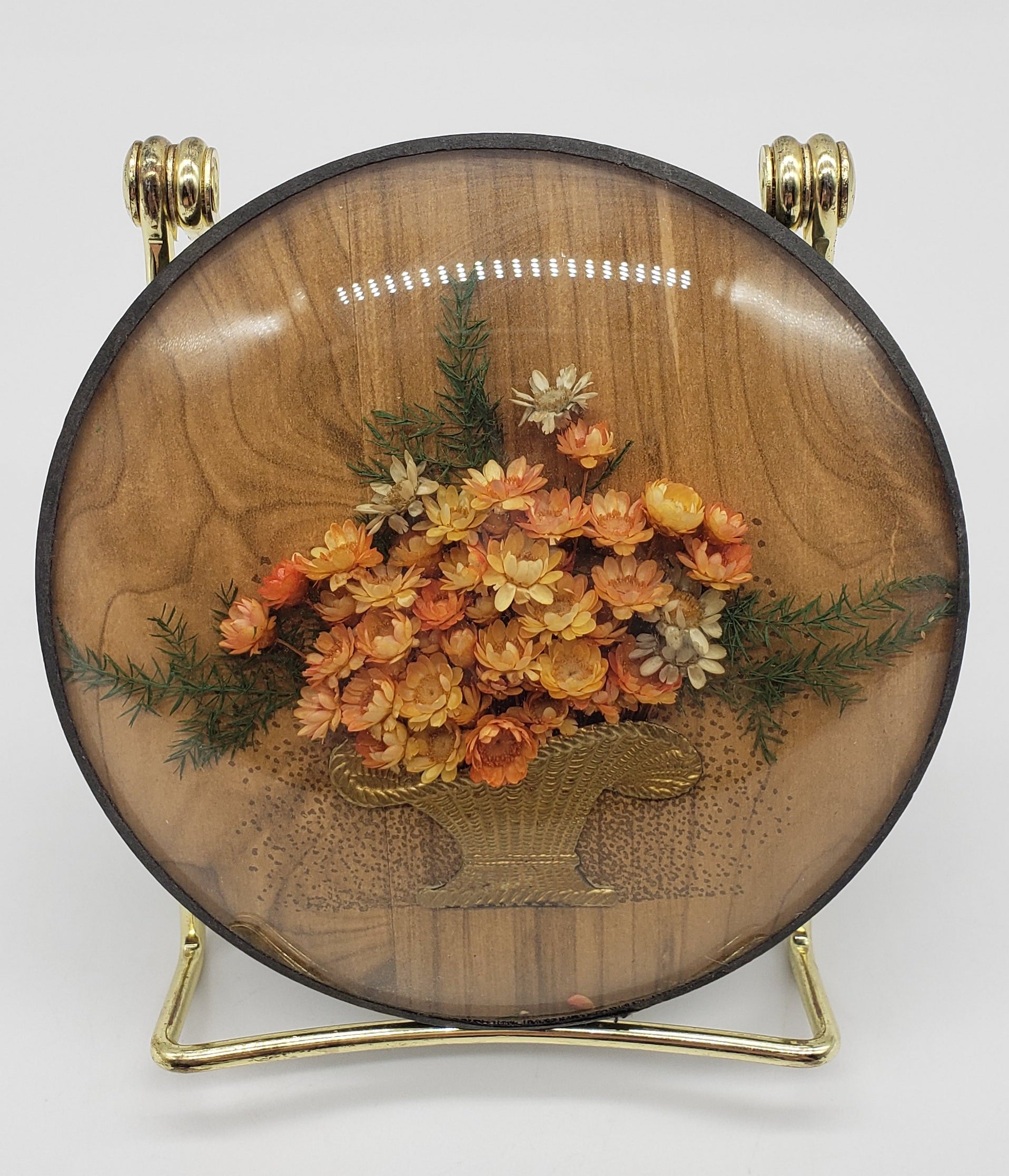 This is a Hand Made Wall Hanging that measure approx 4” in diameter from Peter Watson’s Studios that have a convex glass dried floral arrangement against a faux wood background.