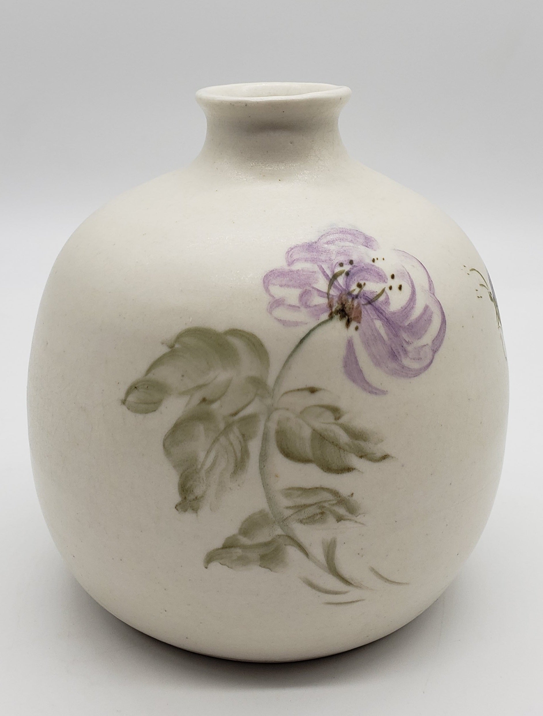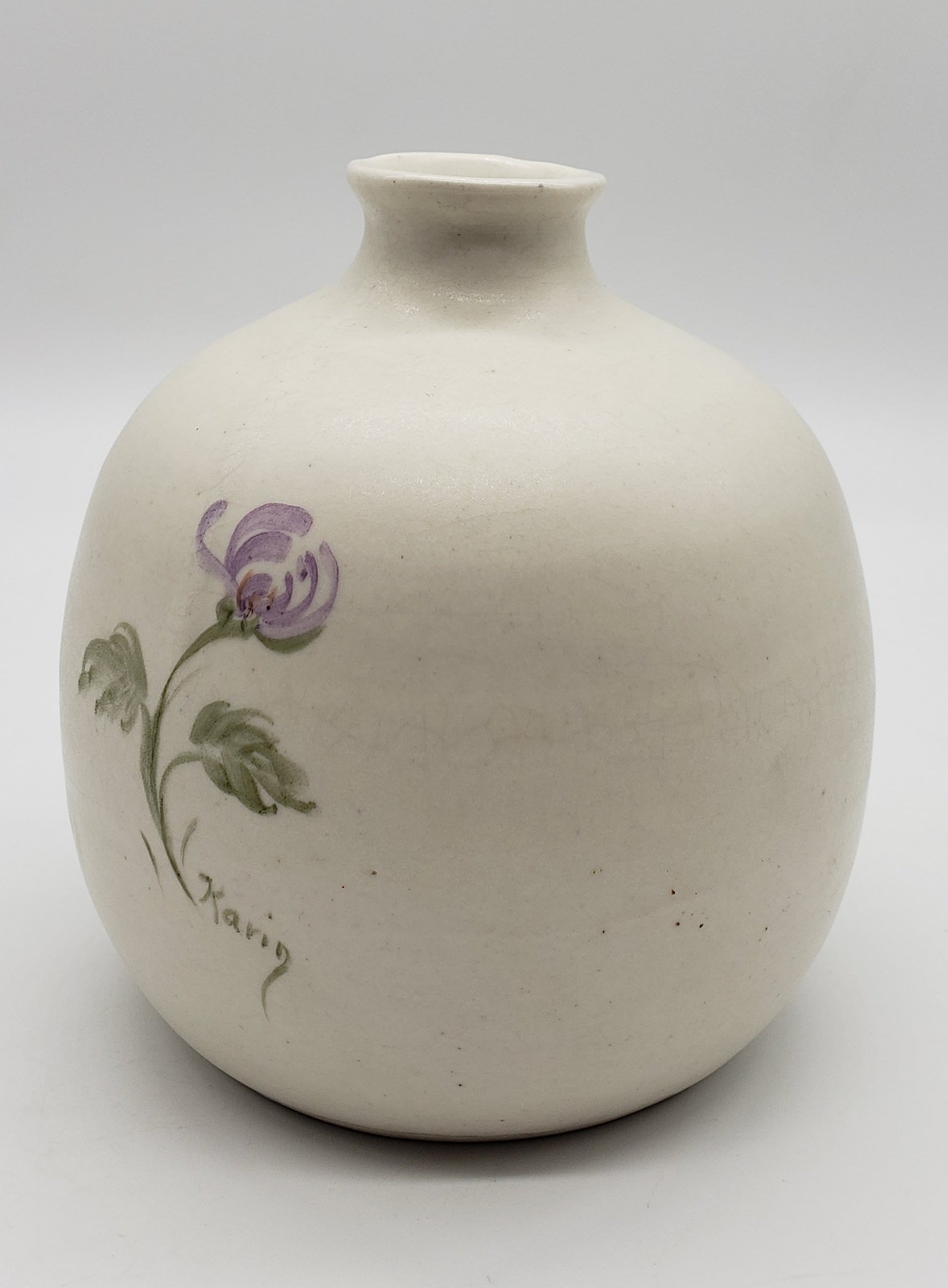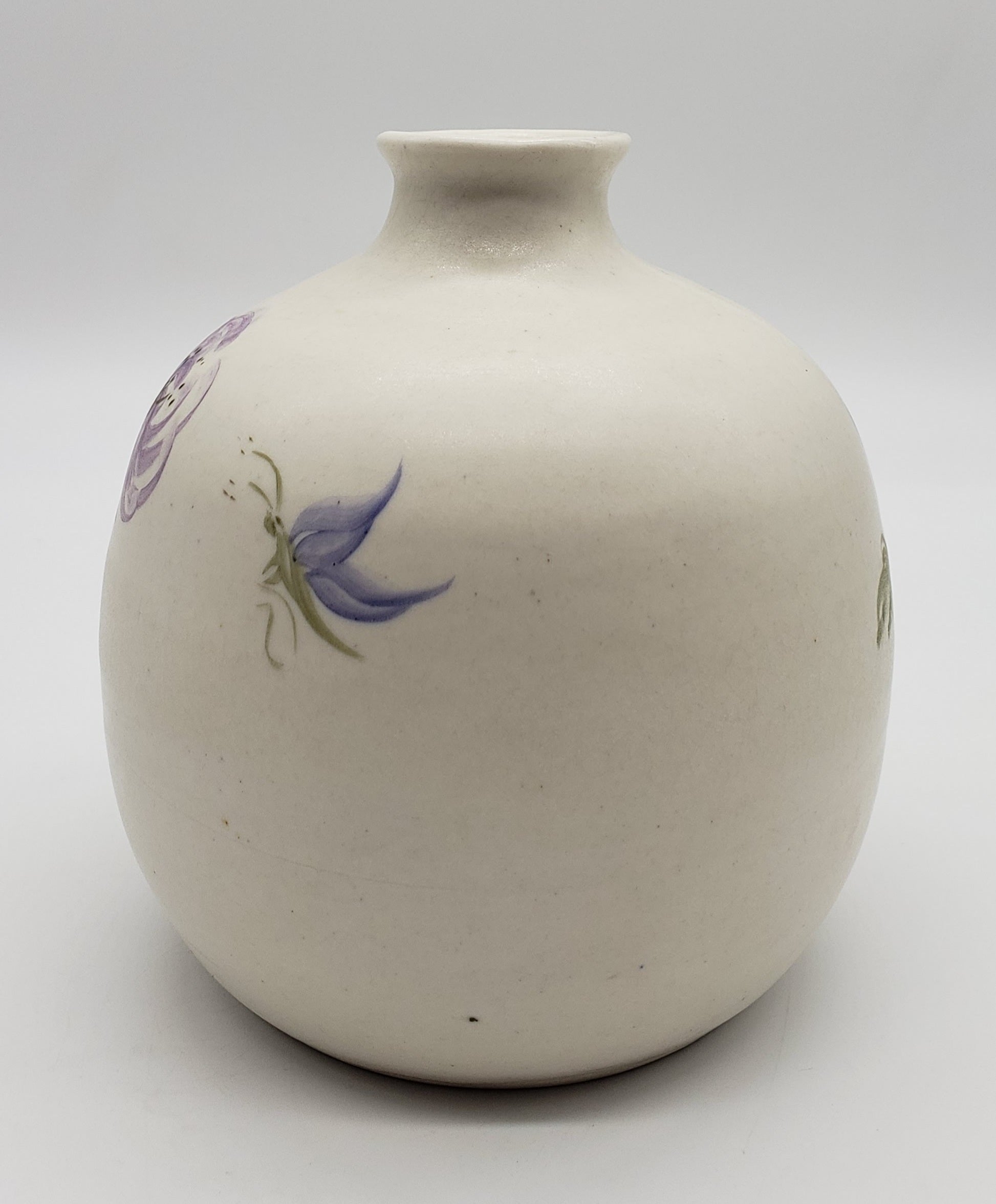 Signed Studio Pottery vase with hand painted purple flower and butterfly